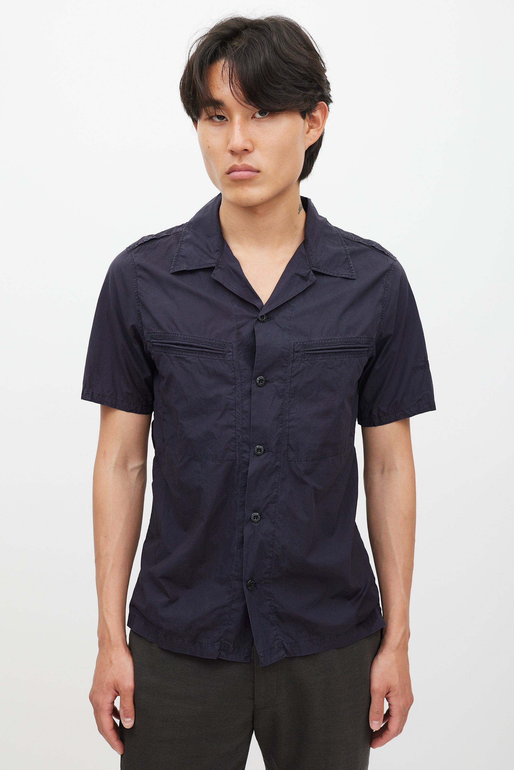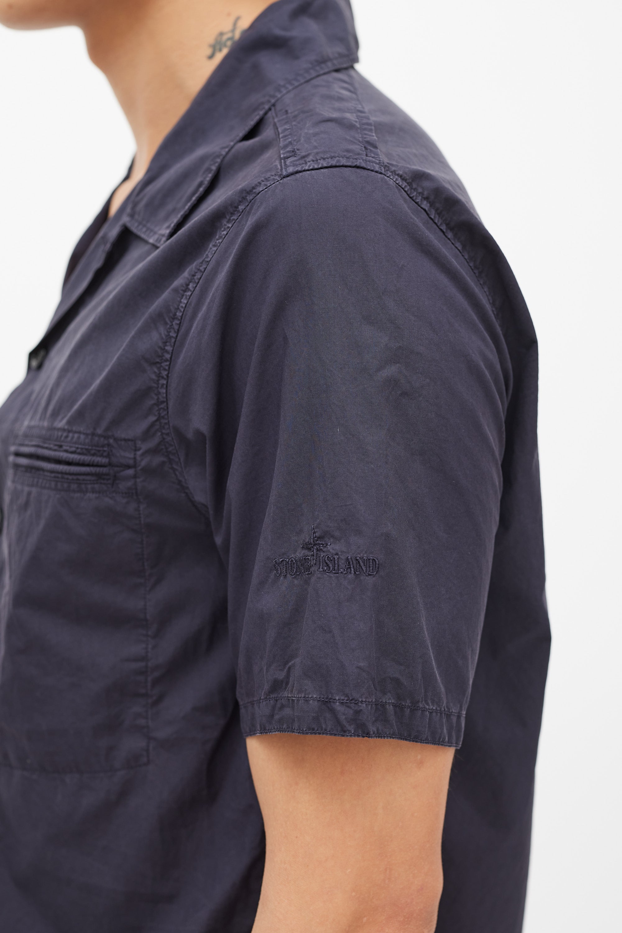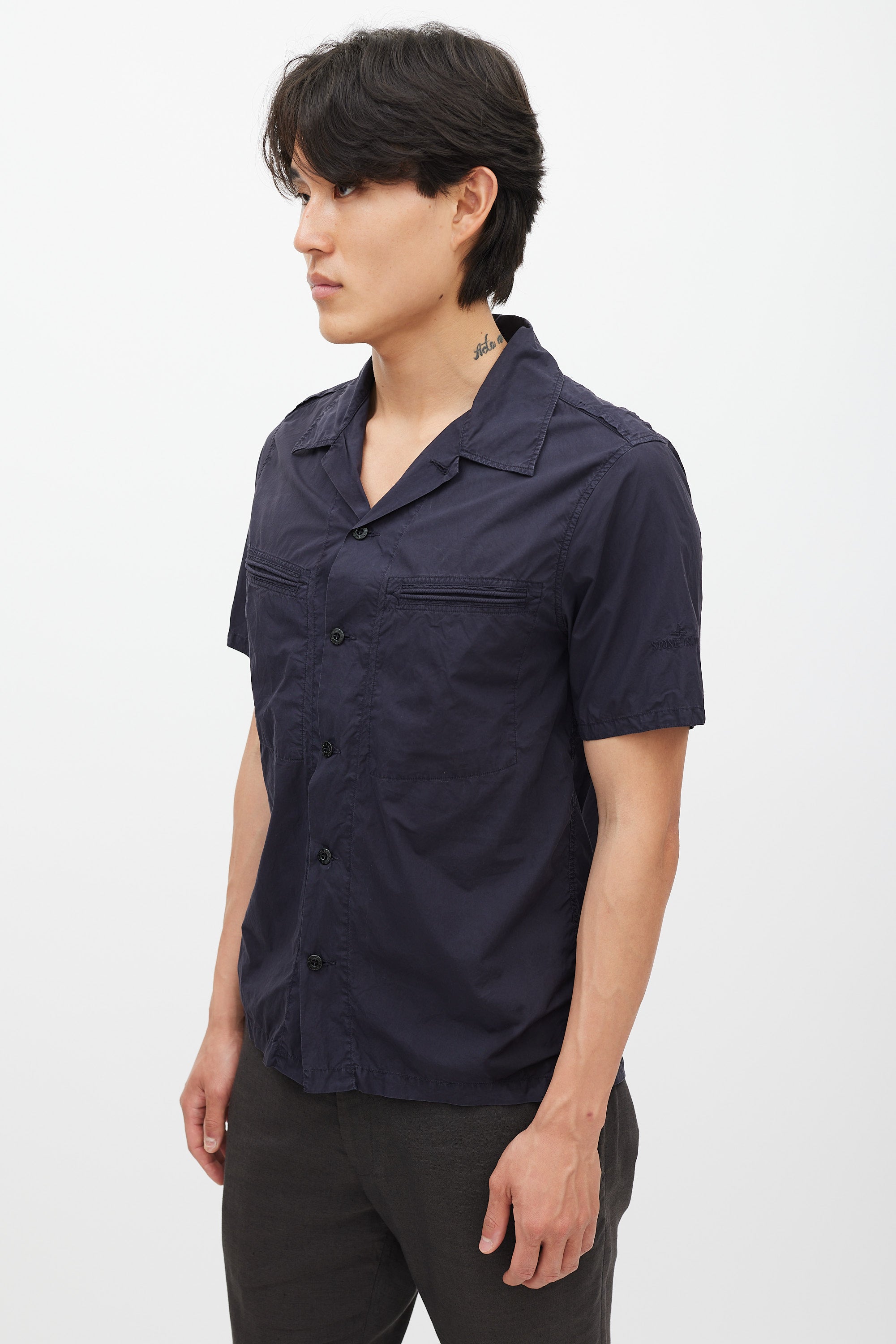 Pre-owned Stone Island navy poplin shirt featuring a camp collar, two welt pockets at chest, short sleeves with tonal logo embroidery, and button up closure.