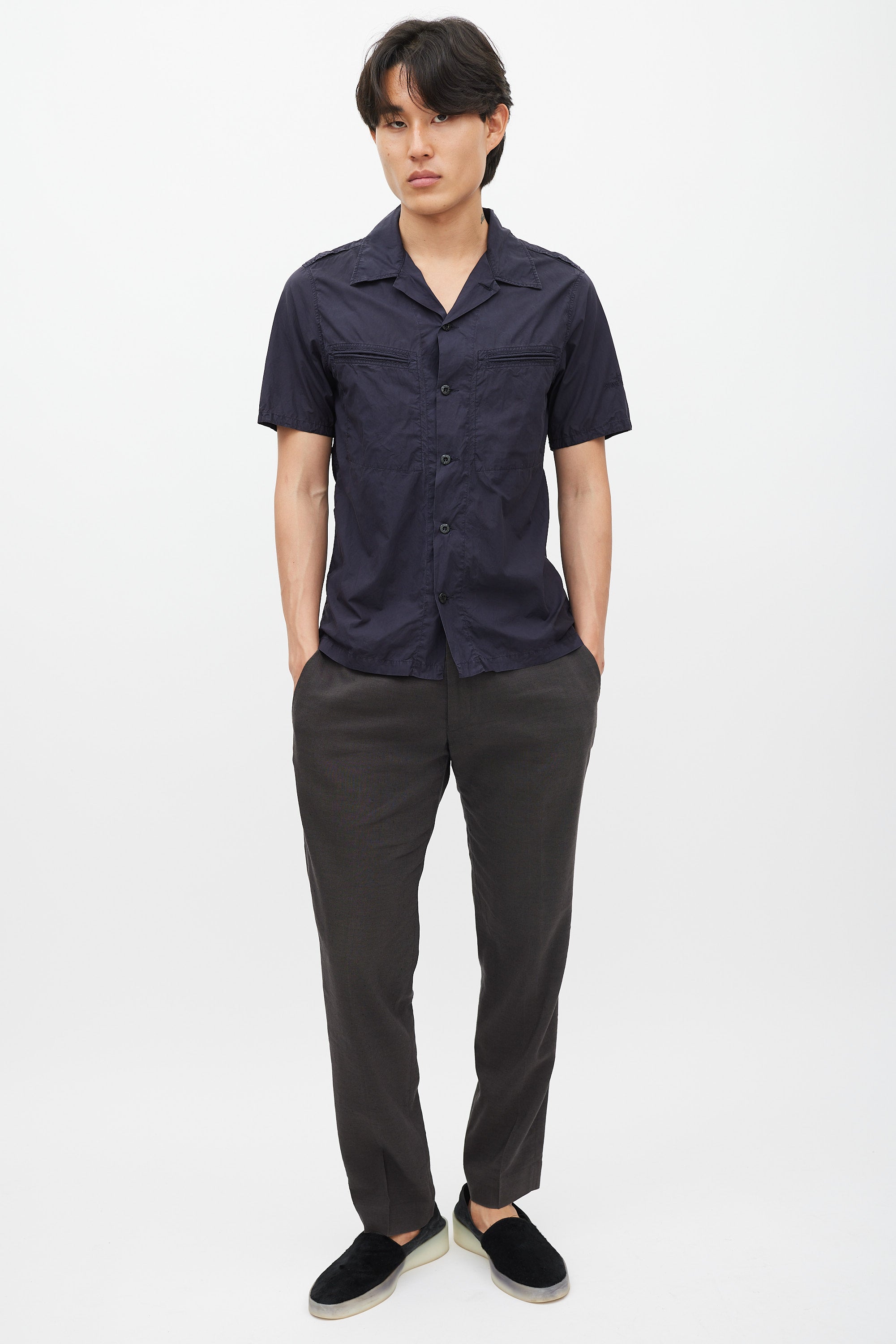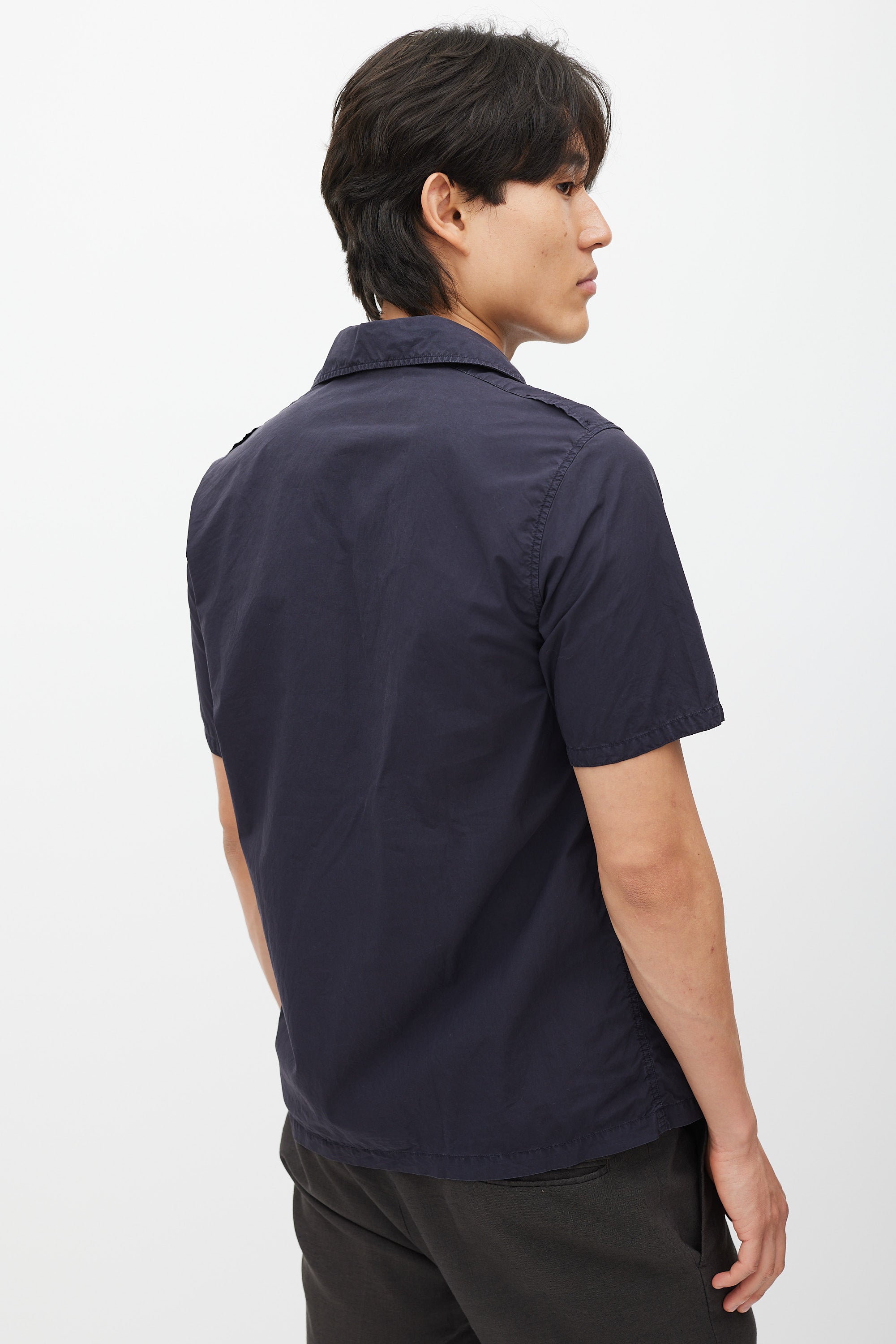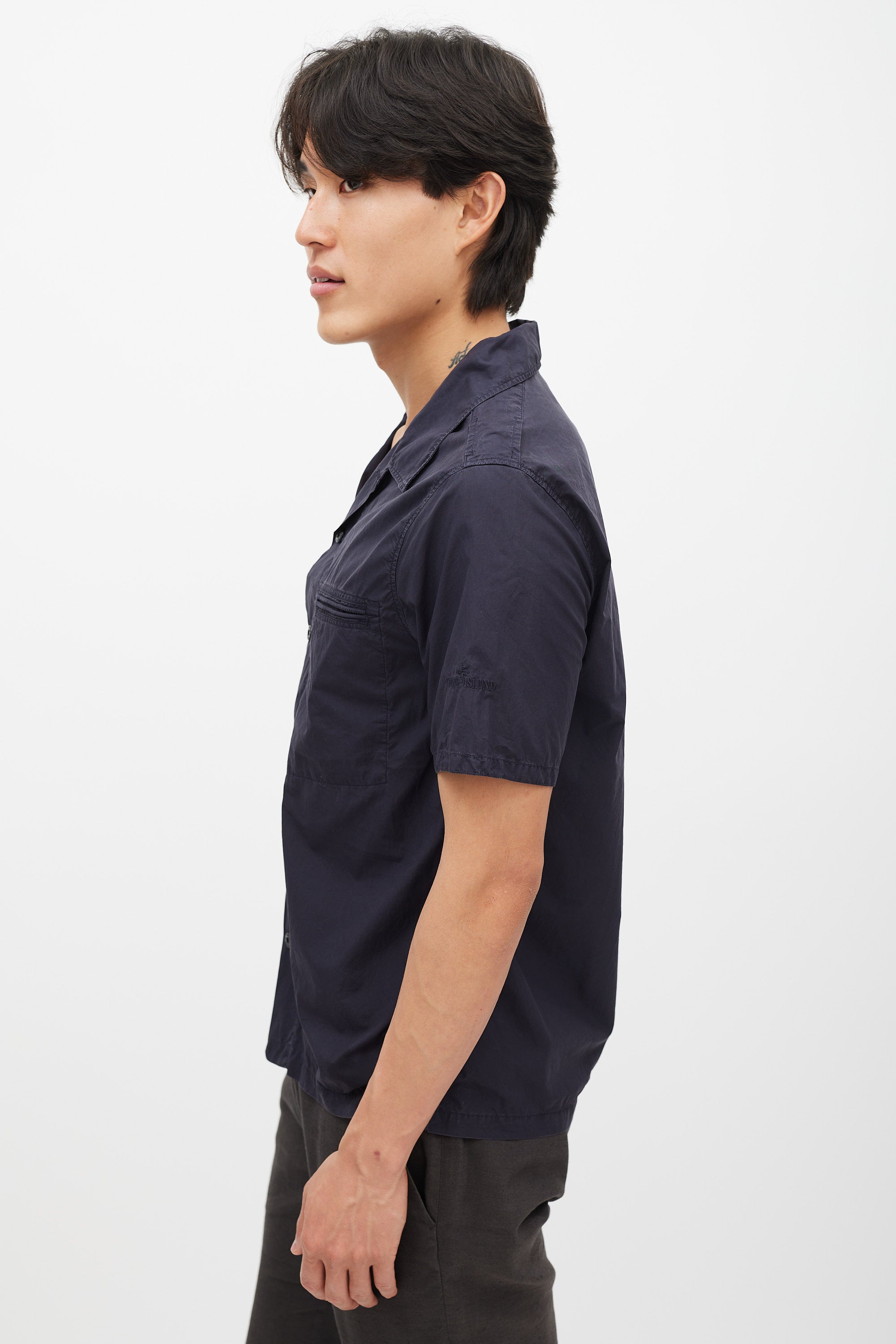 Pre-owned Stone Island navy poplin shirt featuring a camp collar, two welt pockets at chest, short sleeves with tonal logo embroidery, and button up closure.