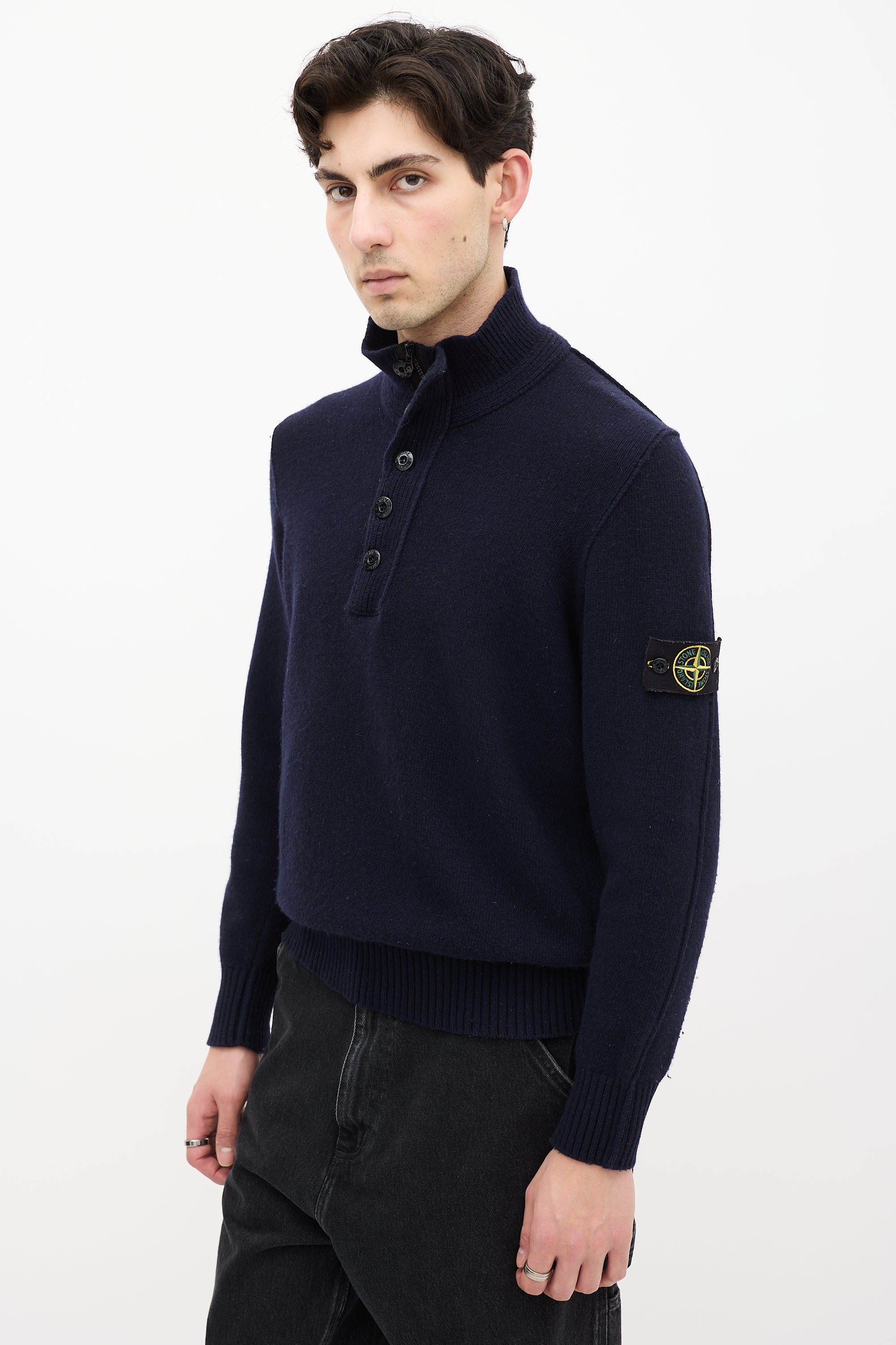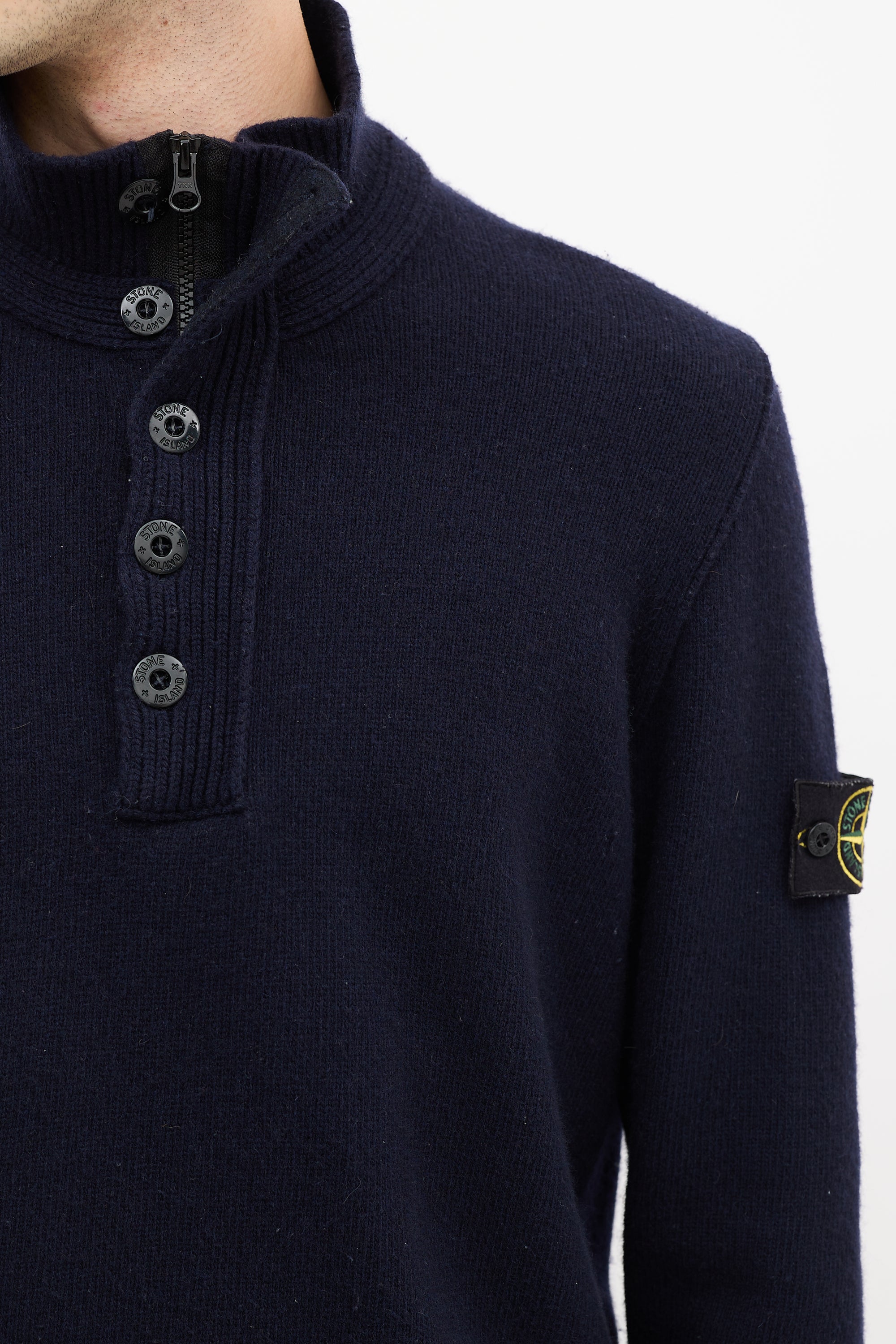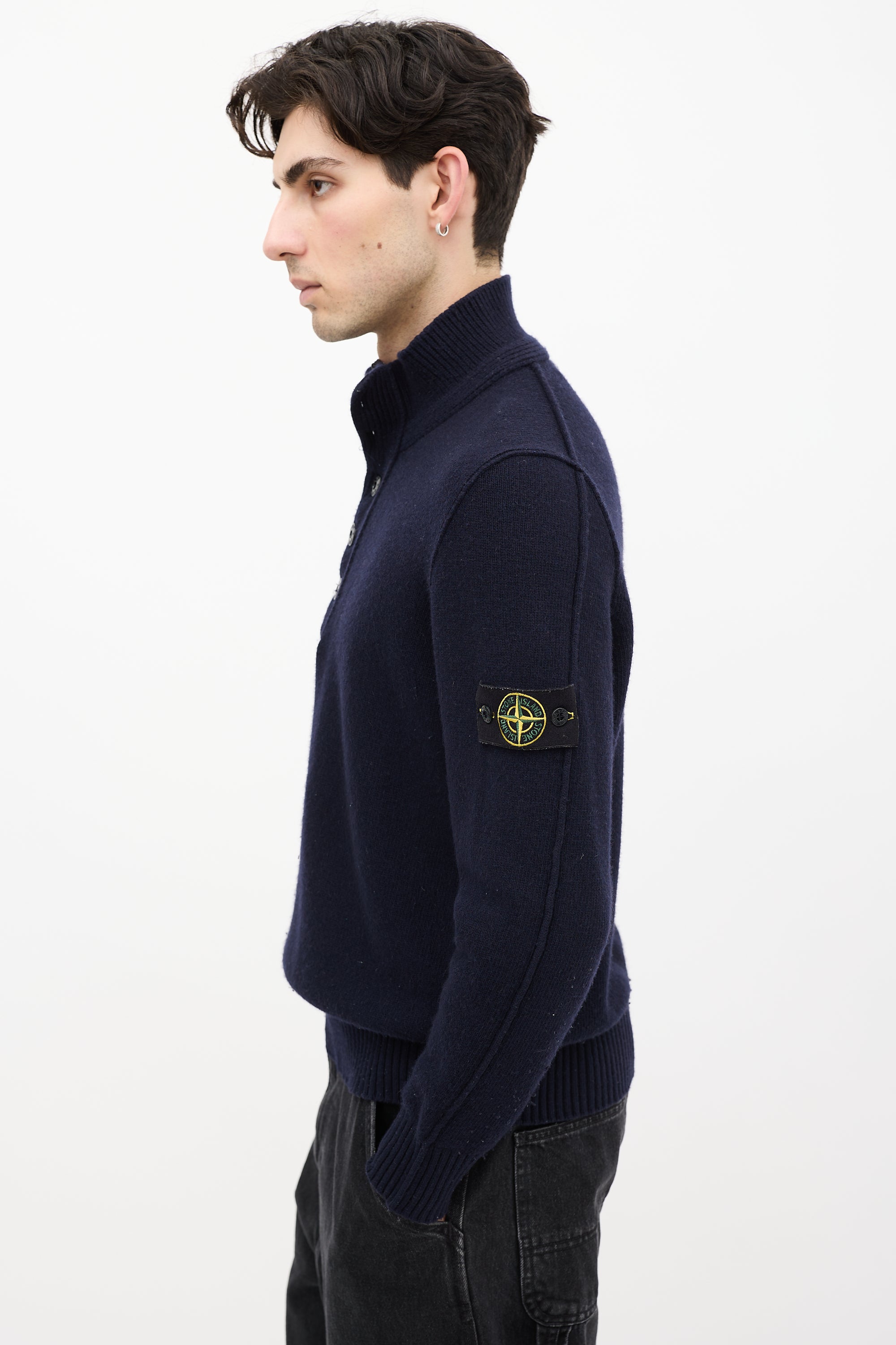 Pre-owned Stone Island navy wool ribbed sweater featuring quarter zip mock neck with buttoned placket, wider ribbing at cuffs and hem, and signature detachable embroidered logo patch at shoulder.