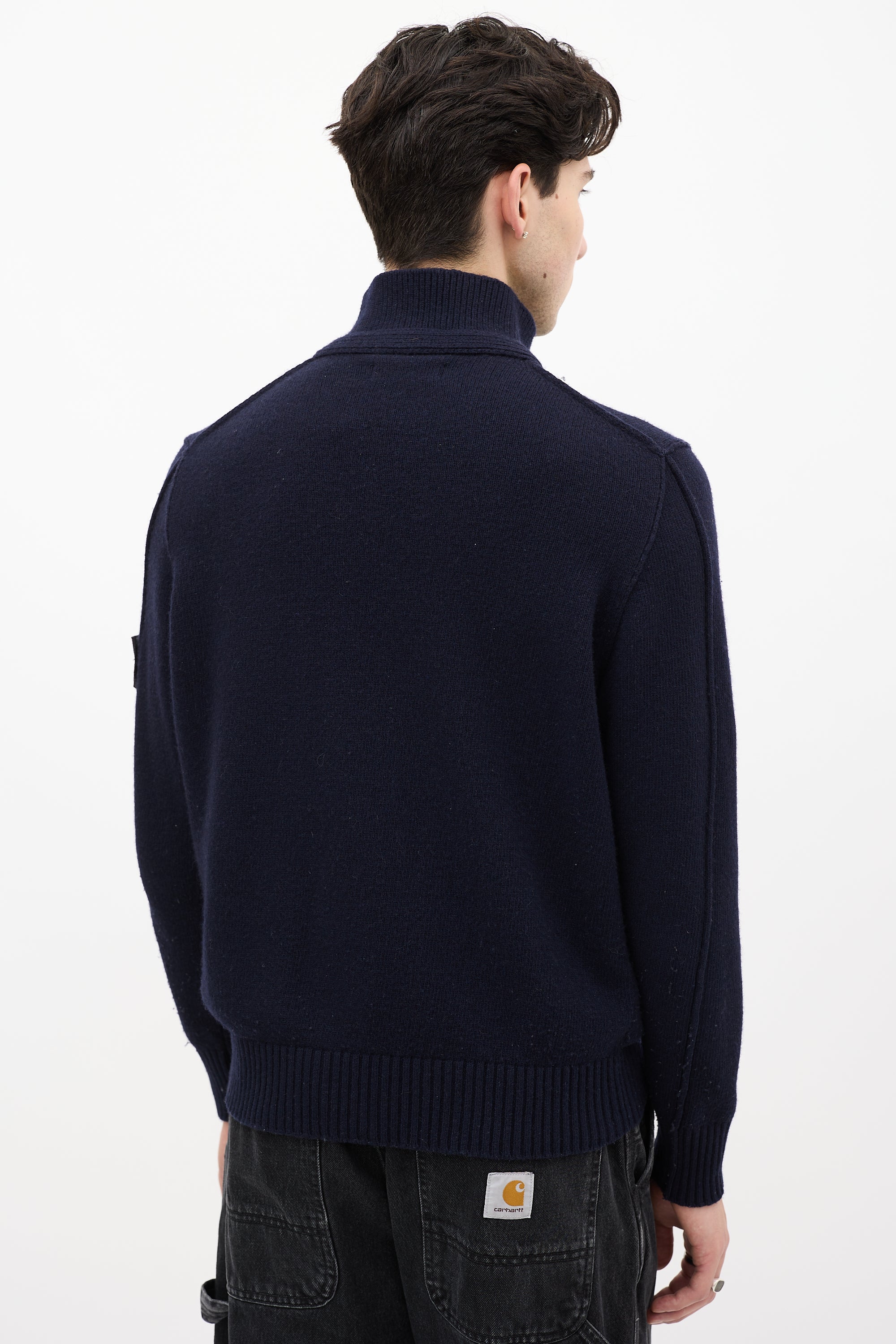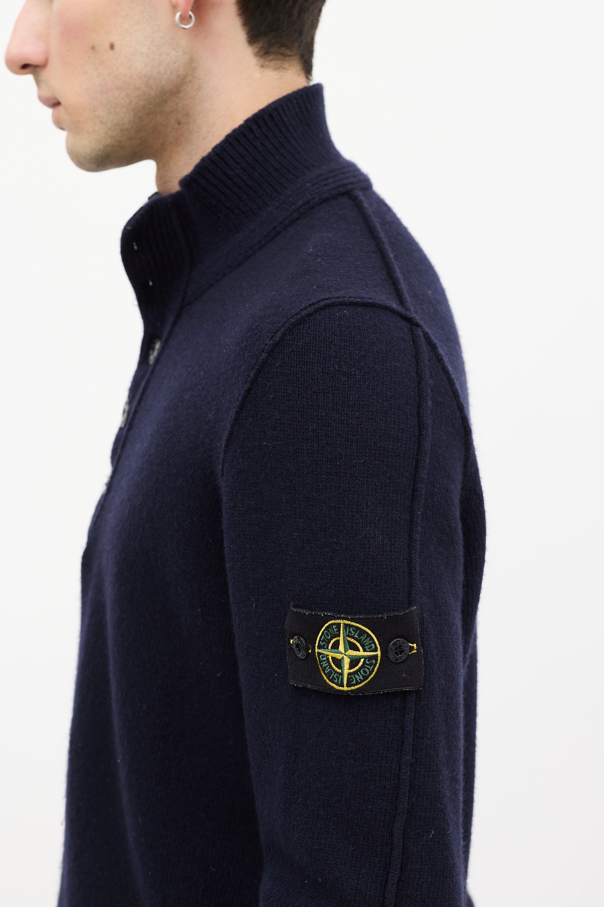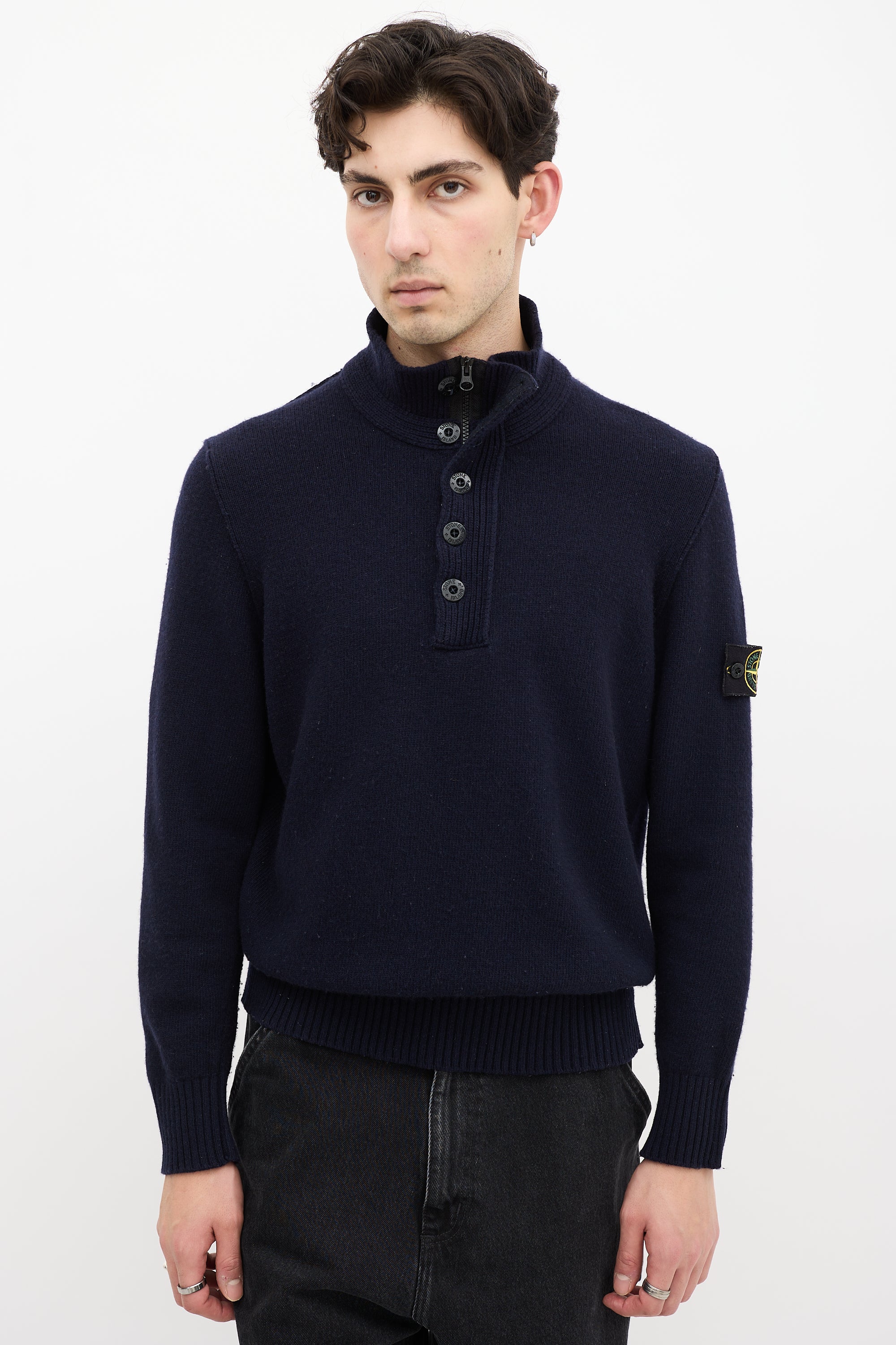 Pre-owned Stone Island navy wool ribbed sweater featuring quarter zip mock neck with buttoned placket, wider ribbing at cuffs and hem, and signature detachable embroidered logo patch at shoulder.