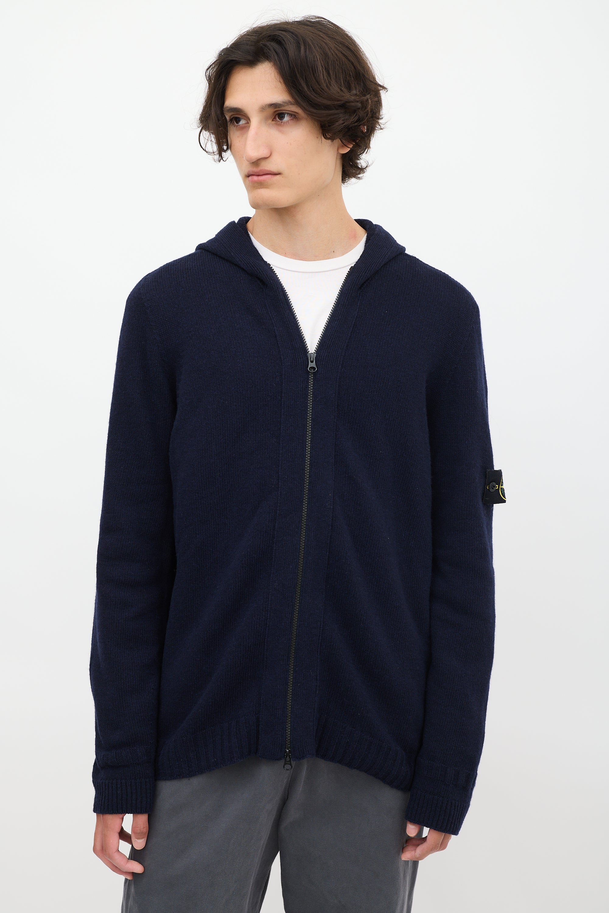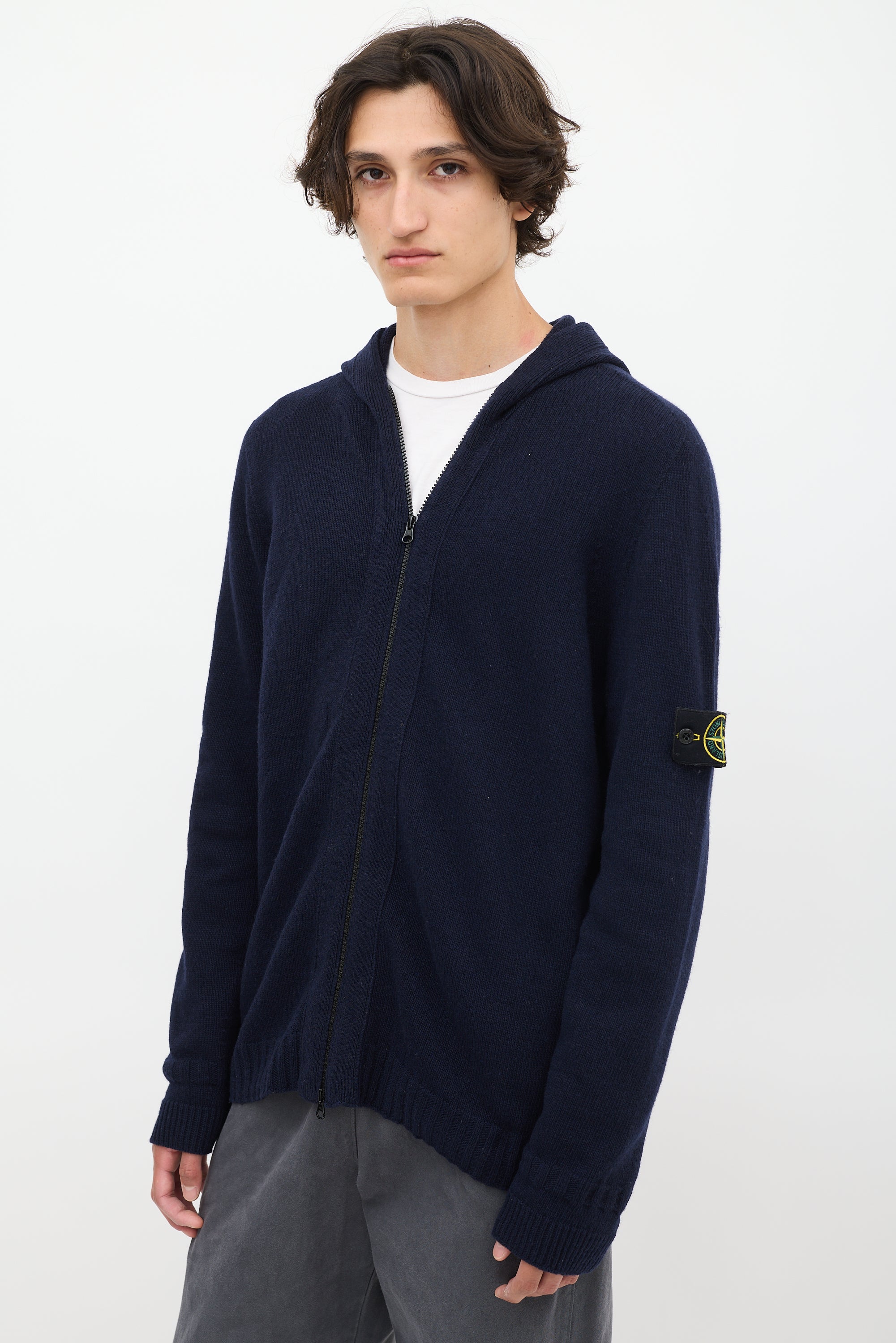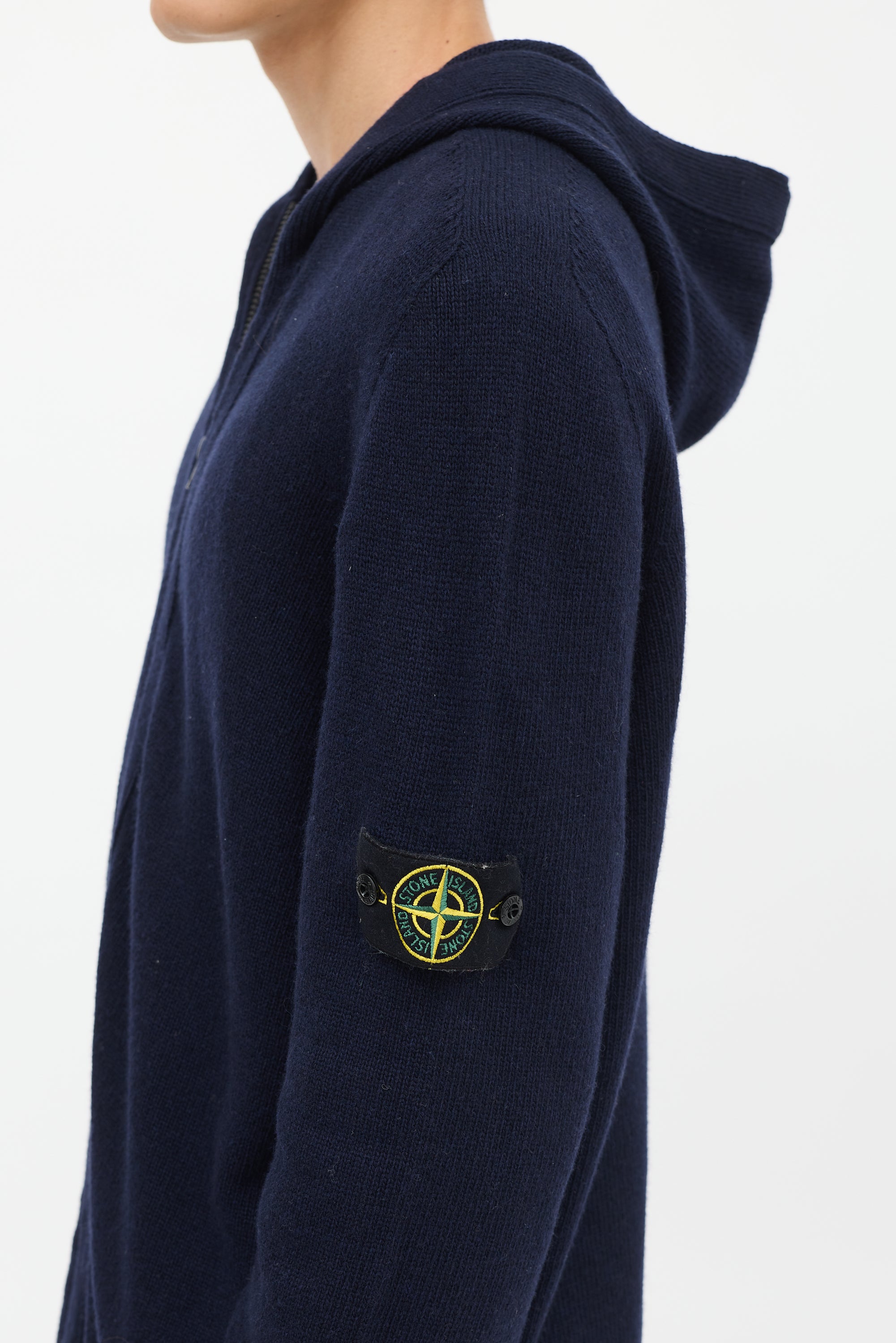 Pre-owned Stone Island navy wool blend knit hoodie featuring full front double zip, long sleeves, signature removable black logo patch at left arm, and ribbing at hem and cuffs.