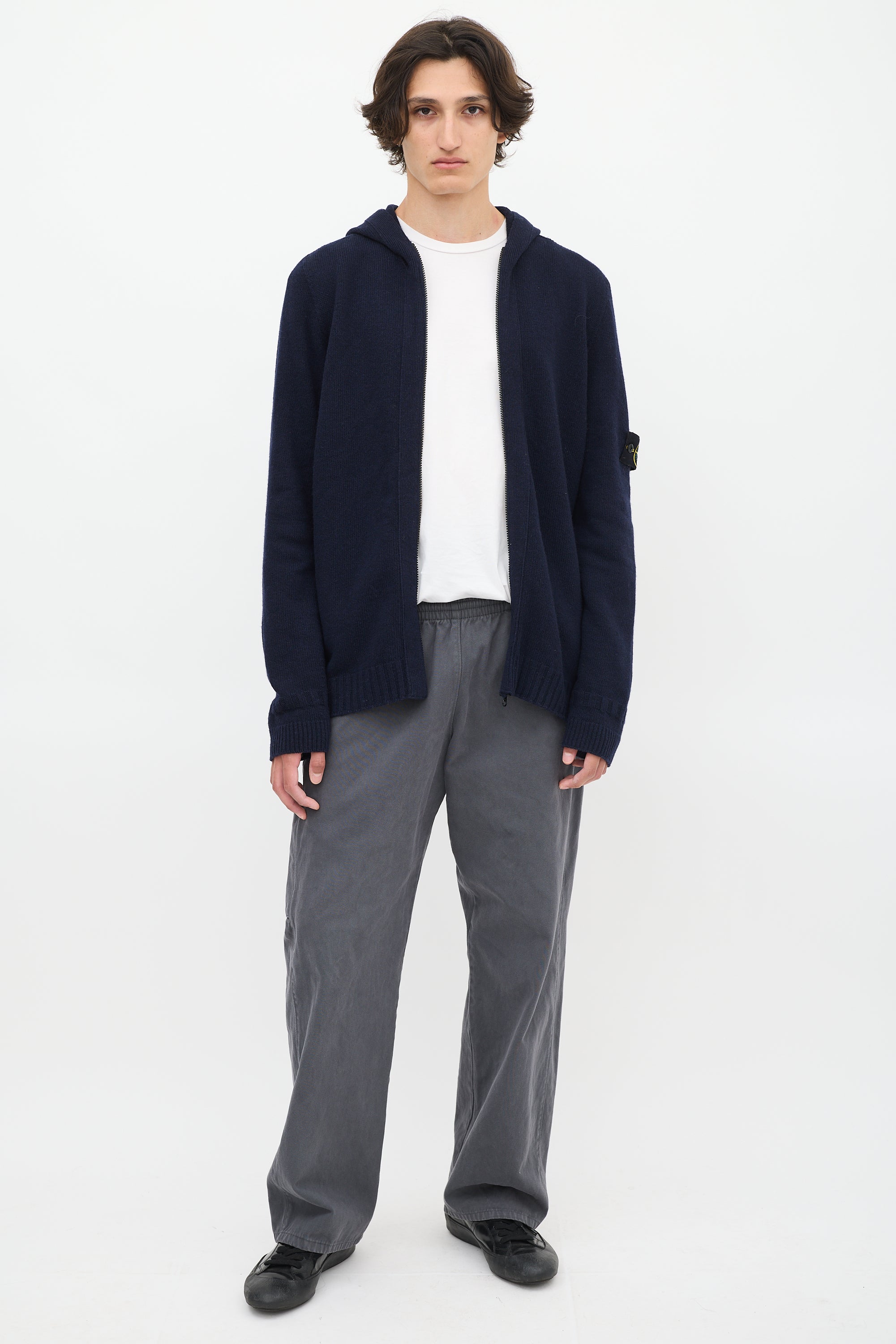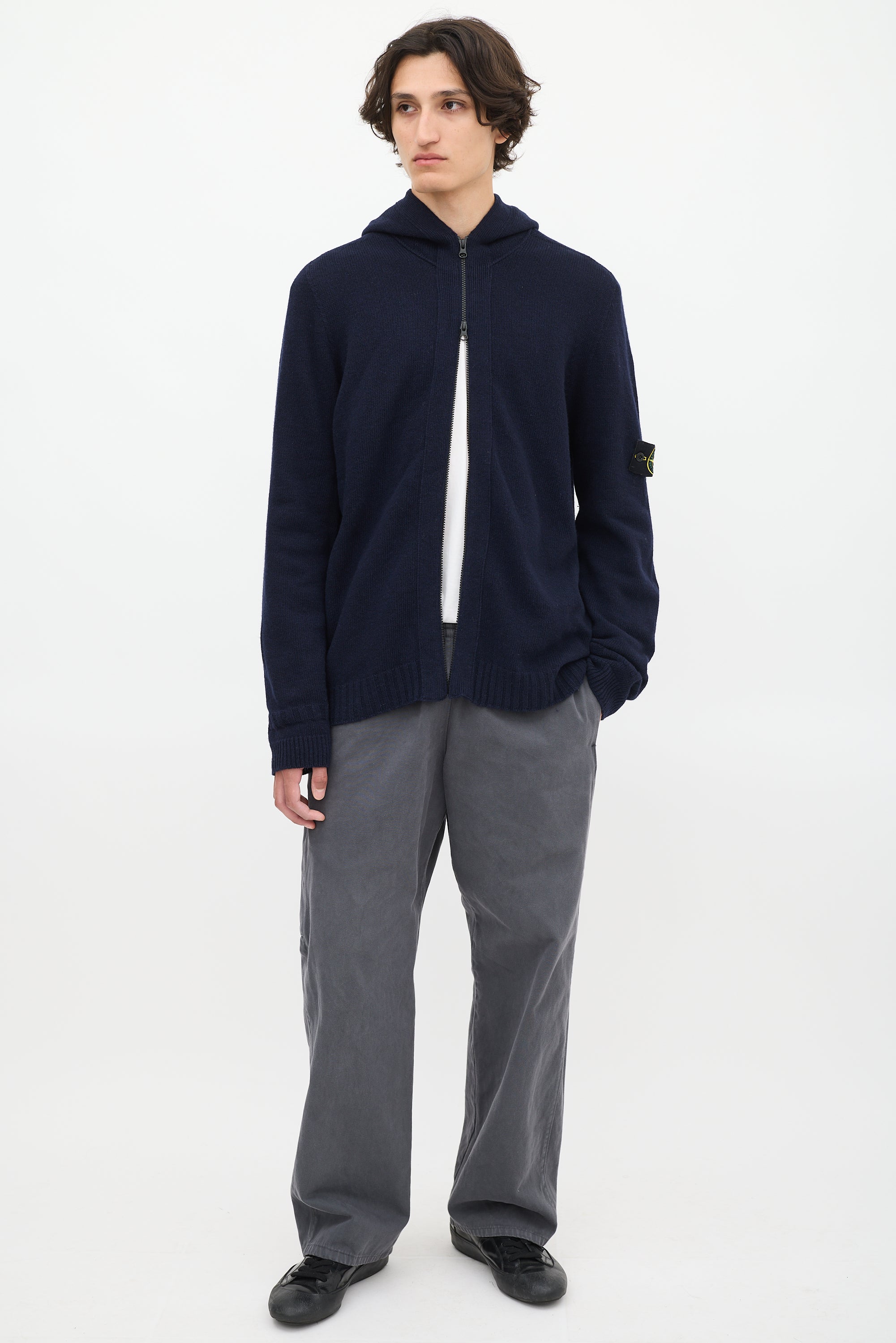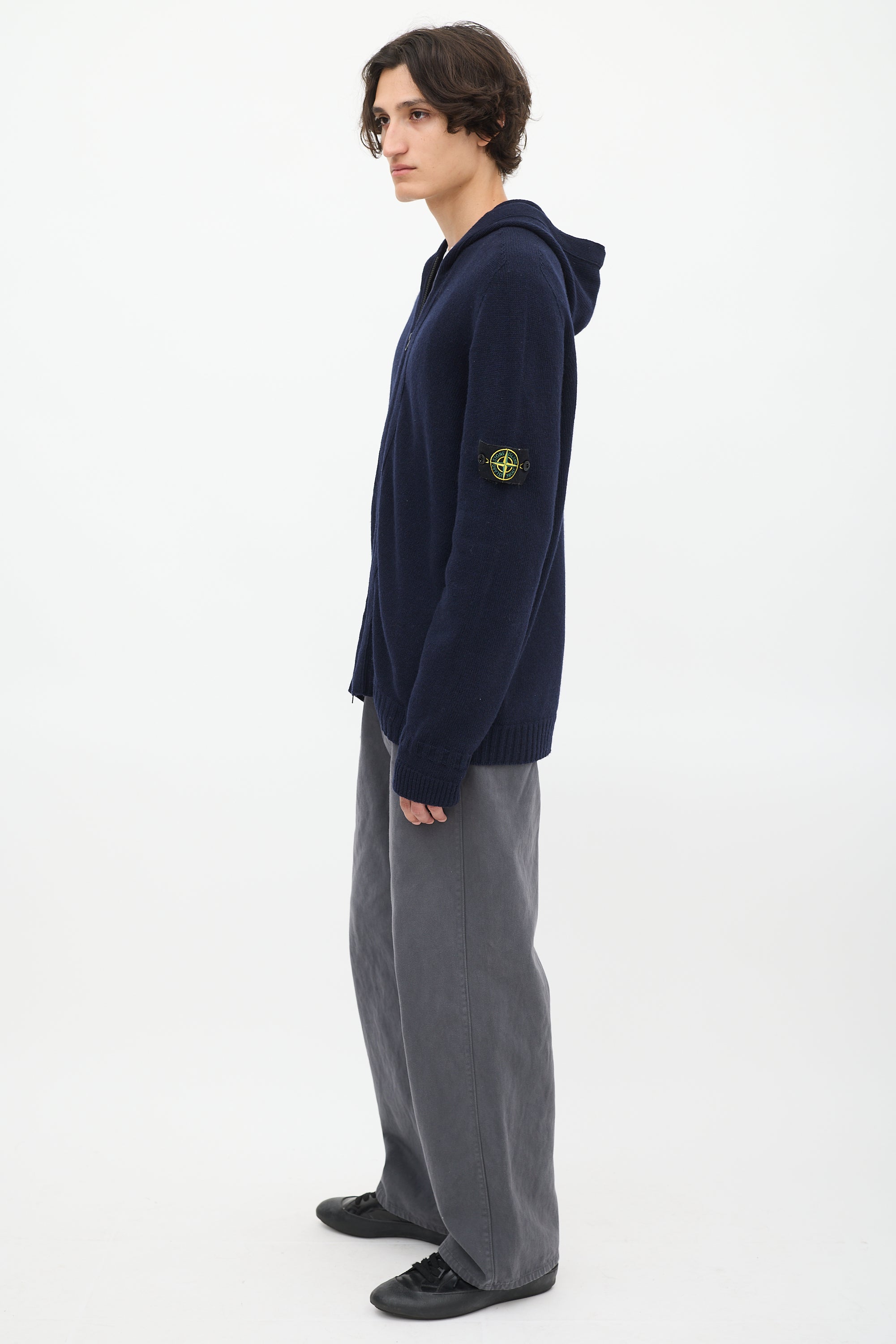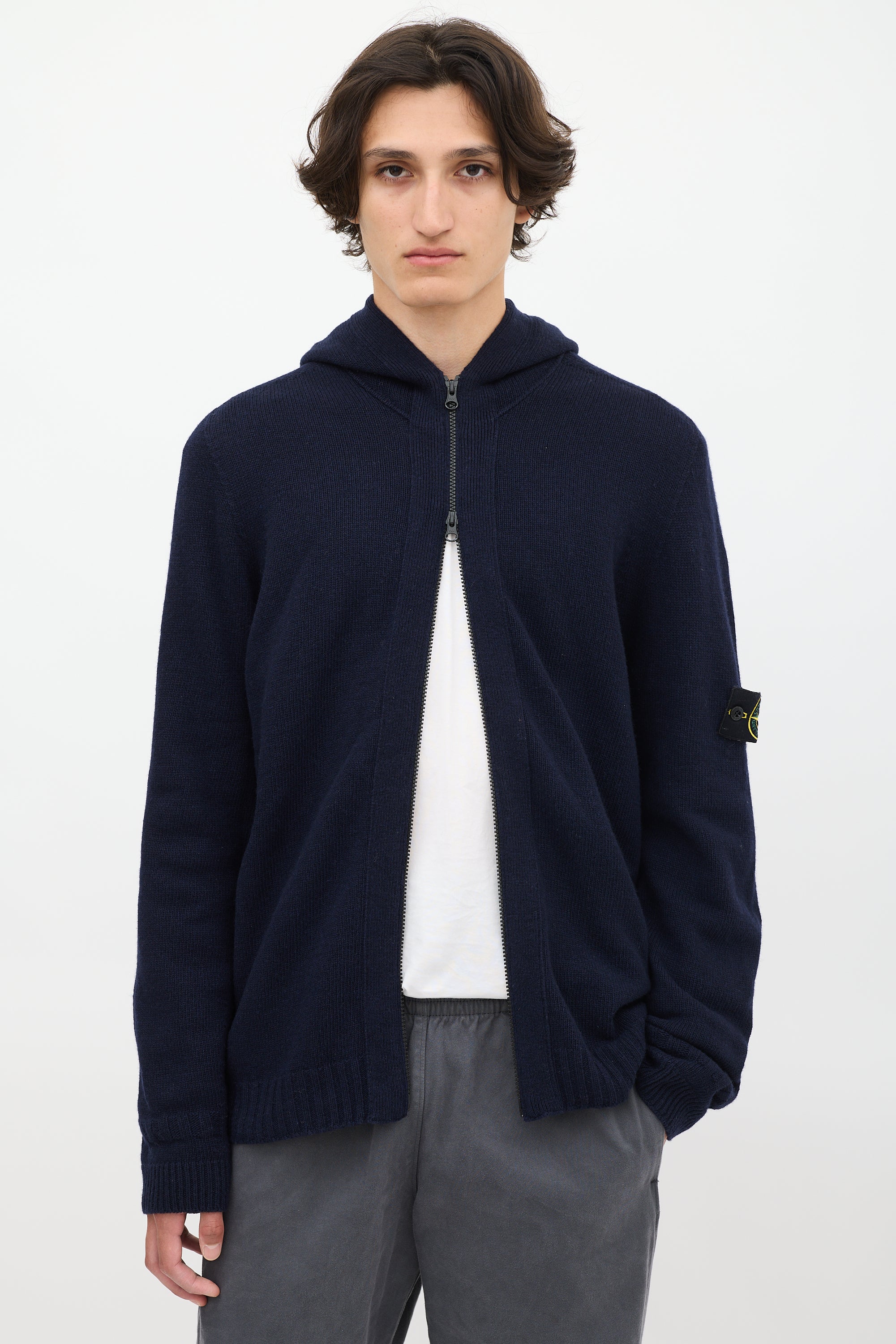 Pre-owned Stone Island navy wool blend knit hoodie featuring full front double zip, long sleeves, signature removable black logo patch at left arm, and ribbing at hem and cuffs.