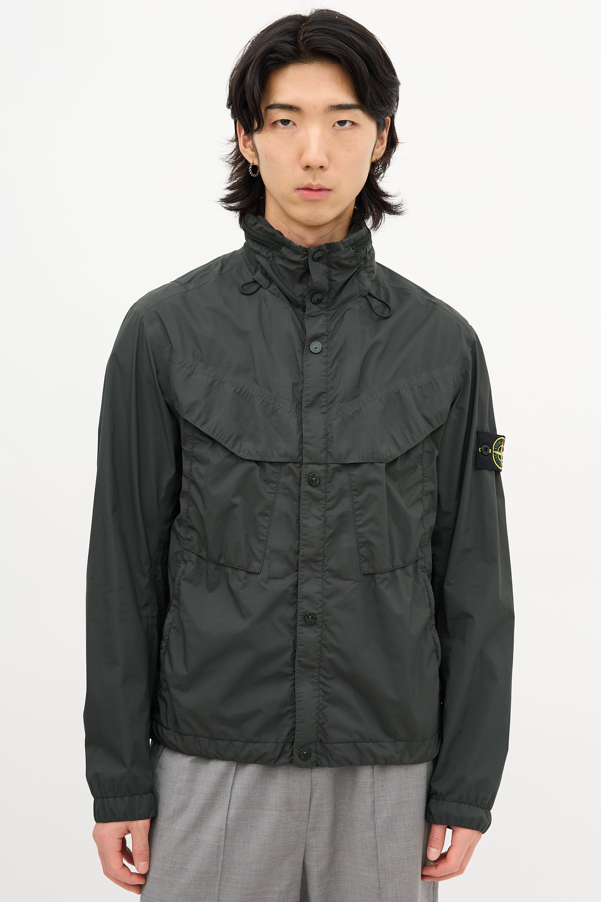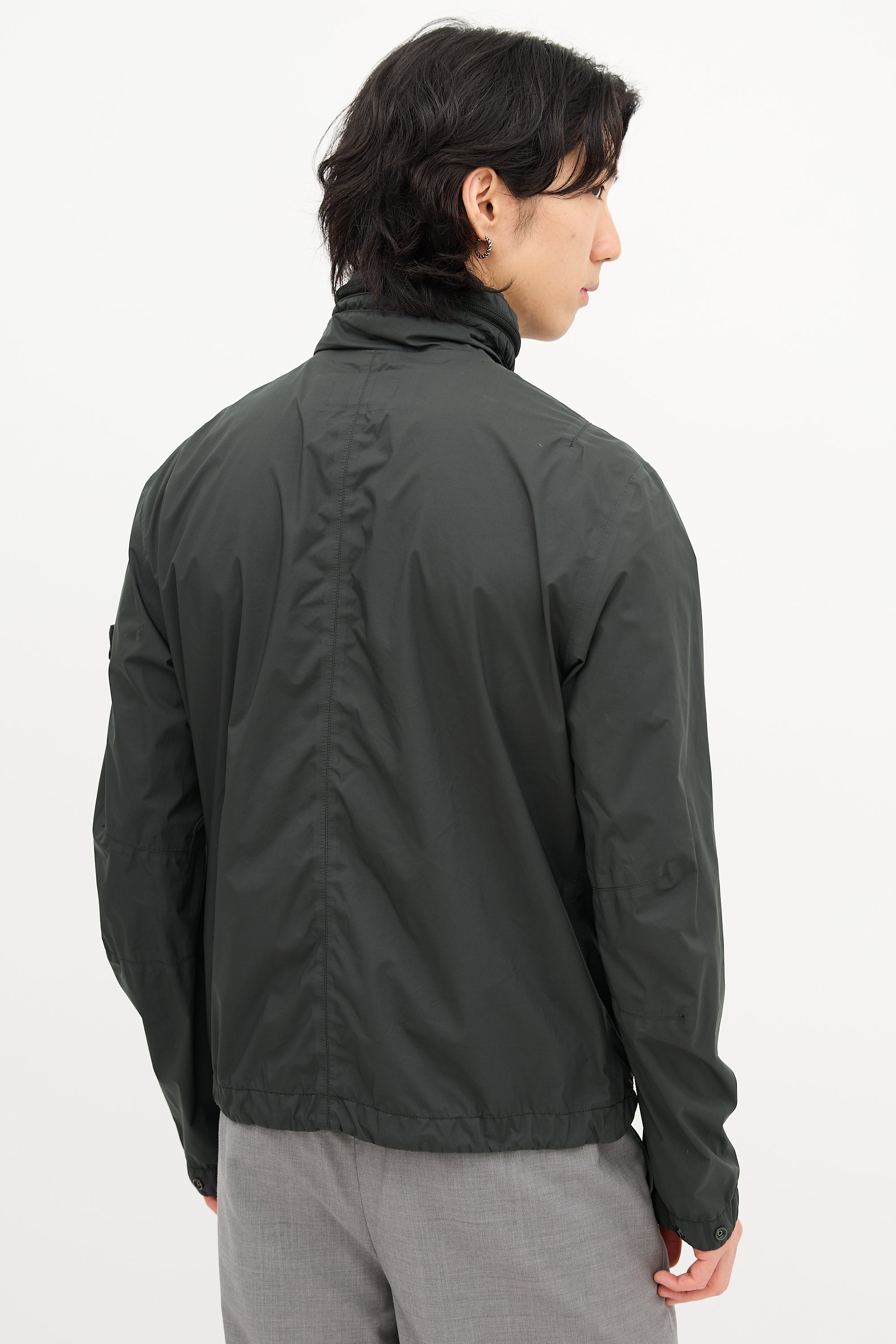 Pre-owned Stone Island black nylon jacket featuring stand collar with packable hood, zip front, snap button placket, four front pockets, drawcord hem, underarm vents, removable signature logo patch at left arm, and snap buttoned cuffs.