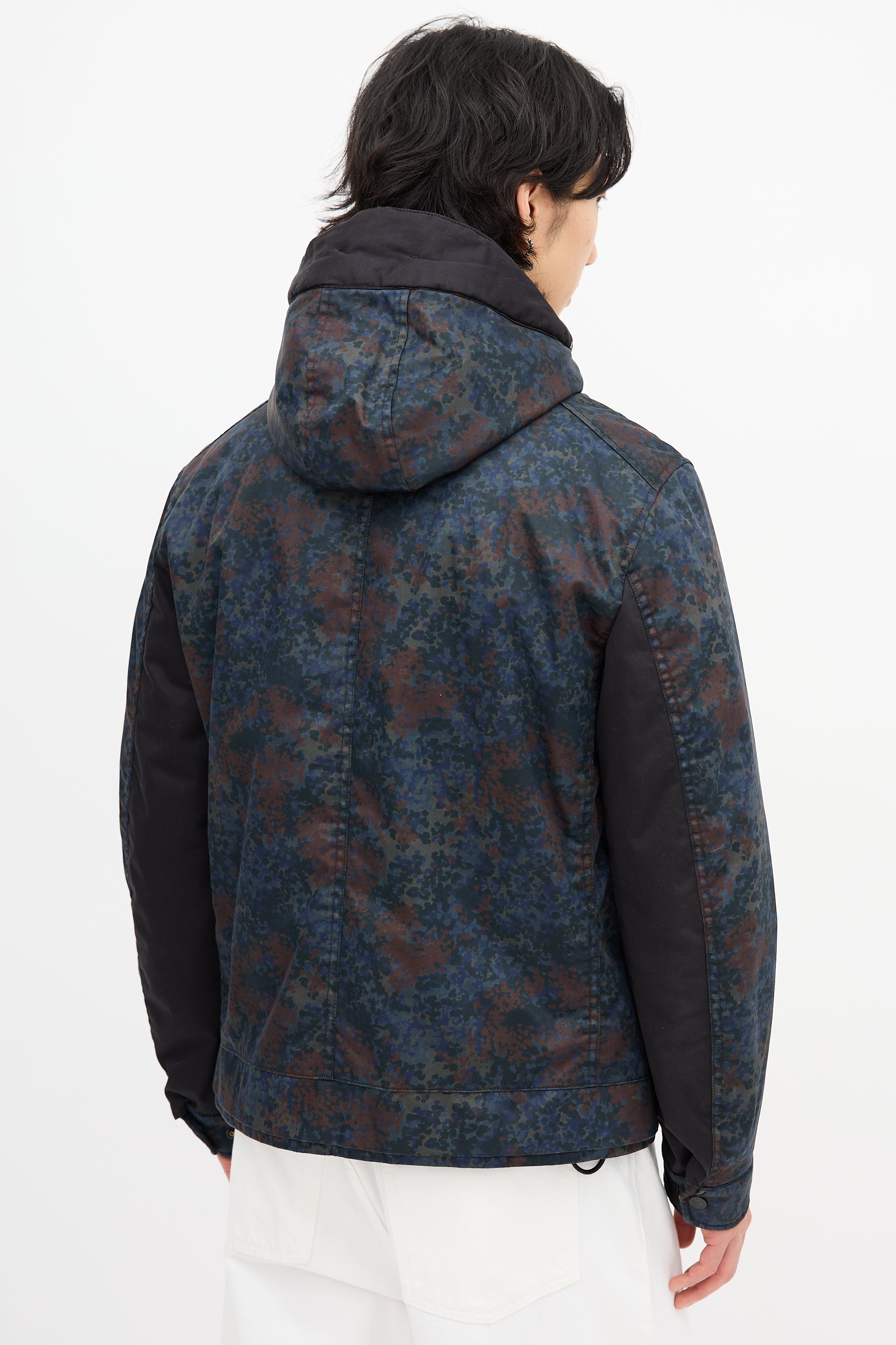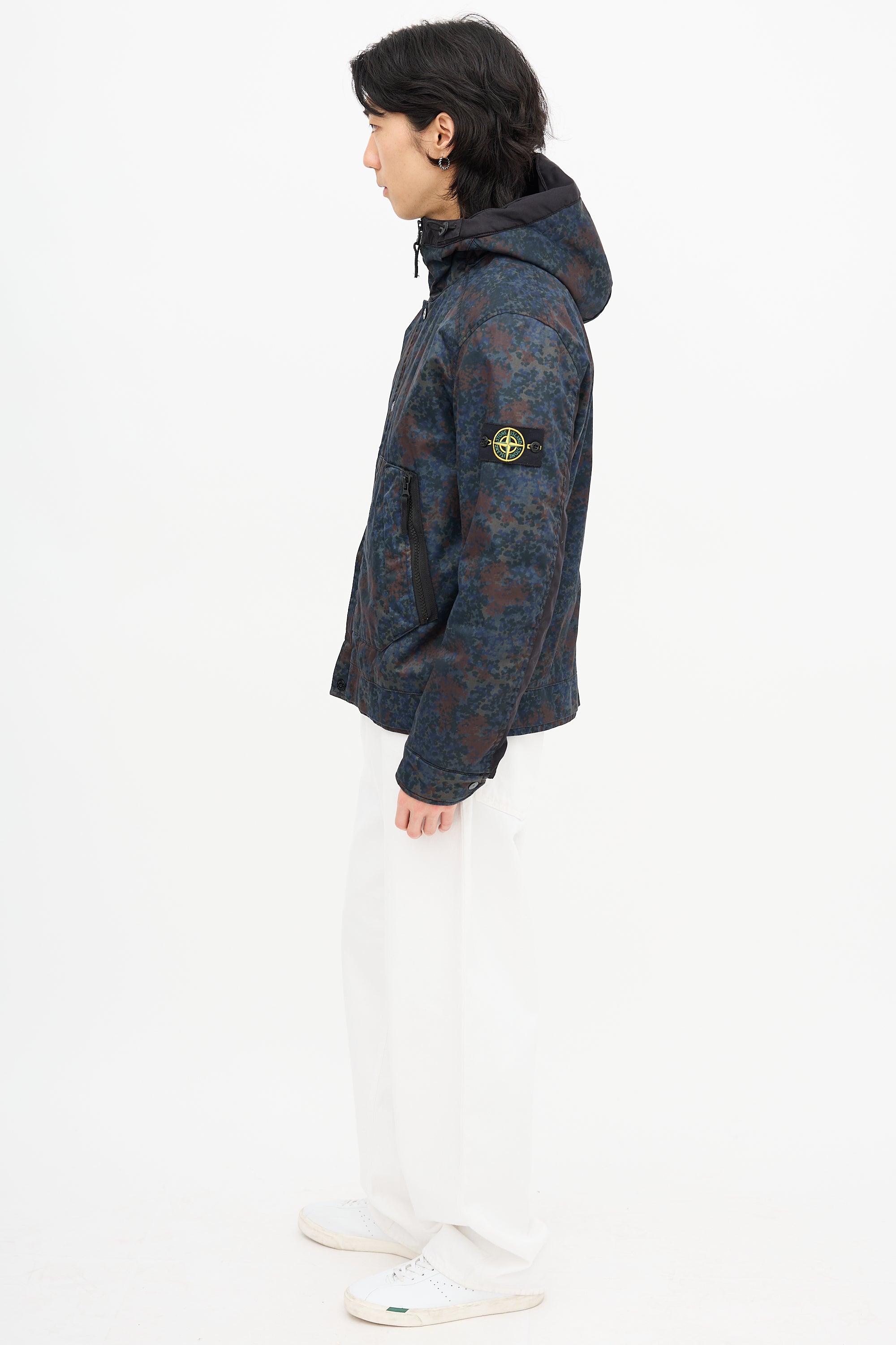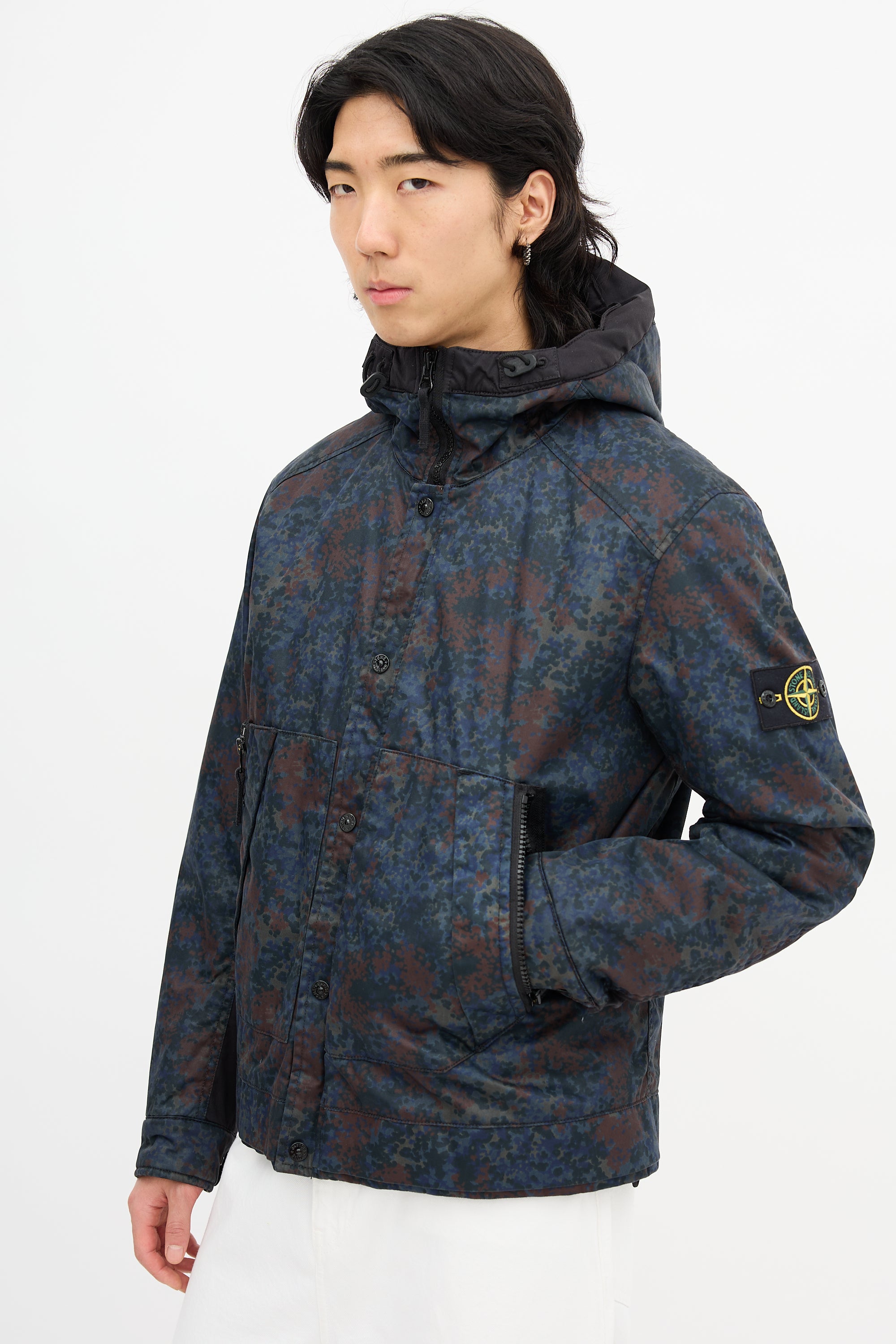 Pre-owned Stone Island navy jacket featuring Raso Gommato camouflage print, high neck with attached drawstring hood, zip front, snap button placket, two front zip pockets, one interior pocket, drawstring hem, removable signature logo patch at left arm, and snap buttoned cuffs. Padded and lined.