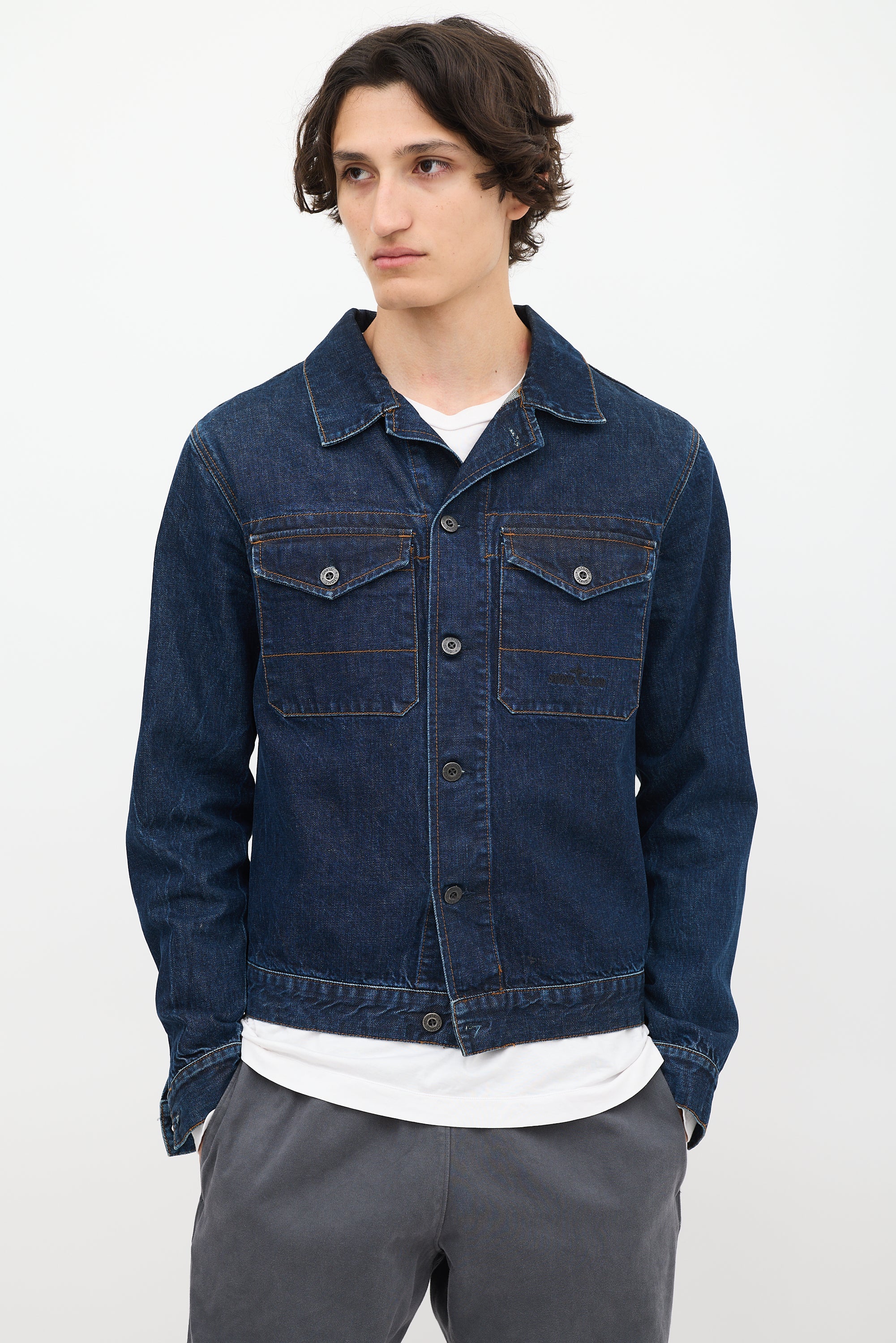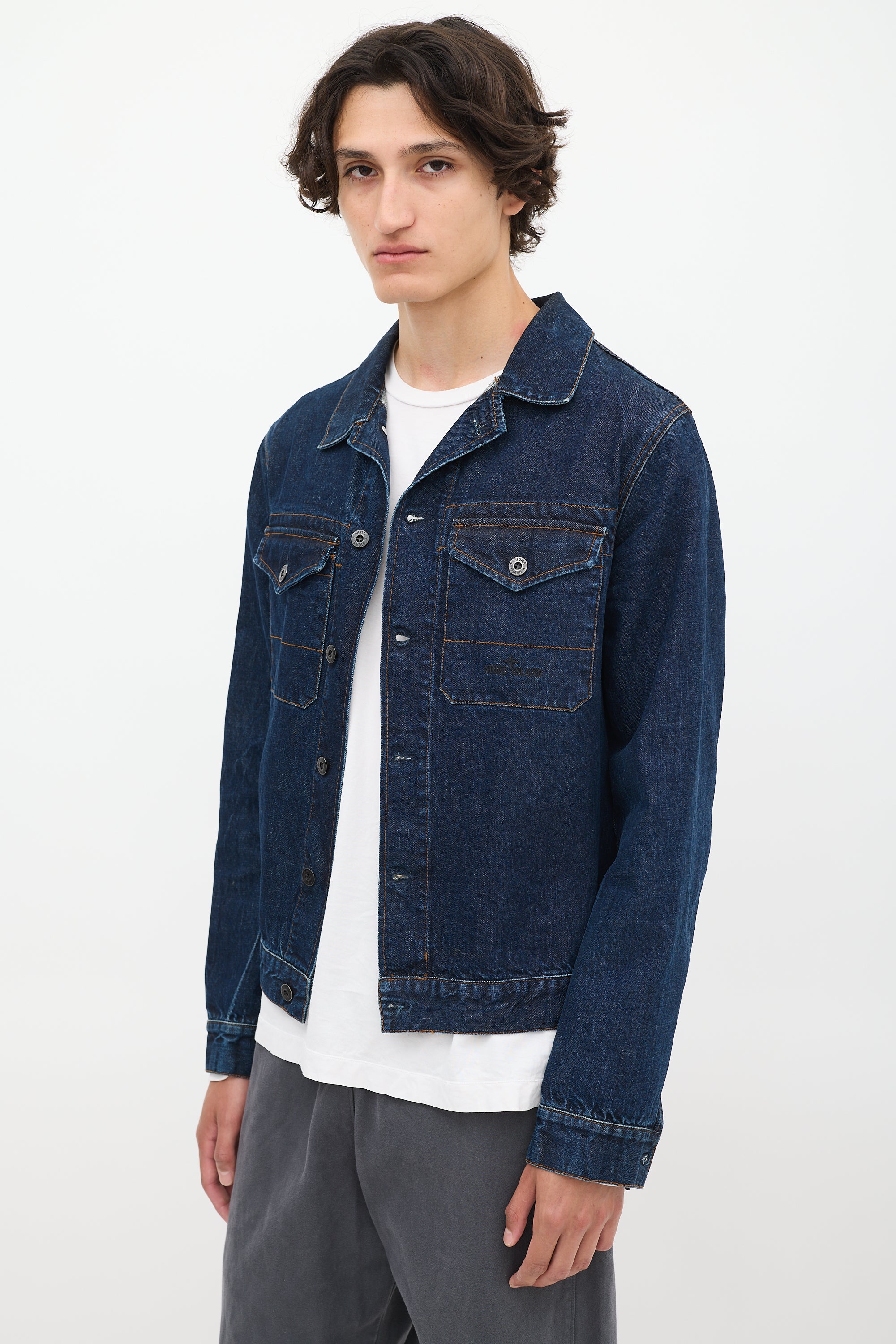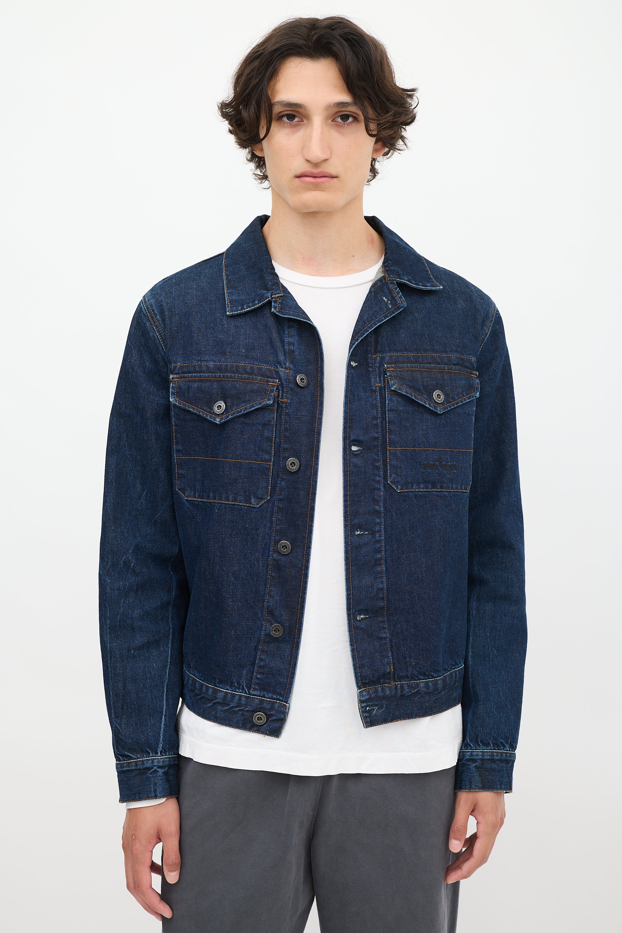 Pre-owned Stone Island raw denim jacket featuring a convertible collar, button up front, two front buttoned flap pockets, waist adjusters, and long sleeves with buttoned cuffs.