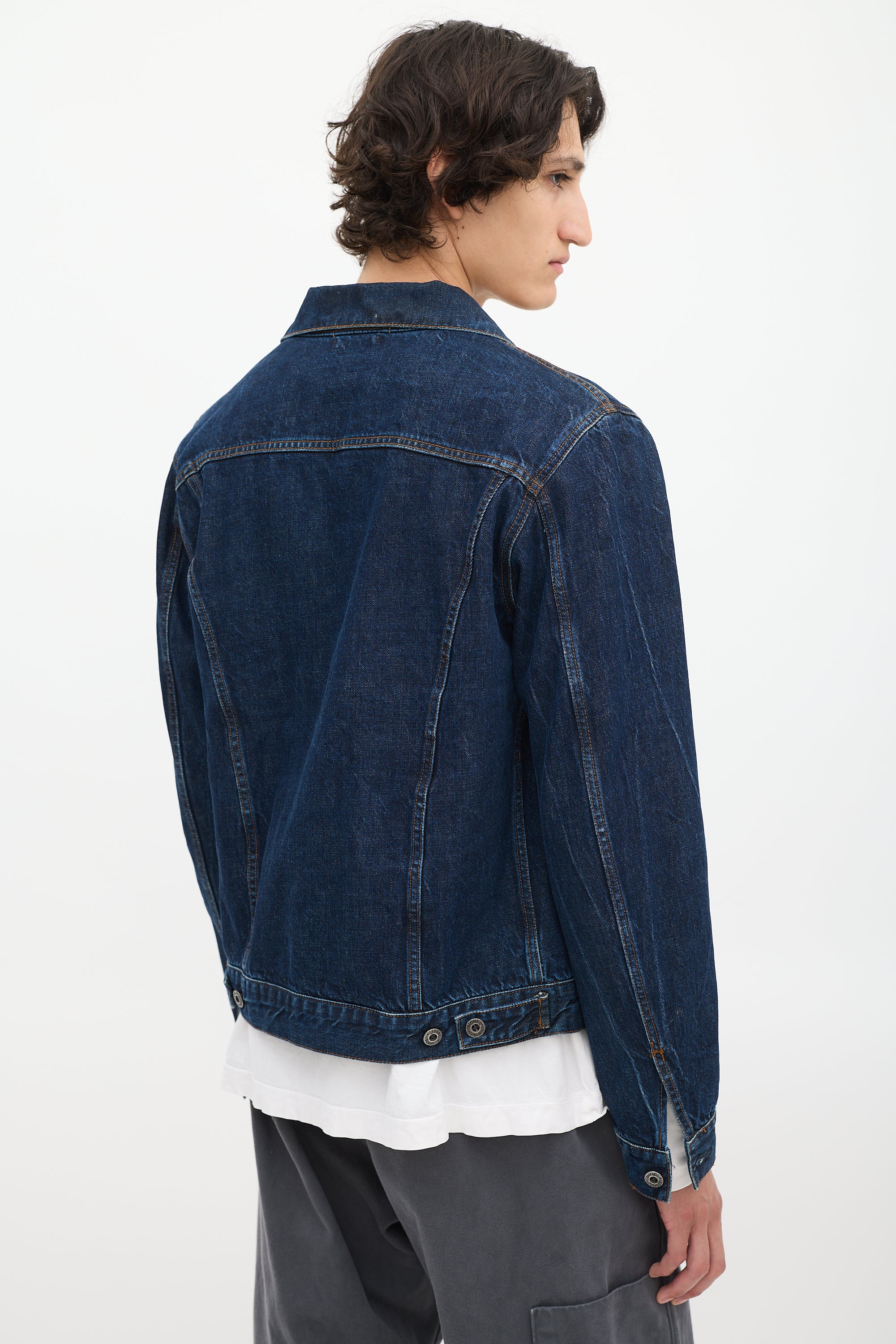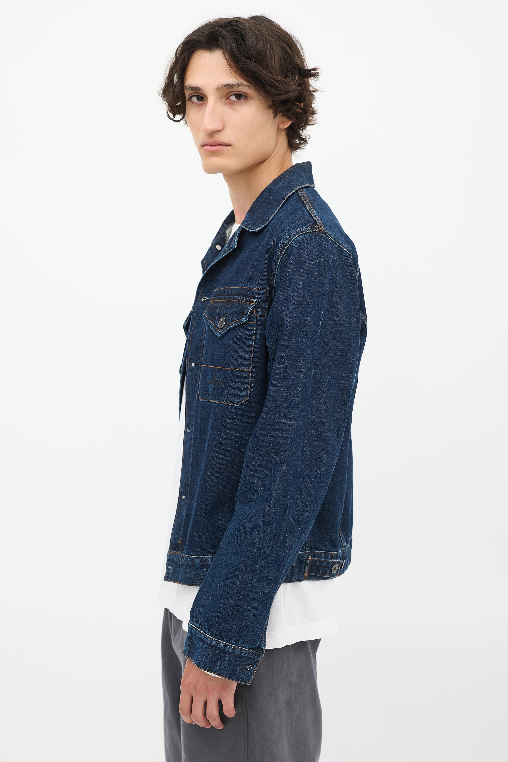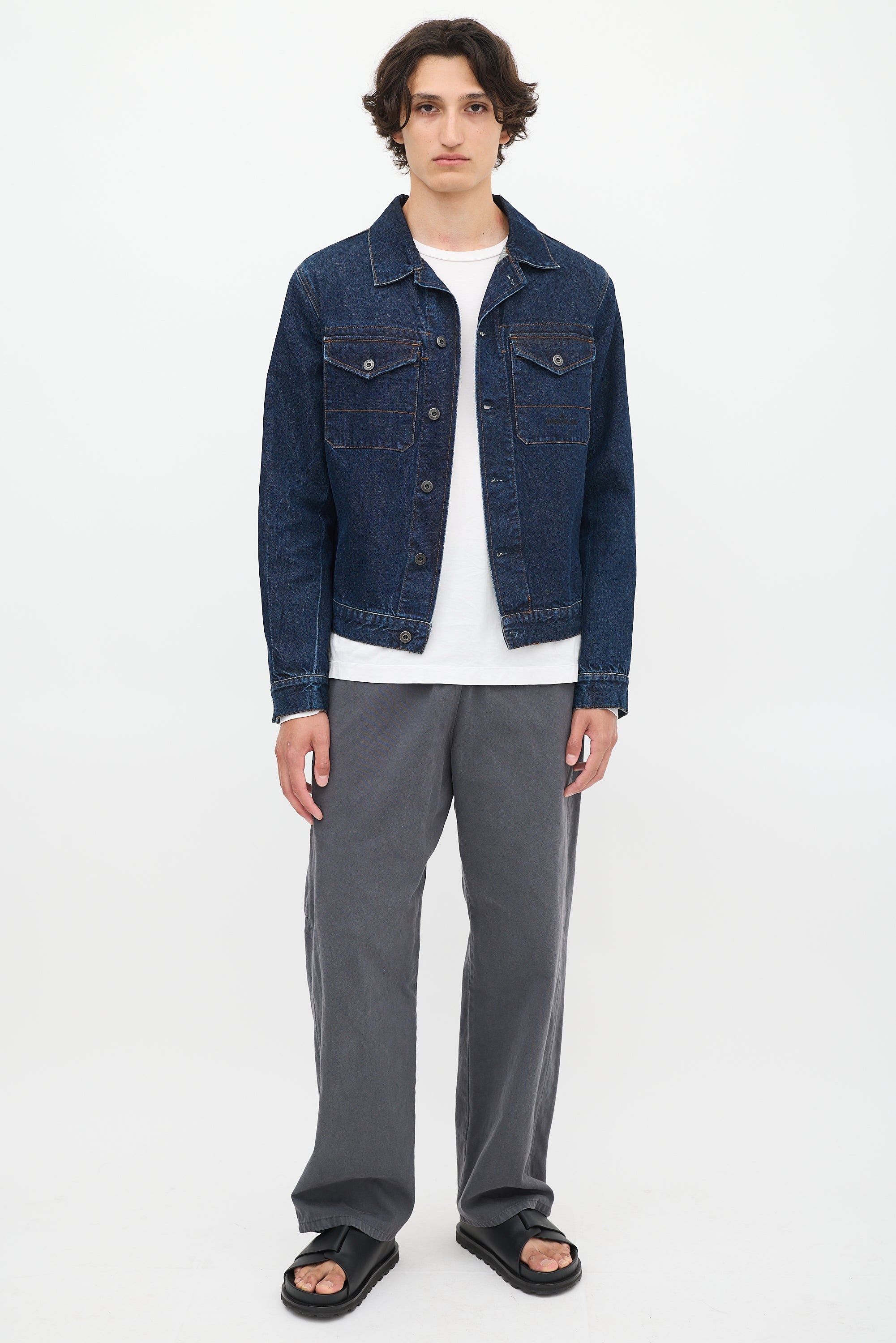 Pre-owned Stone Island raw denim jacket featuring a convertible collar, button up front, two front buttoned flap pockets, waist adjusters, and long sleeves with buttoned cuffs.