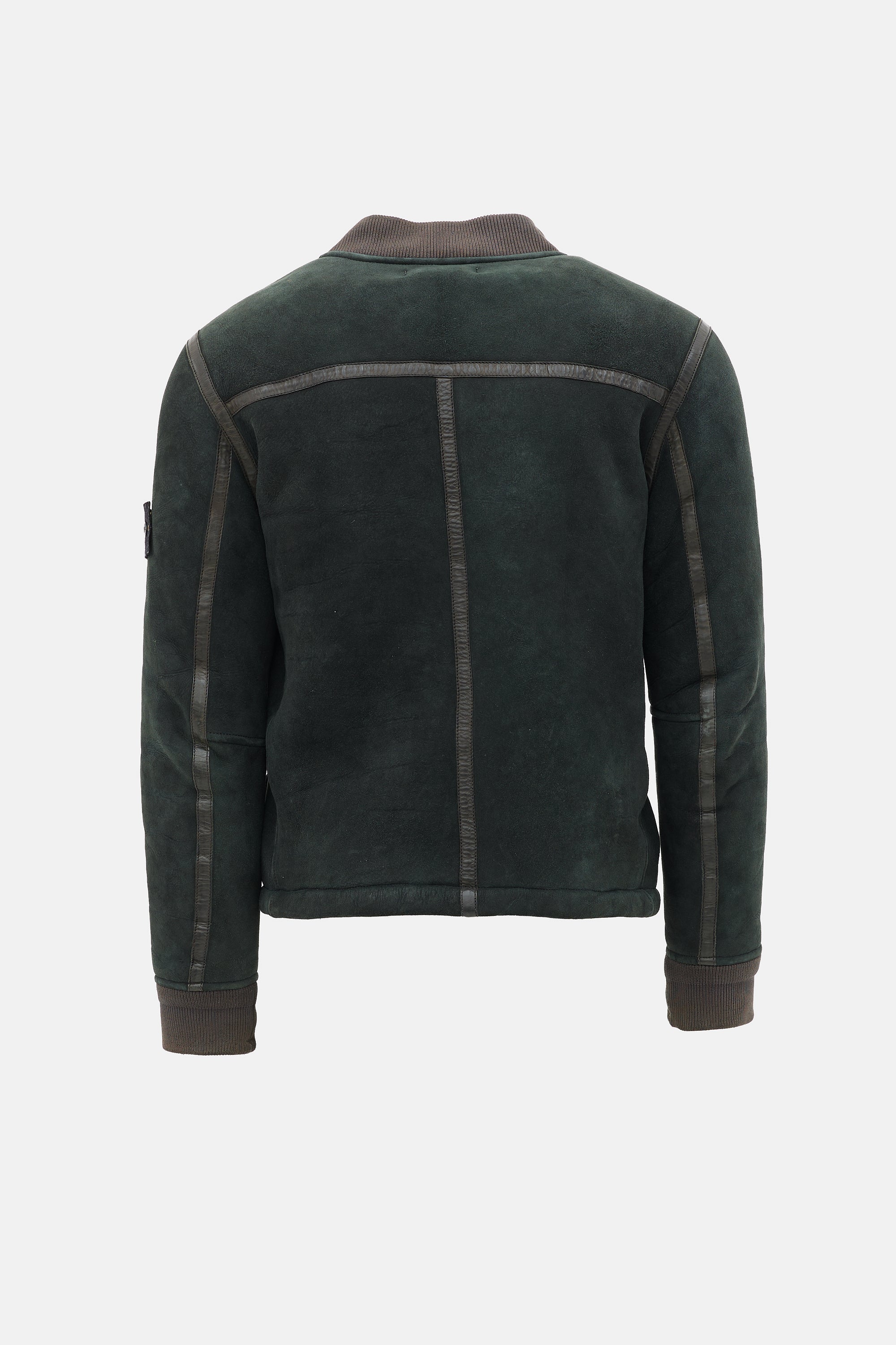 Pre-owned Stone Island black shearling bomber jacket featuring tonal leather trim, zip up front, two front slip pockets, logo patch at left arm, and ribbed collar, hem, and cuffs.