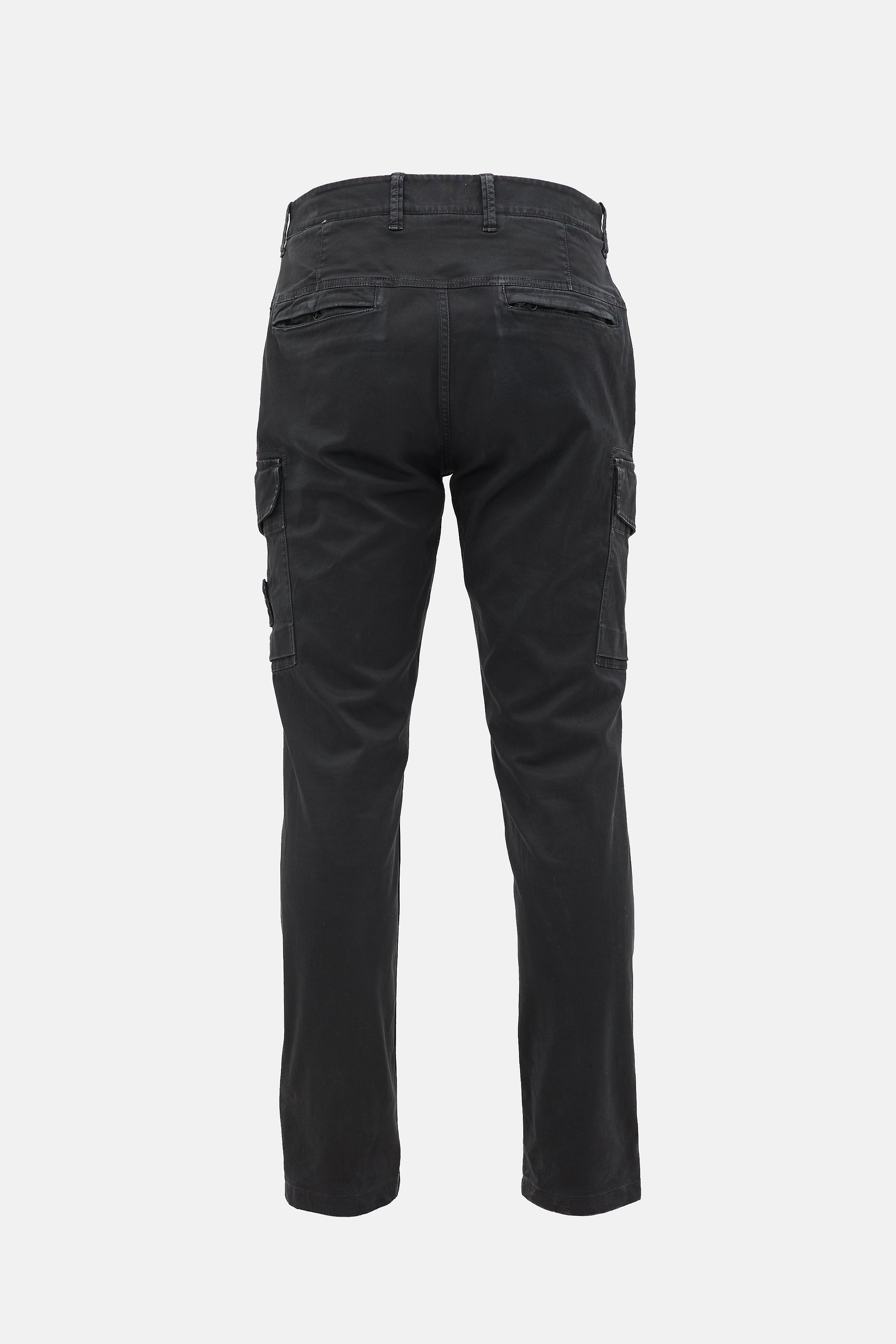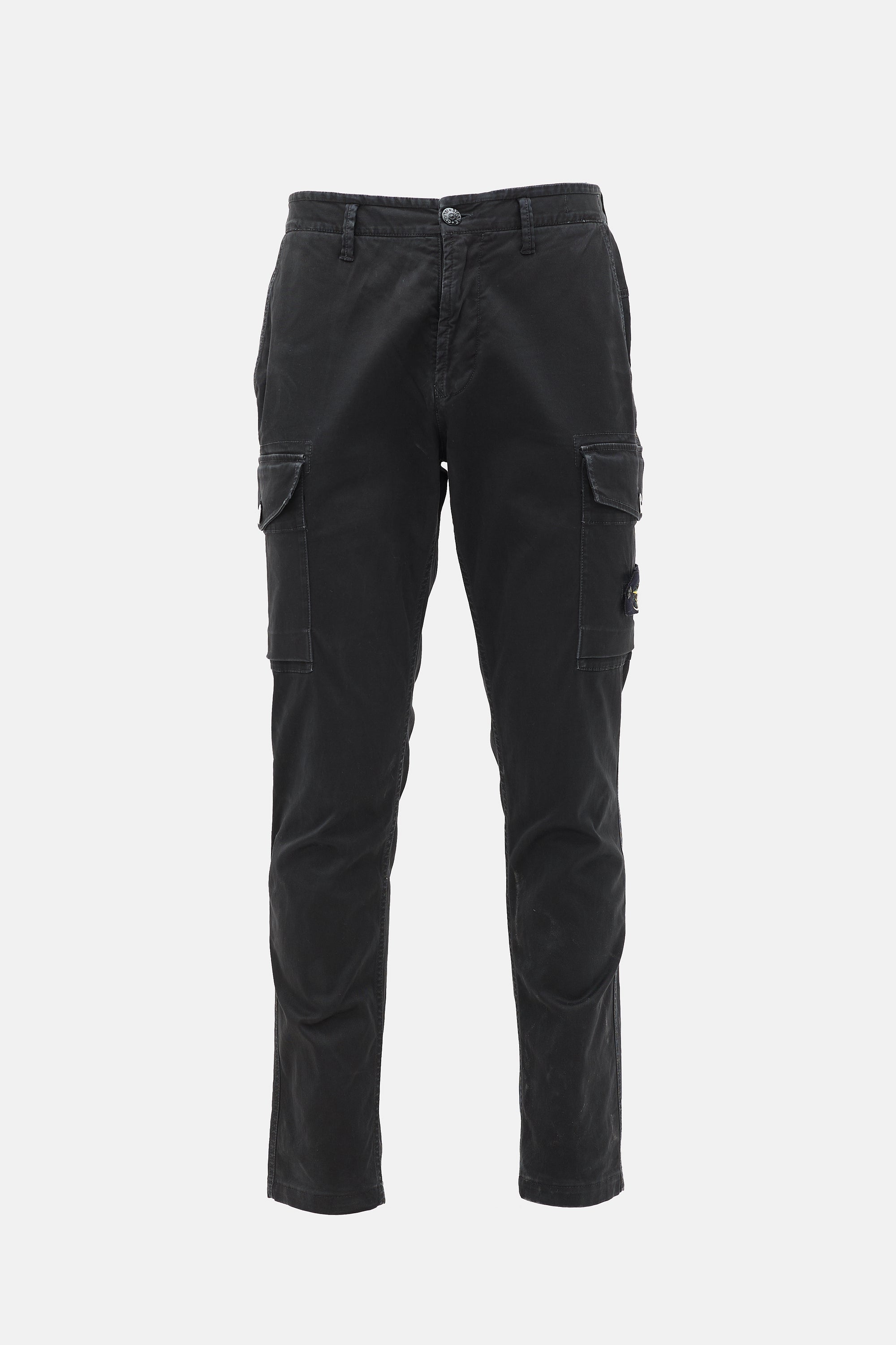 Pre-owned Stone Island black trousers featuring slim leg, four pocket styling, two cargo pockets at outseam, patch logo at left flap pocket, and zip fly.