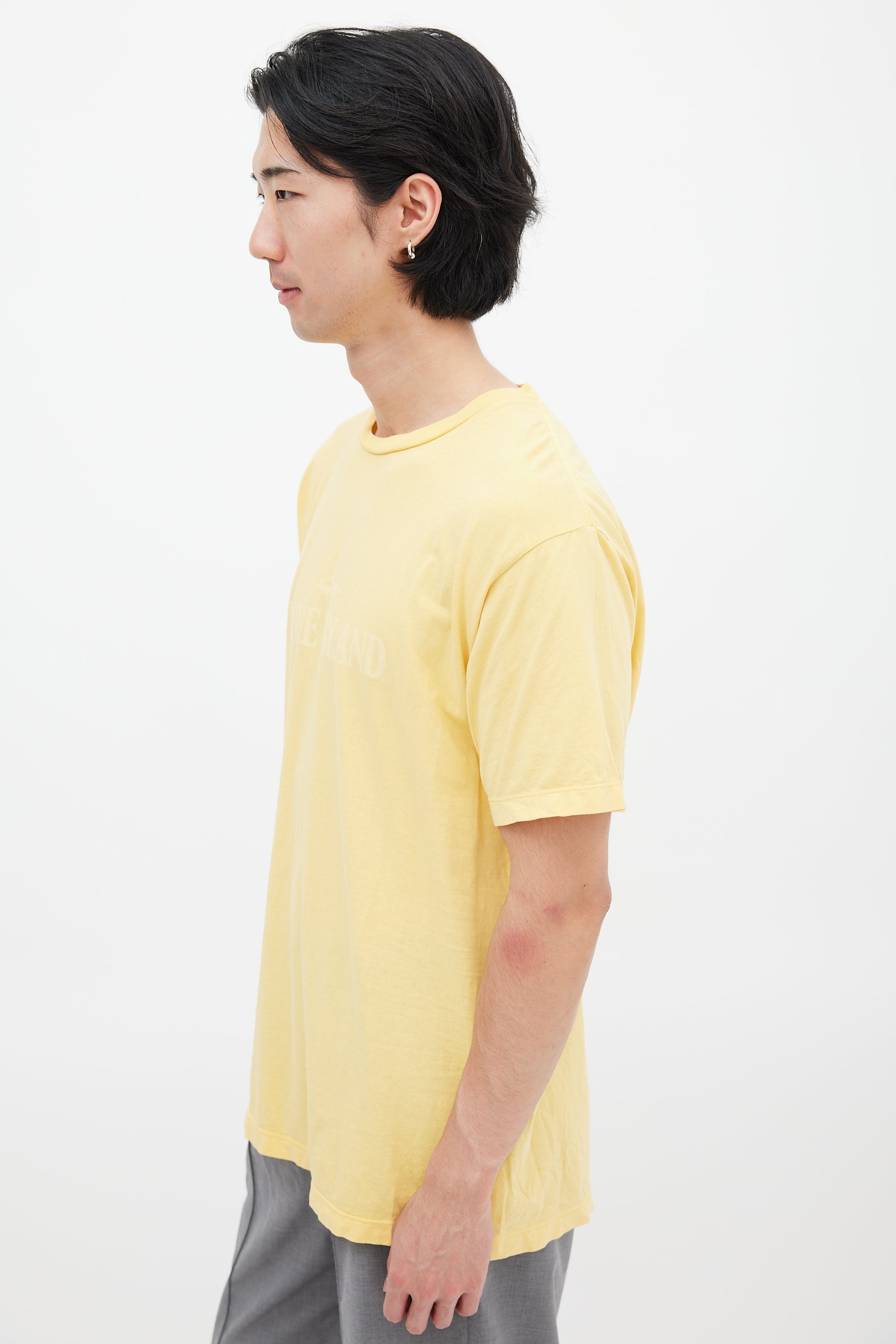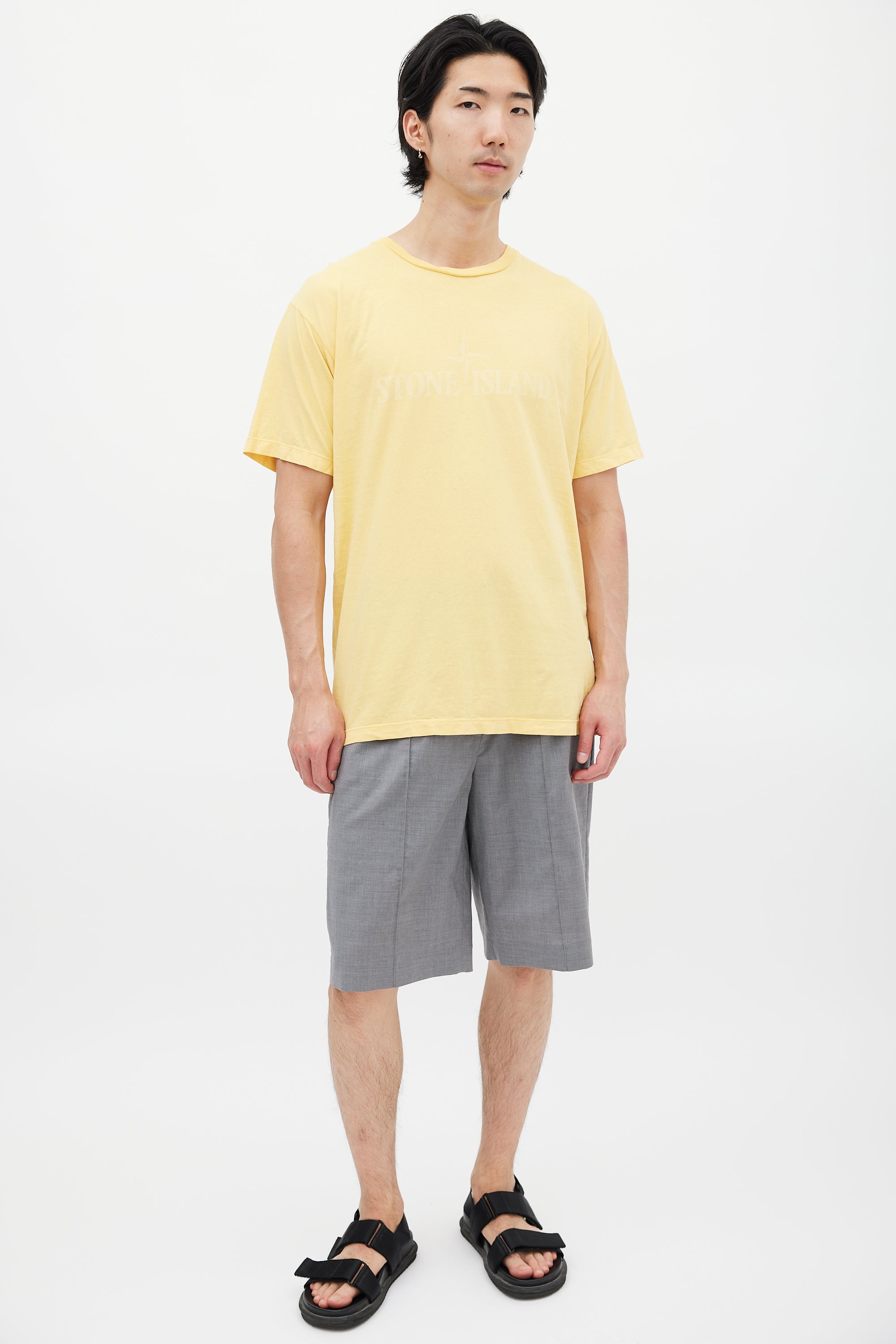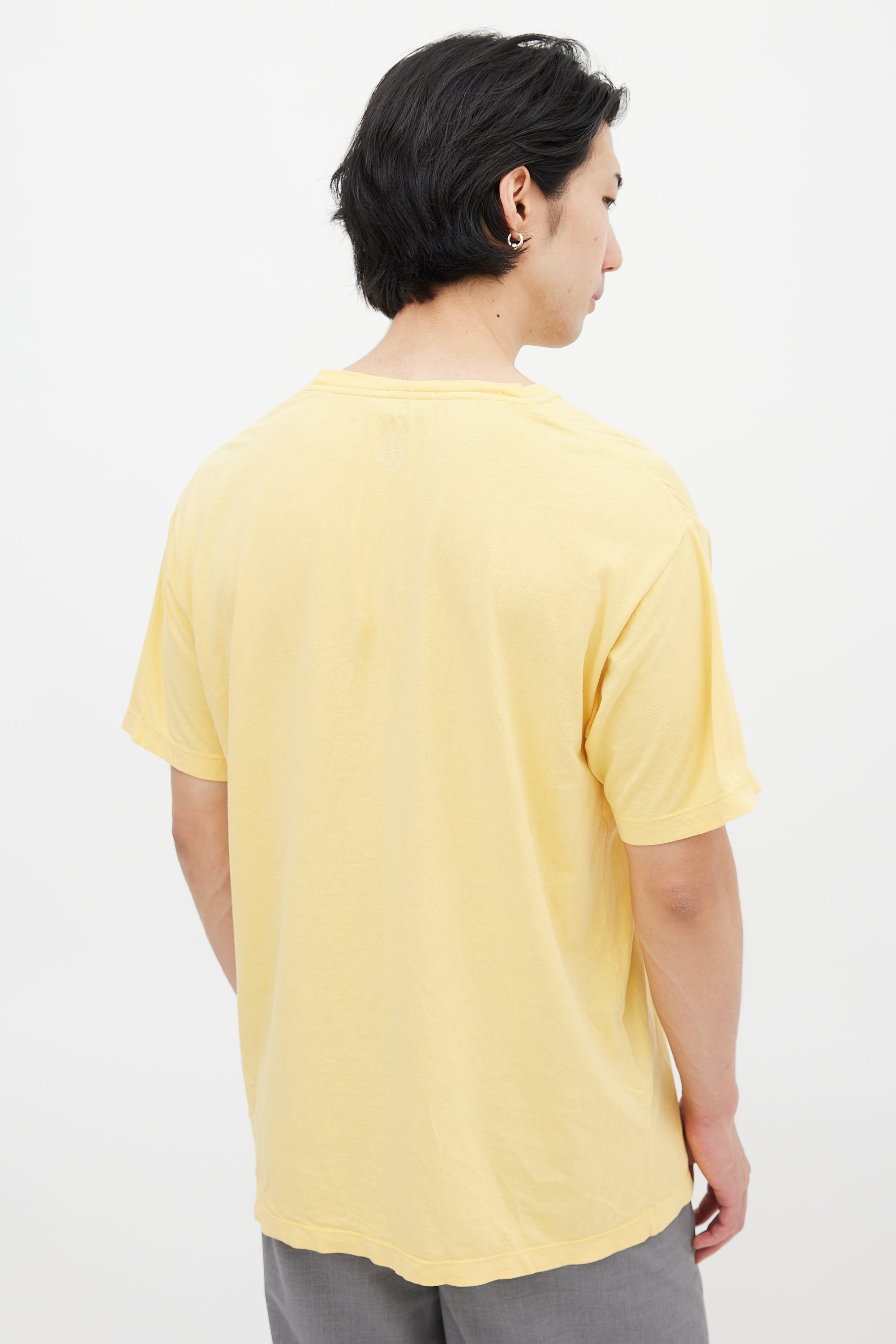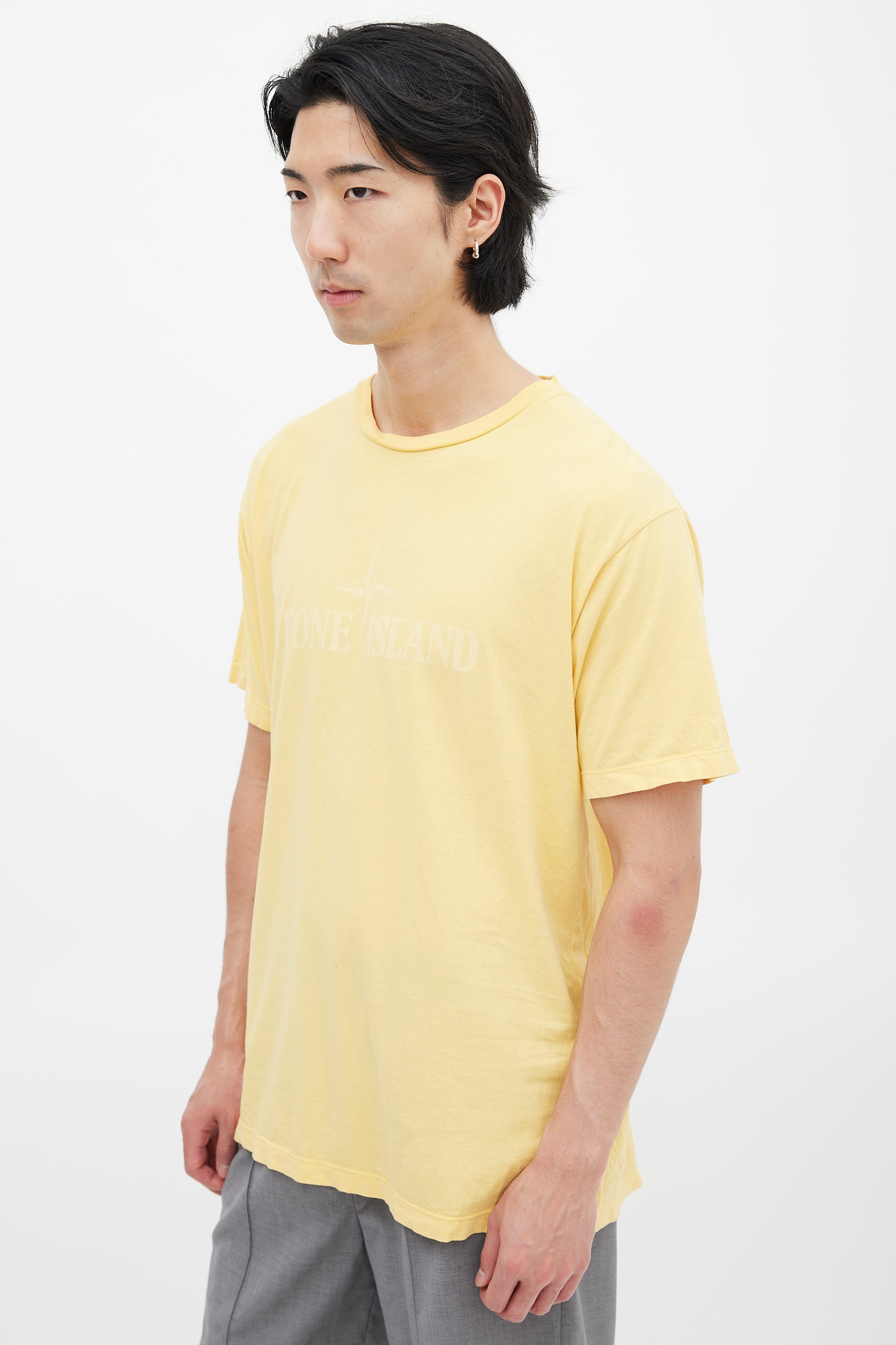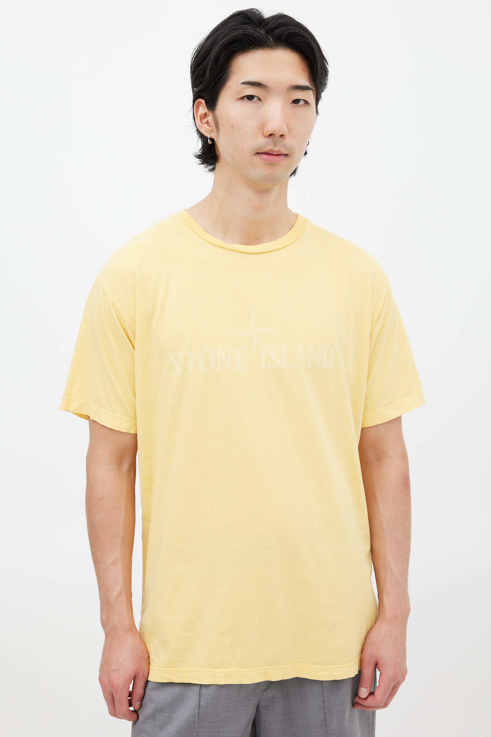 Pre-owned Stone Island yellow T-shirt featuring a ribbed round neck, tonal printed logo across chest and back neck, even hem, and short sleeves.