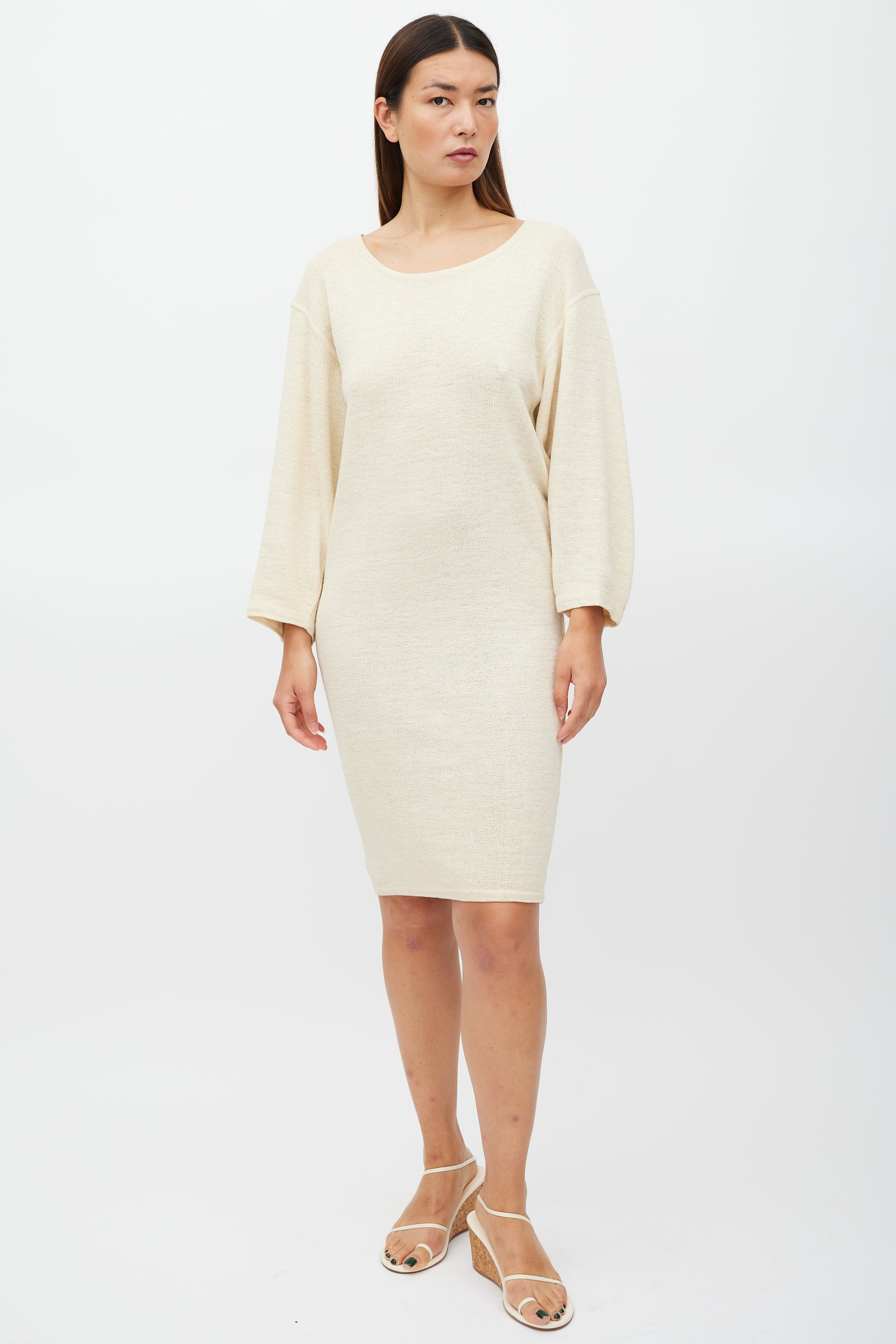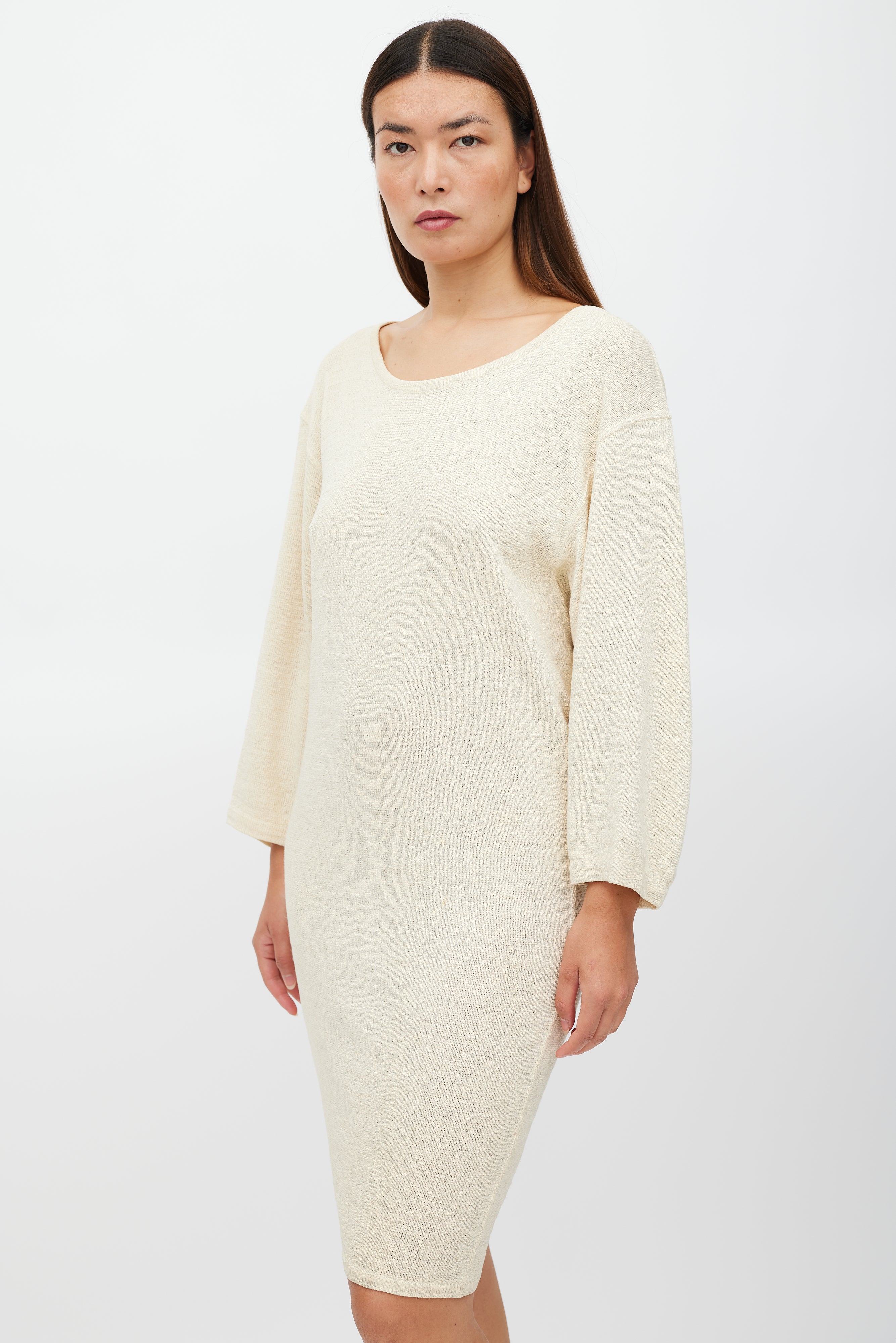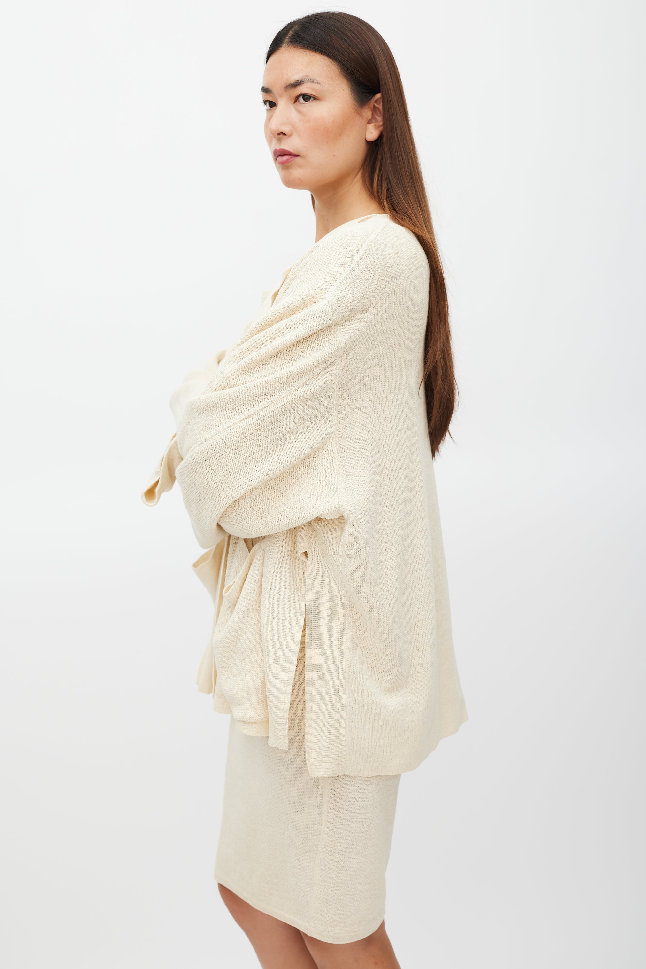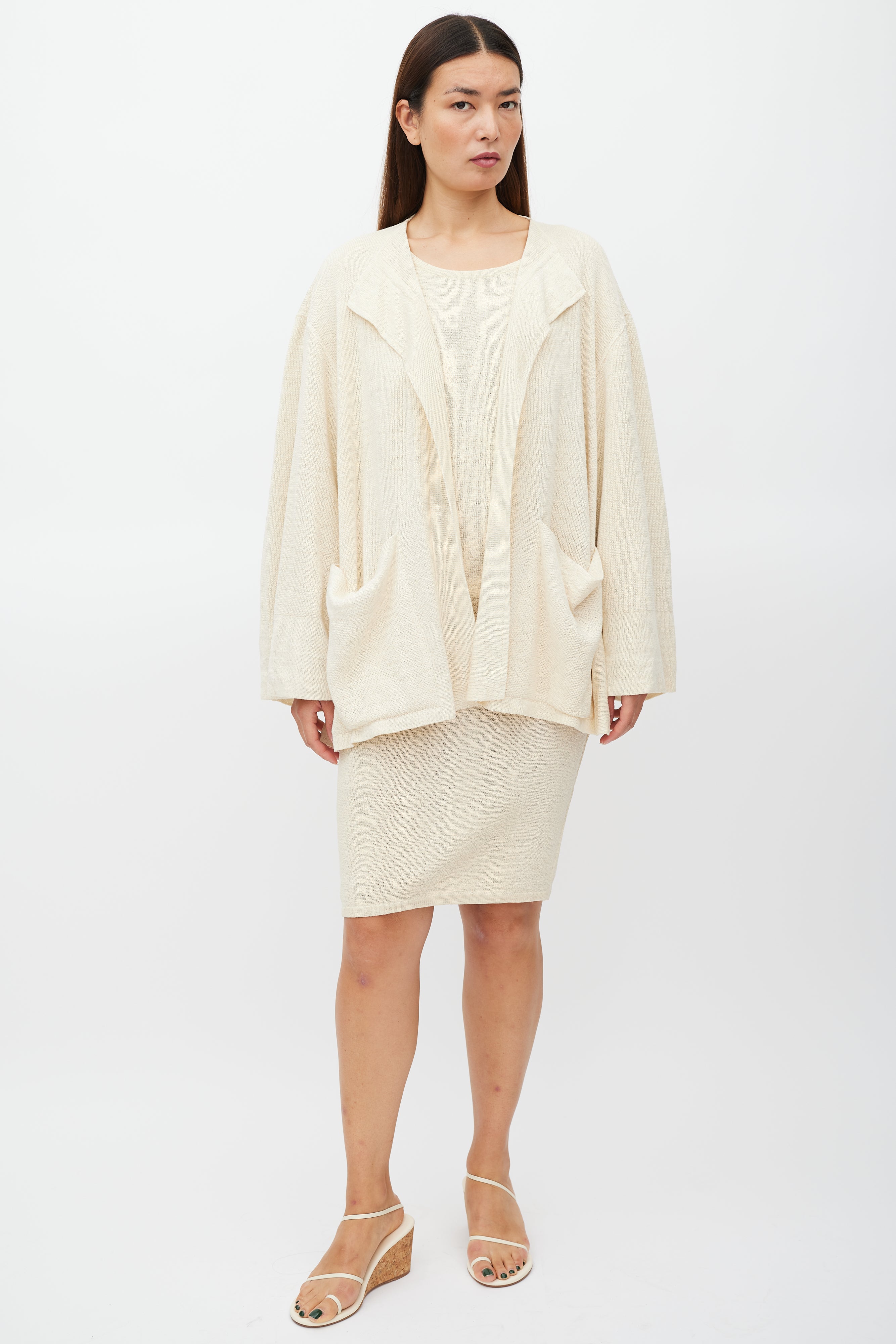 Pre-owned Alaïa beige knit co-ord set featuring a midi dress with a scooped neck, oversized design, dropped shoulders, and three quarter sleeves. Matching cardigan features an open front, two patch pockets at front hip, side slits, dropped shoulders, and long sleeves.