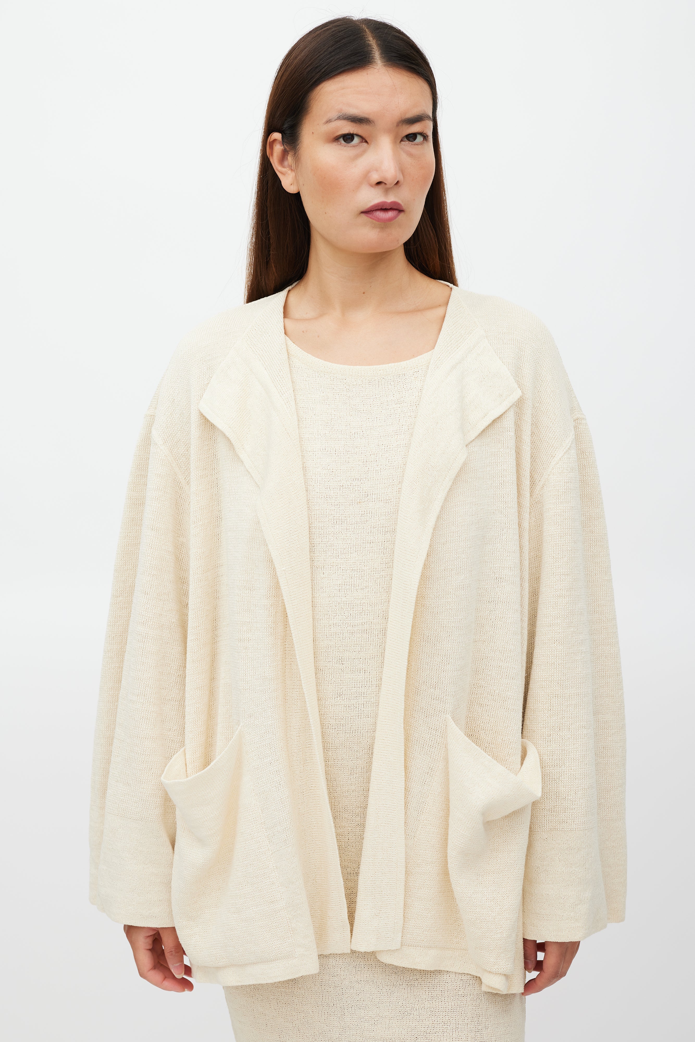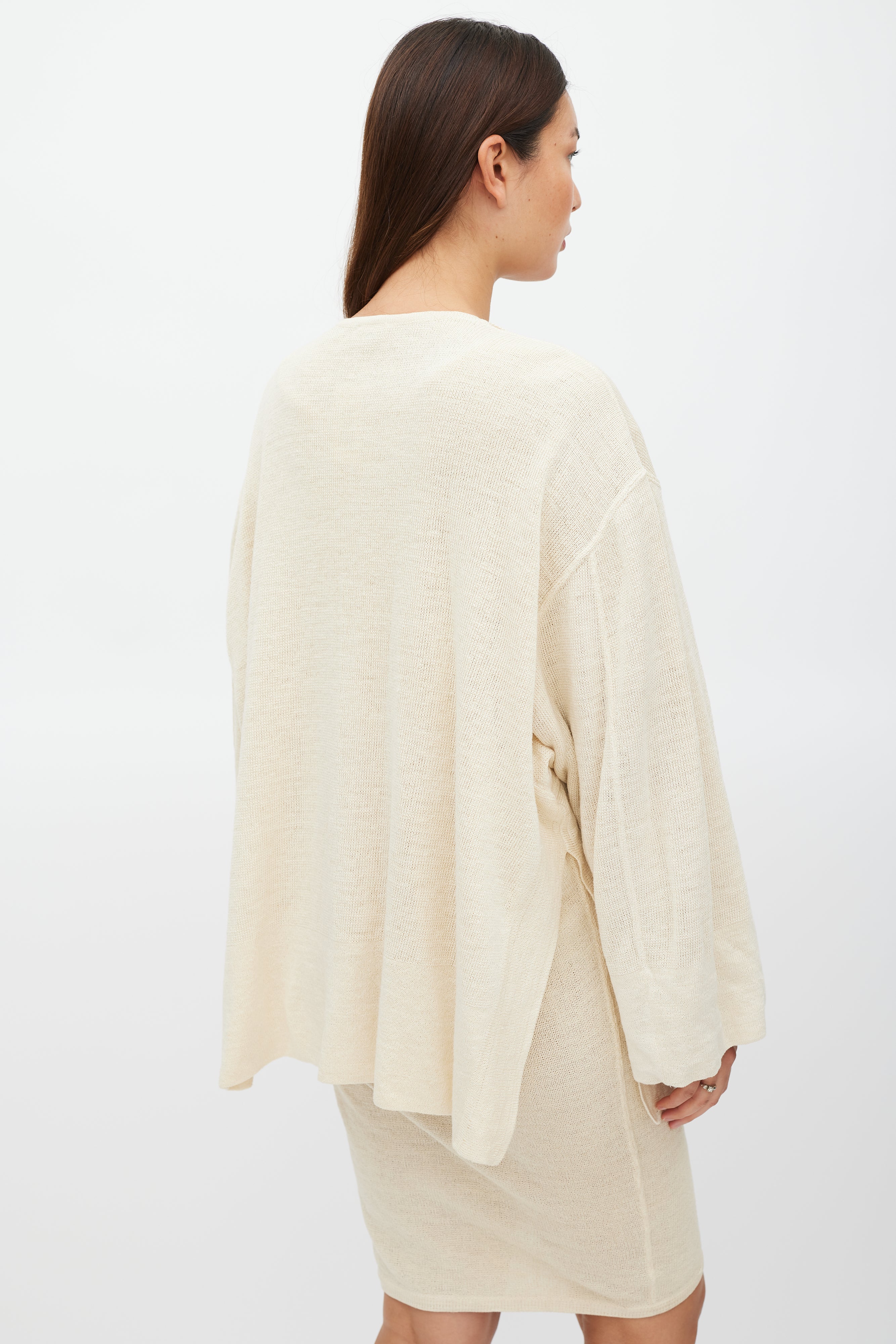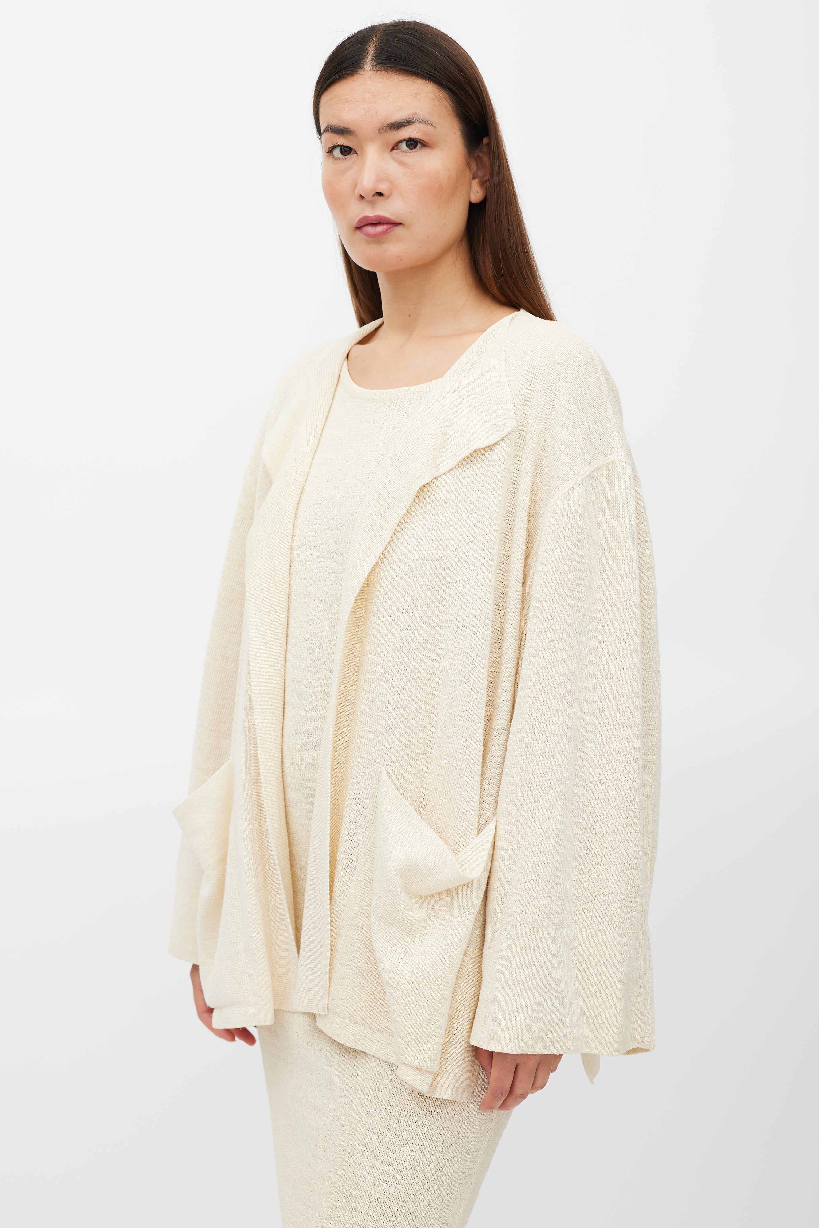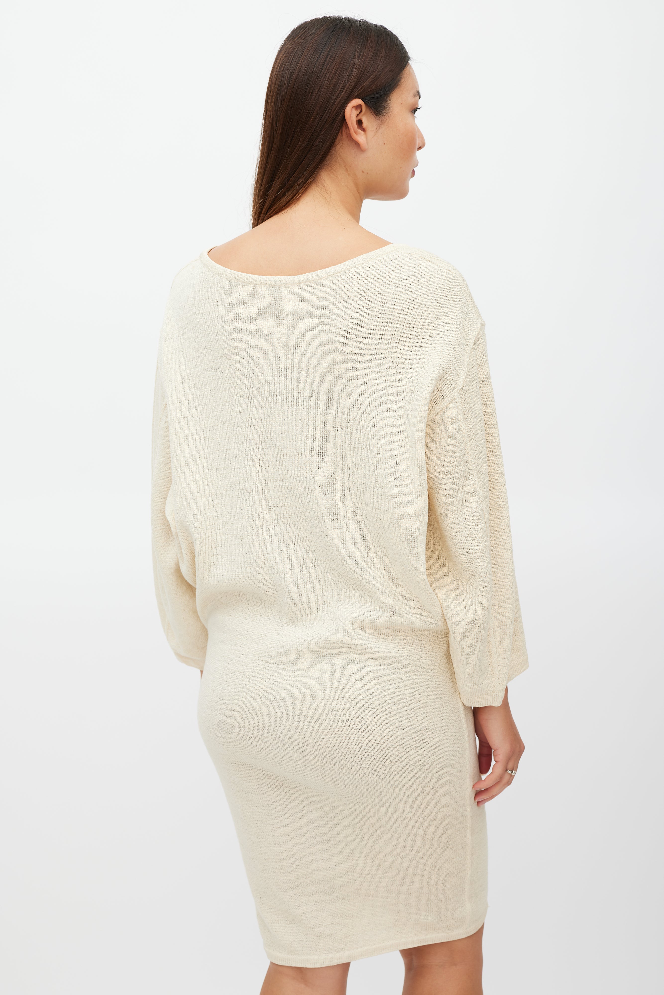 Pre-owned Alaïa beige knit co-ord set featuring a midi dress with a scooped neck, oversized design, dropped shoulders, and three quarter sleeves. Matching cardigan features an open front, two patch pockets at front hip, side slits, dropped shoulders, and long sleeves.