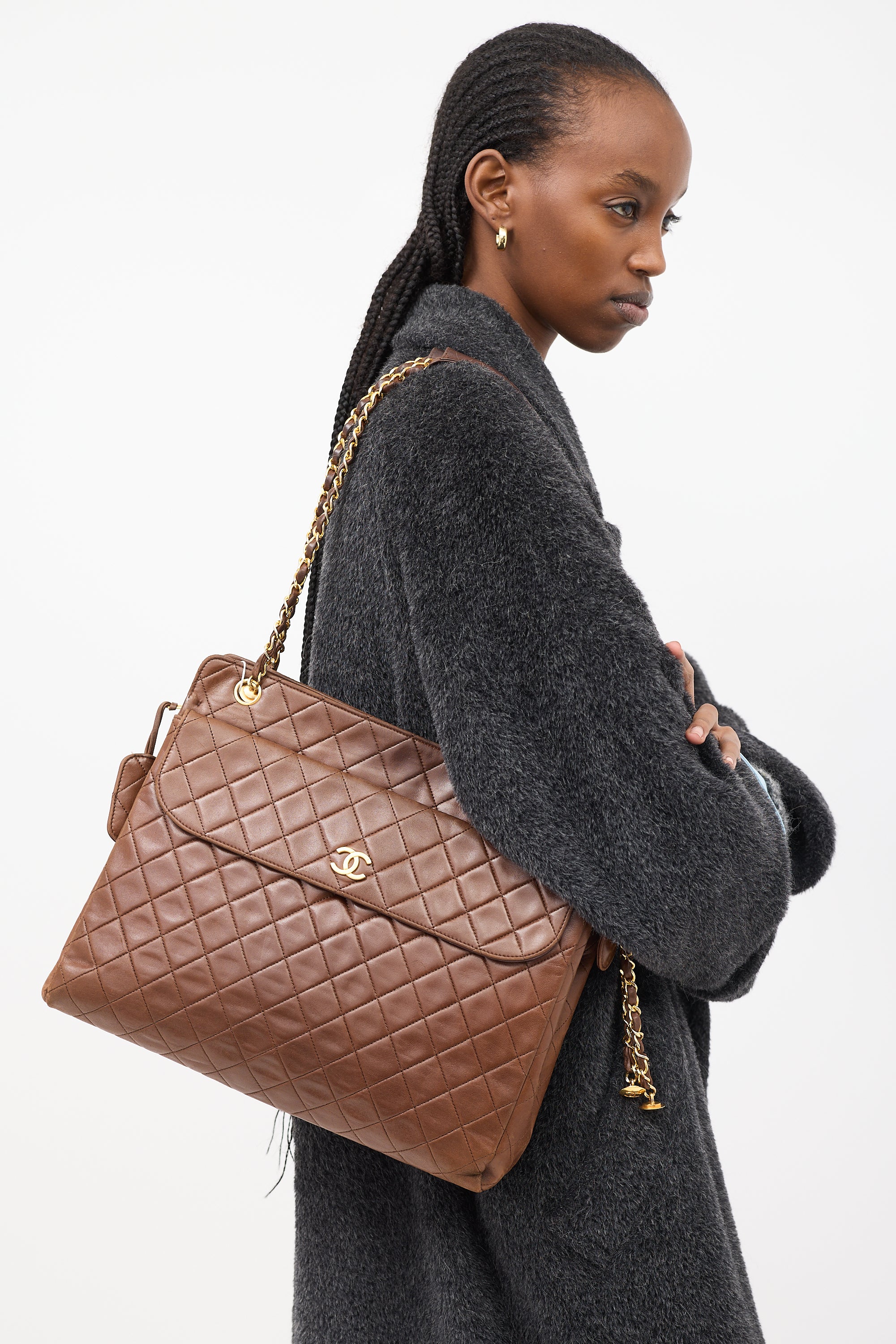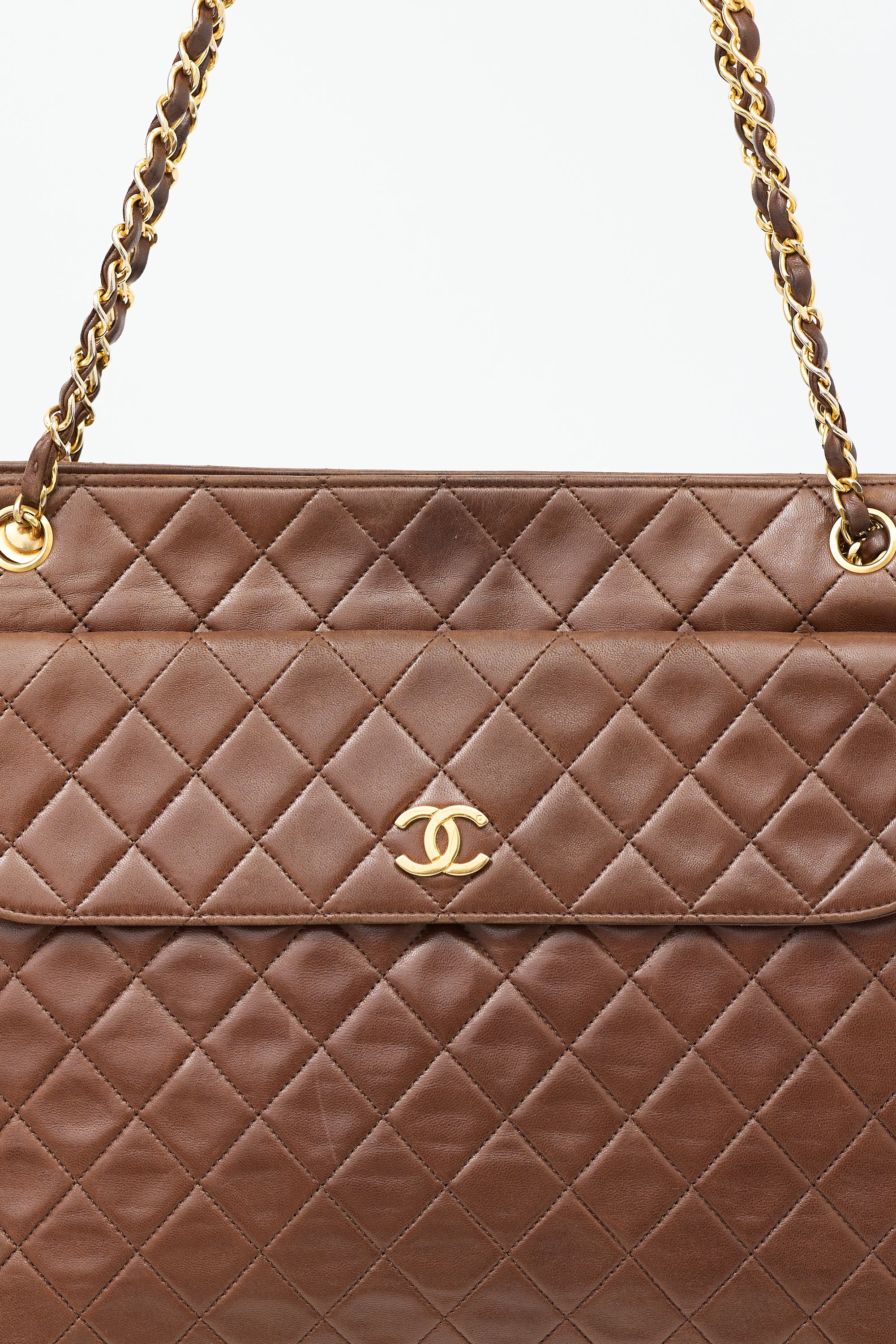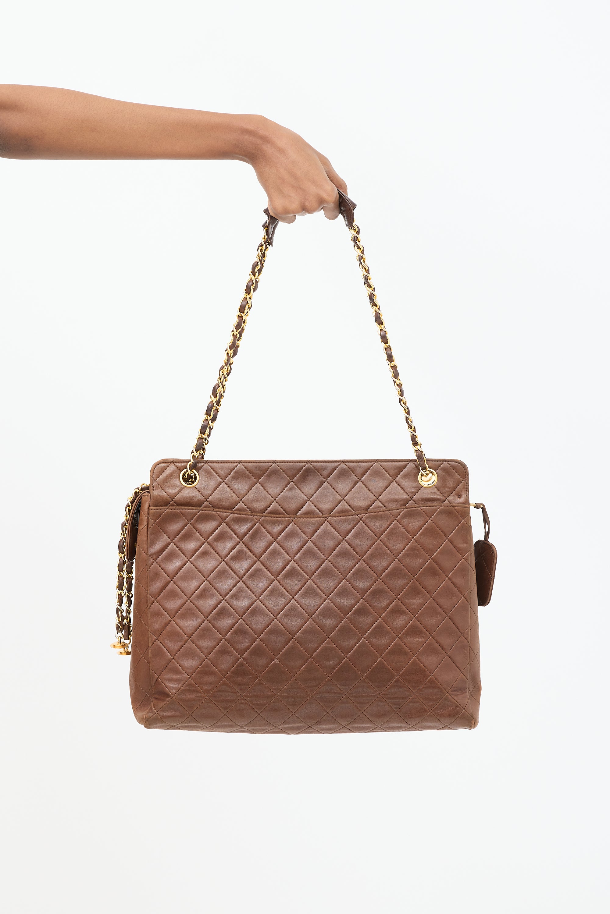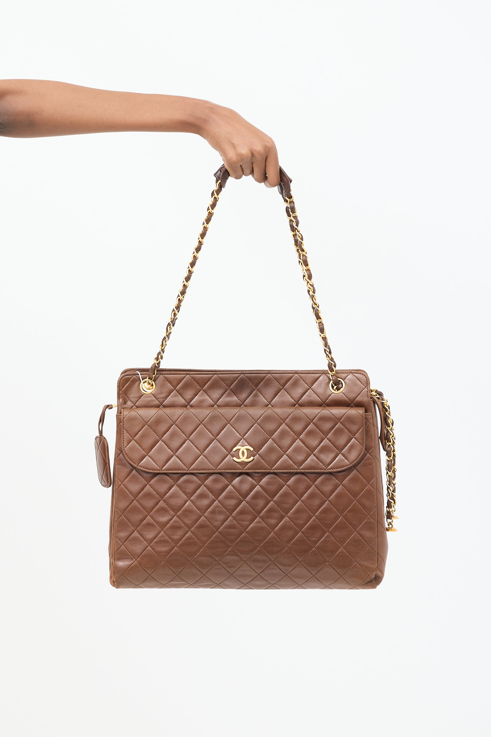 Pre-owned Chanel vintage brown shoulder bag featuring tonal quilt stitching throughout body, gold tone hardware, one slip pocket and one magnetic flap pocket with interlocking CC hardware at front, one slip pocket at back, dual braided leather and chain shoulder straps with handles, top zip closure with side snap button fastening and tag charm at zipper pull, and one lined main compartment with one zip pocket and two slip pockets.