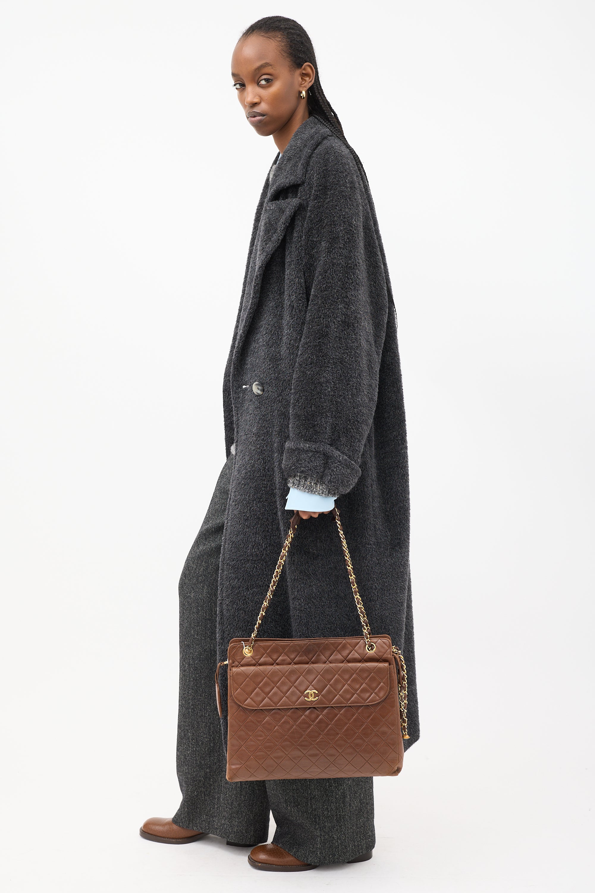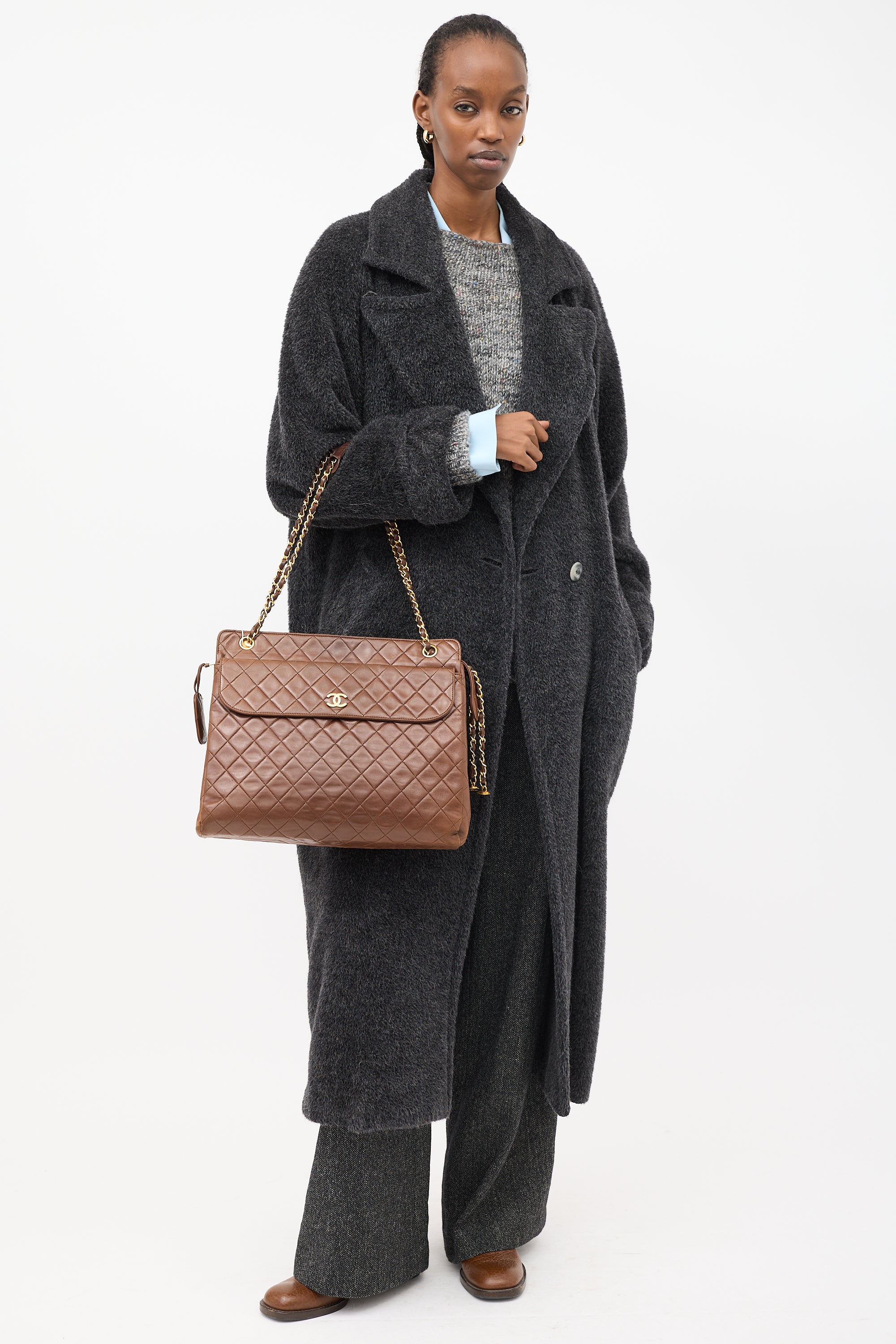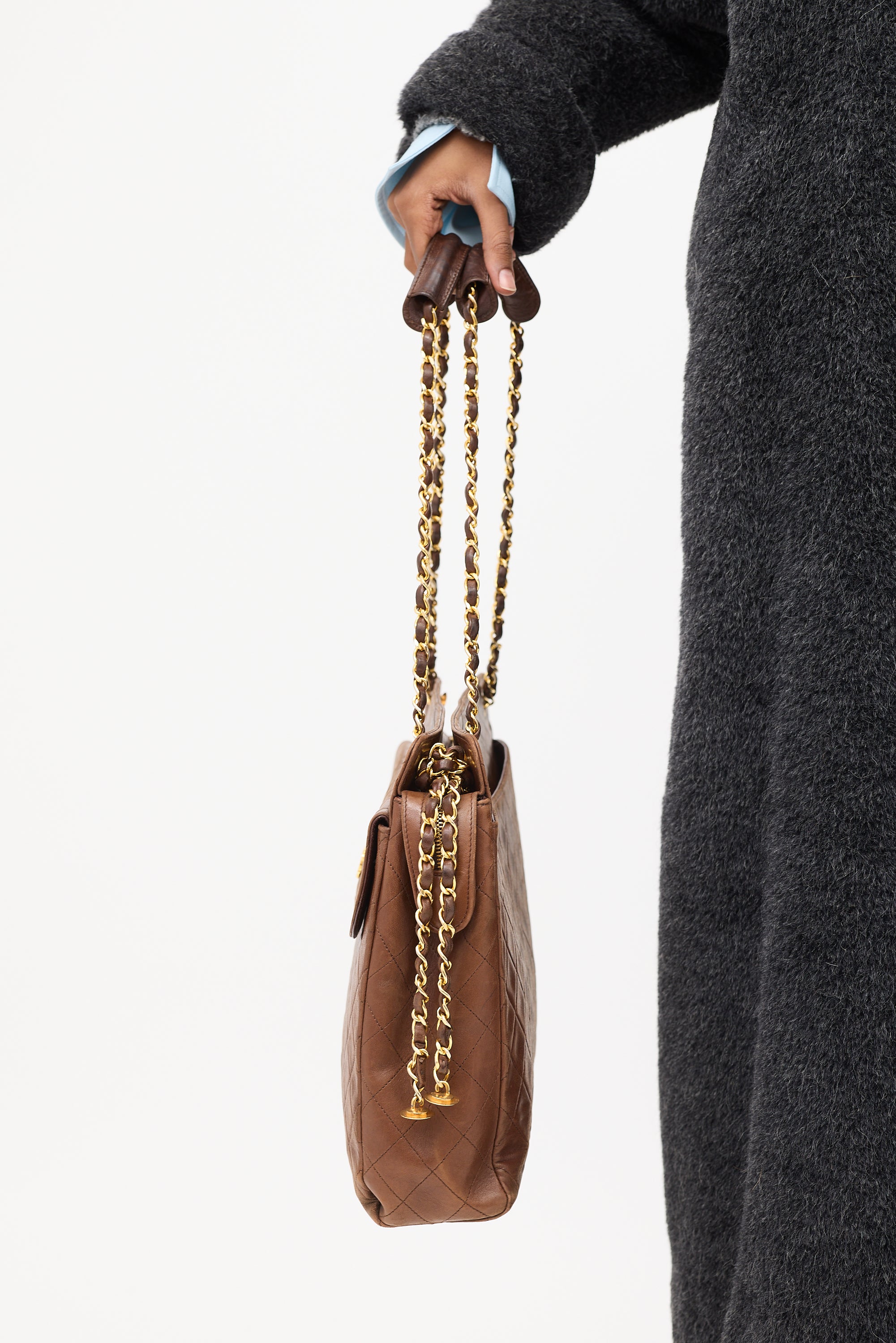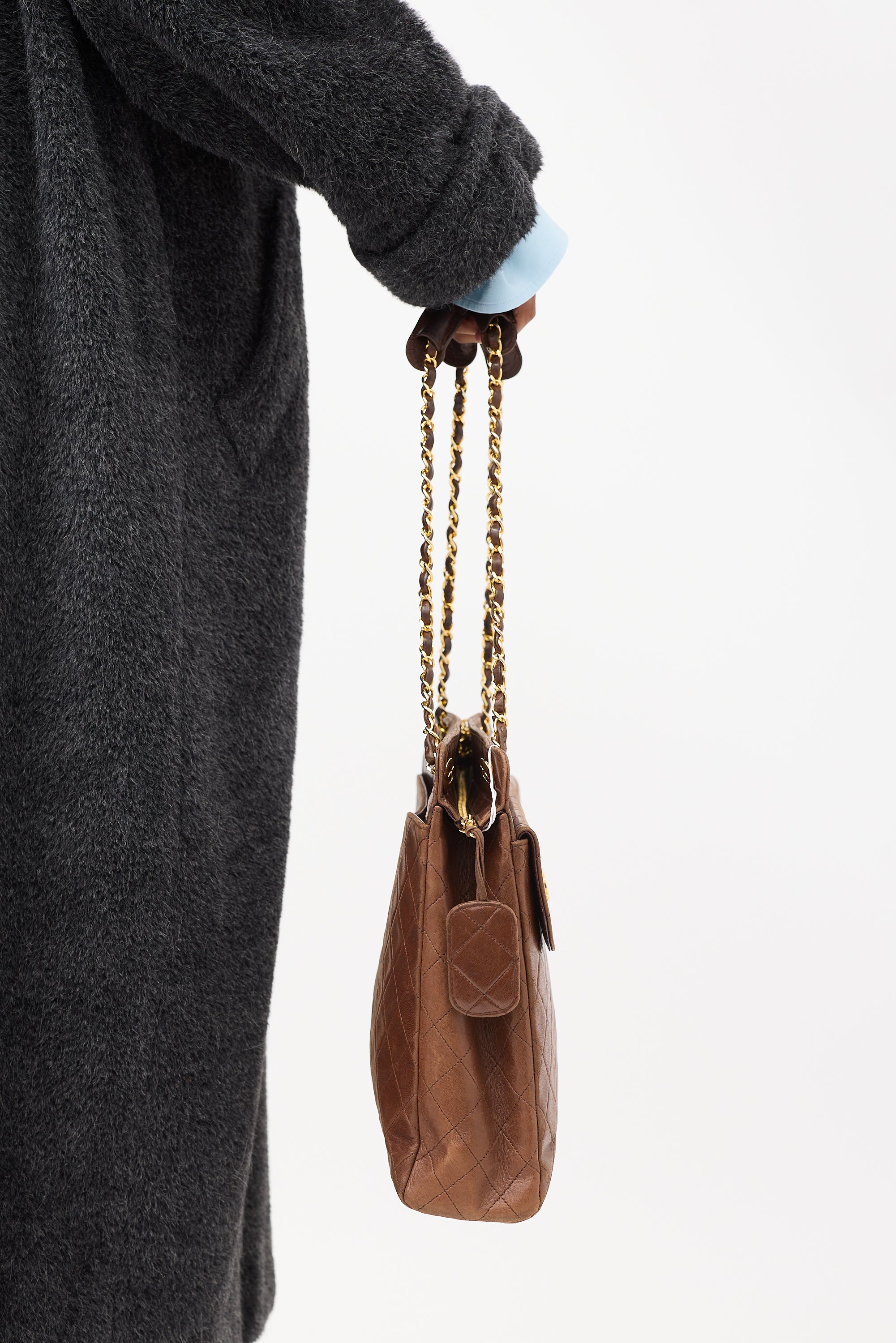 Pre-owned Chanel vintage brown shoulder bag featuring tonal quilt stitching throughout body, gold tone hardware, one slip pocket and one magnetic flap pocket with interlocking CC hardware at front, one slip pocket at back, dual braided leather and chain shoulder straps with handles, top zip closure with side snap button fastening and tag charm at zipper pull, and one lined main compartment with one zip pocket and two slip pockets.