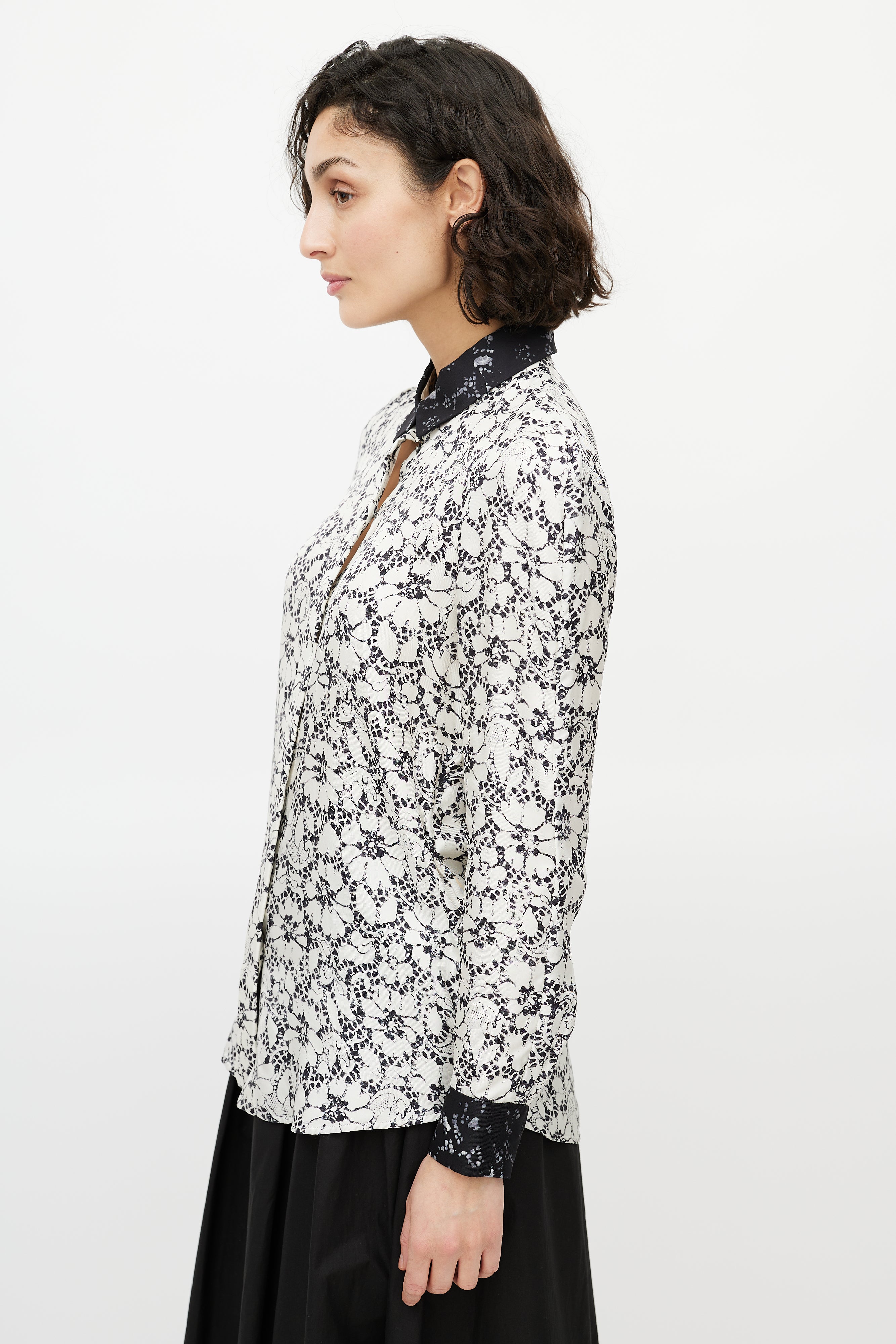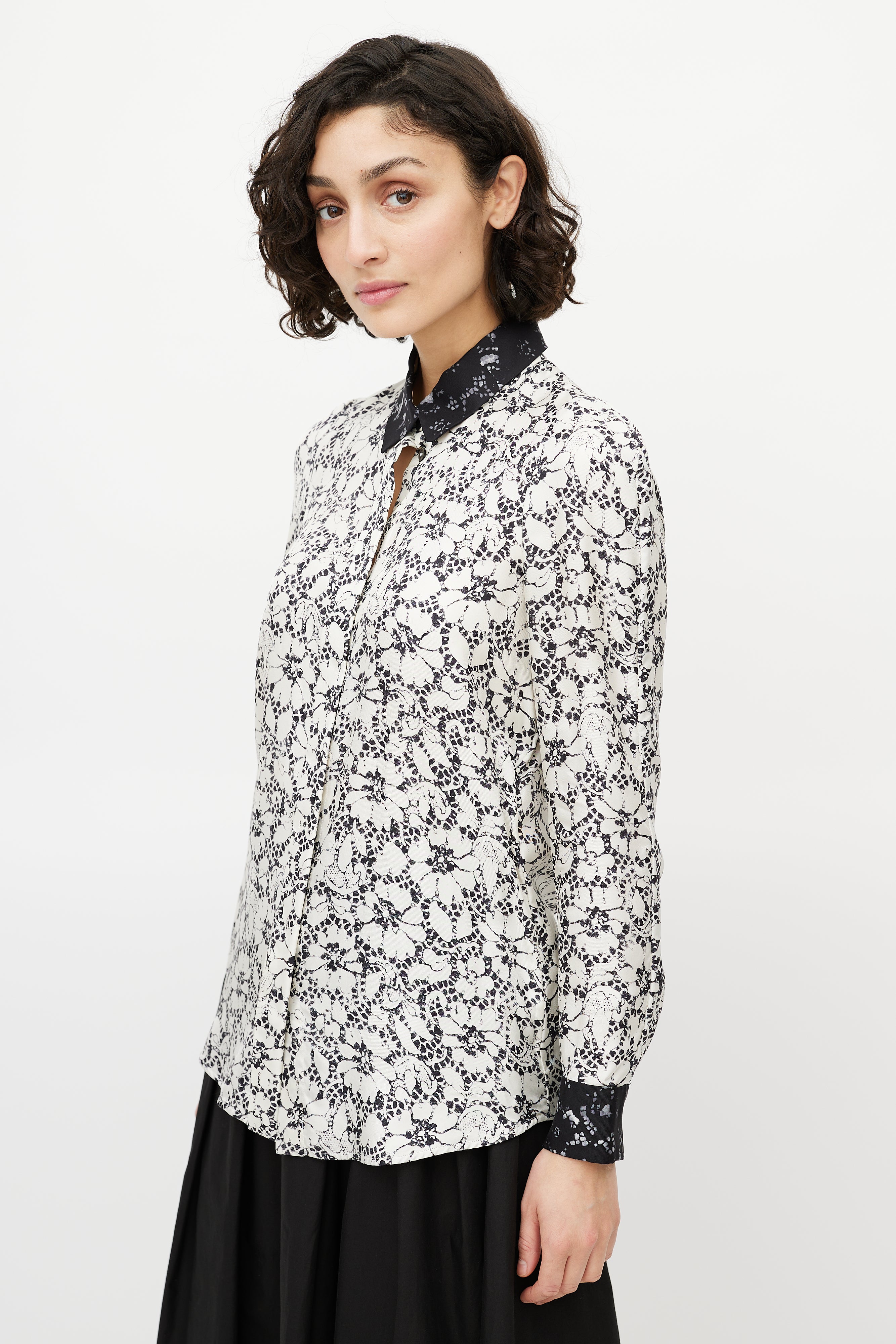 Pre-owned Louis Vuitton black and white shirt featuring floral print, black pointed collar, concealed button up front, and buttoned cuffs.