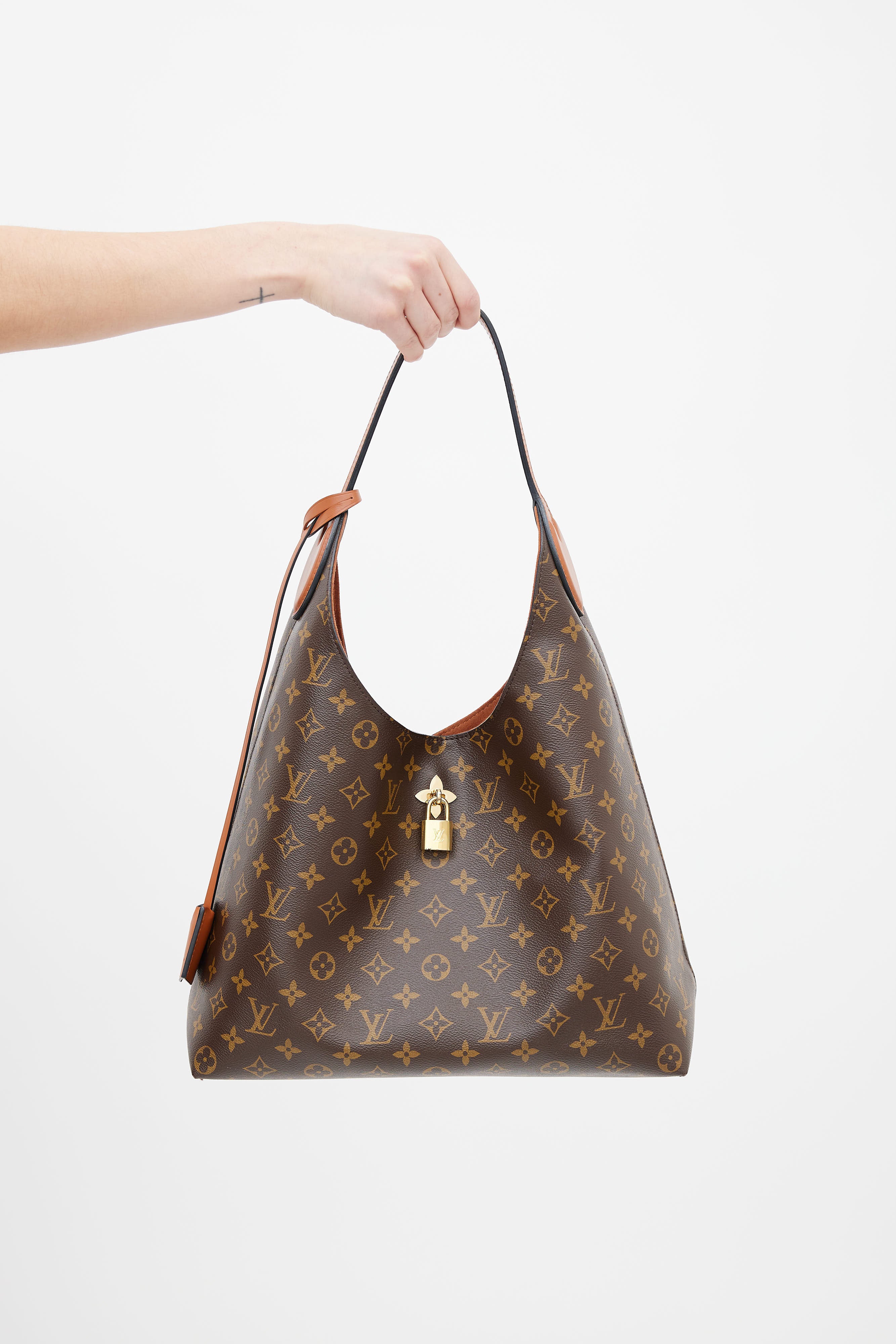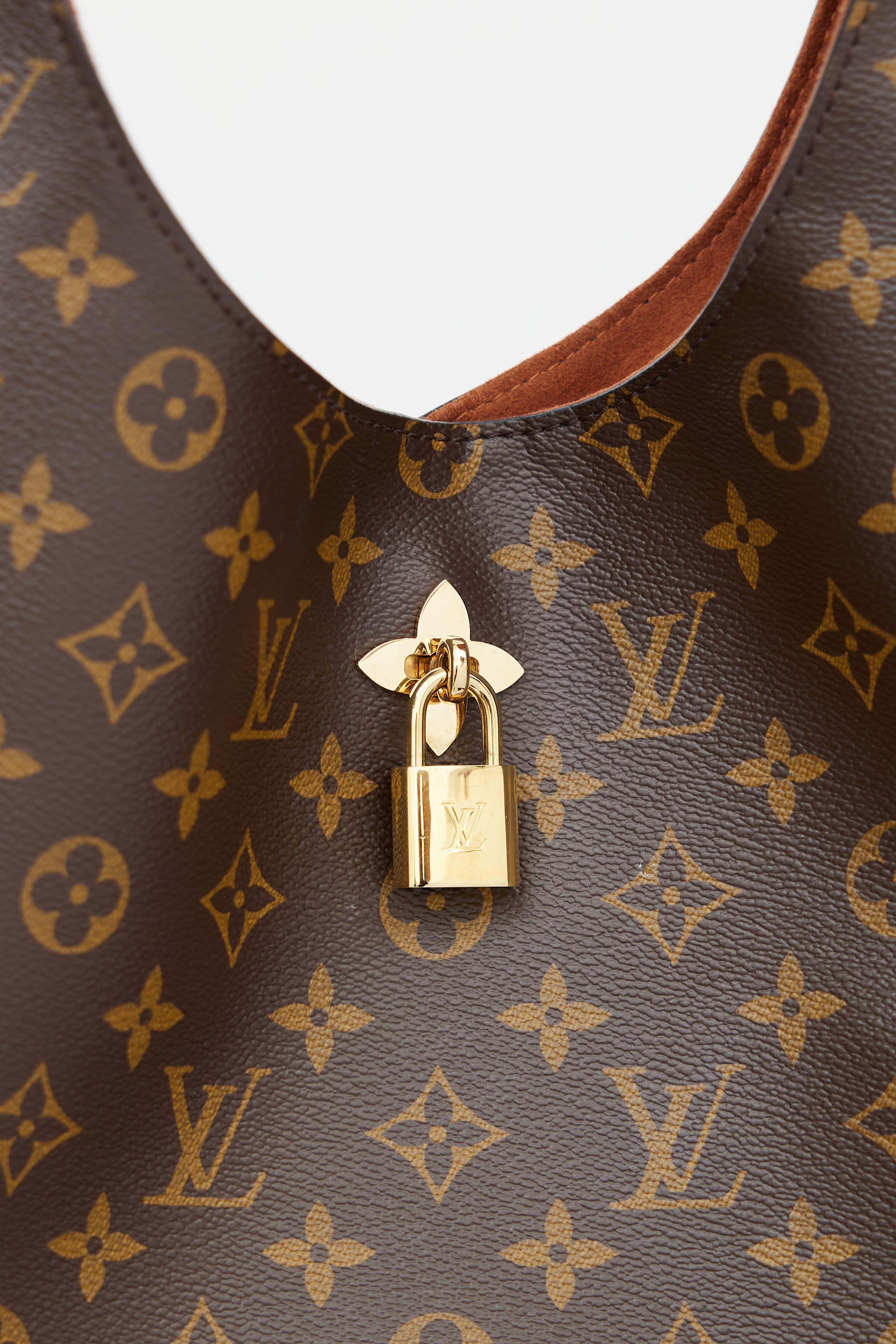 Pre-owned Louis Vuitton Flower handbag in brown featuring monogram coated canvas, single shoulder strap, leather trim in light brown, magnetic fastening and gold-tone lock with engraved logo. One main interior compartment and one zip pocket with brown suede lining. Includes keys and clochette.