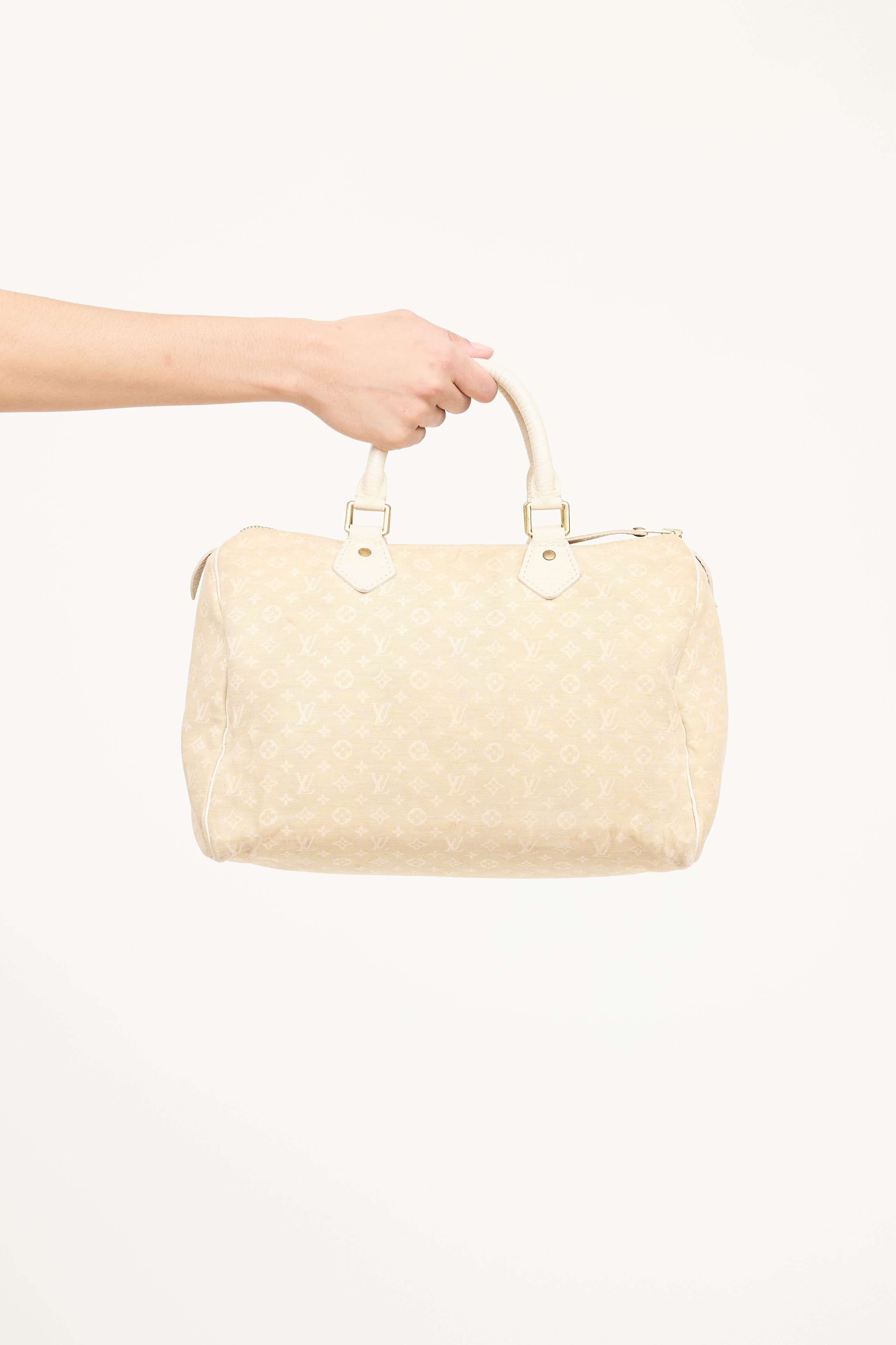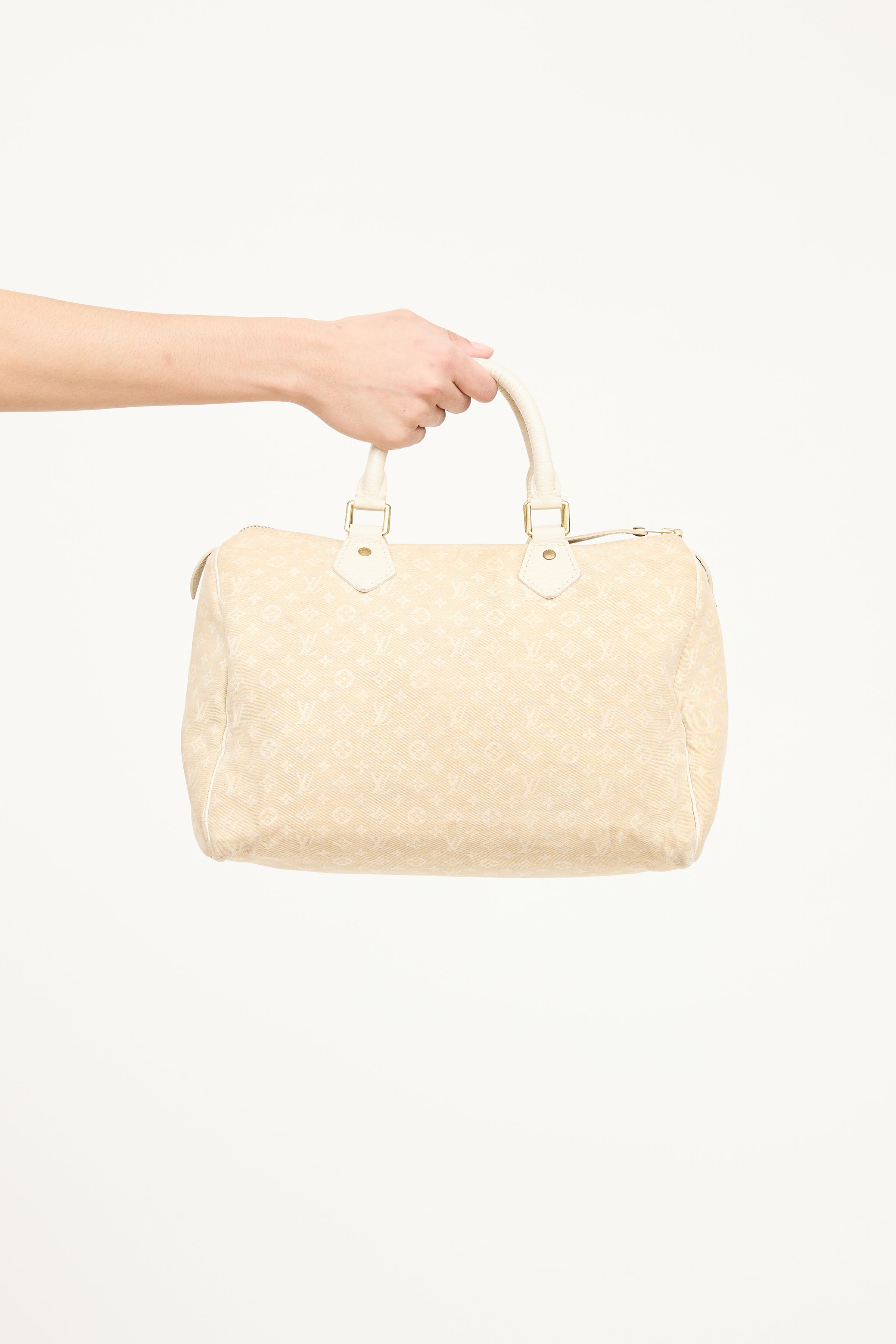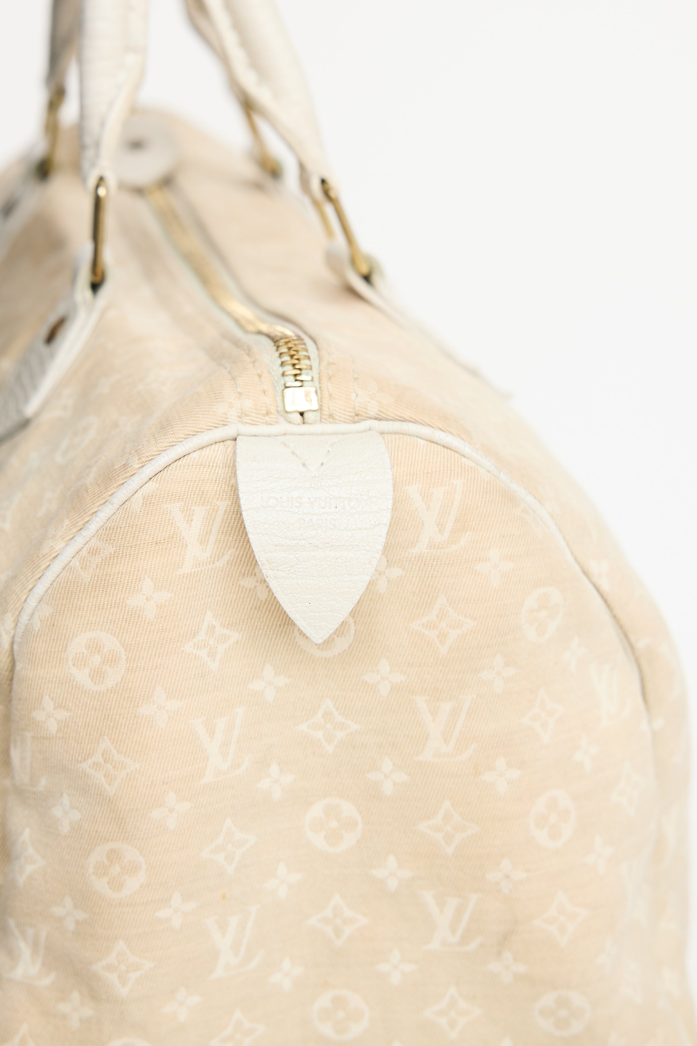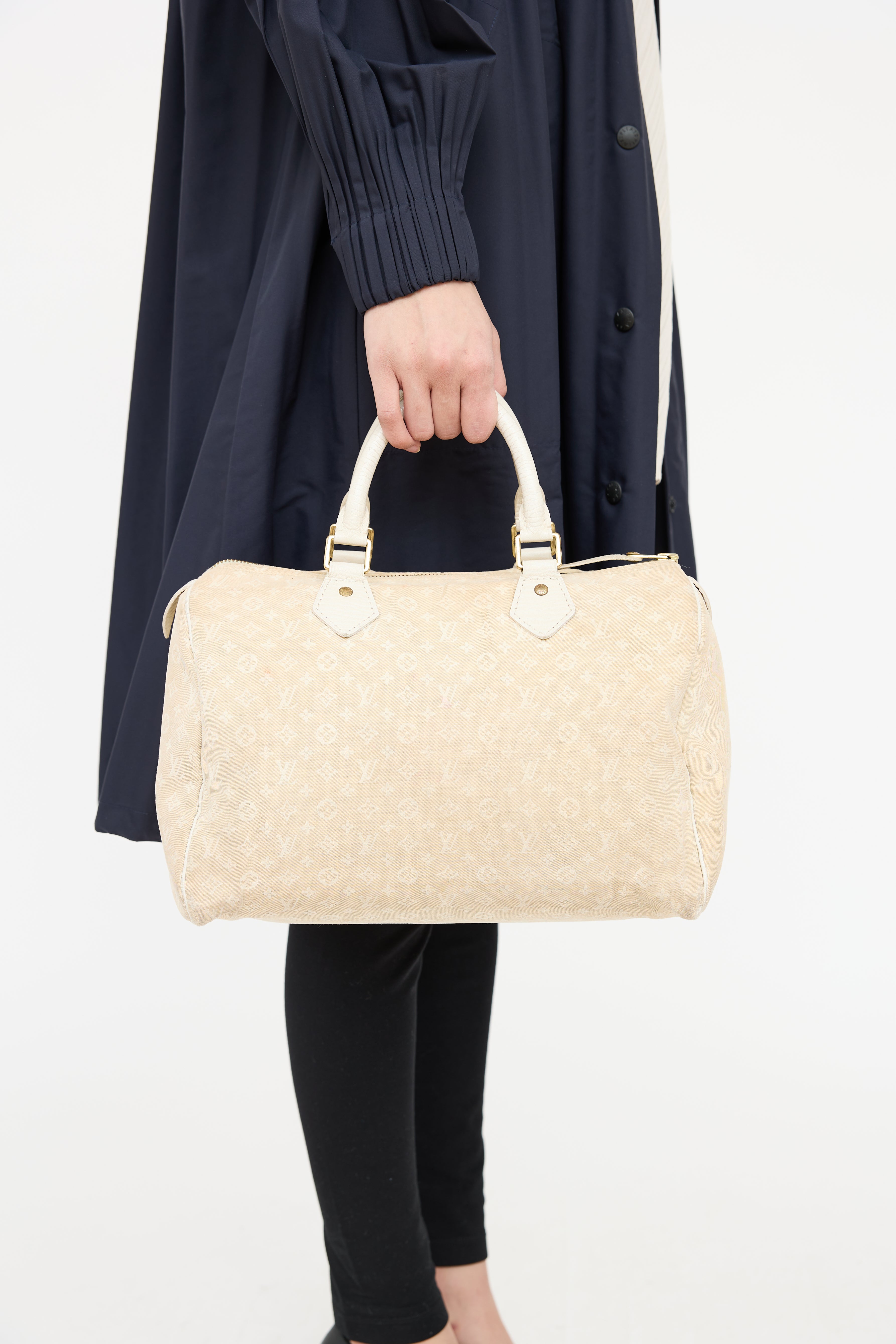 Pre-owned Louis Vuitton dune mini Lin speedy bag featuring dual rolled top handles, canvas with monogram print throughout, gold tone hardware, rolled edge trim and zip closure top with pull tab. One main compartment and one slip pocket.