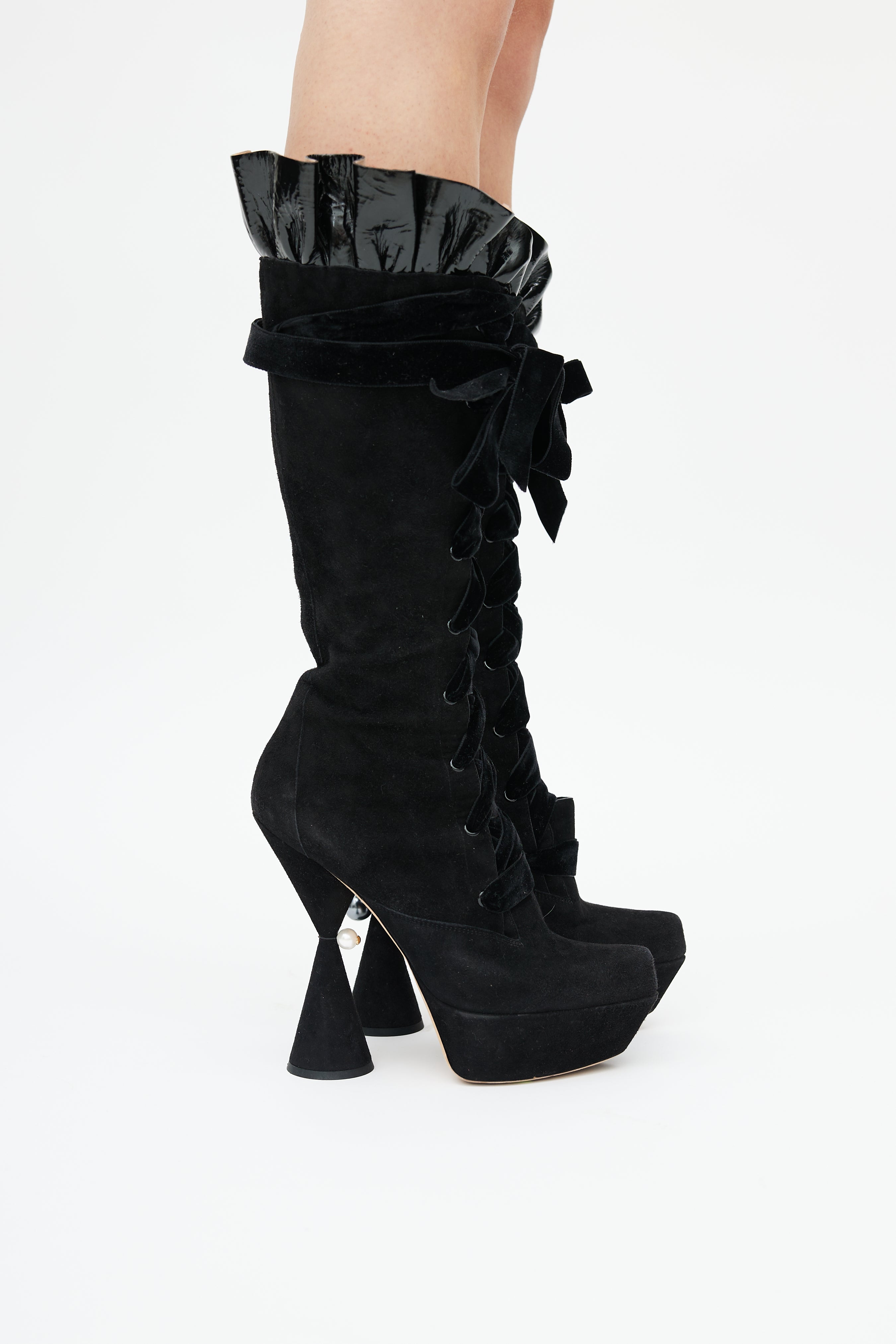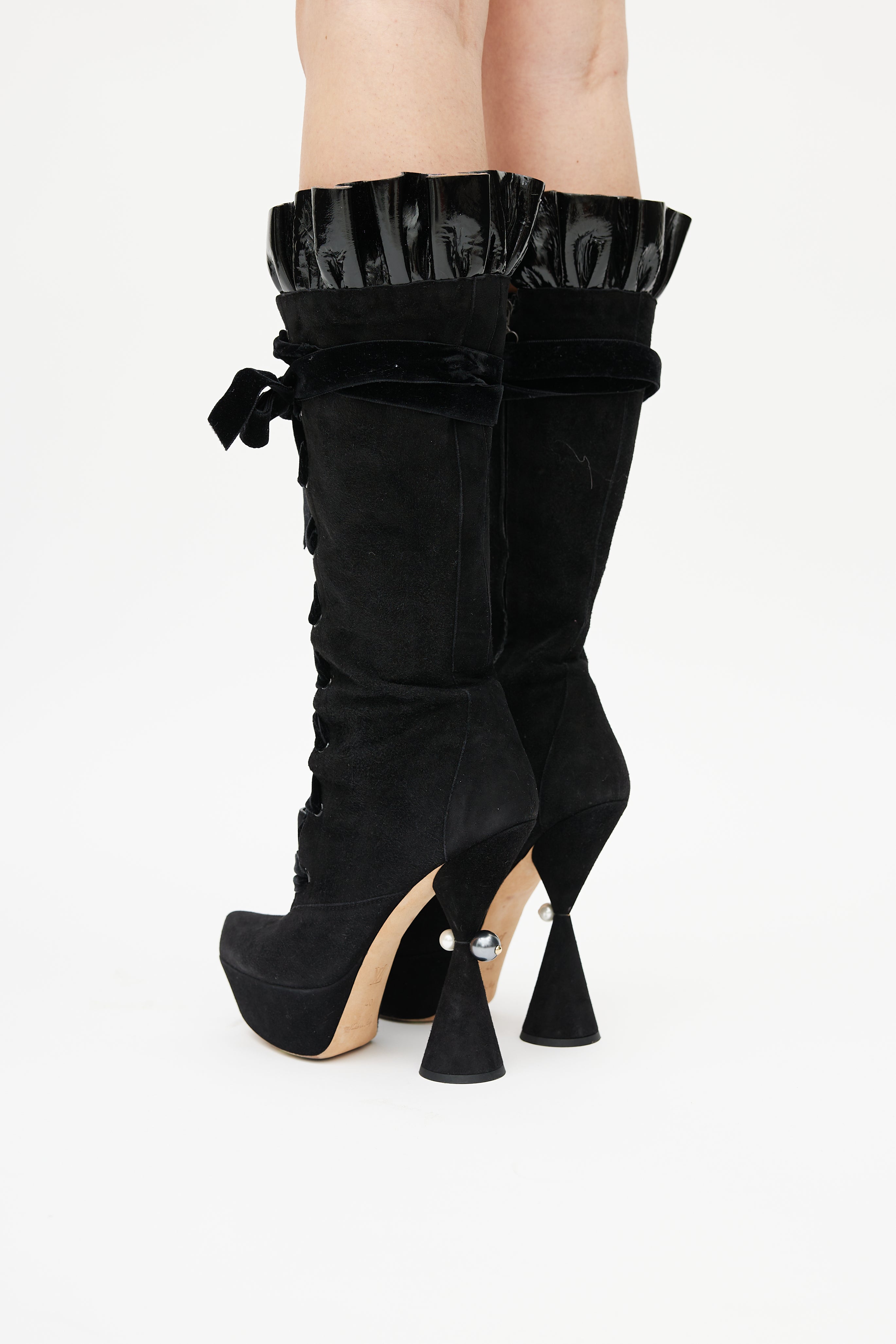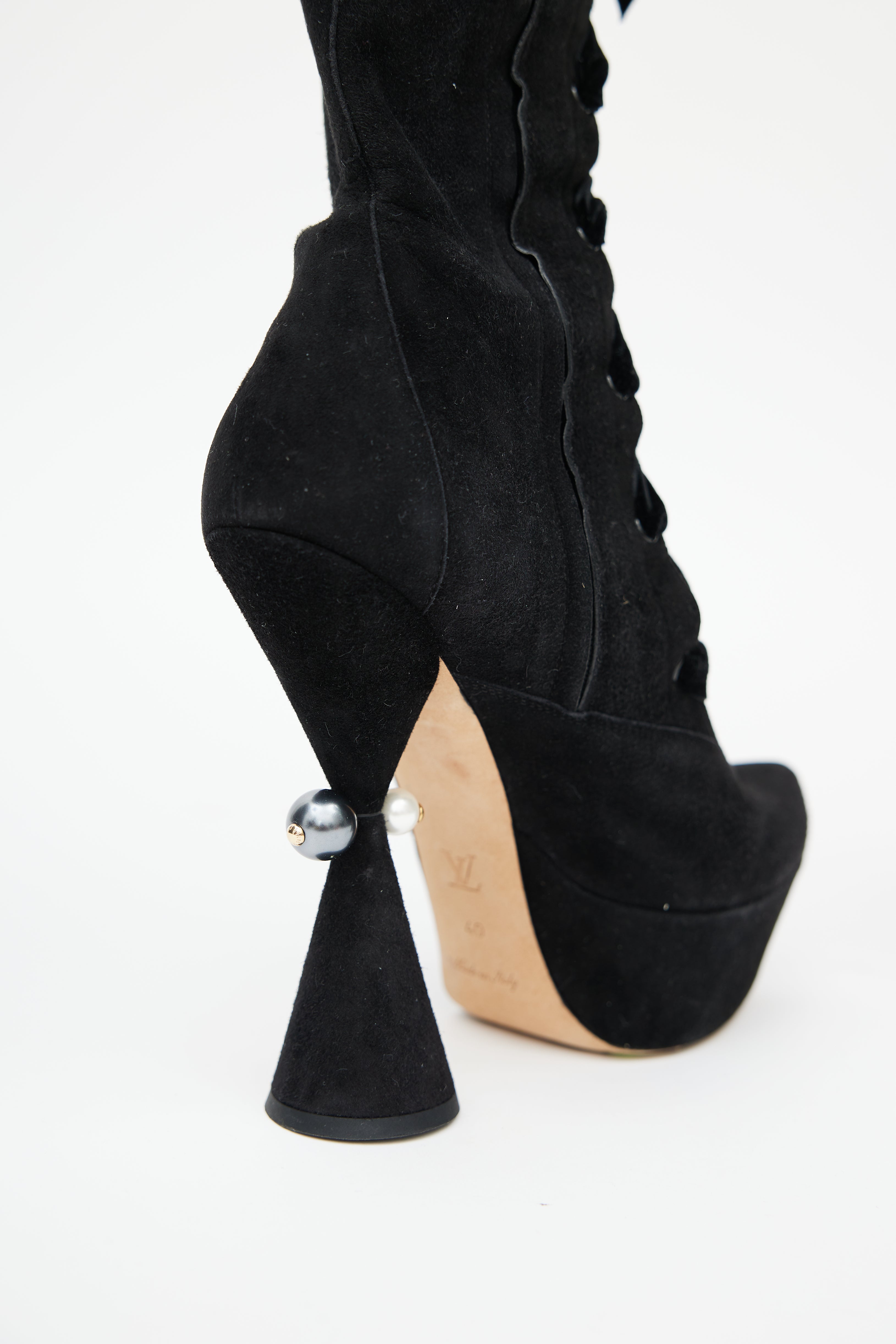 Pre-owned Fall 2009 Louis Vuitton black Cancan boots featuring pointed toe, platform toe box, suede lace up front, side zip closure, black patent leather ruffle at opening, tapered martini heel with pearl embellishment, and knee high shaft. From runway.