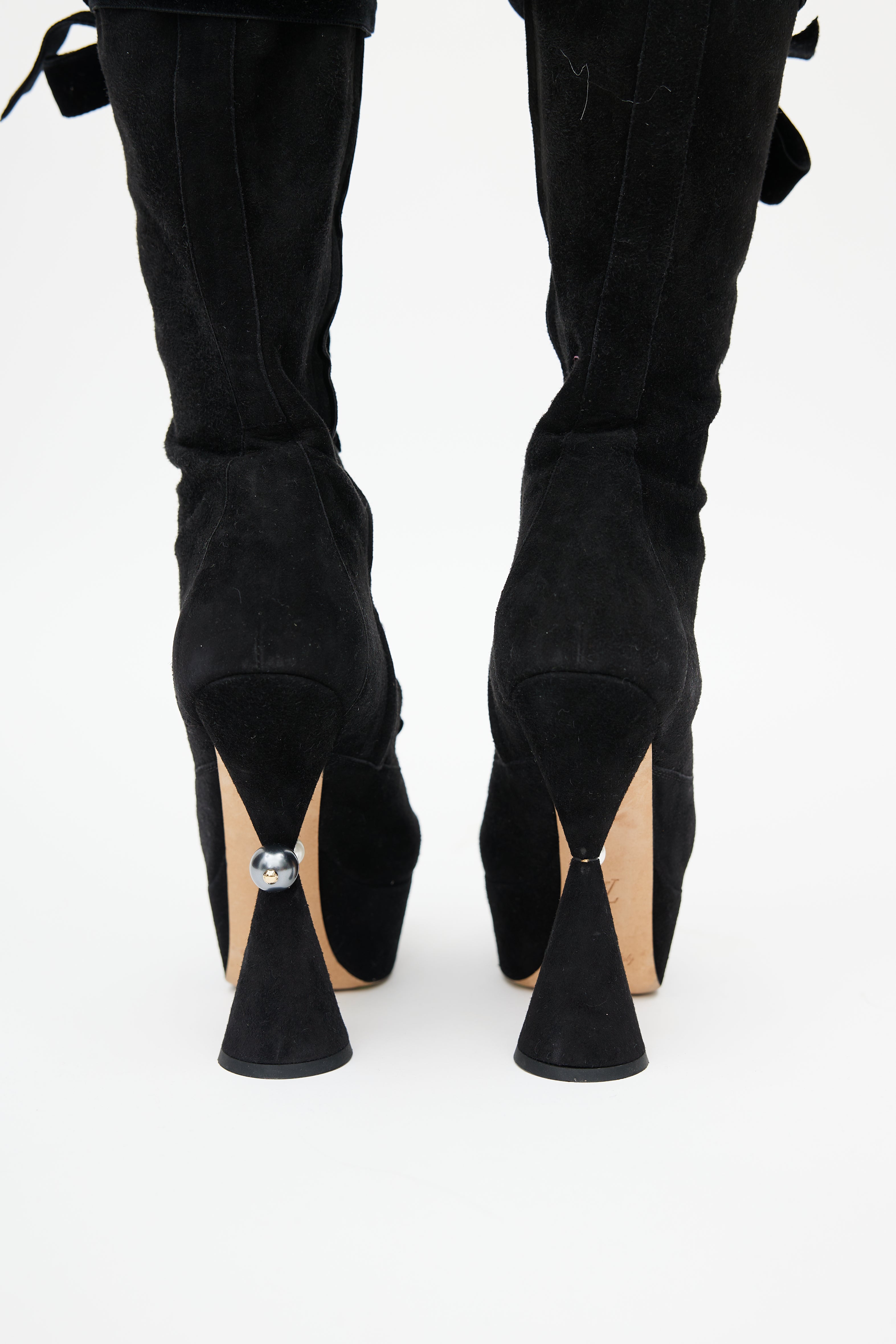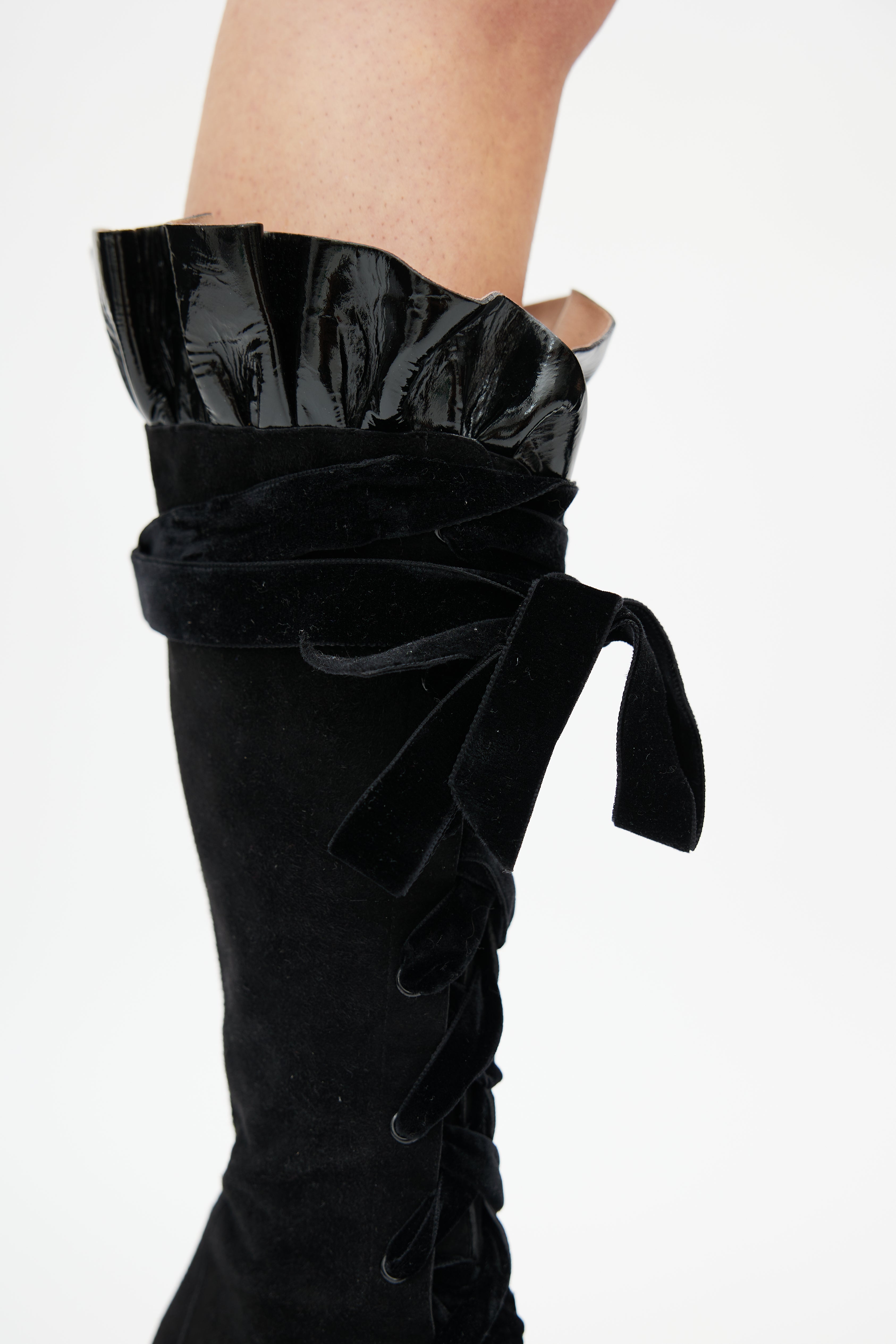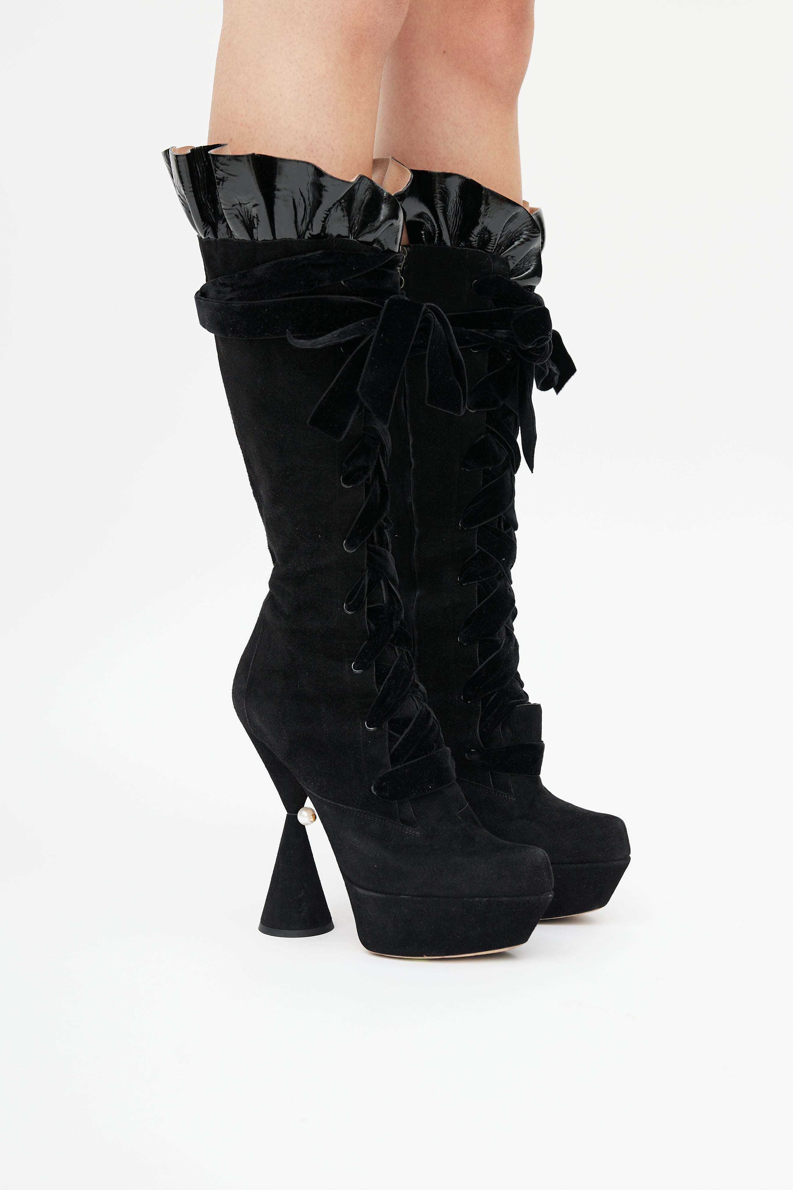 Pre-owned Fall 2009 Louis Vuitton black Cancan boots featuring pointed toe, platform toe box, suede lace up front, side zip closure, black patent leather ruffle at opening, tapered martini heel with pearl embellishment, and knee high shaft. From runway.