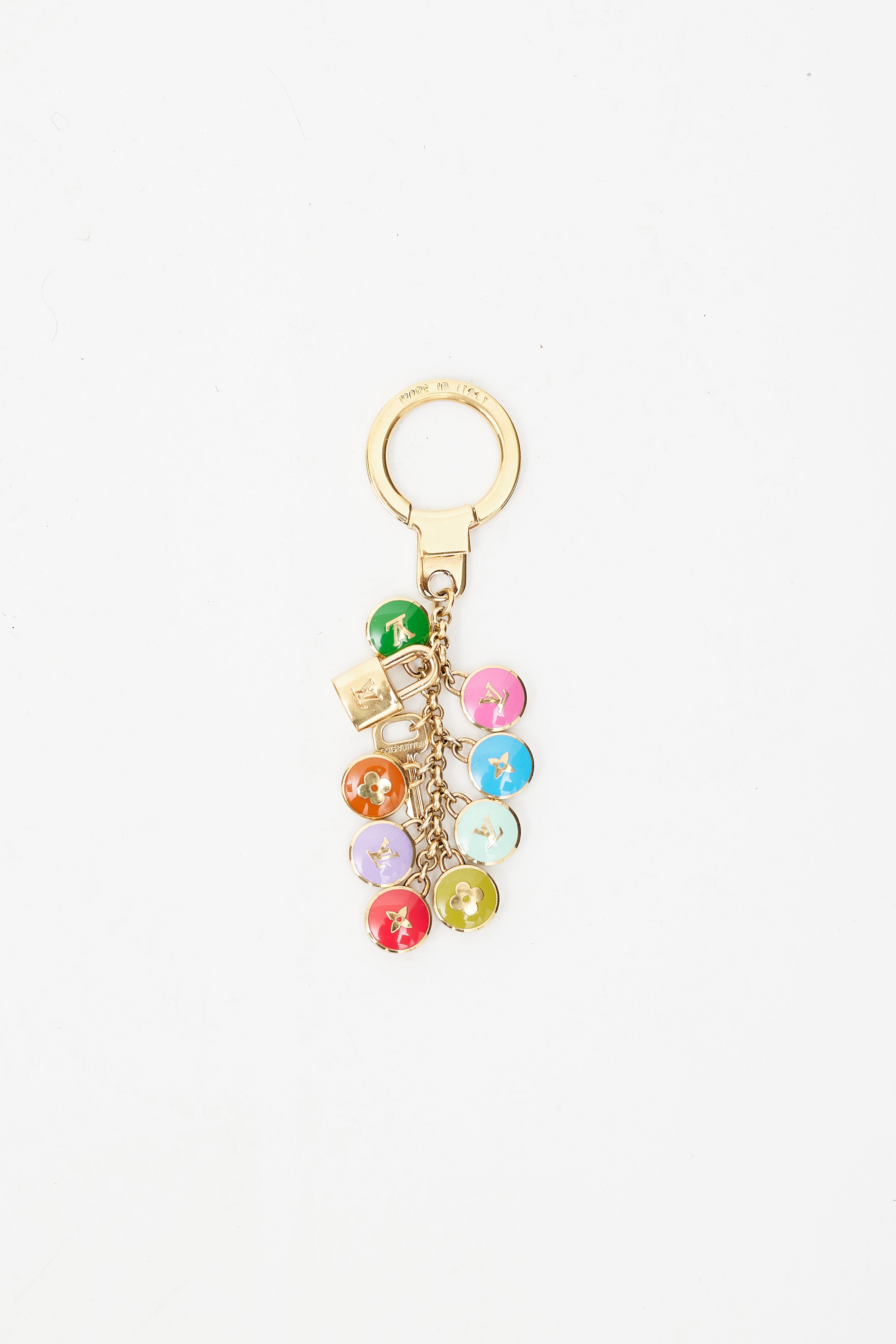 Pre-owned Louis Vuitton gold tone keychain featuring multicolour charms with LV logos throughout, gold tone lock and key charm and logo engraving at split key ring.