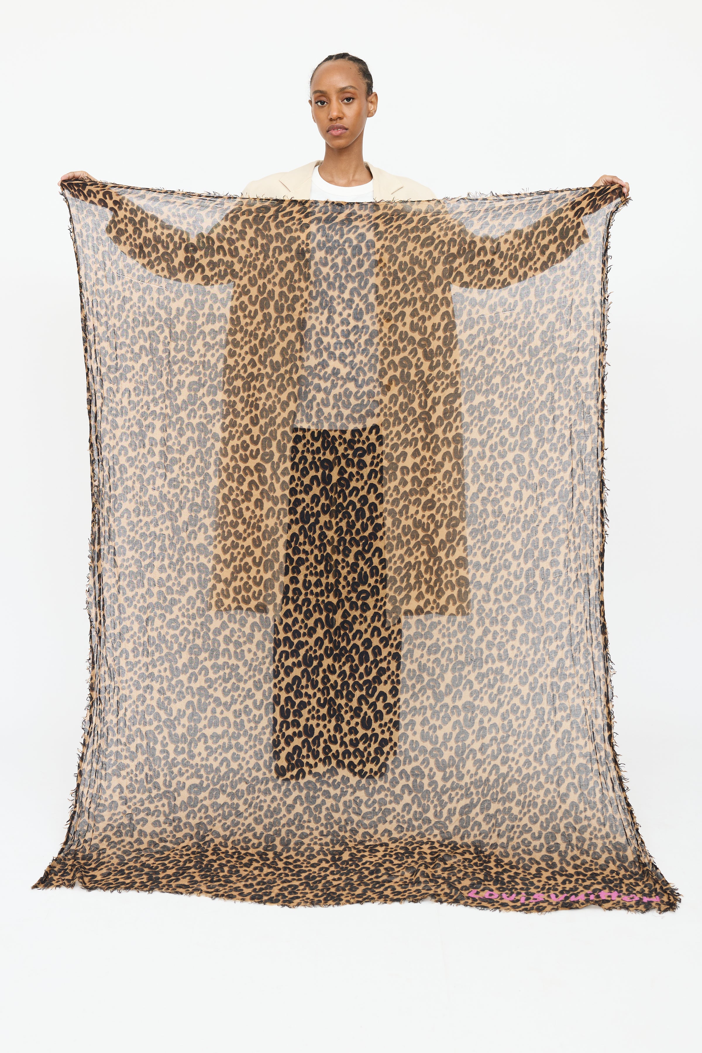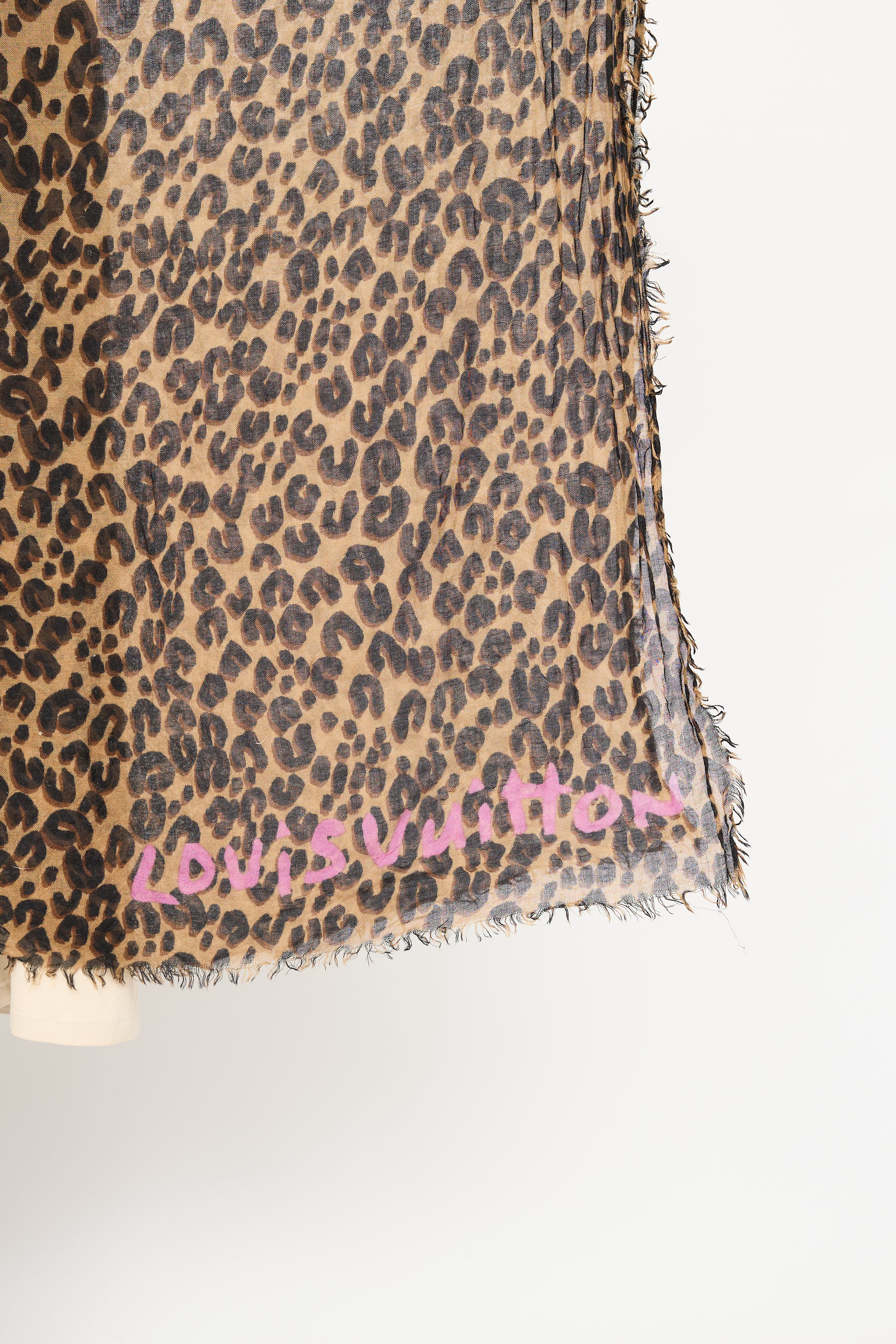 Pre-owned Louis Vuitton x Stephen Sprouse brown cashmere knit scarf featuring a black leopard pattern throughout, pink logo print at corner, and fringe hem.