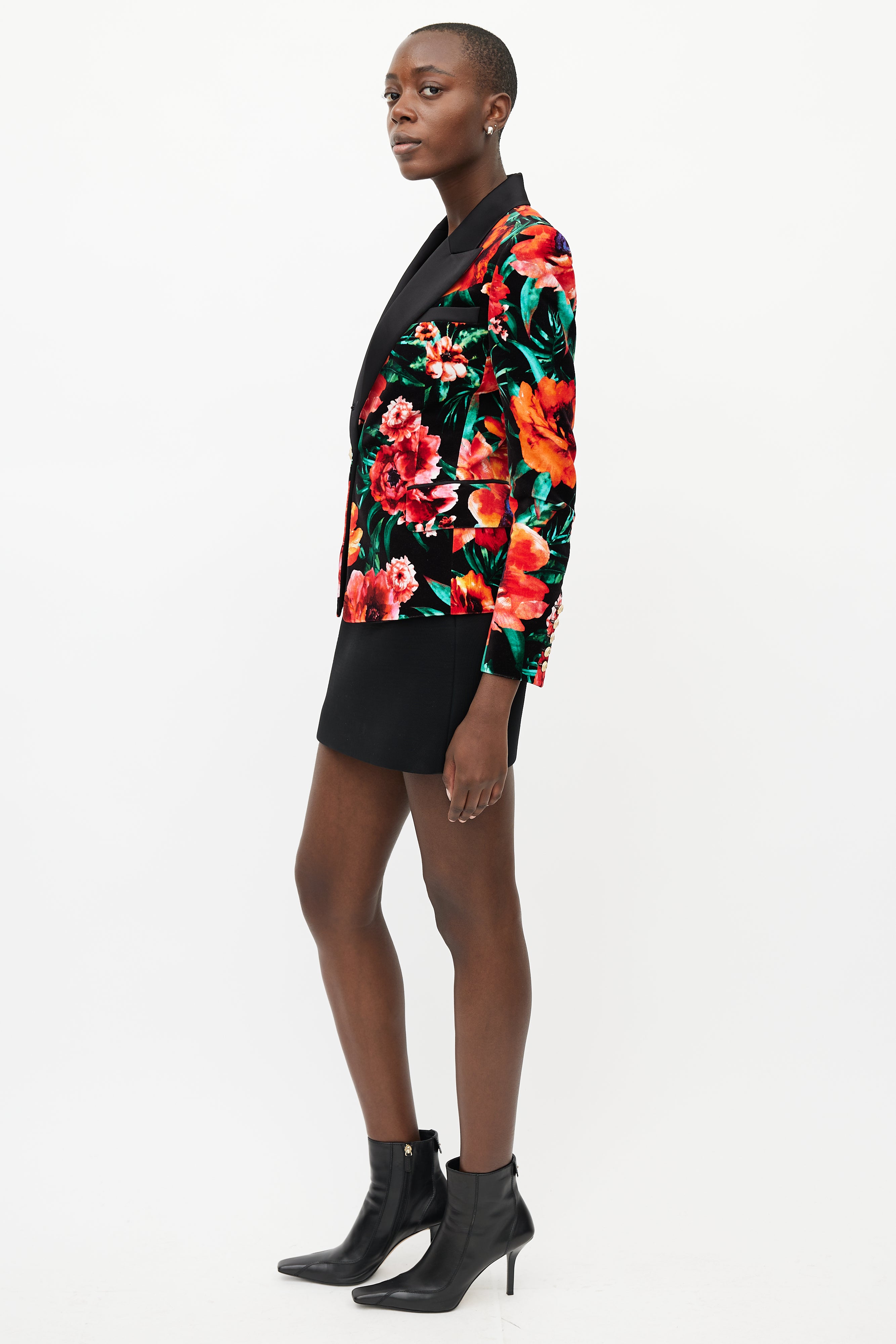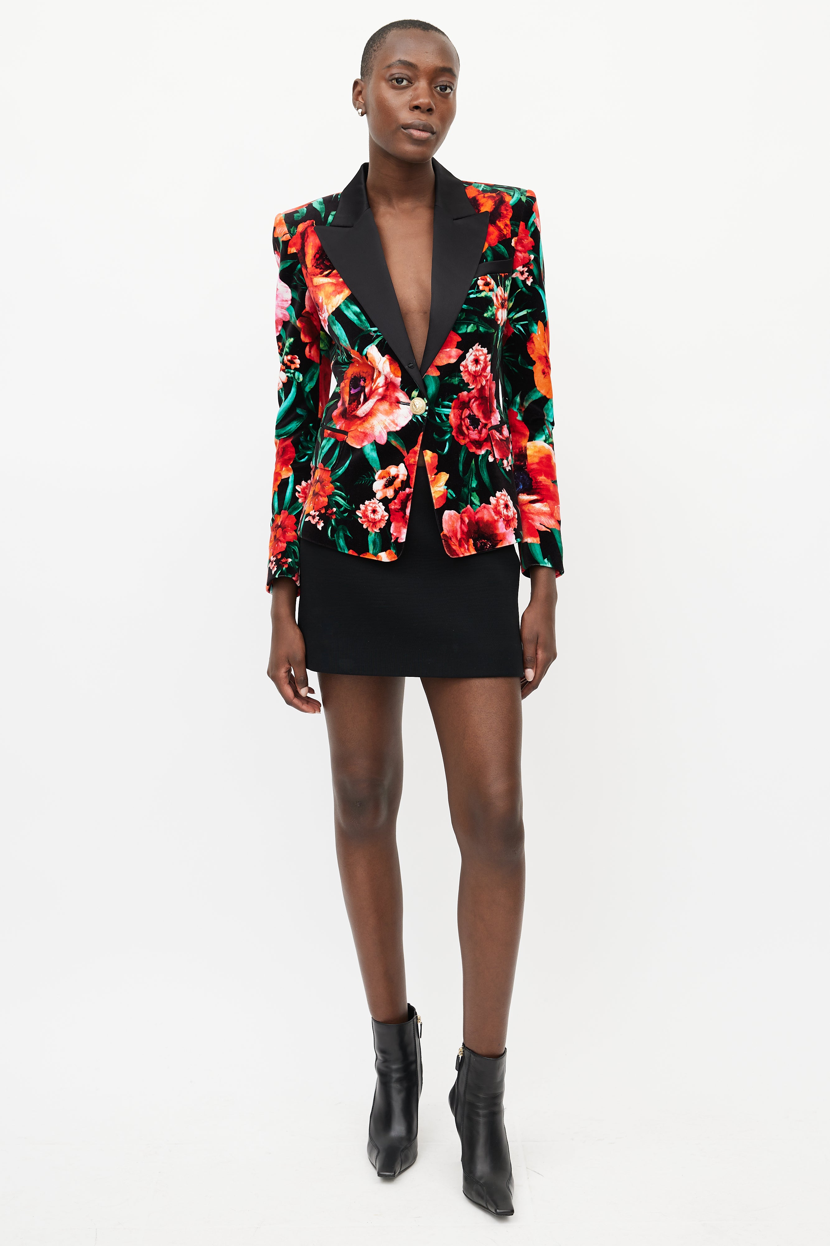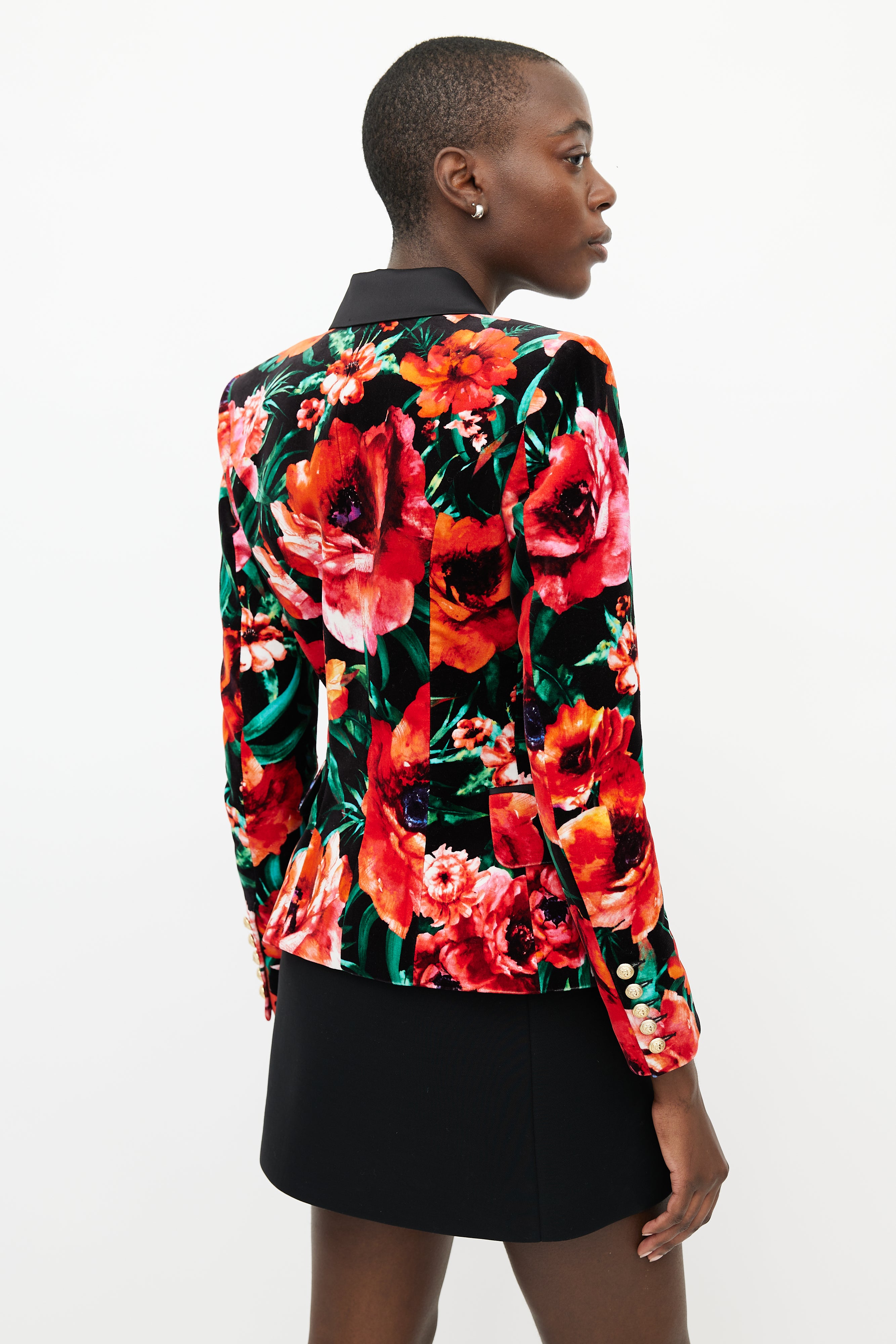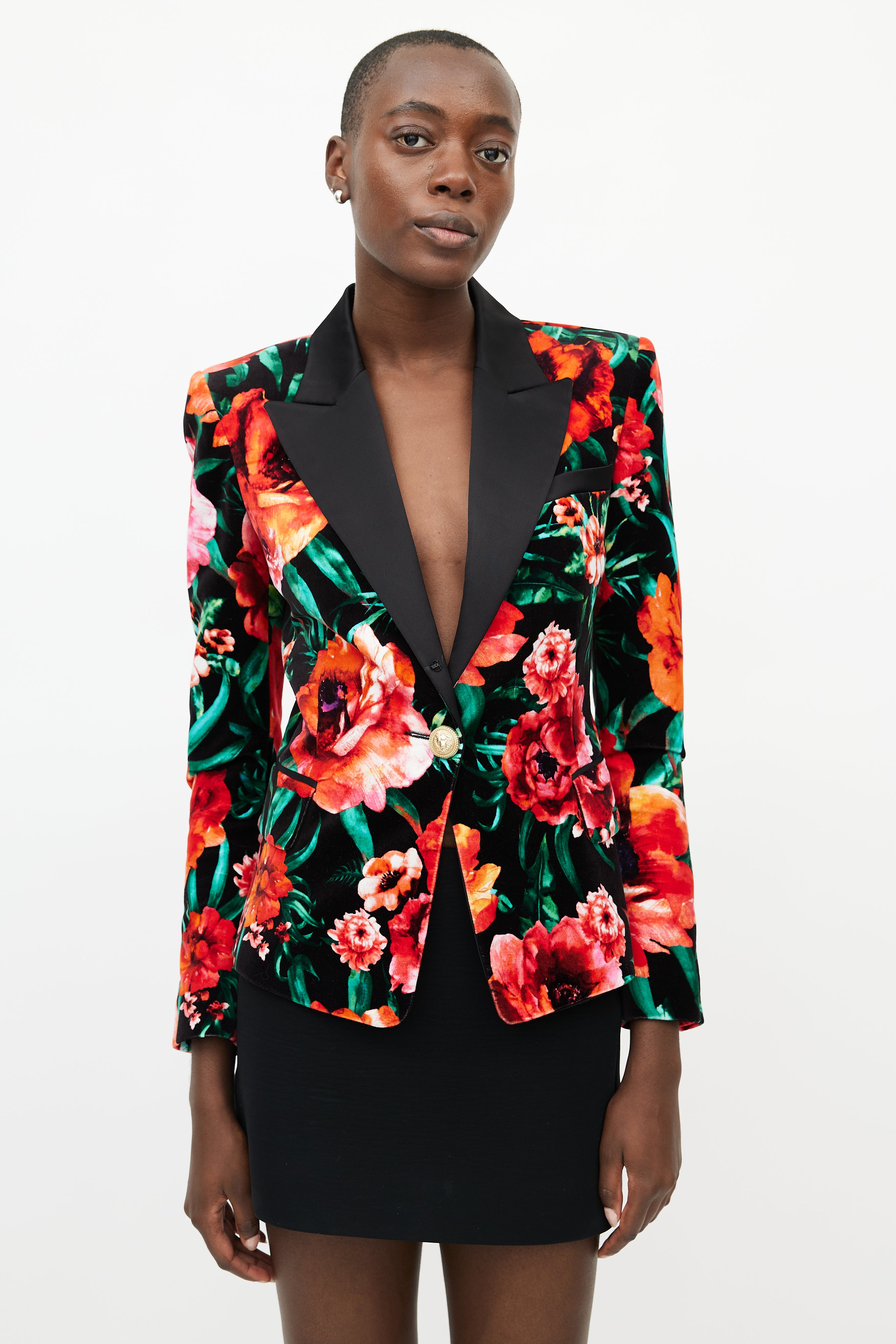 Pre-owned Balmain black velvet blazer featuring a multicolour floral pattern throughout, peak lapel, long sleeves with buttoned cuffs, one welt pocket at chest, two flap pockets at hip, and gold tone button up front. Lined.