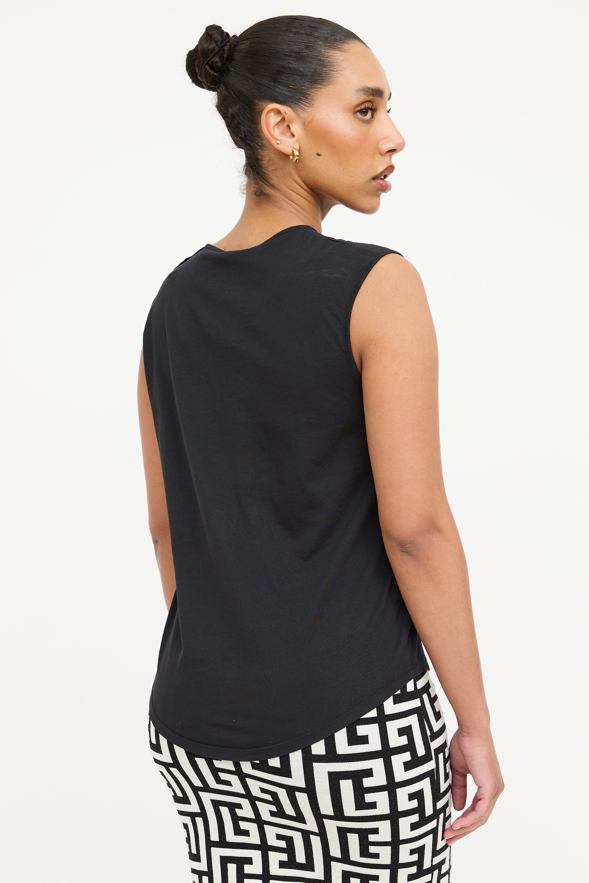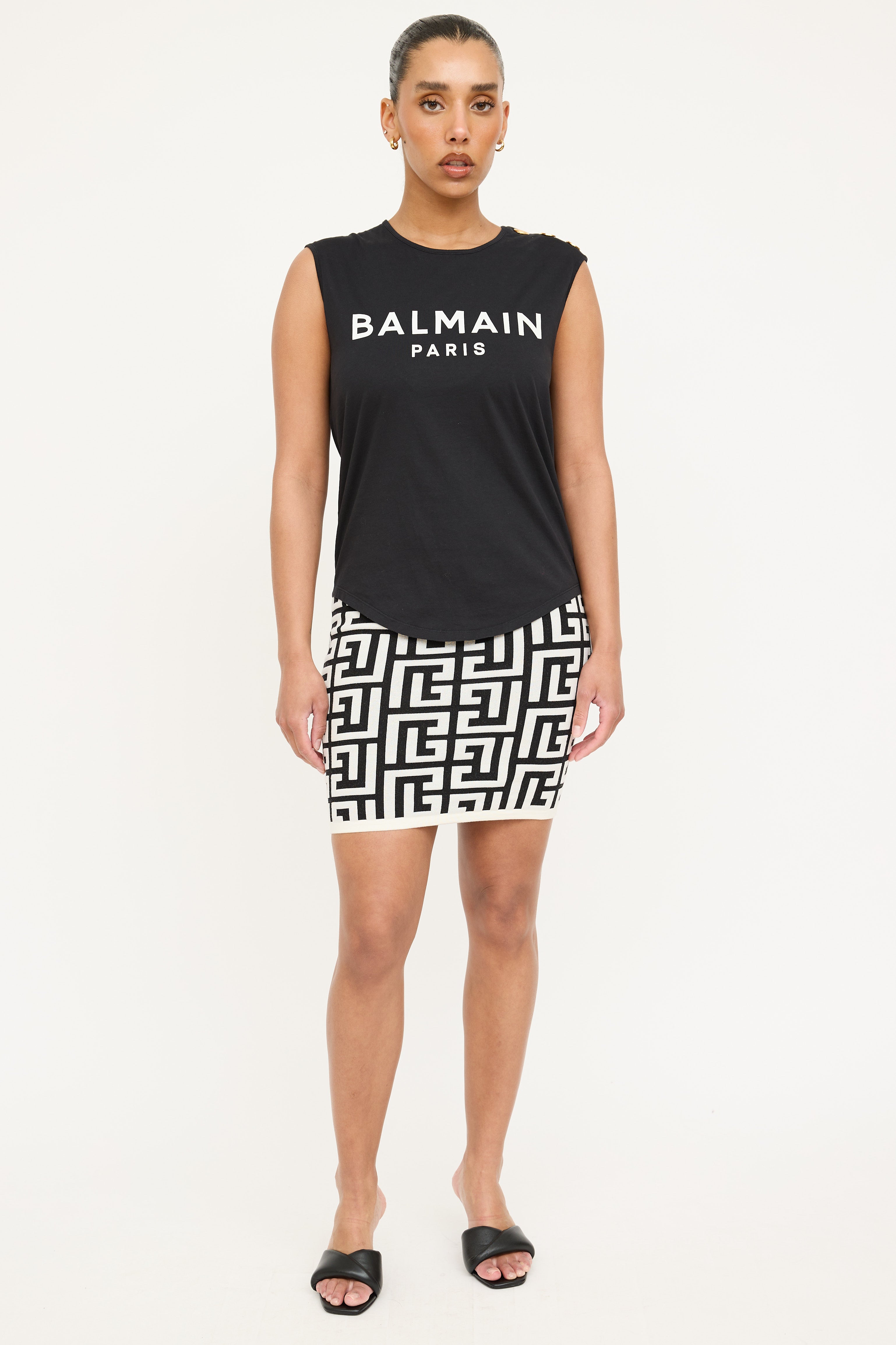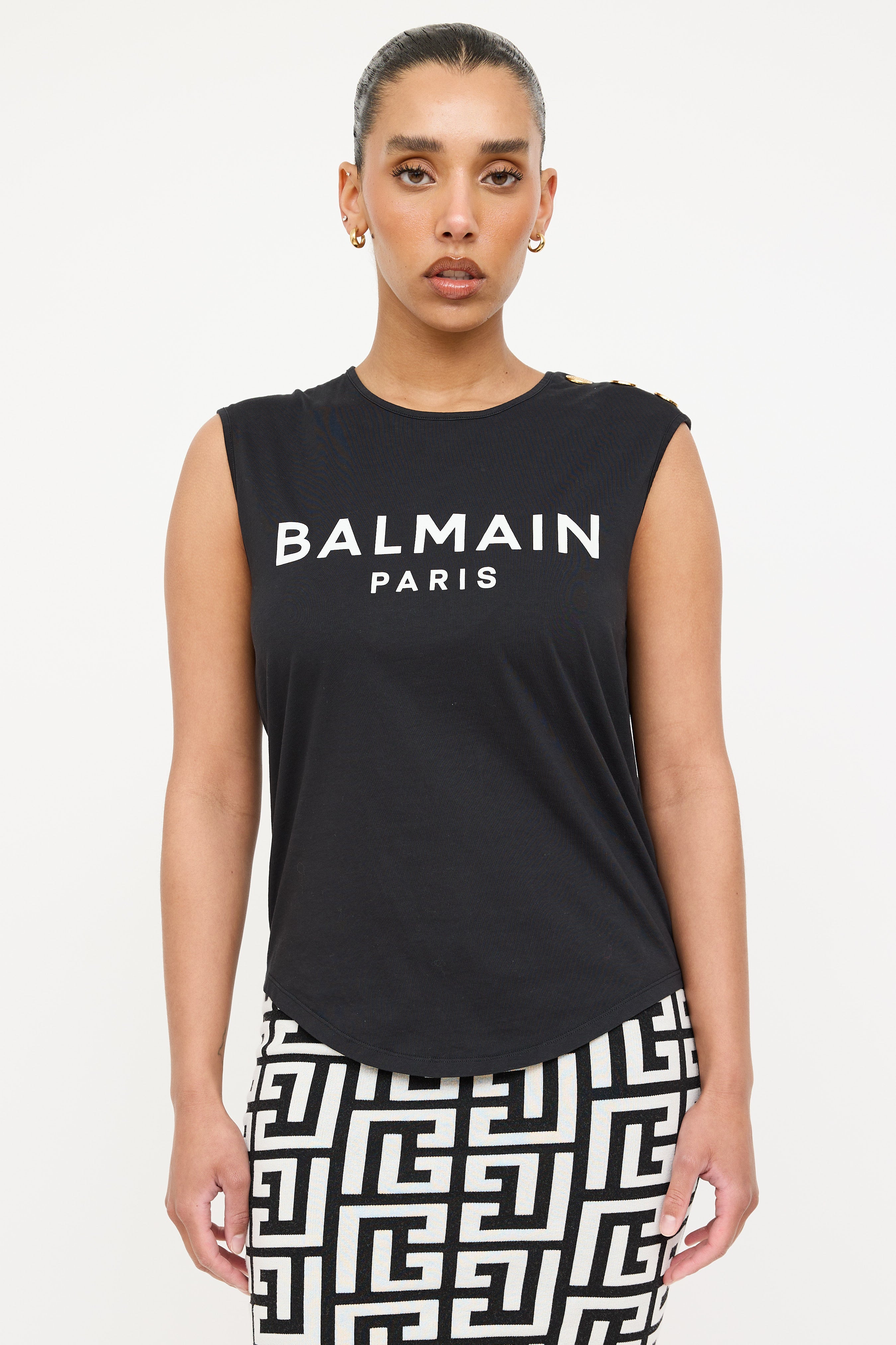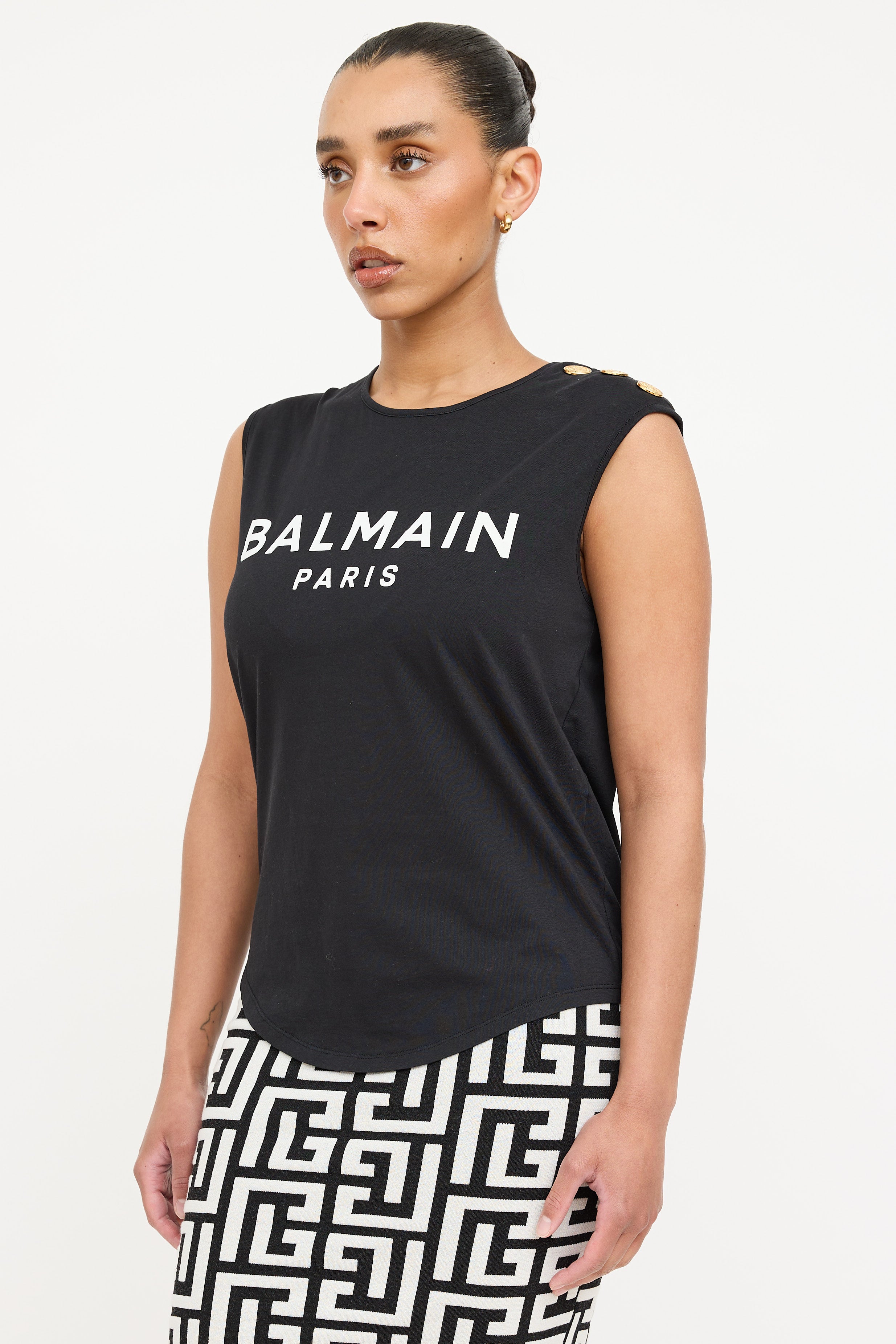 Pre-owned Balmain black tank top featuring a white logo at chest, round neckline, and gold tone button hardware at shoulder.