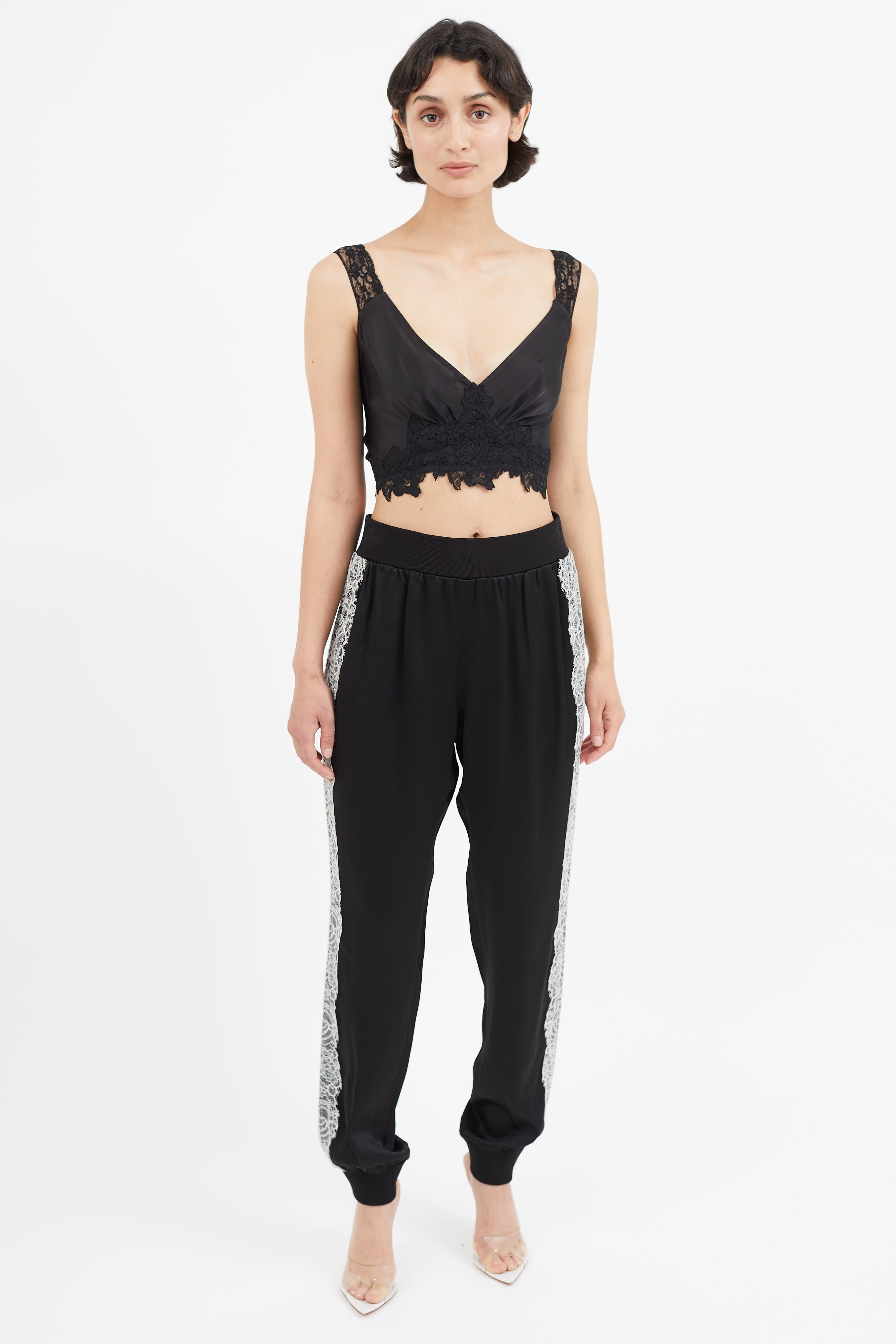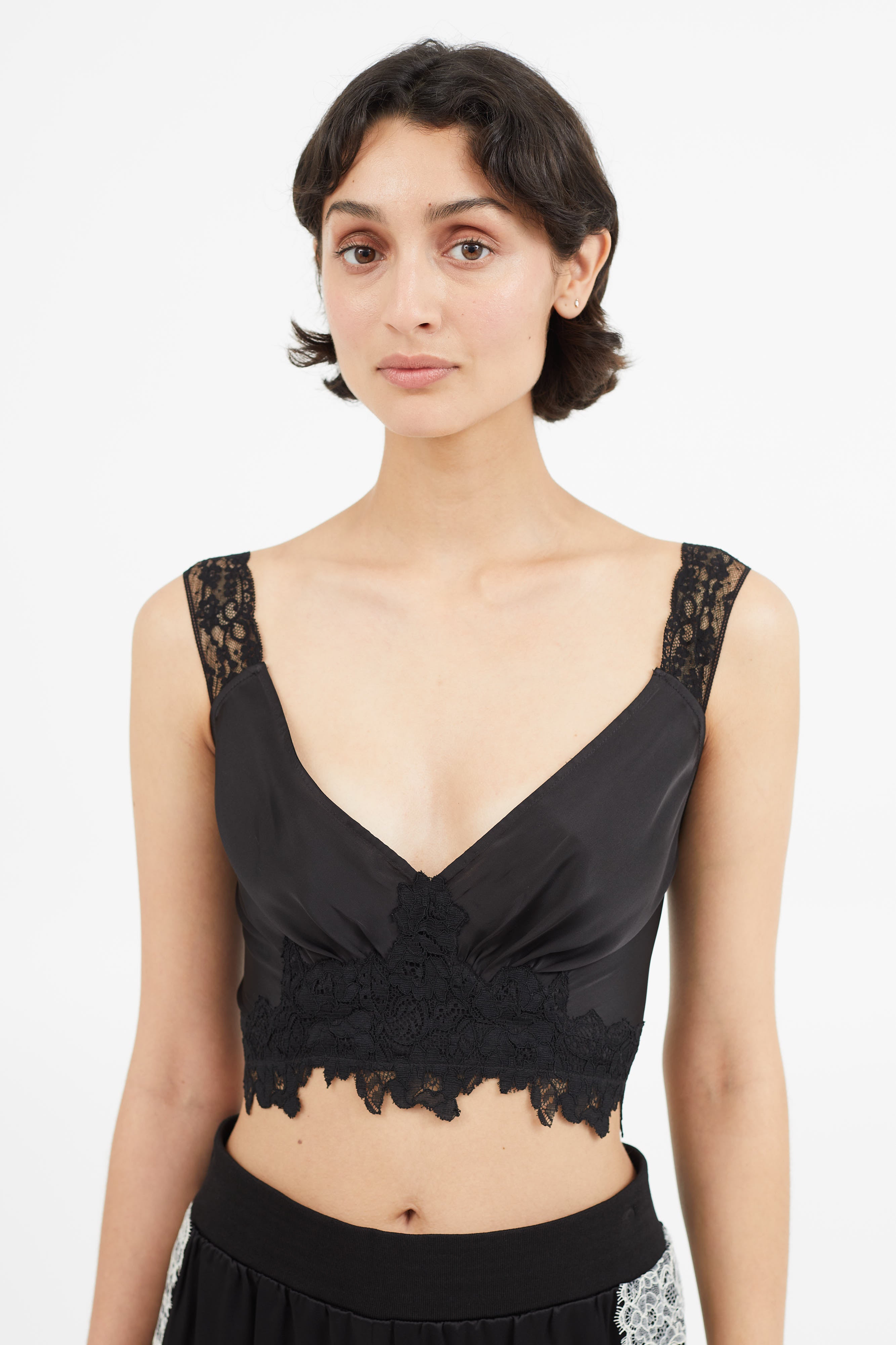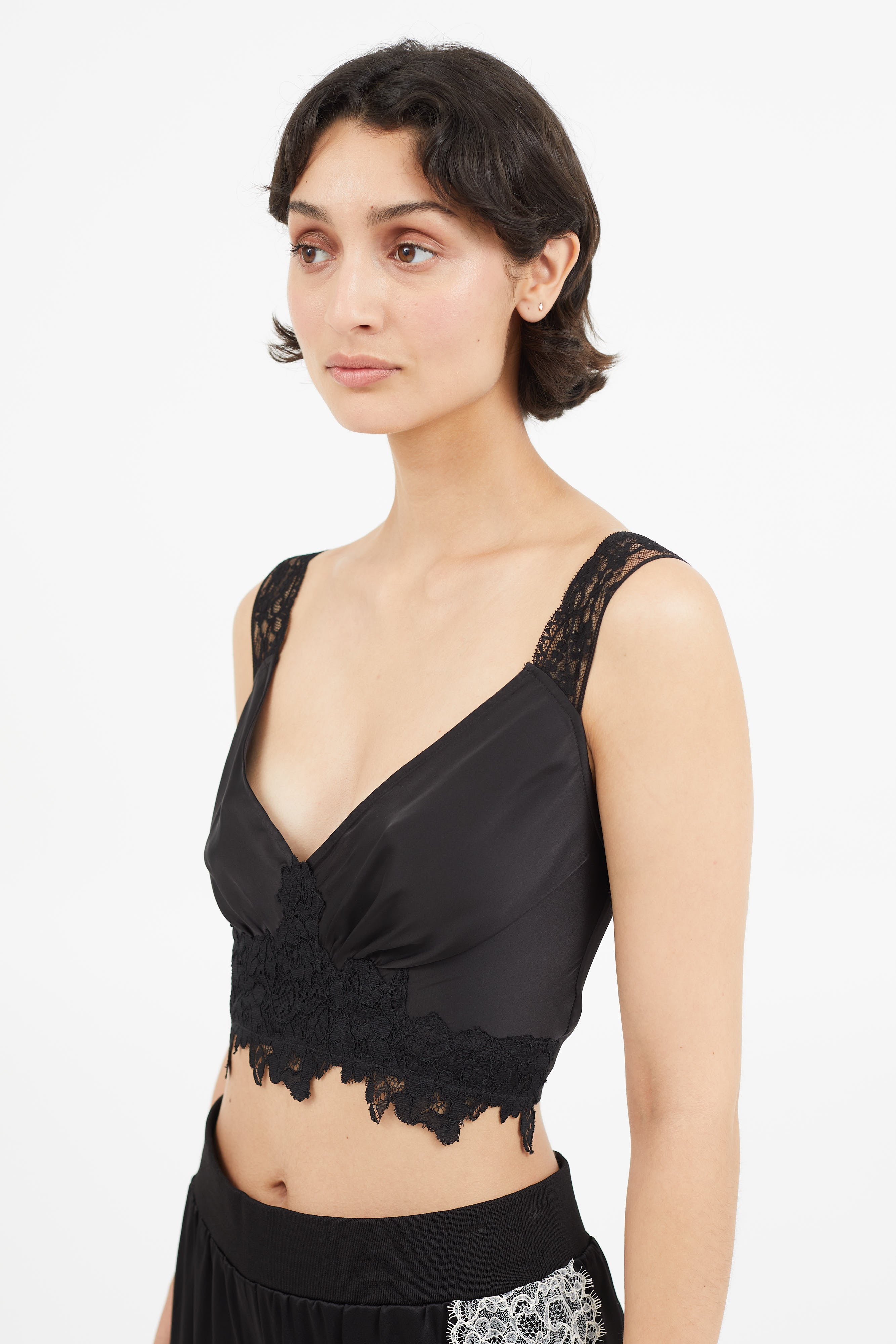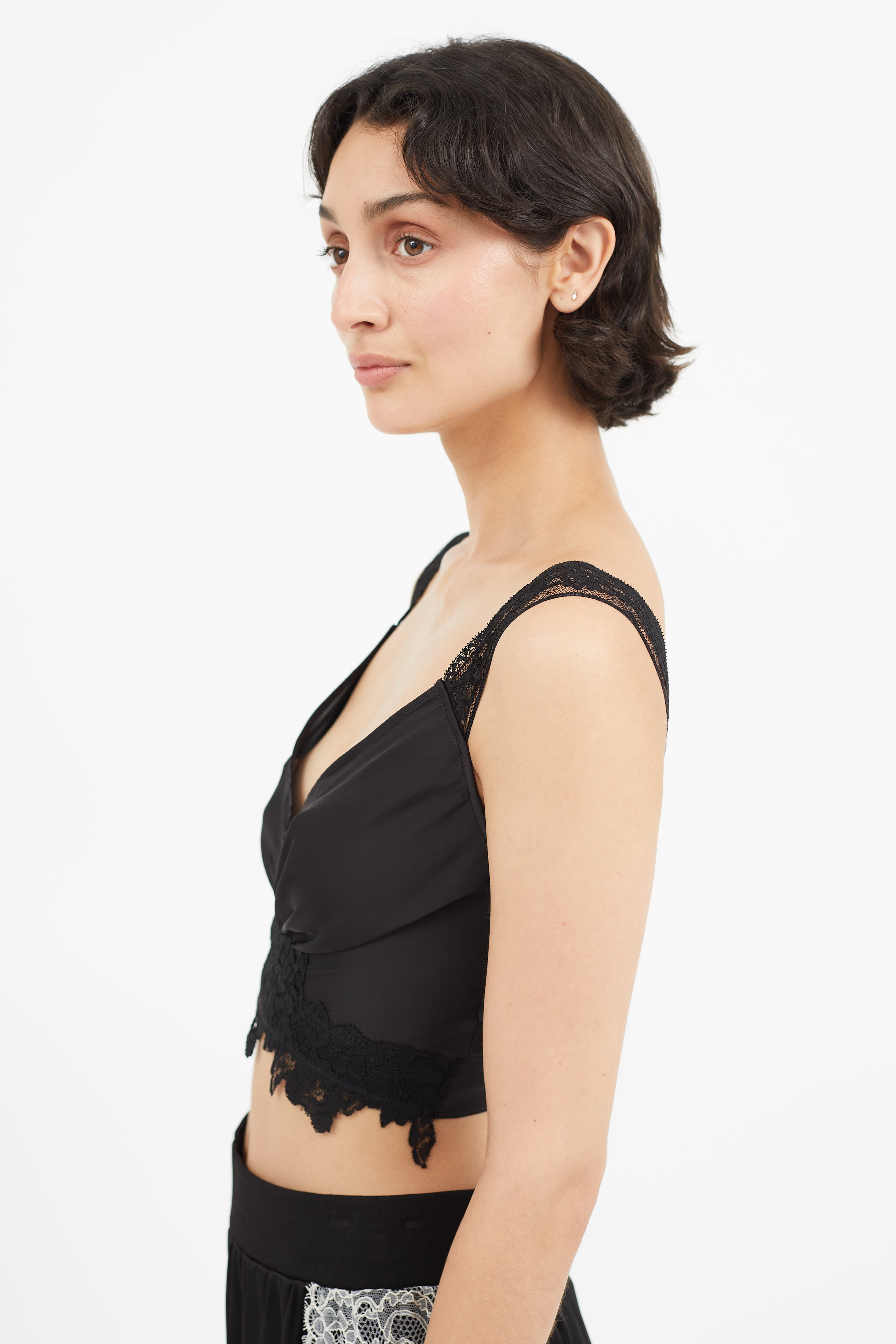 Pre-owned Paco Rabane black top featuring a V-neckline, lace detailing, and silver tone button closure at back.