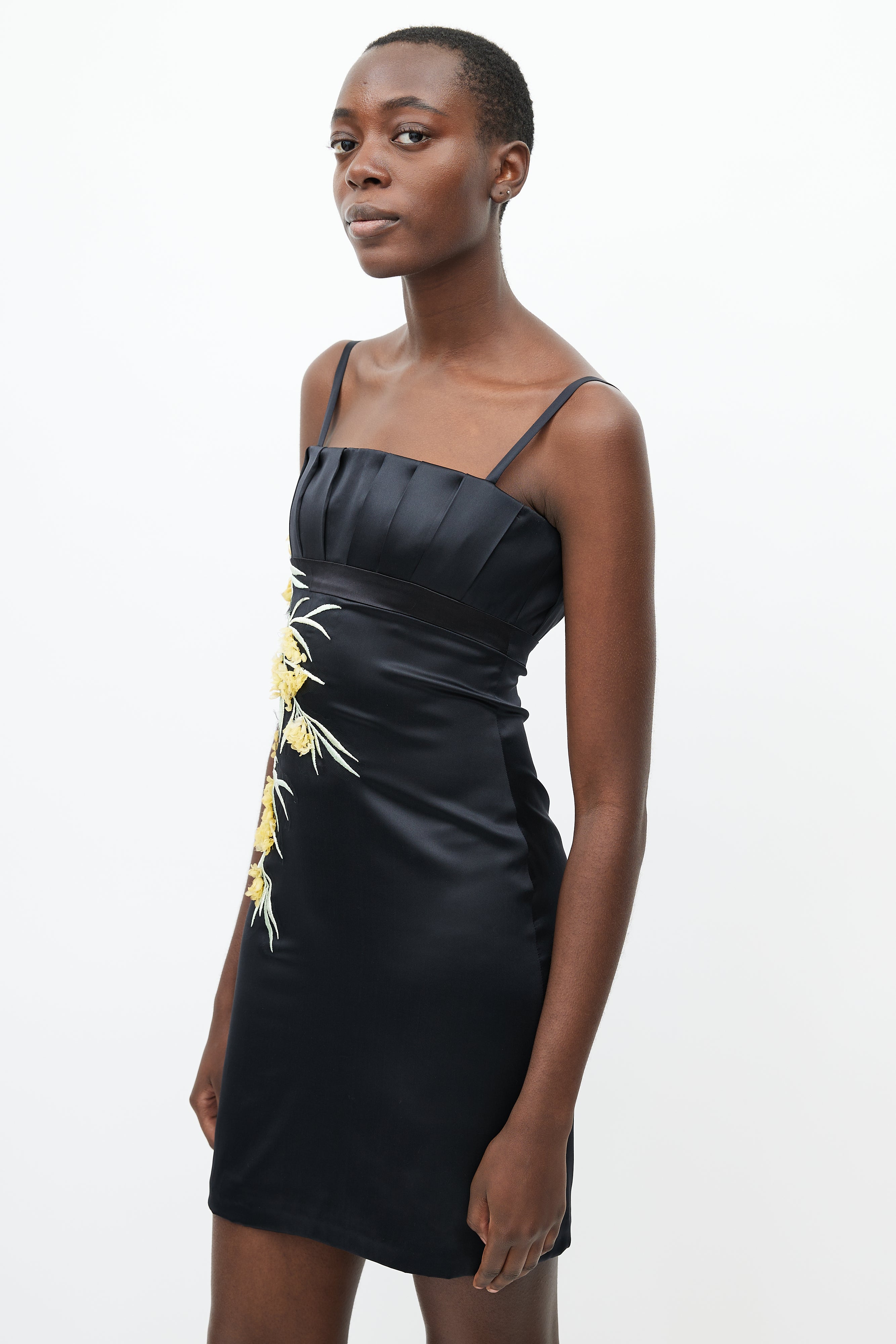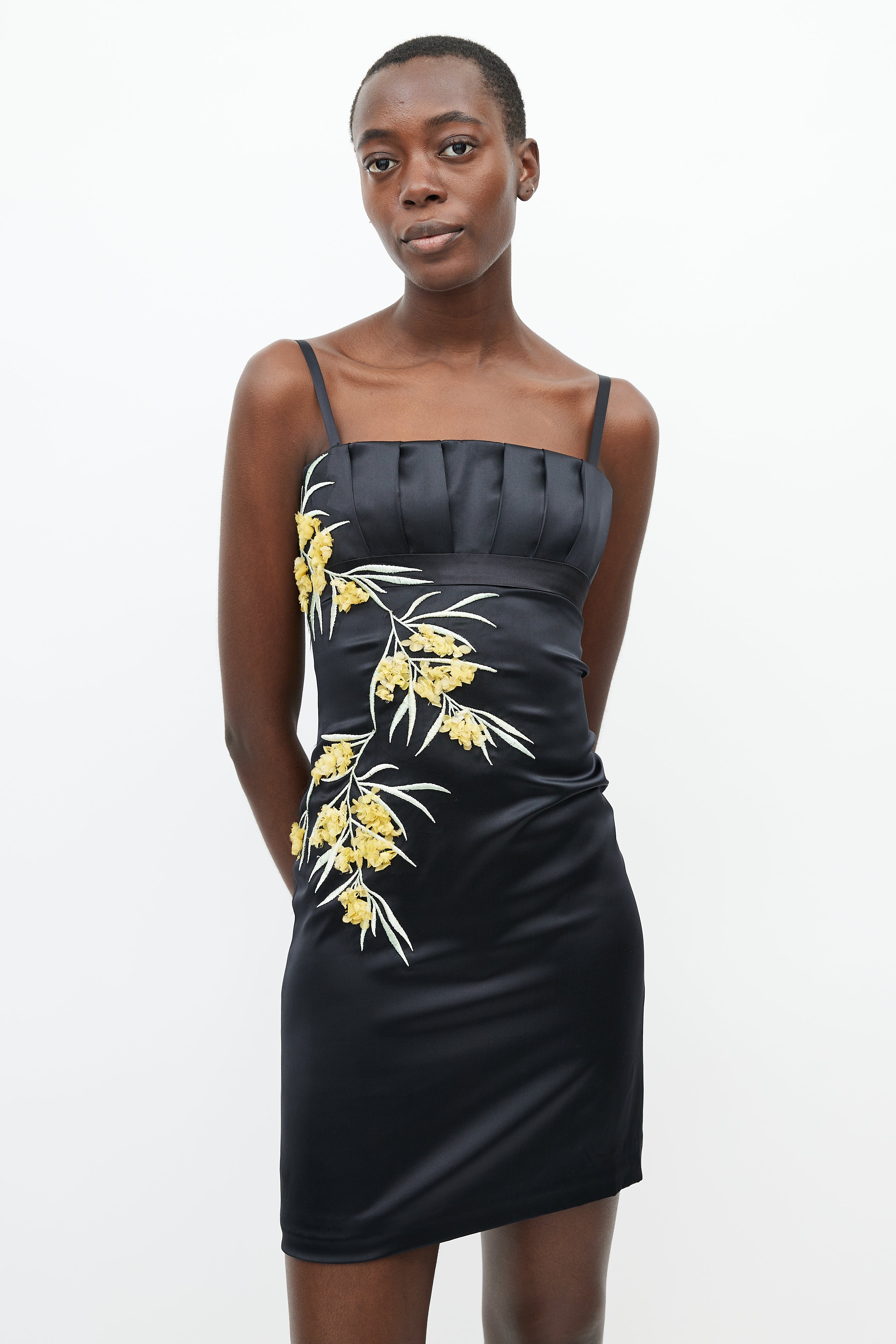 Pre-owned Roberto Cavalli black dress featuring square neckline, pleated bustier, fixed spaghetti straps, yellow and green floral embroidery, and concealed zip closure at back.