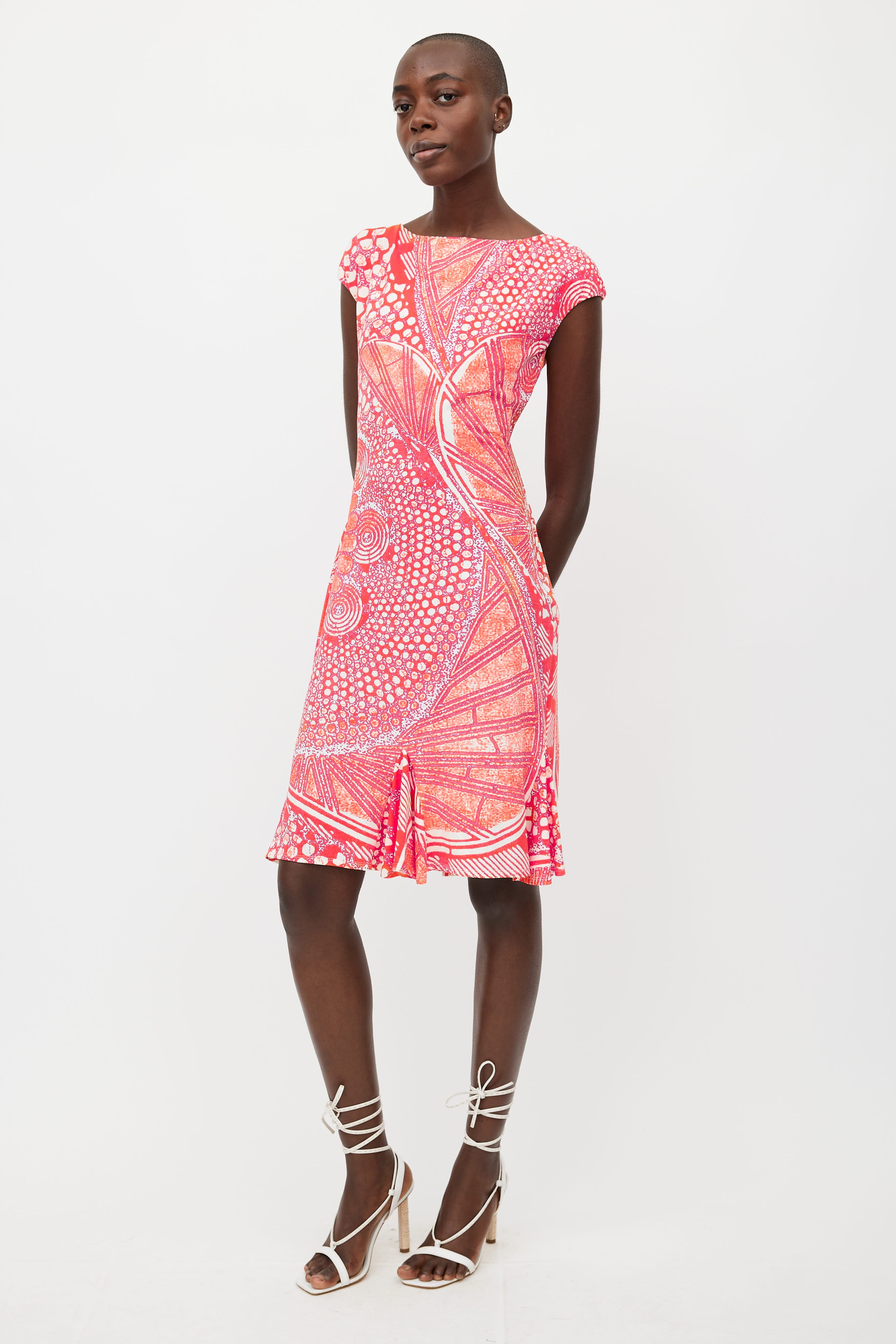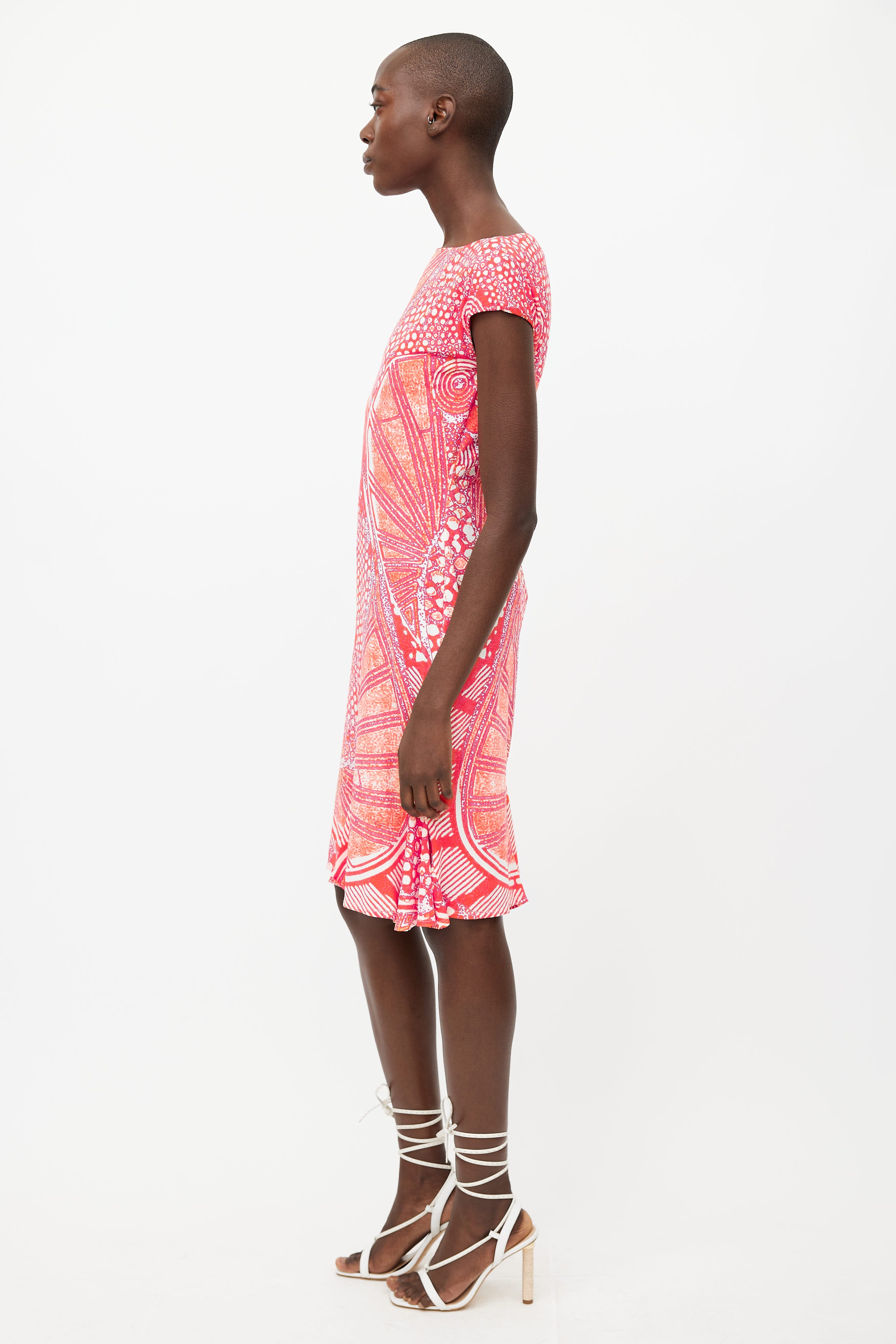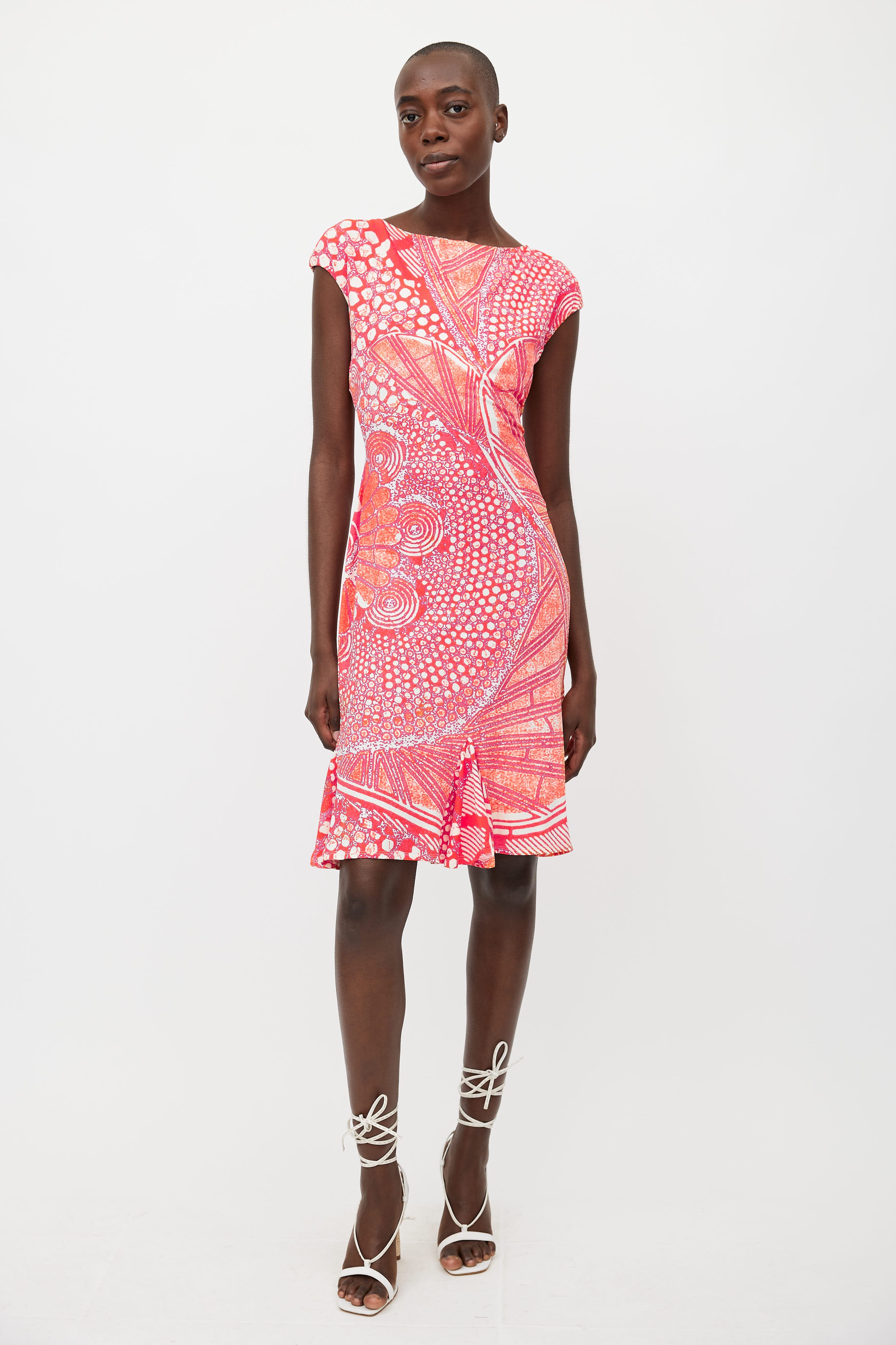 Pre-owned Roberto Cavalli red dress featuring a white abstract print throughout, bateau neckline, cap sleeves, and a ruffled skirt. Clipped to fit model.