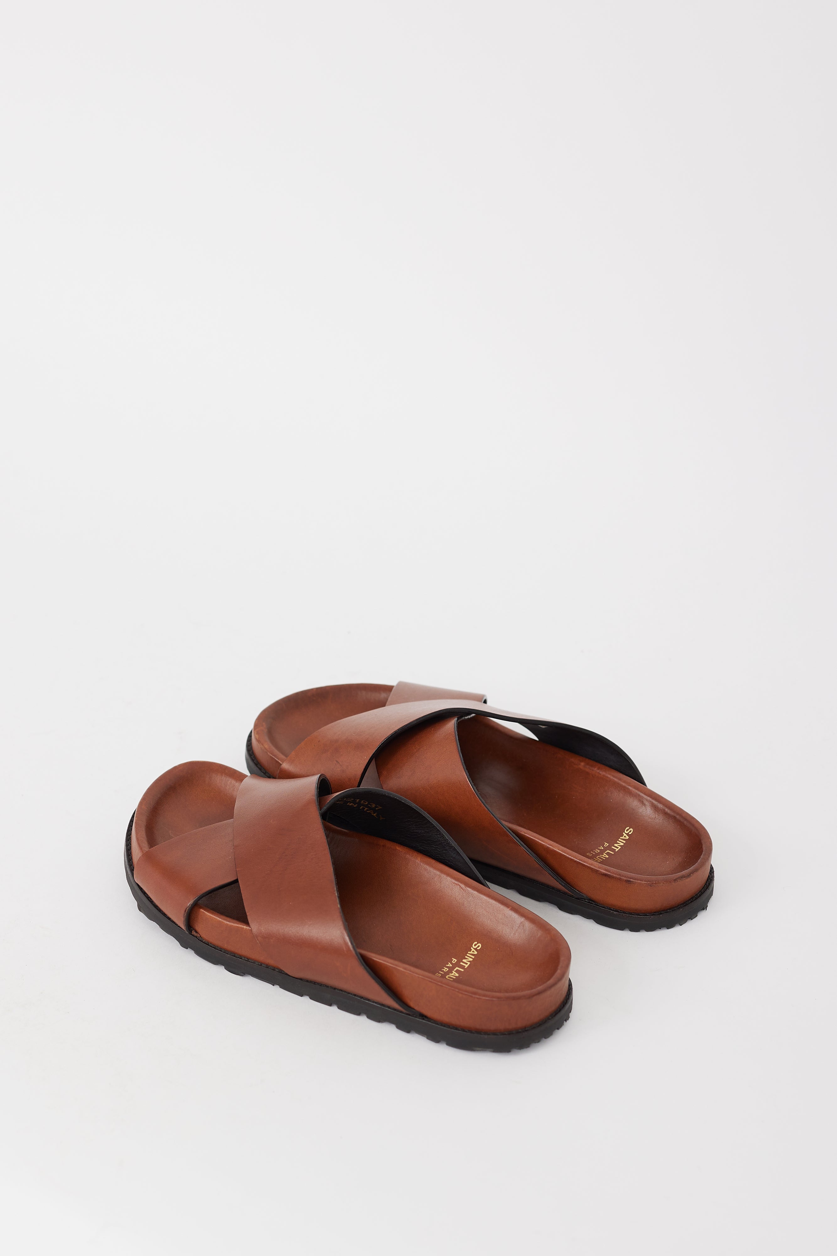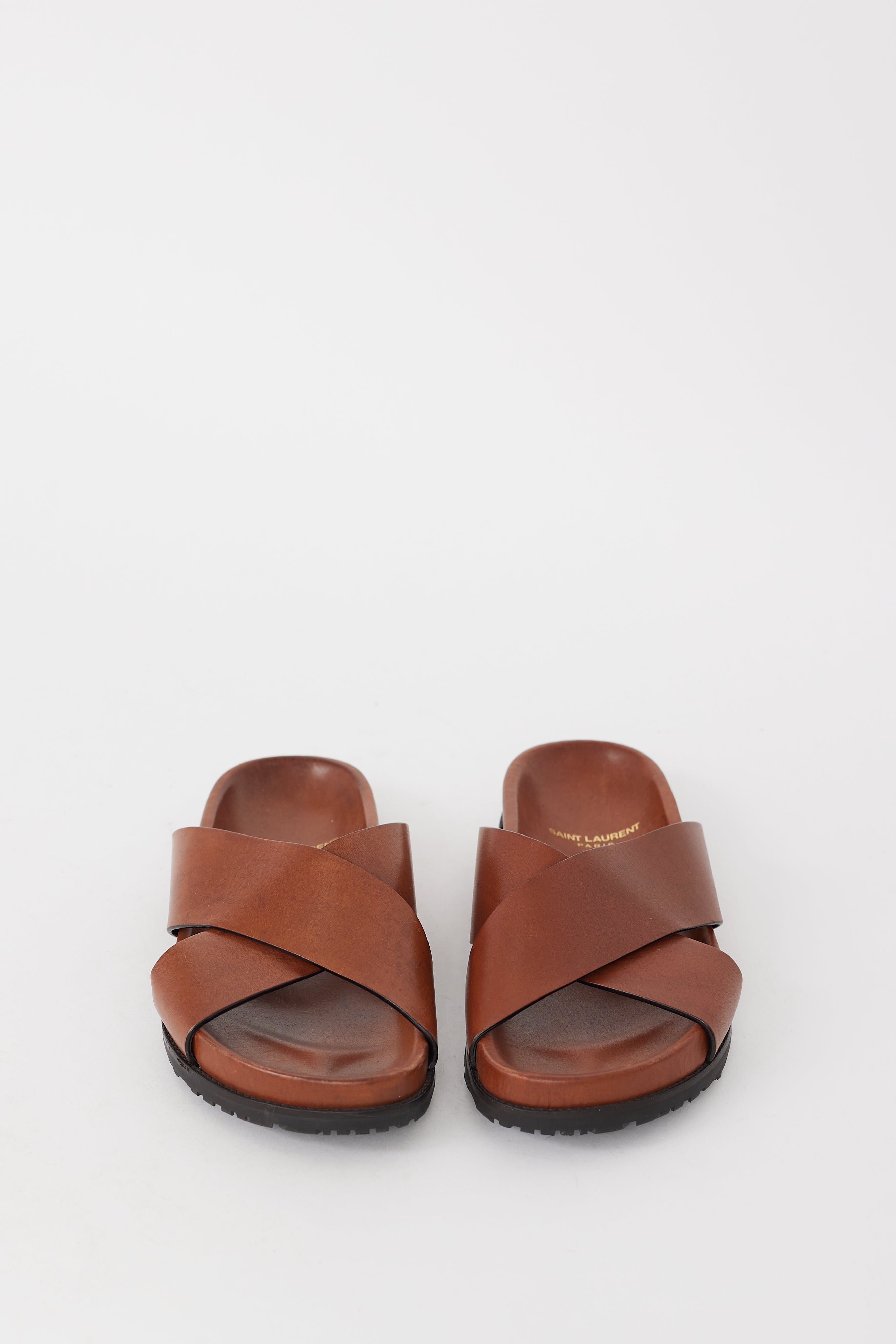 Pre-owned Saint Laurent brown leather sandals featuring an open rounded toe, wide criss cross straps across instep, leather midsole, and rubber outsole. Comes with original dust bag.