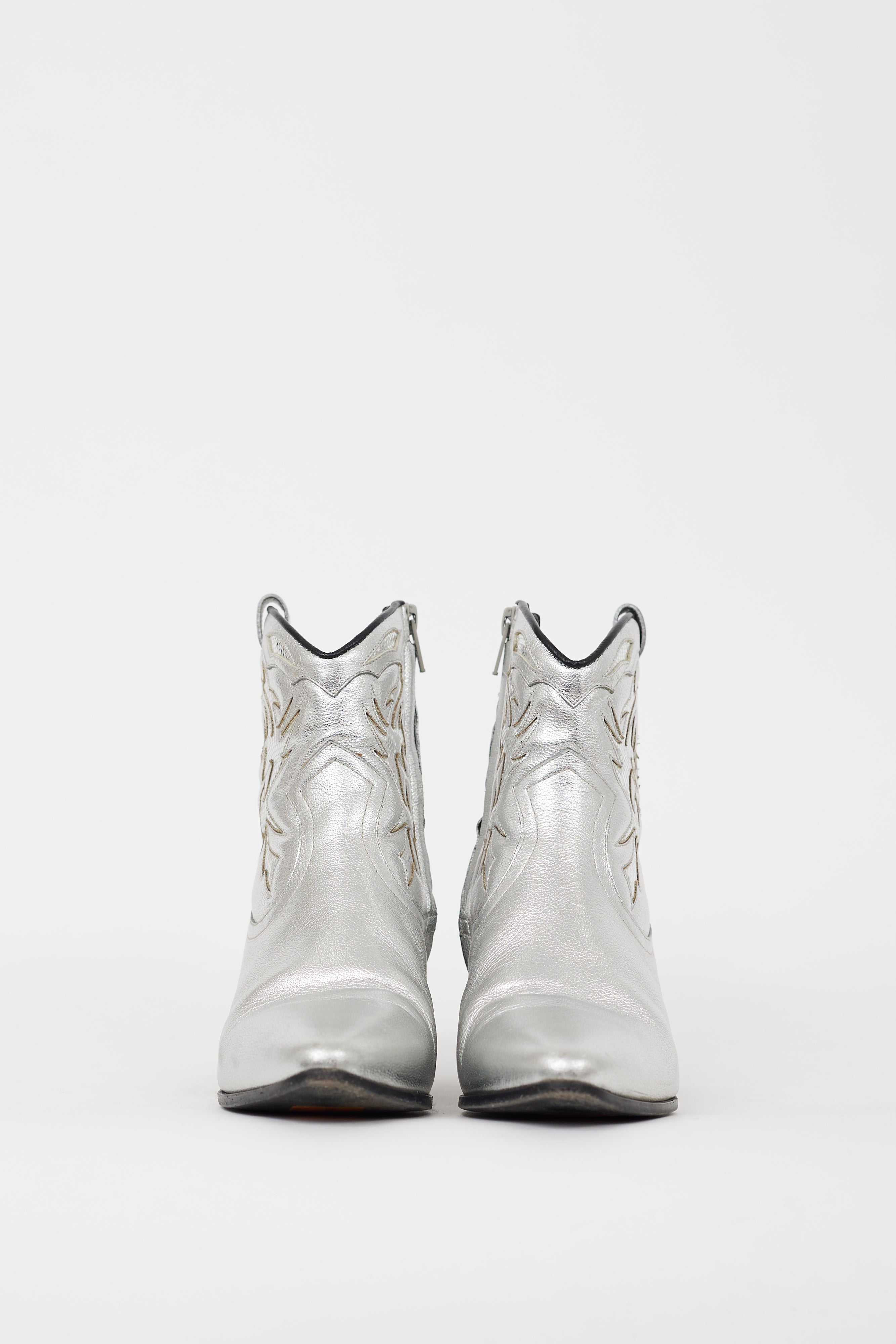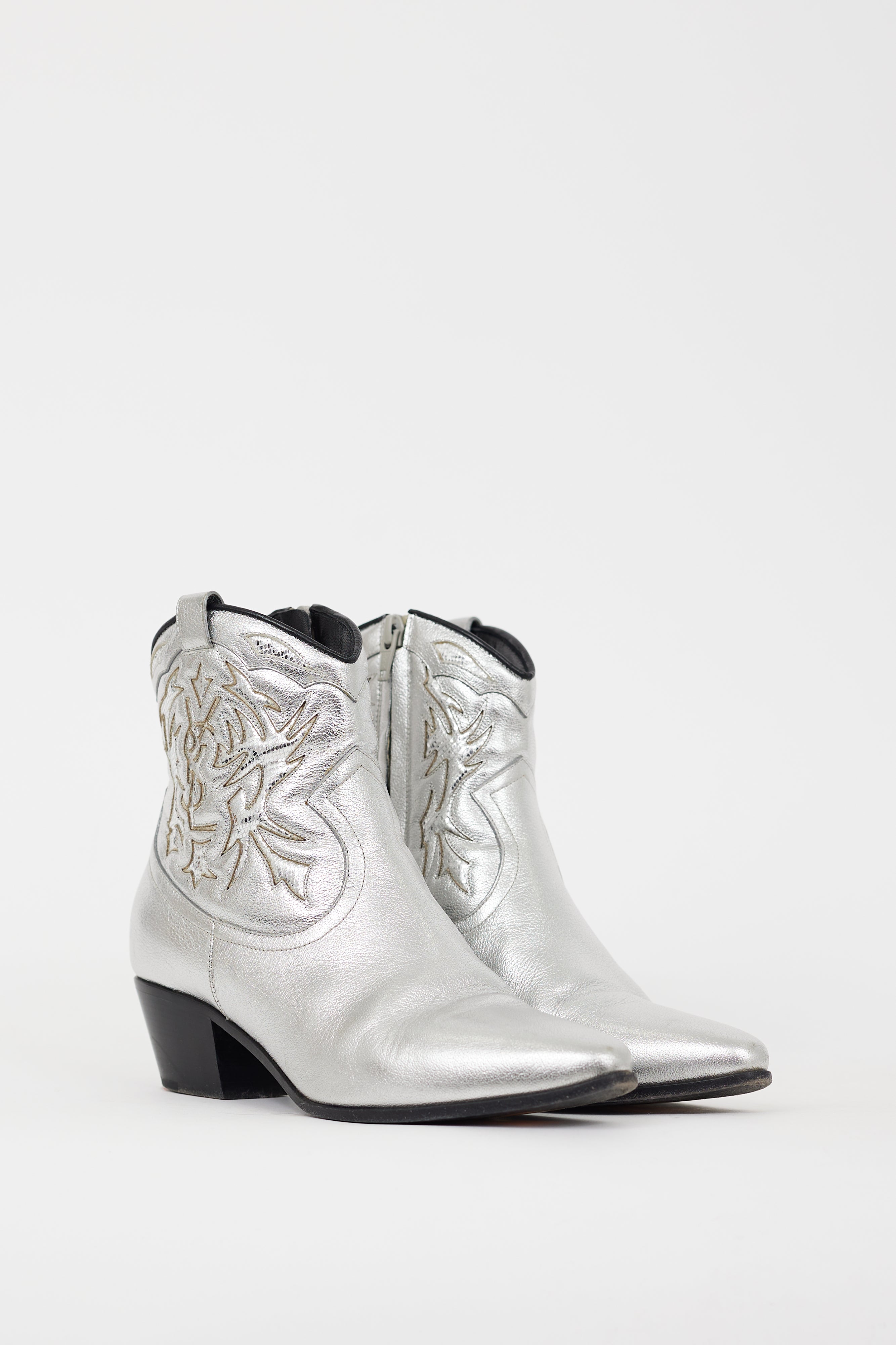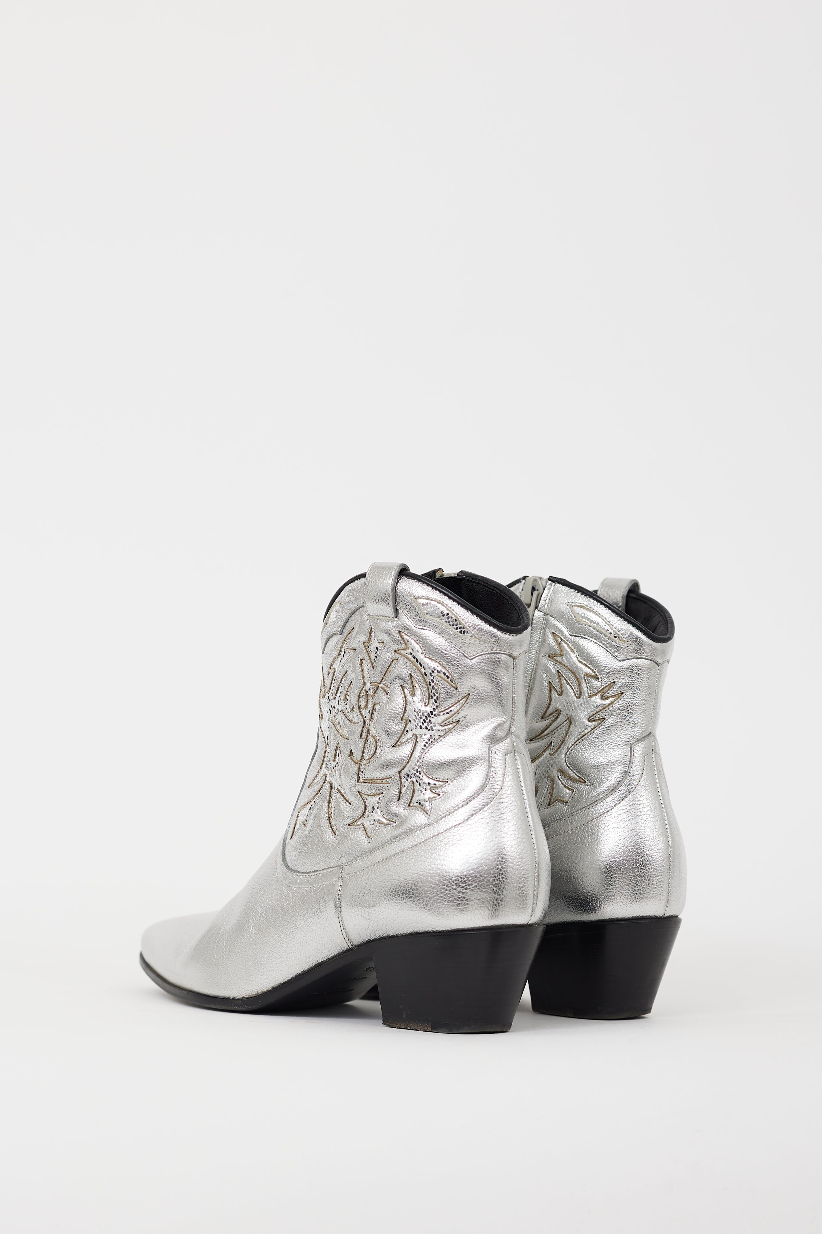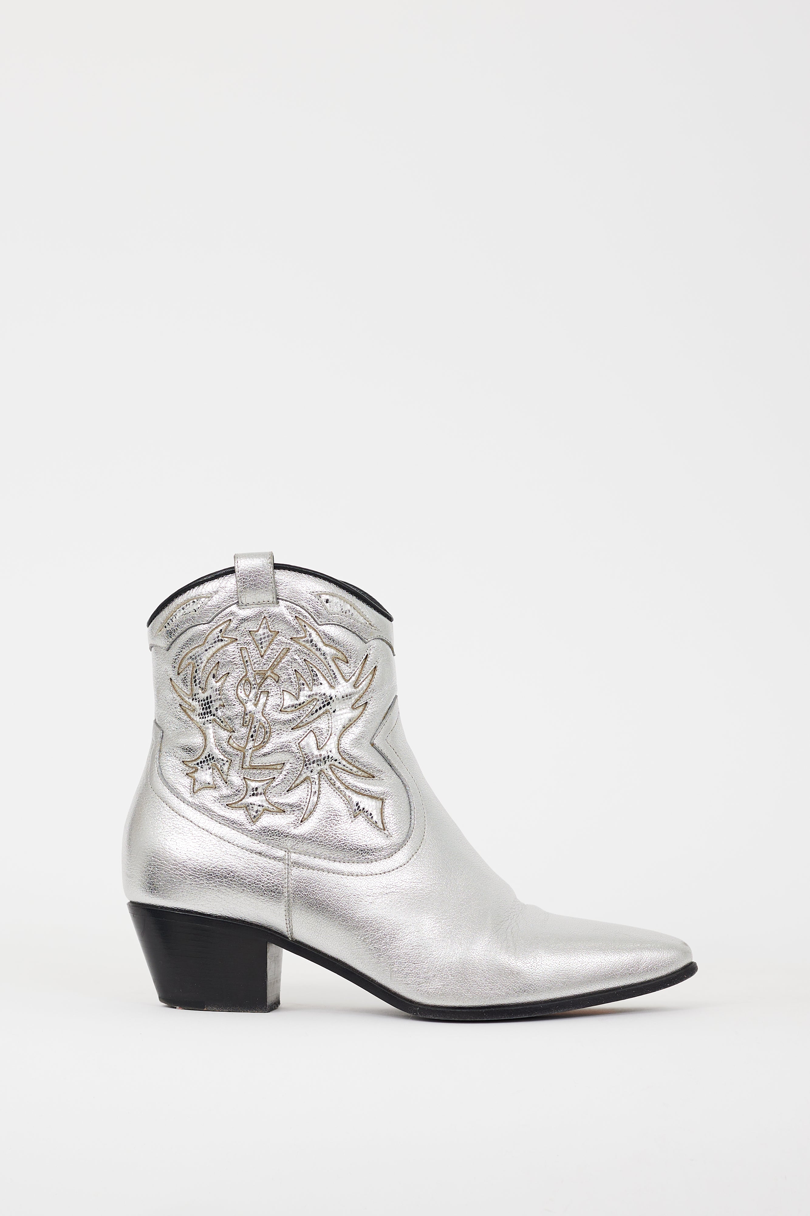 Pre-owned Saint Laurent silver Rock 40 leather boots featuring a pointed toe, ankle height shaft featuring western embroidery, stacked western heel, pull tabs at shaft, and zip closure at side. Comes with original box.