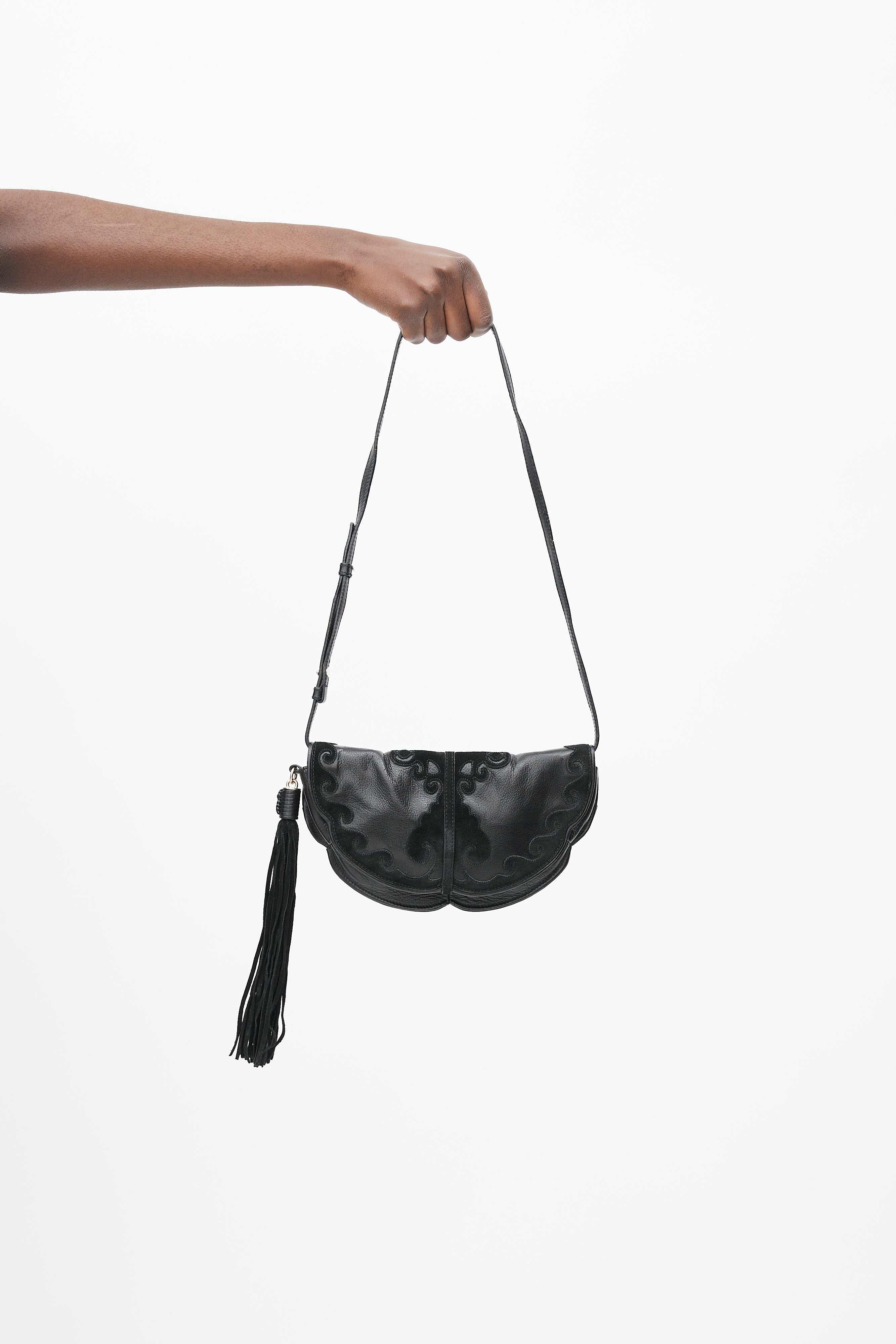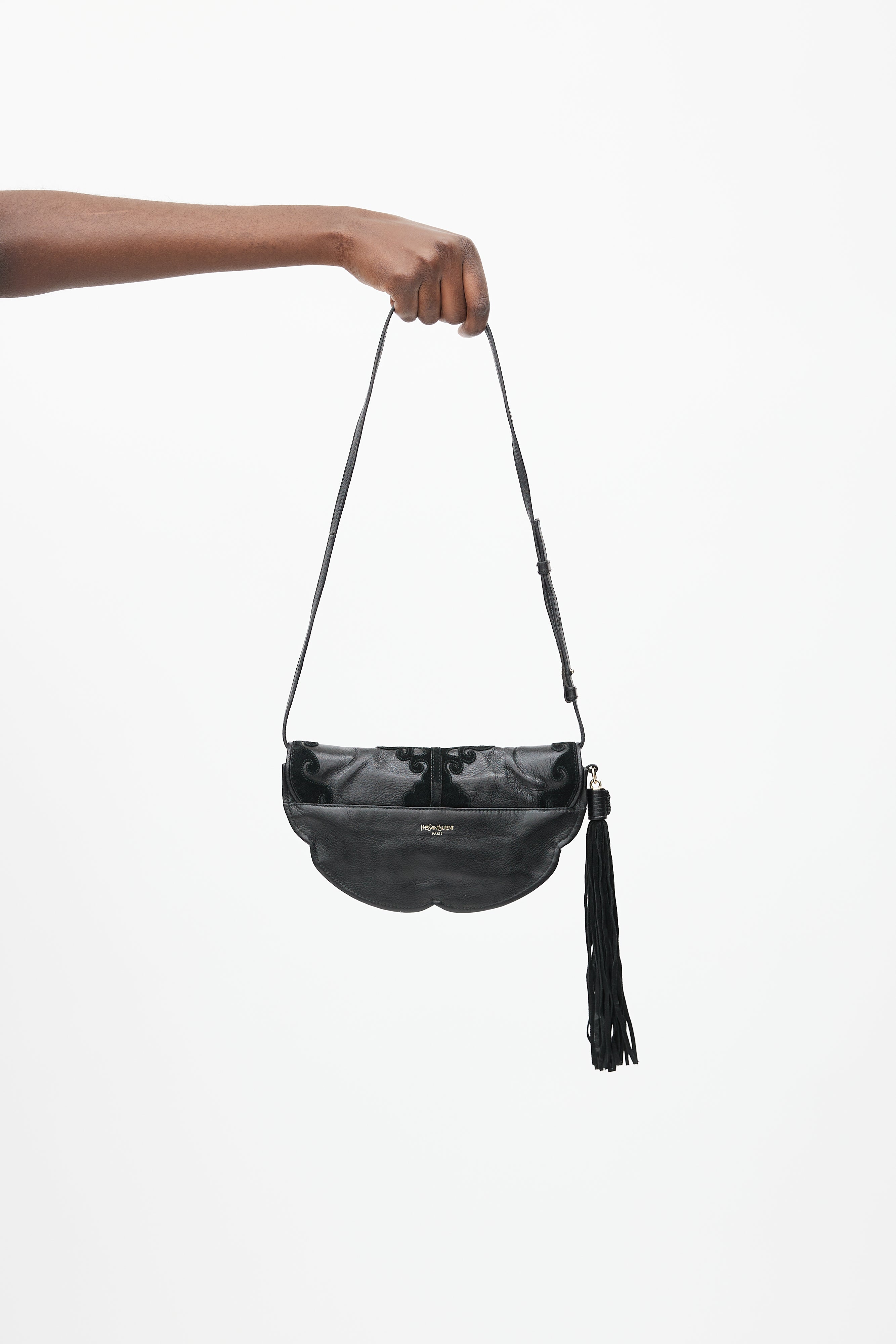 Pre-owned vintage Yves Saint Laurent Rive Gauche black bag featuring tonal suede panel detail at front, suede tassel charm, snap button closure, adjustable shoulder strap, and one card slot inside. Original dust bag included.