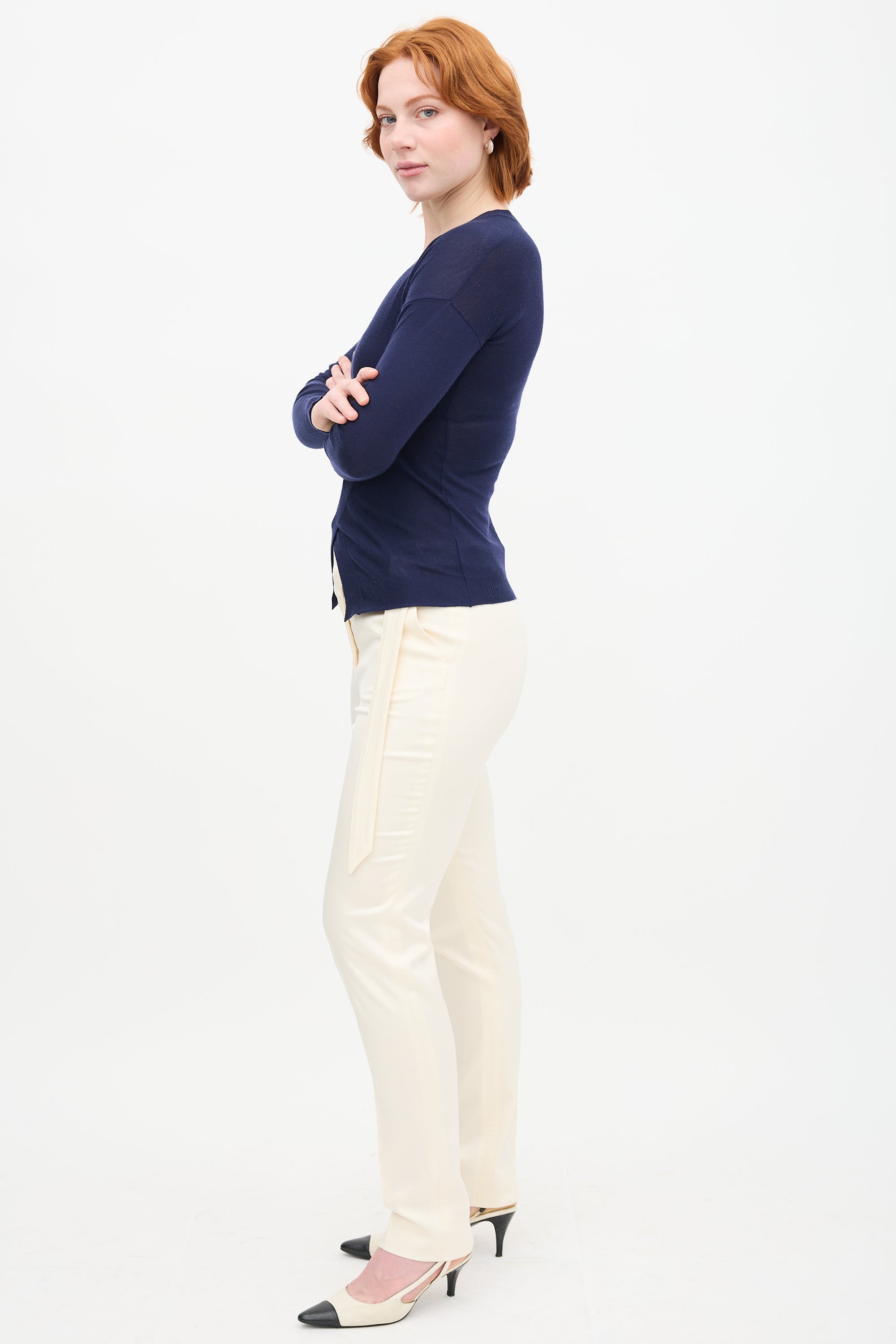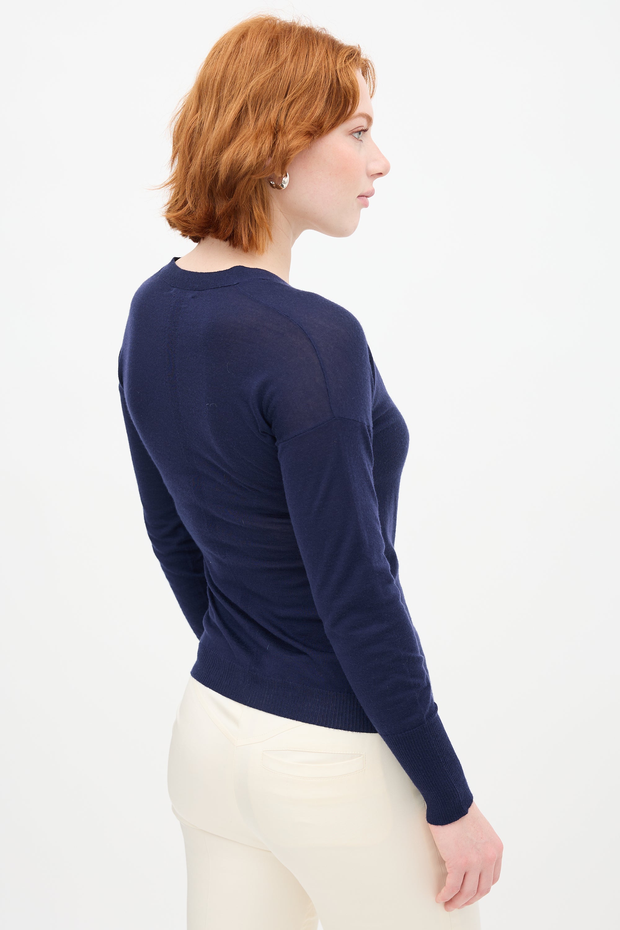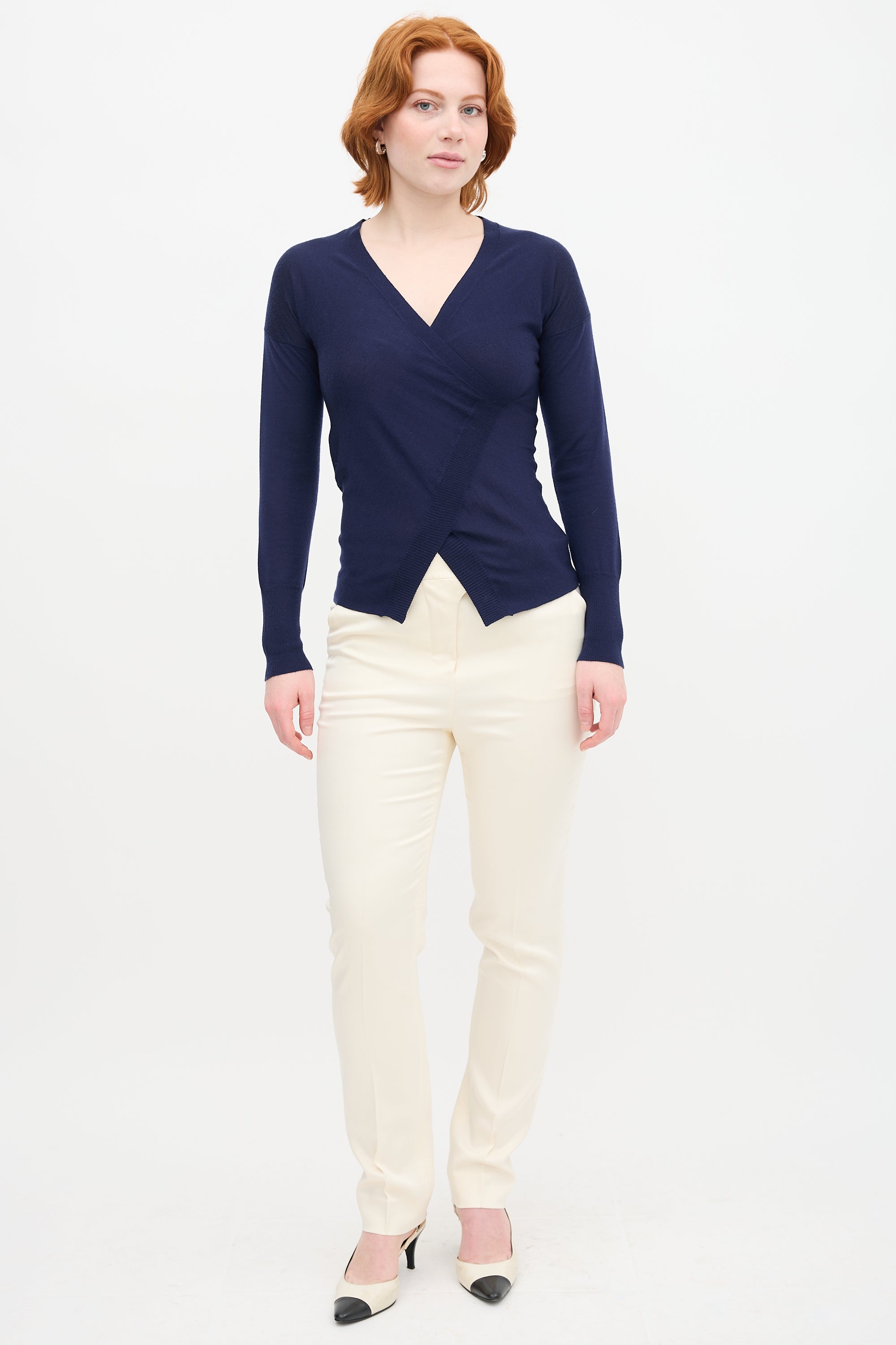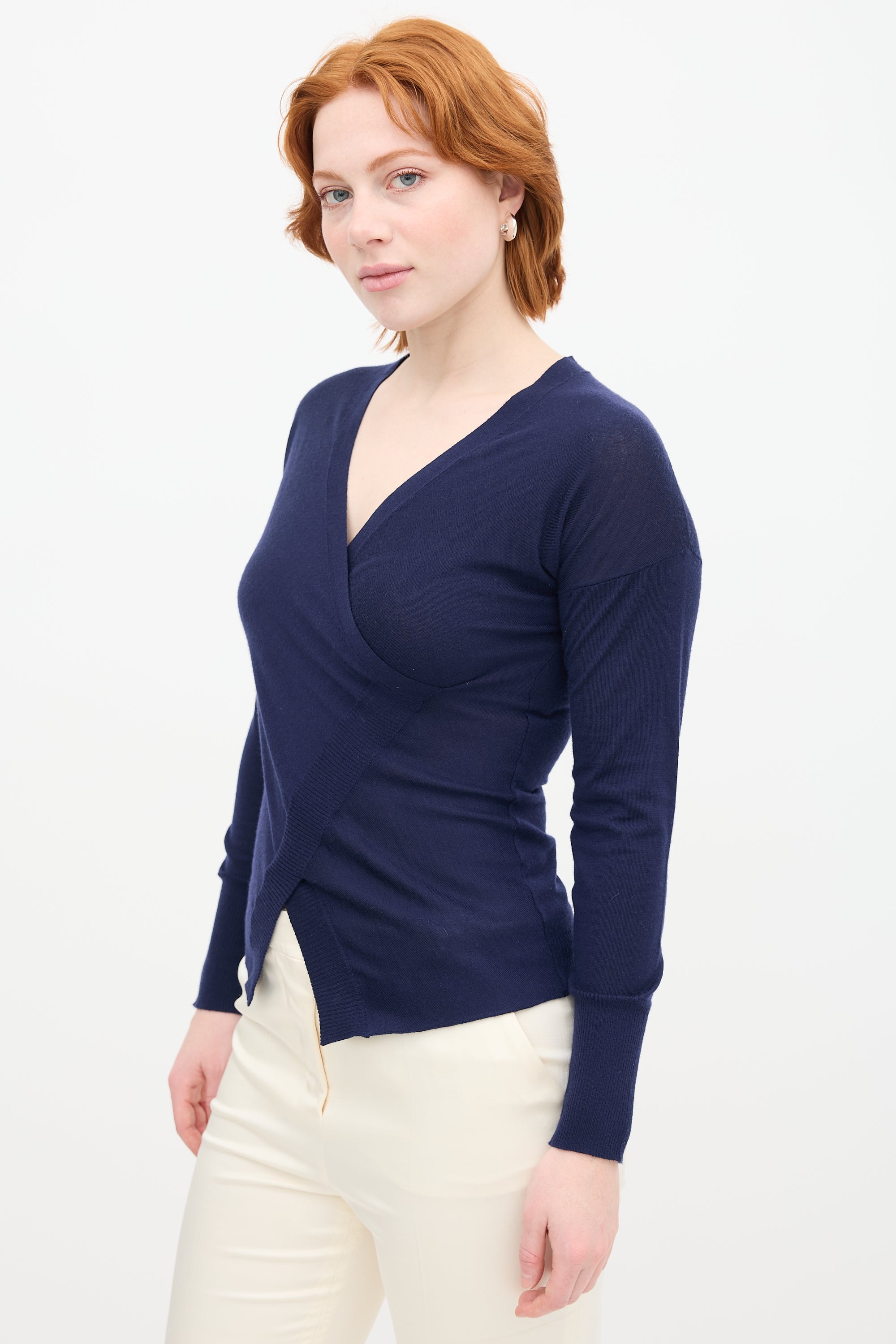 Pre-owned Tom Ford navy sweater featuring V-neckline, wrapped front, and ribbed trim.