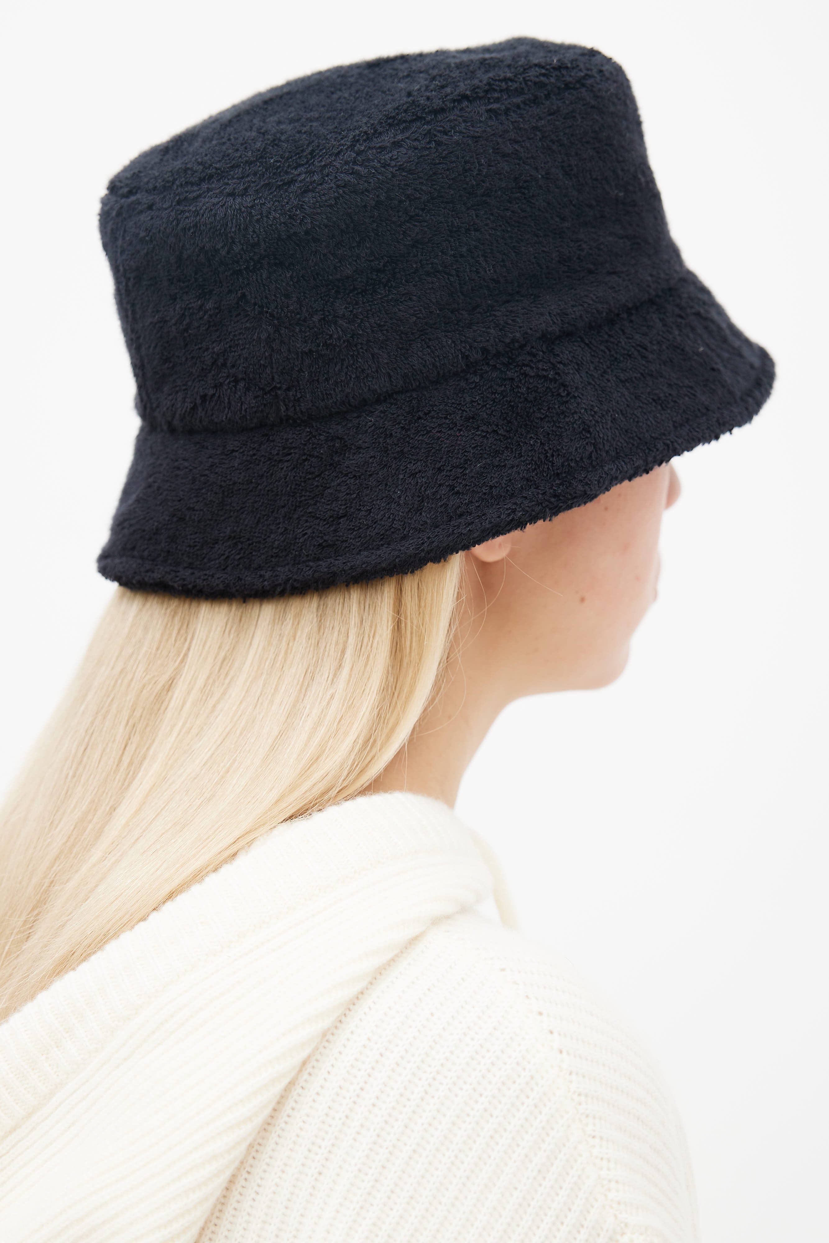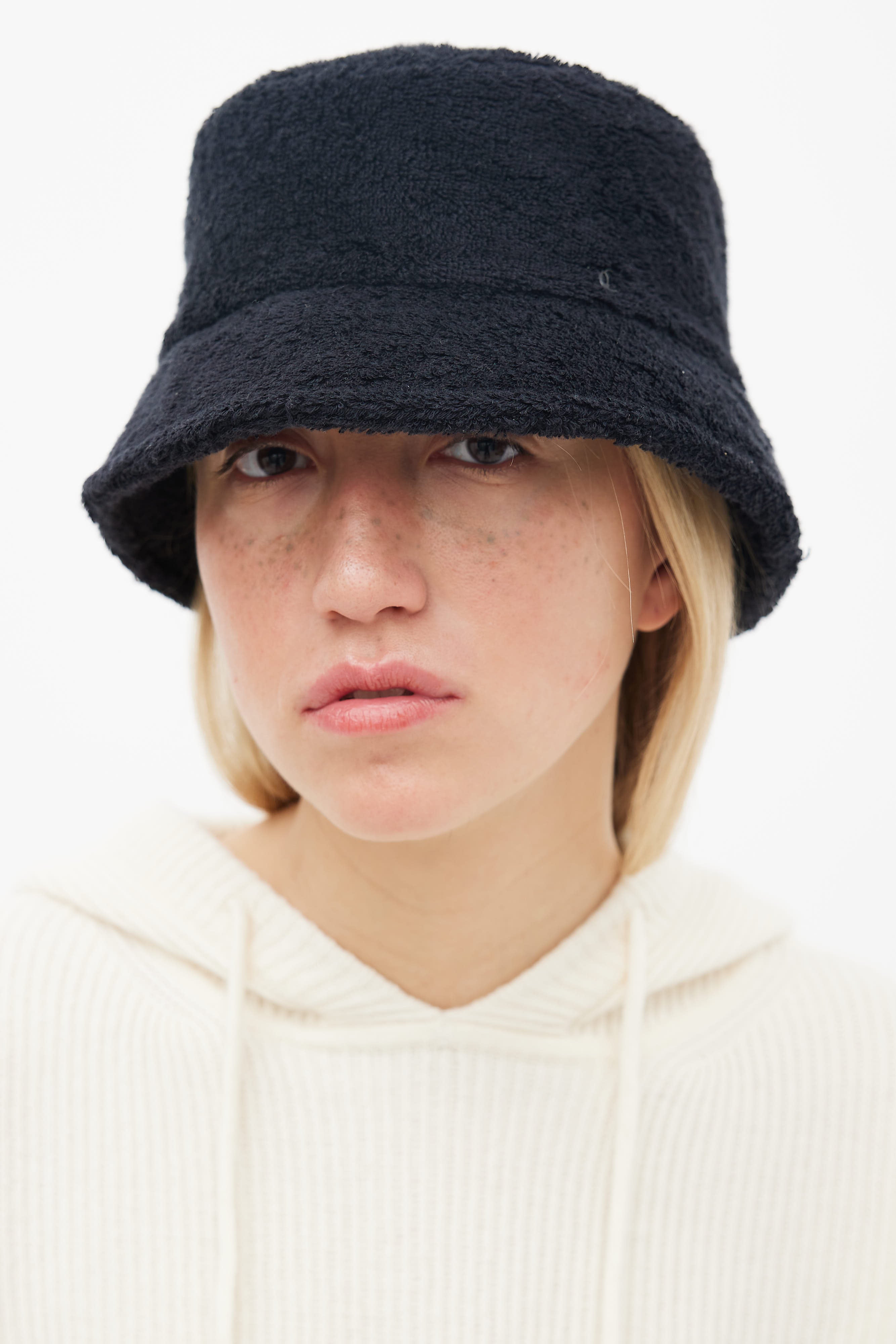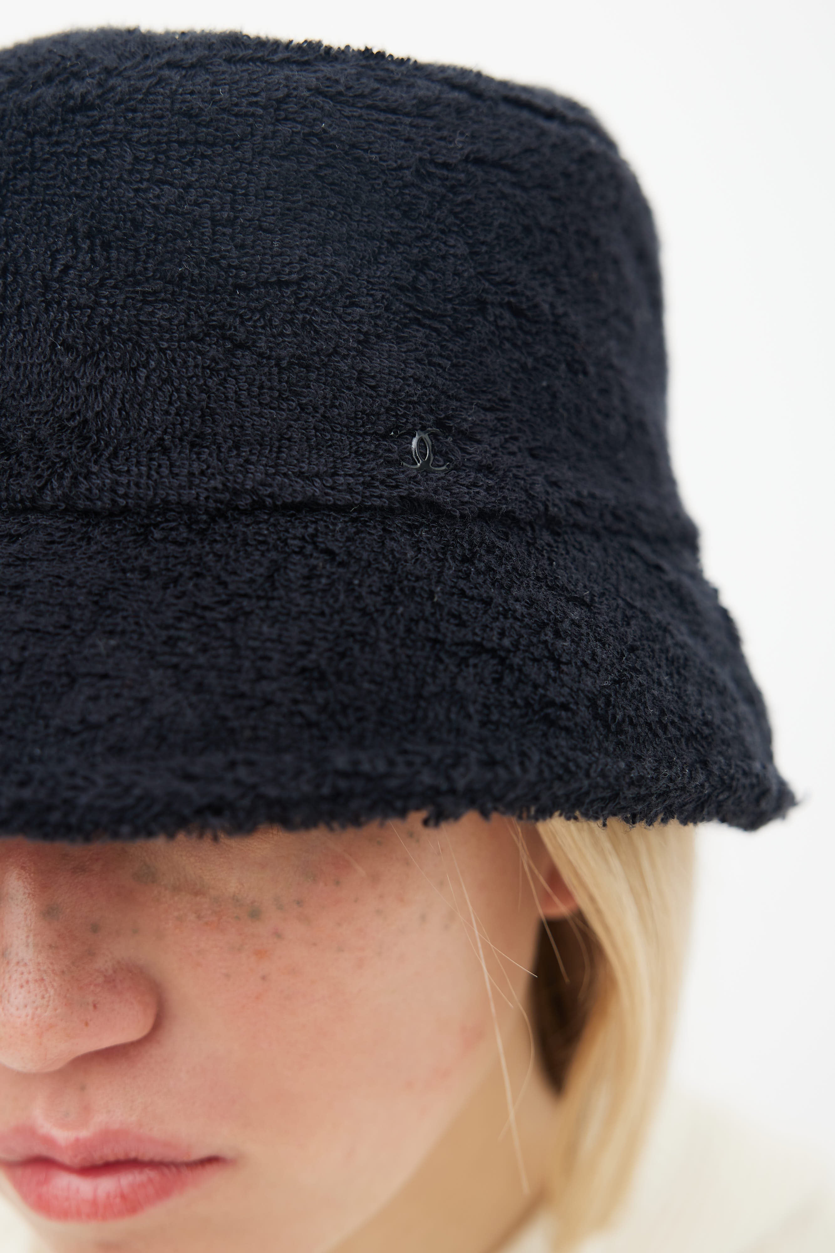 Pre-owned Chanel black cotton bucket hat featuring terrycloth material throughout, small black metal interlocking CC logo at front and black webbed panel inside.