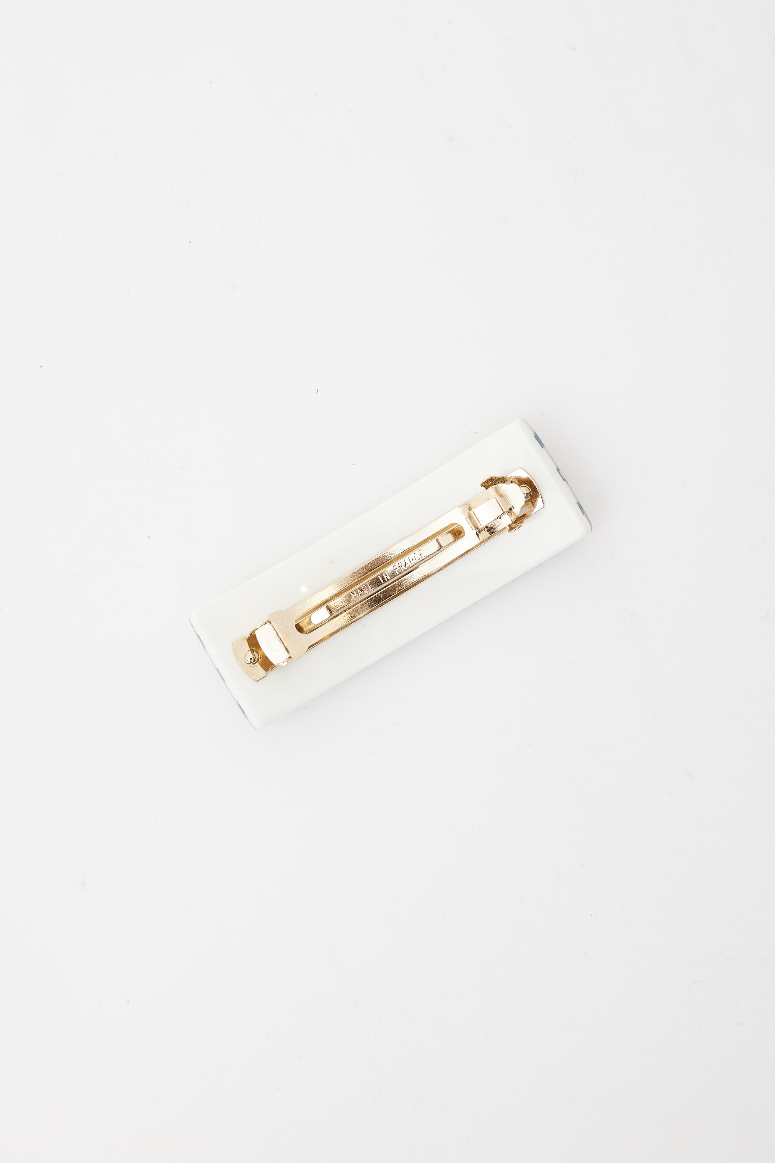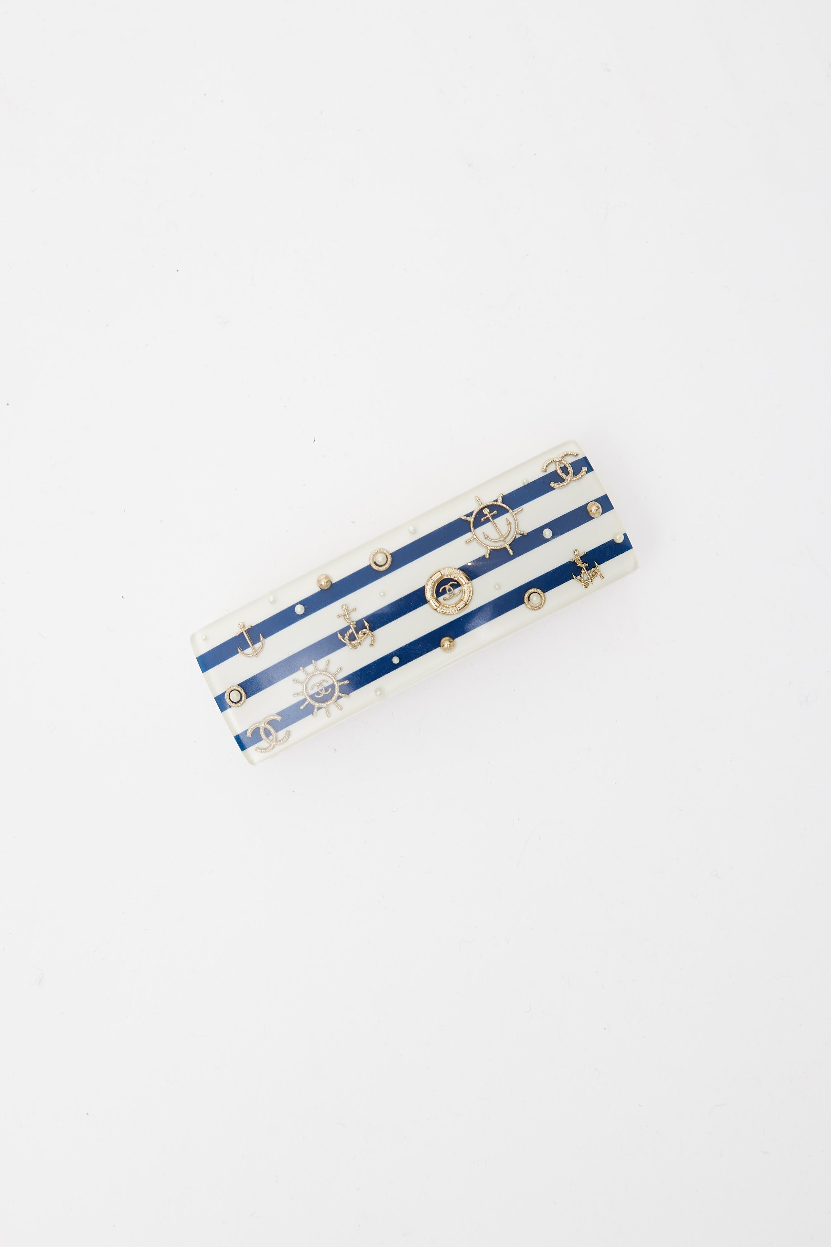 Pre-loved Chanel 2010 Cruise barrette in white enamel featuring horizontal blue stripes, gold-tone nautical themed and interlocking CC logo charms and snap closure.