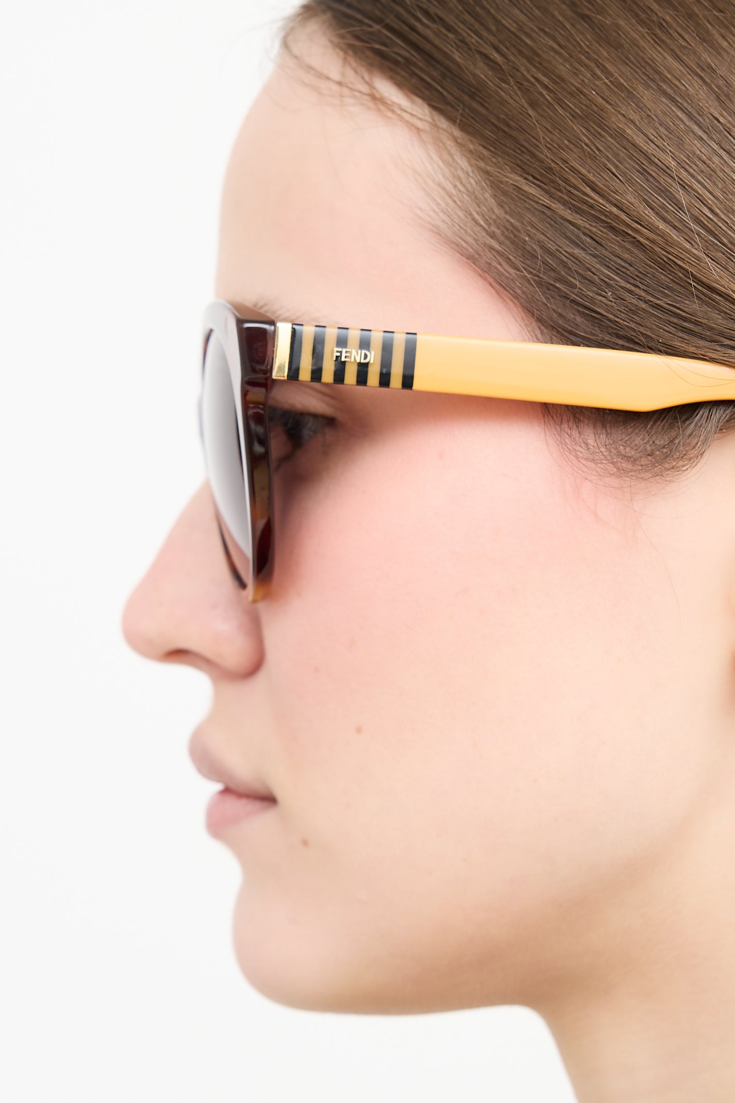 Pre-owned Fendi brown and black FF0013 sunglasses featuring black tinted round lens, tortoise frame with cateye, striping on arm and gold tone logo text.