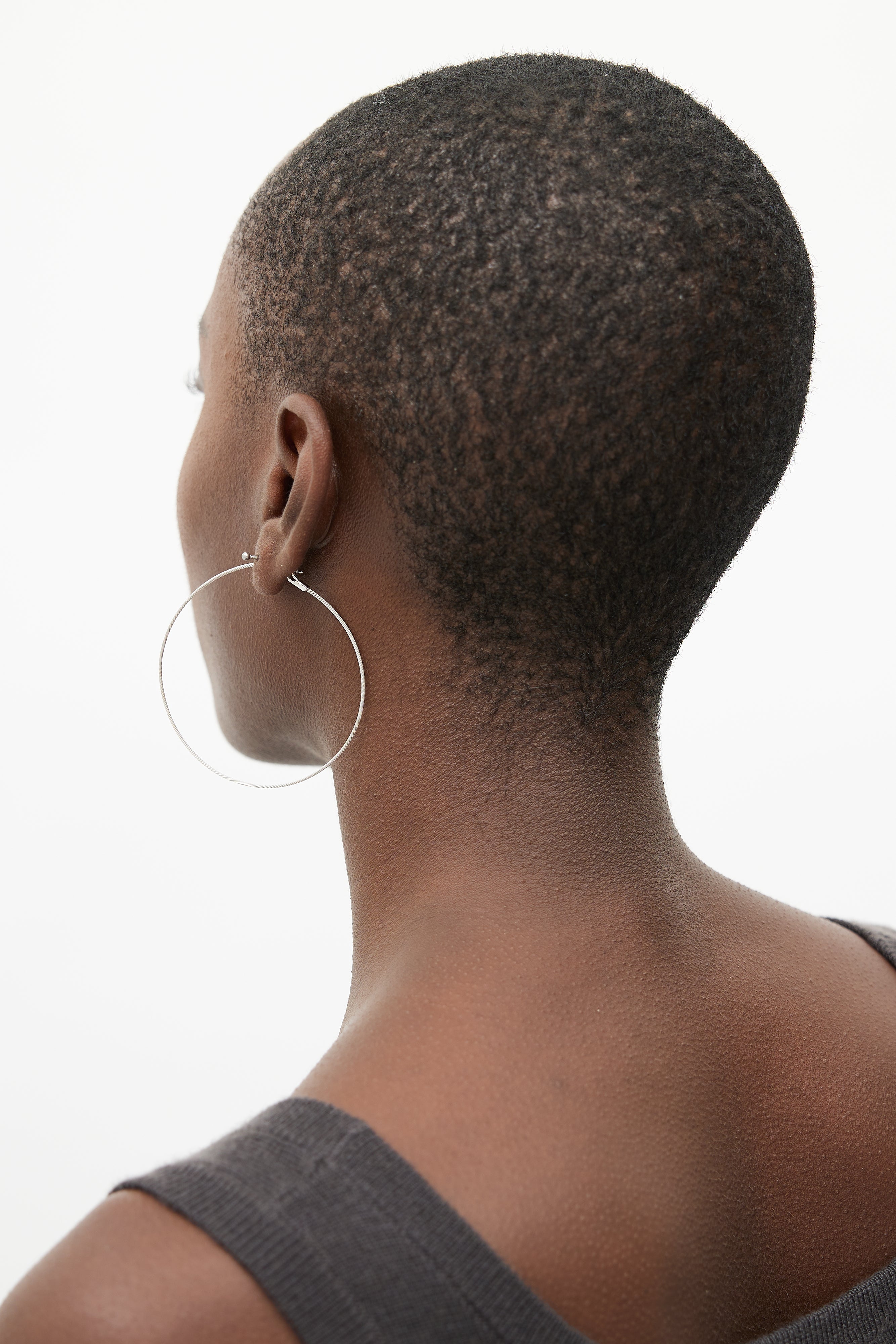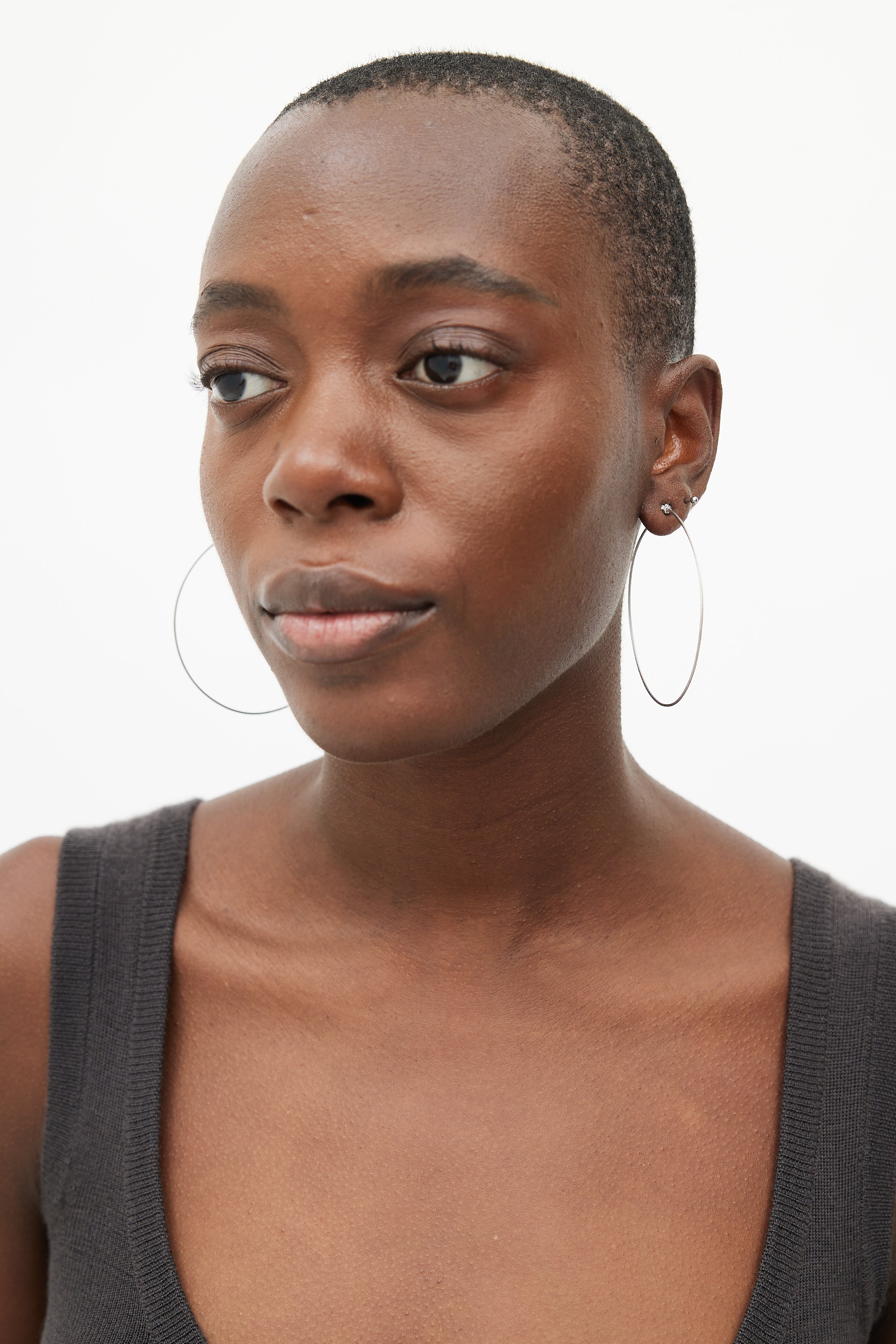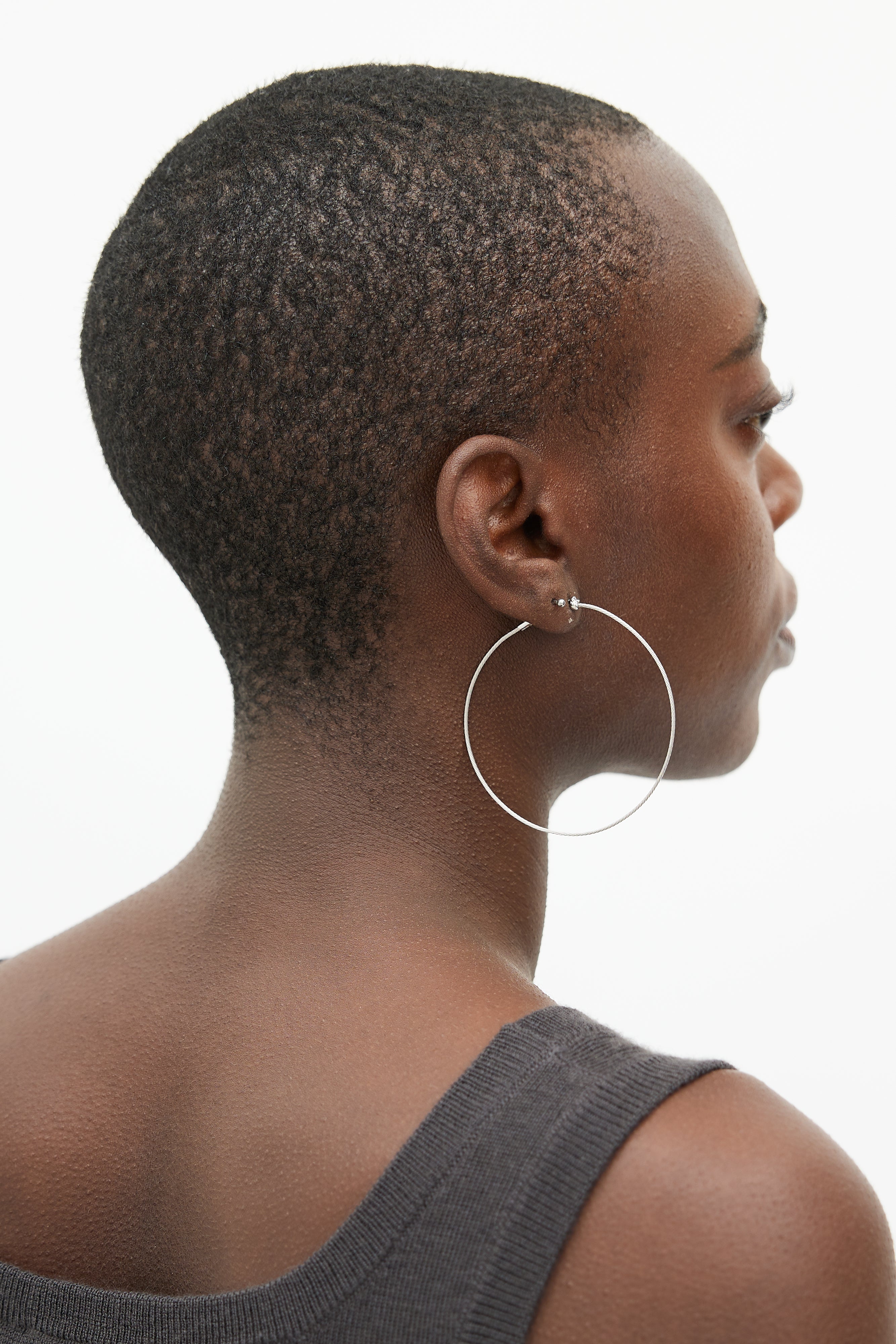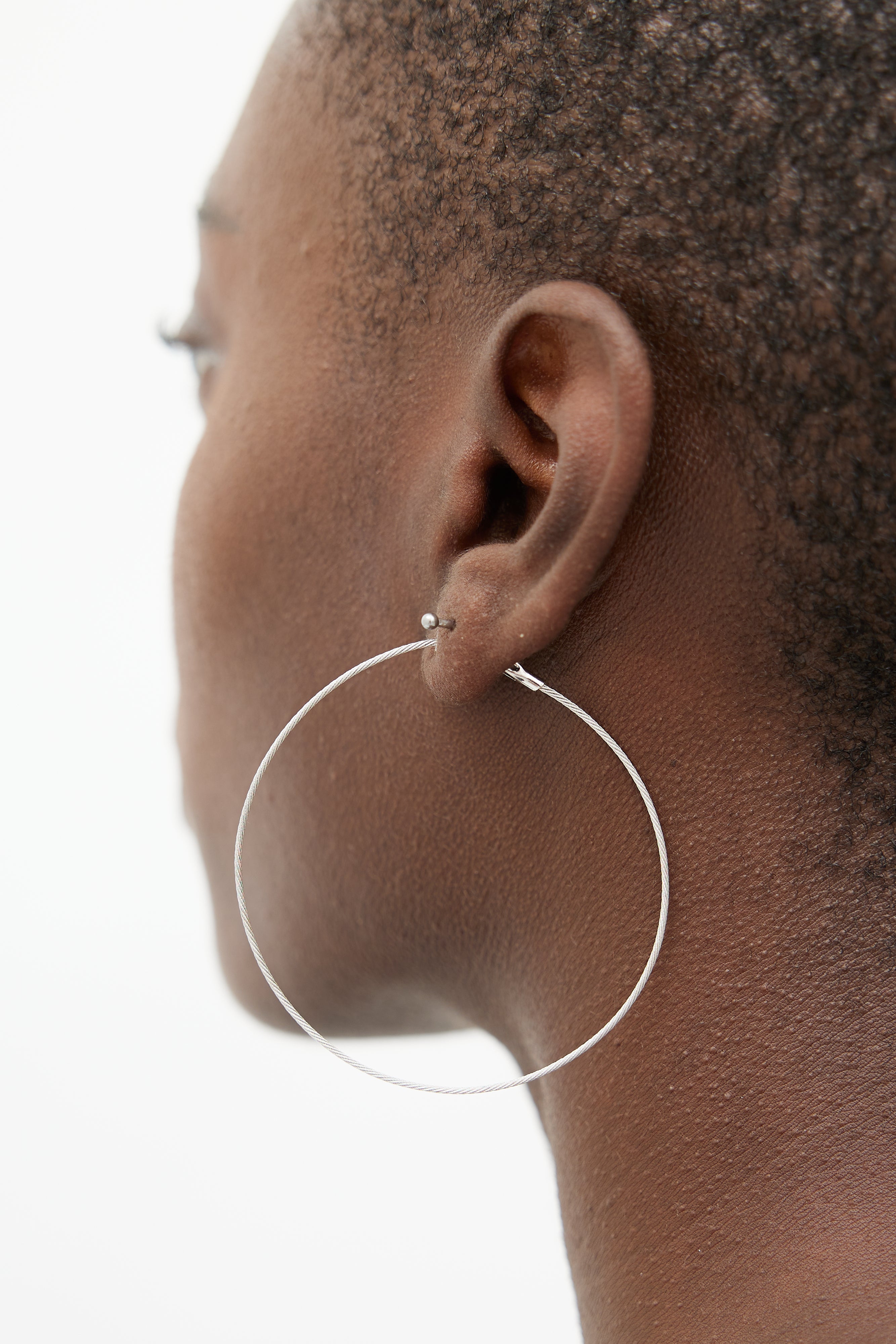 Pre-owned 18k white gold earrings featuring wire hoop, 6 round brilliant cut stud, and push back closure.