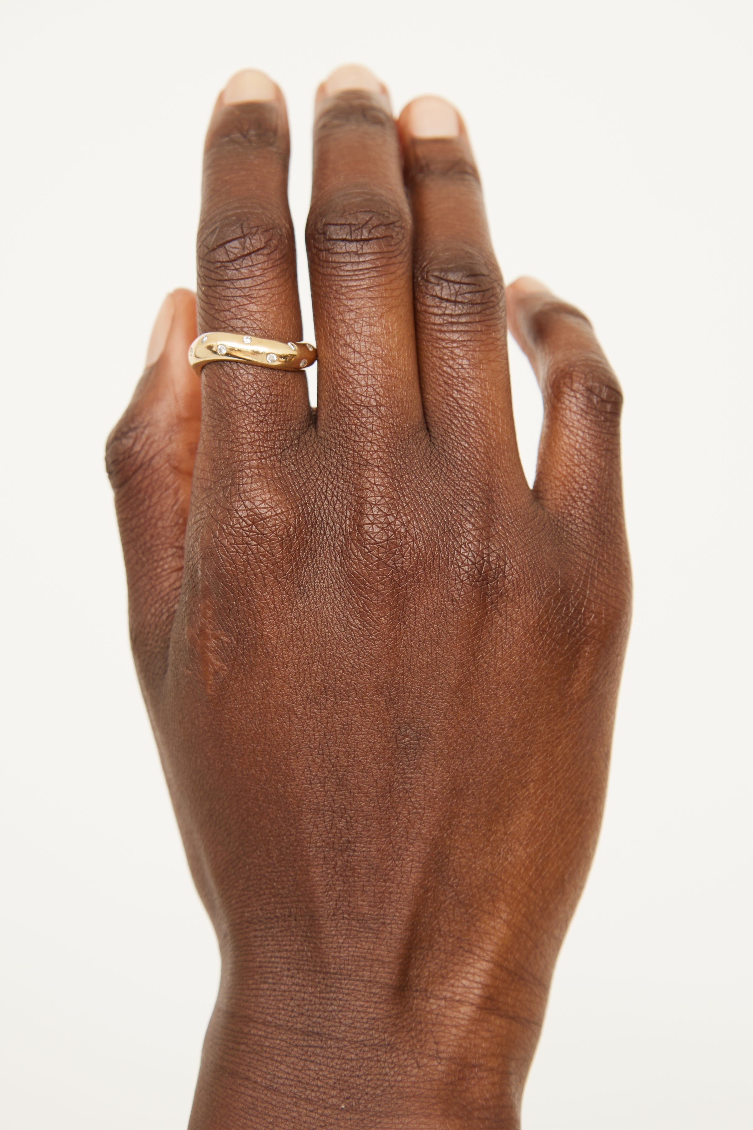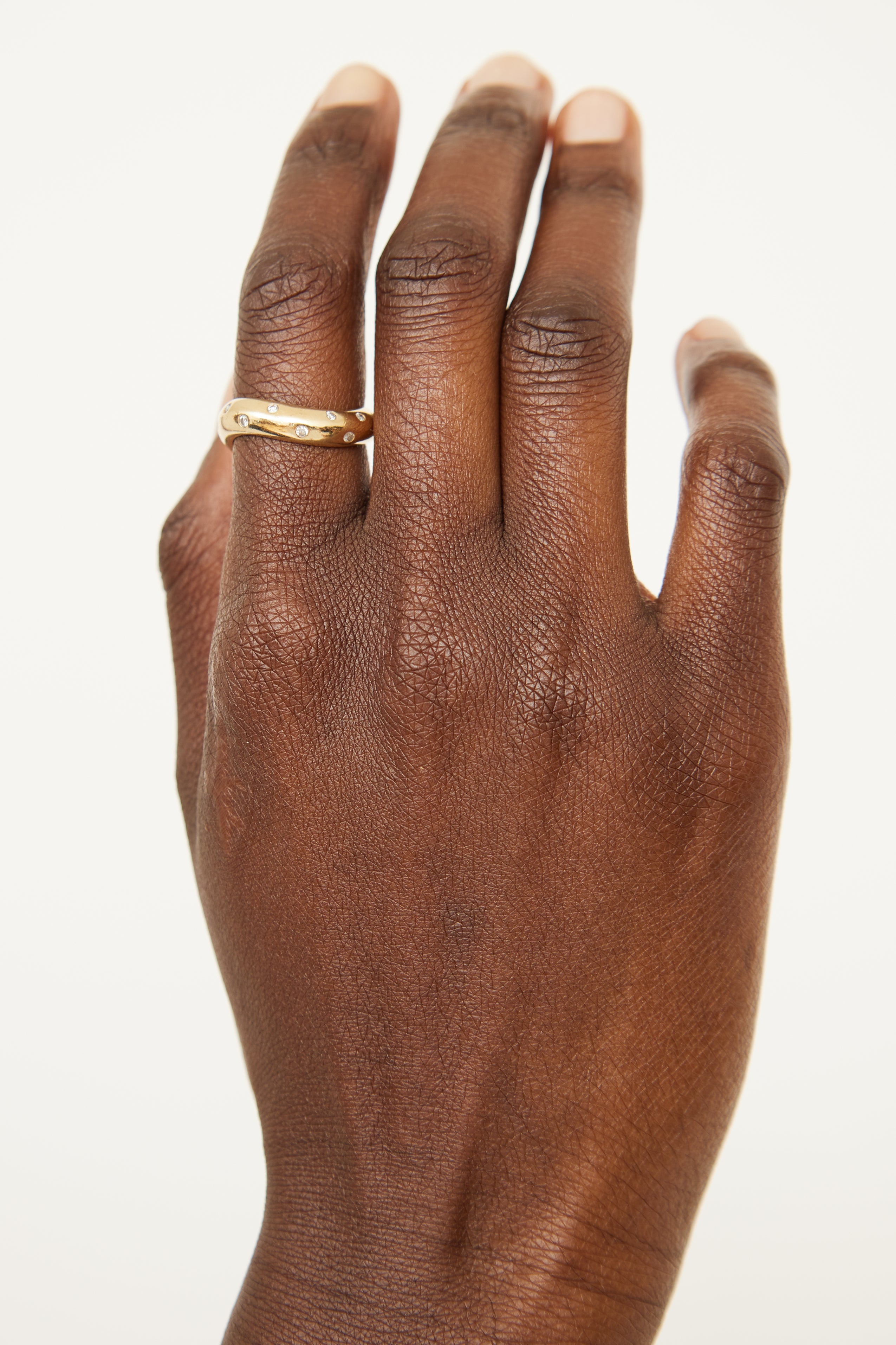 Pre-owned Fine Jewelry gold ring featuring wave band in 18K yellow gold and scattered shot set diamonds at top.