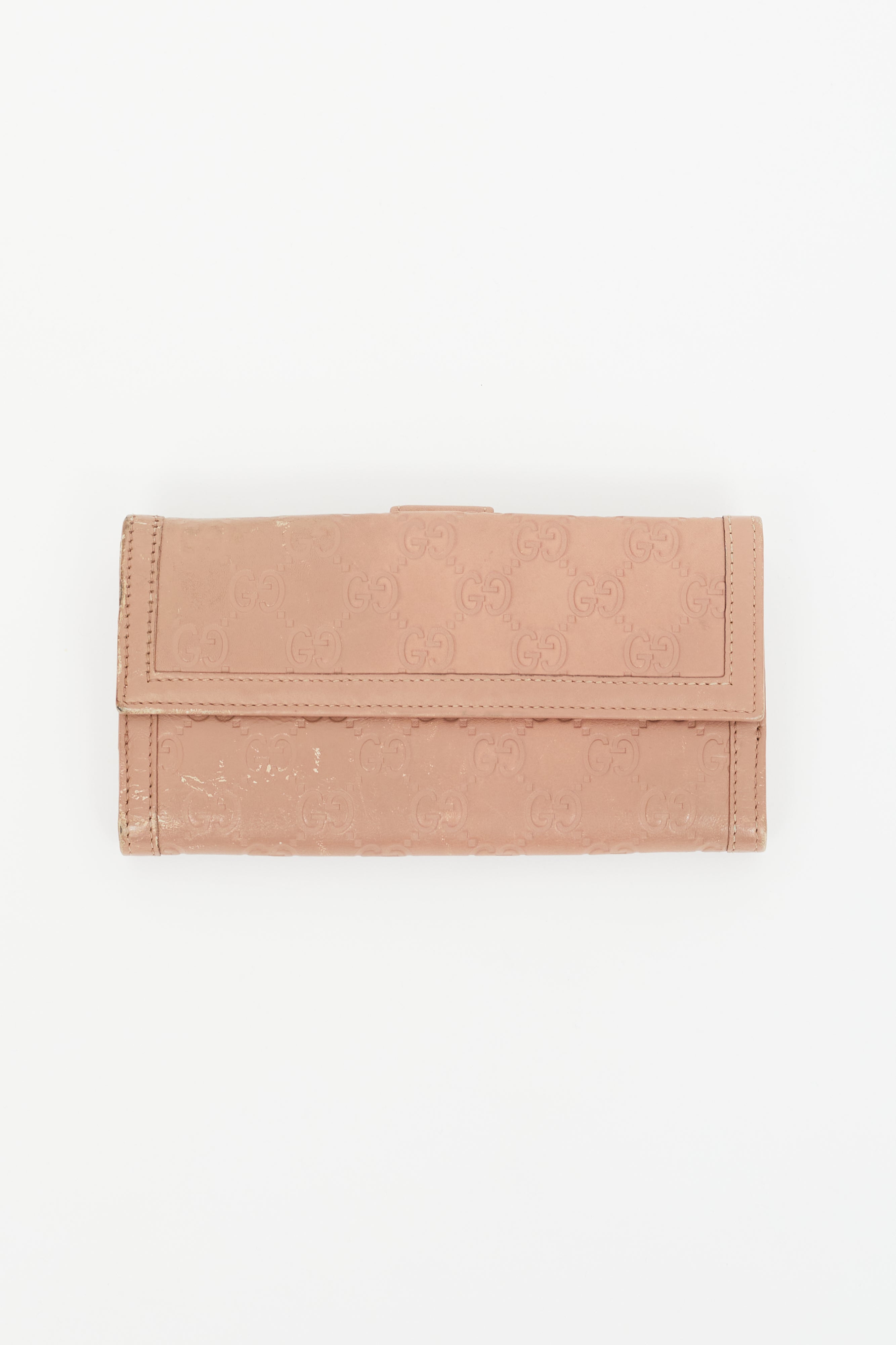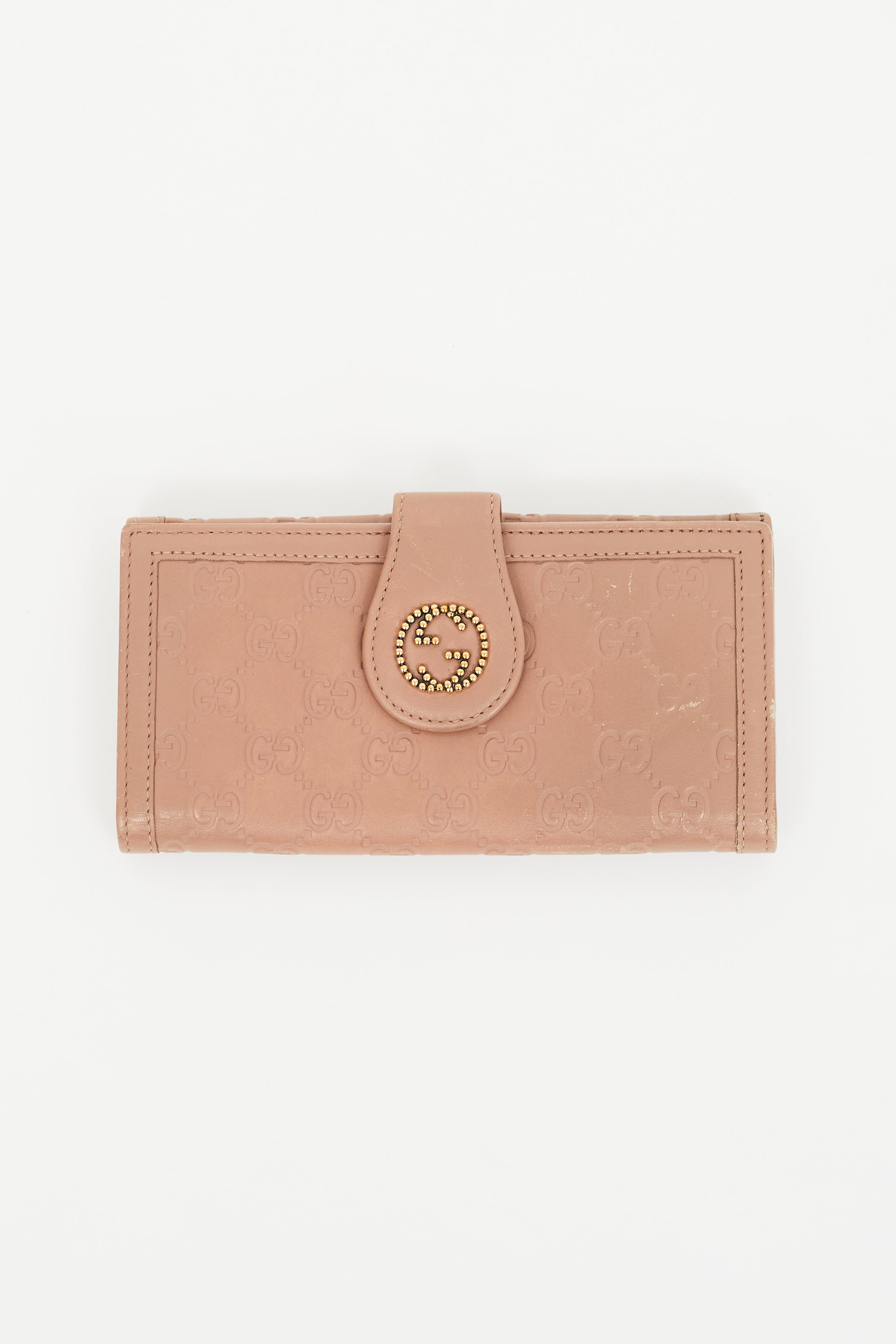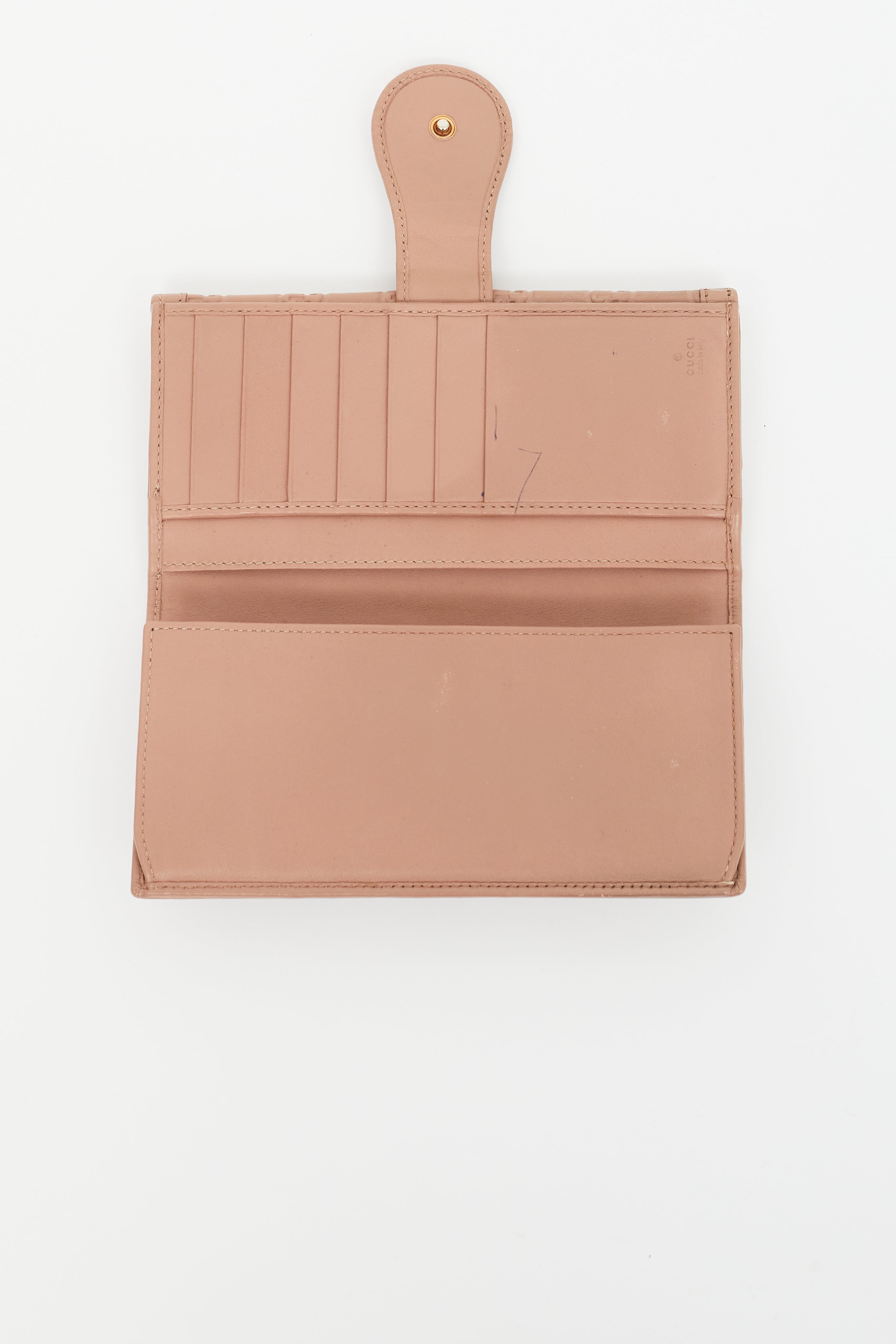 Pre-owned Gucci pink wallet featuring Guccissima monogram, gold tone GG logo at face, snap button closure, two main compartment, two slip pockets, multiple card slots, and exterior pocket with snap button closure.
