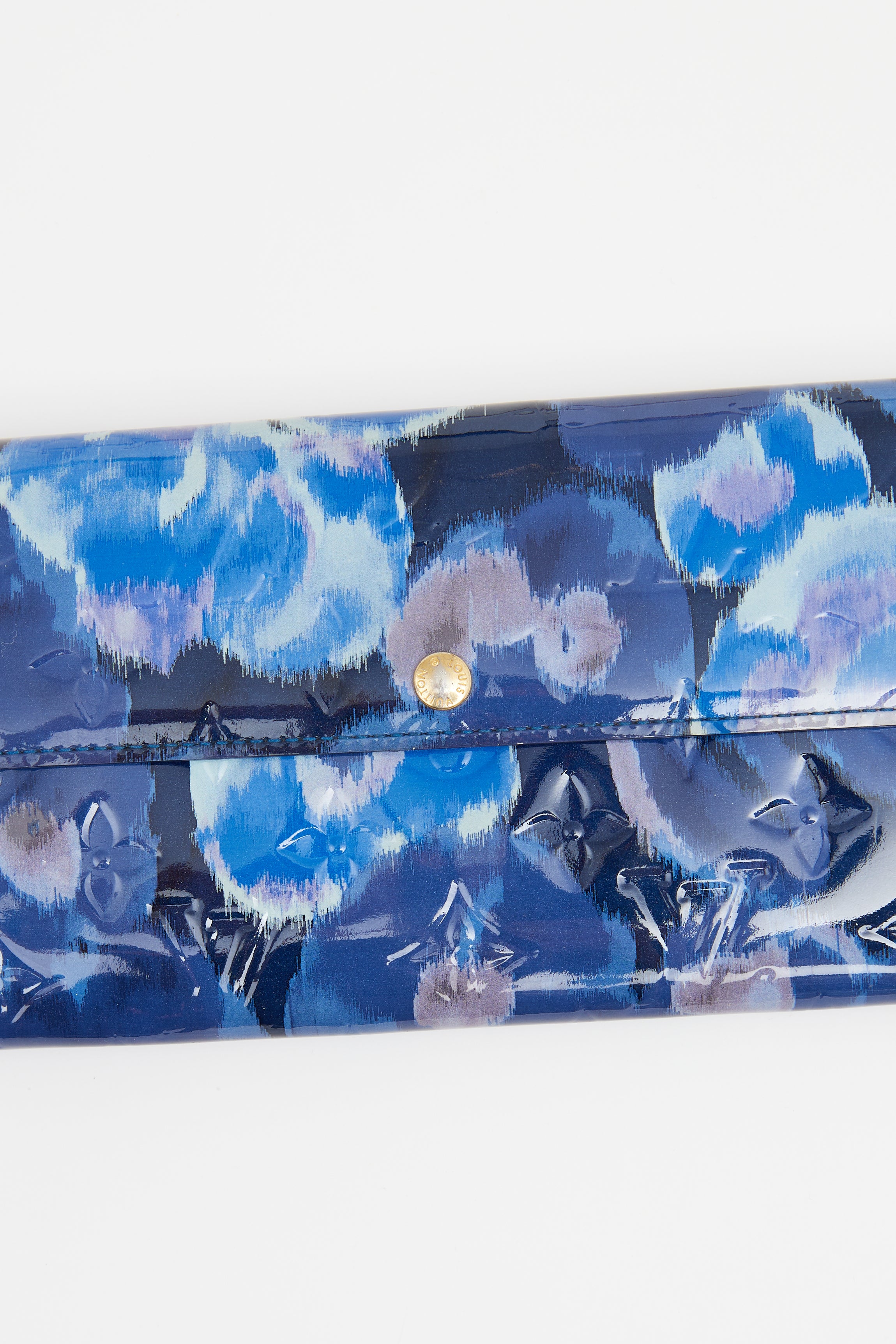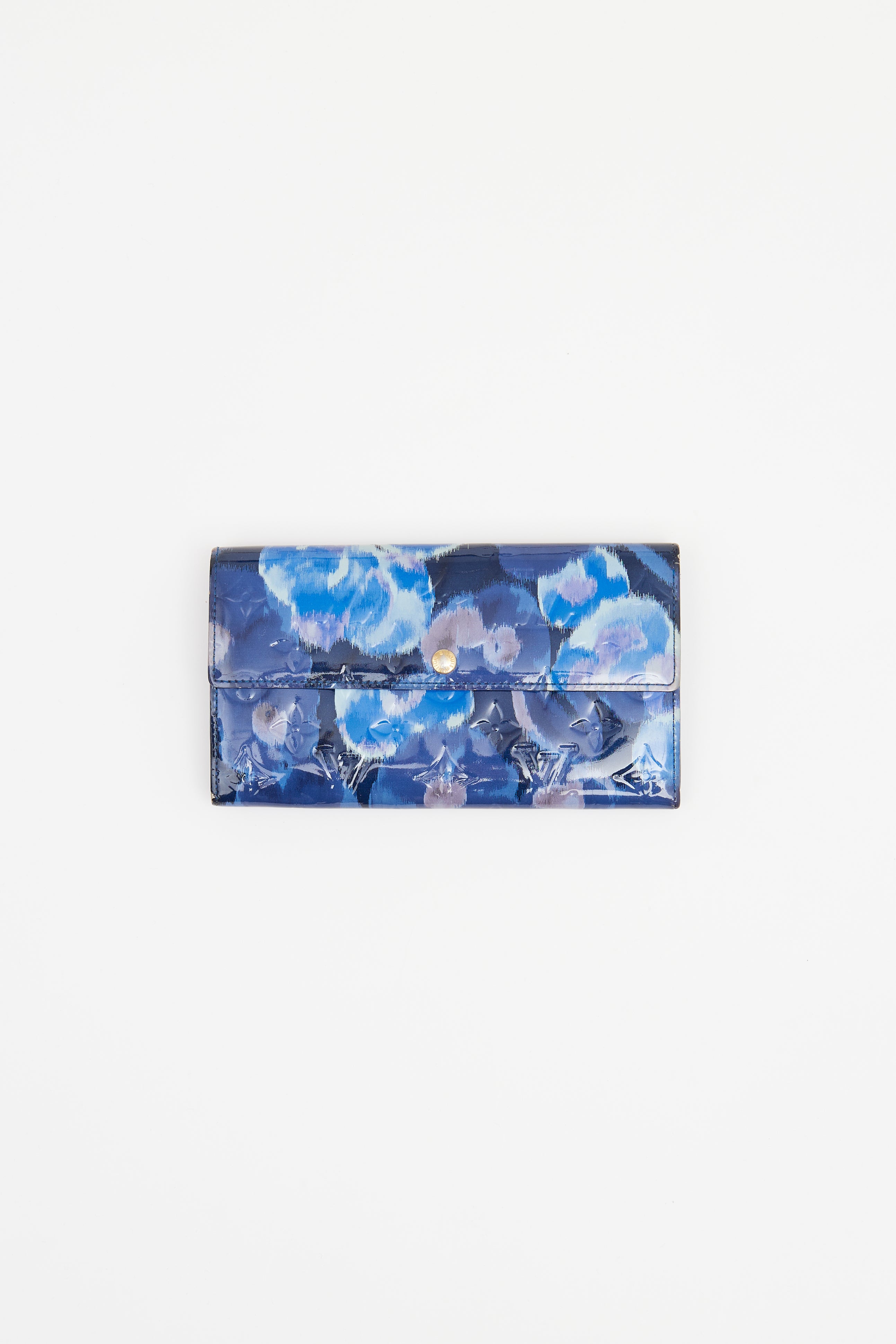 Pre-owned Louis Vuitton blue Vernis Sarah wallet featuring blue ikat style Vernis with embossed Monogram print, fold-over front flap with snap button closure, ten card holder slots, two main compartments with zipped pocket divider, one bill compartment and blue leather interior.