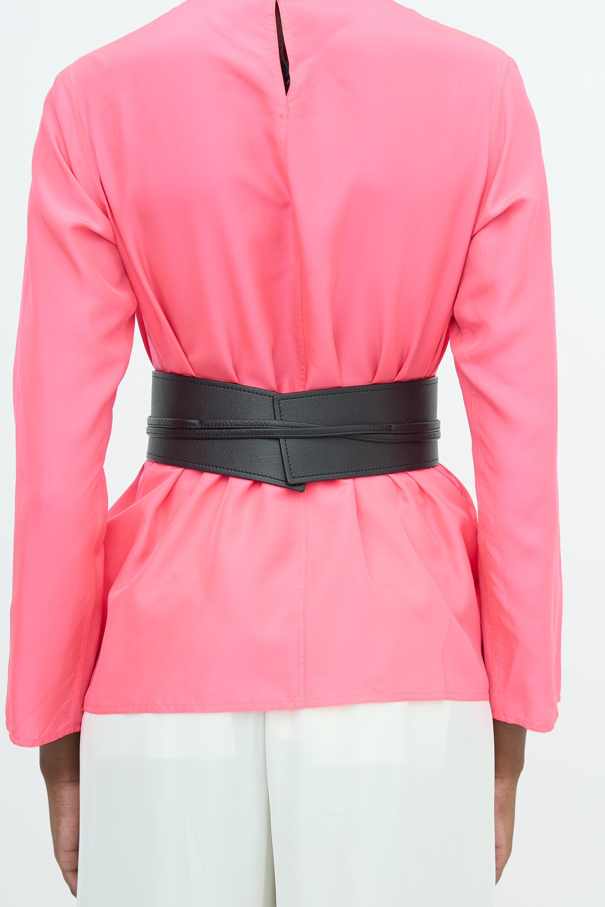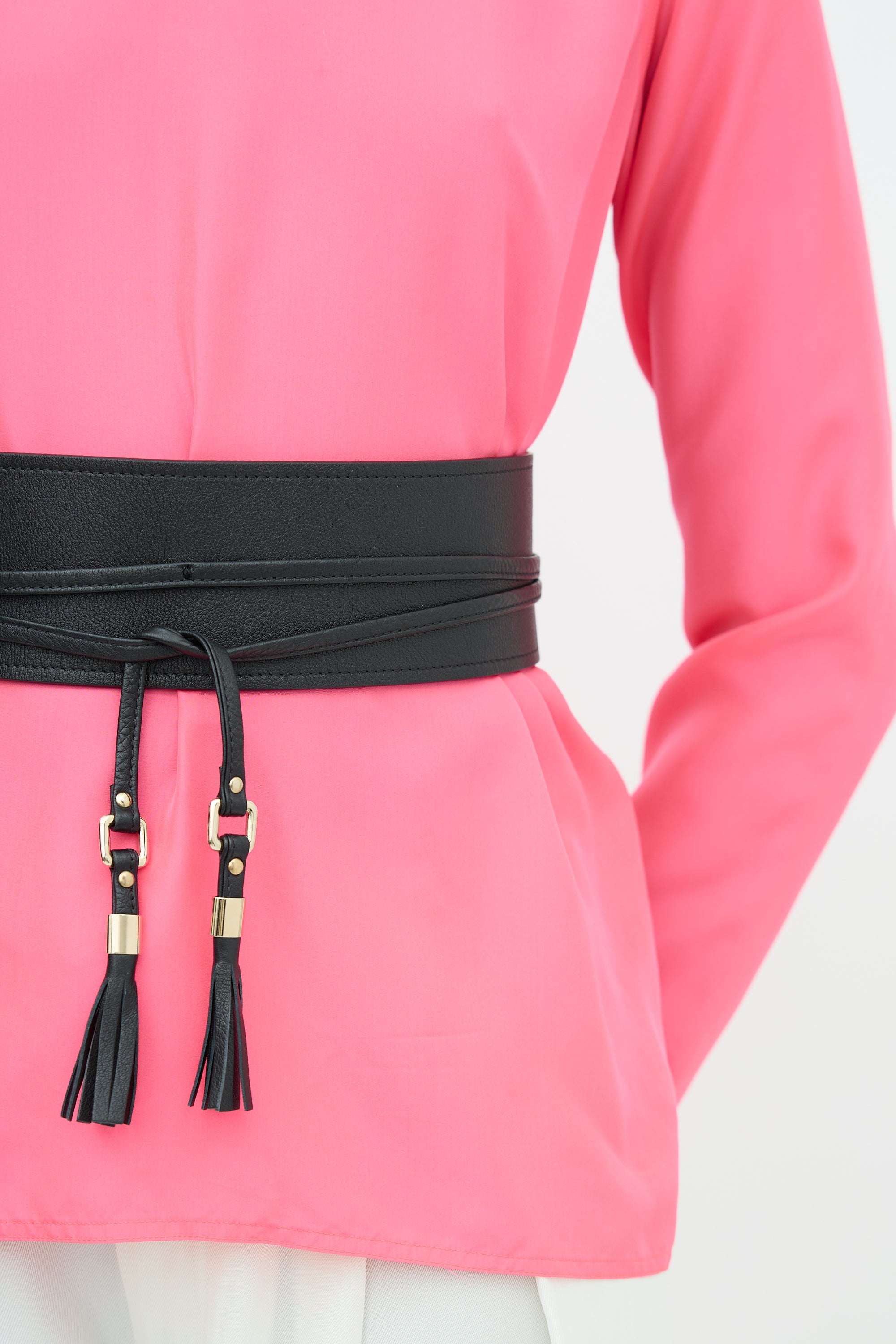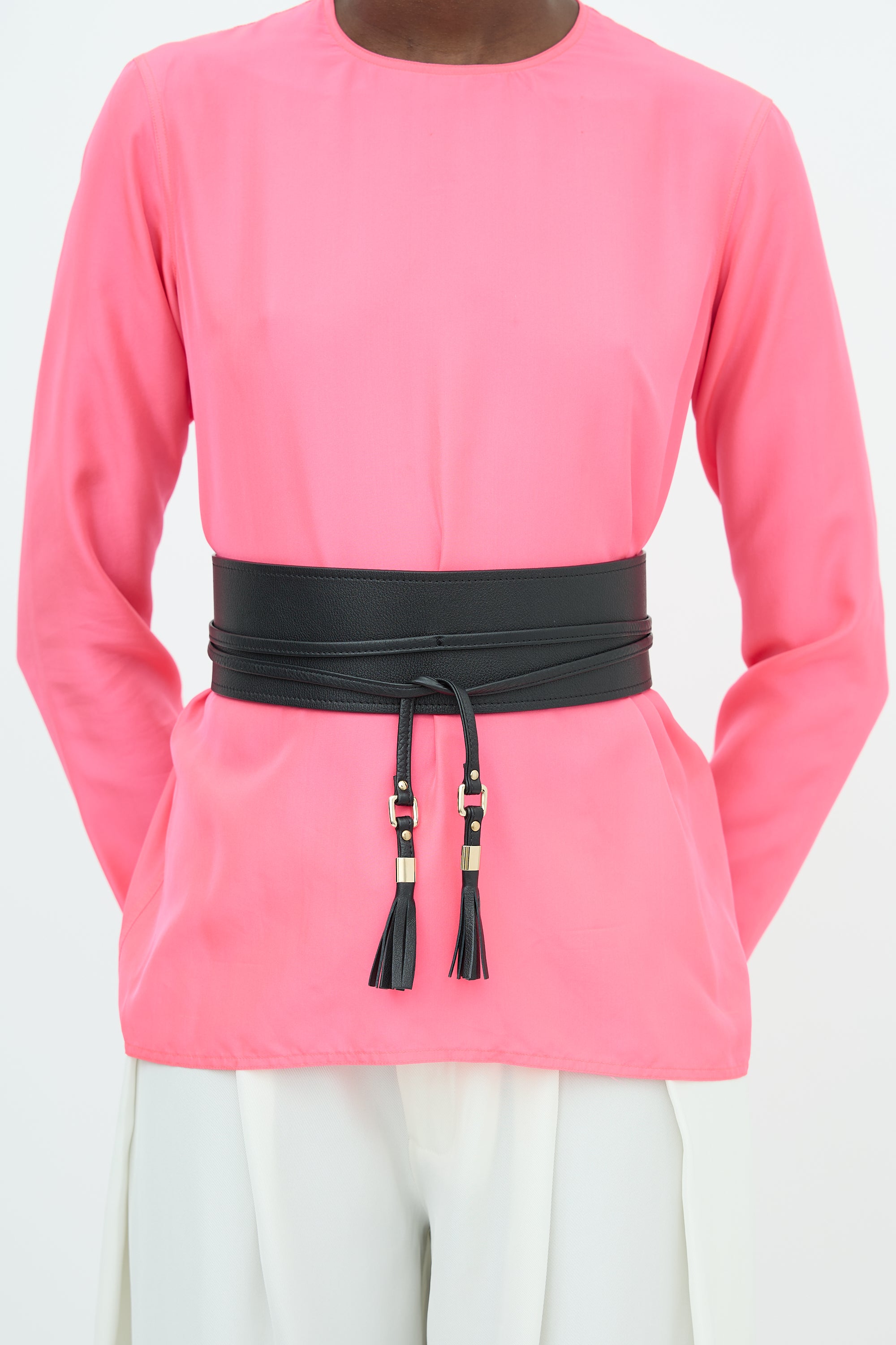 Pre-owned Max Mara black leather Elia wide belt featuring wrap design, tie closure with tassel ends, and logo stamp at reverse.