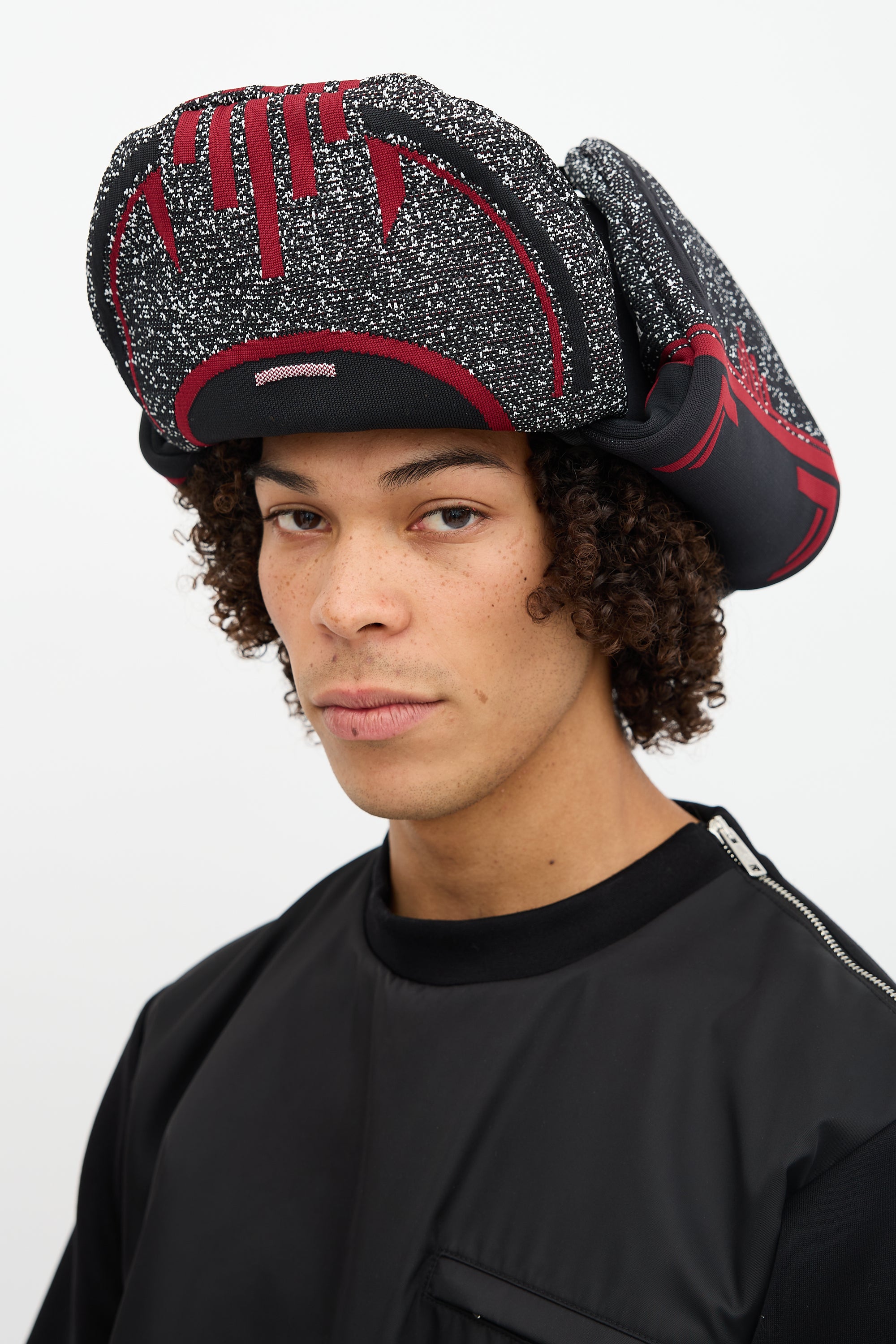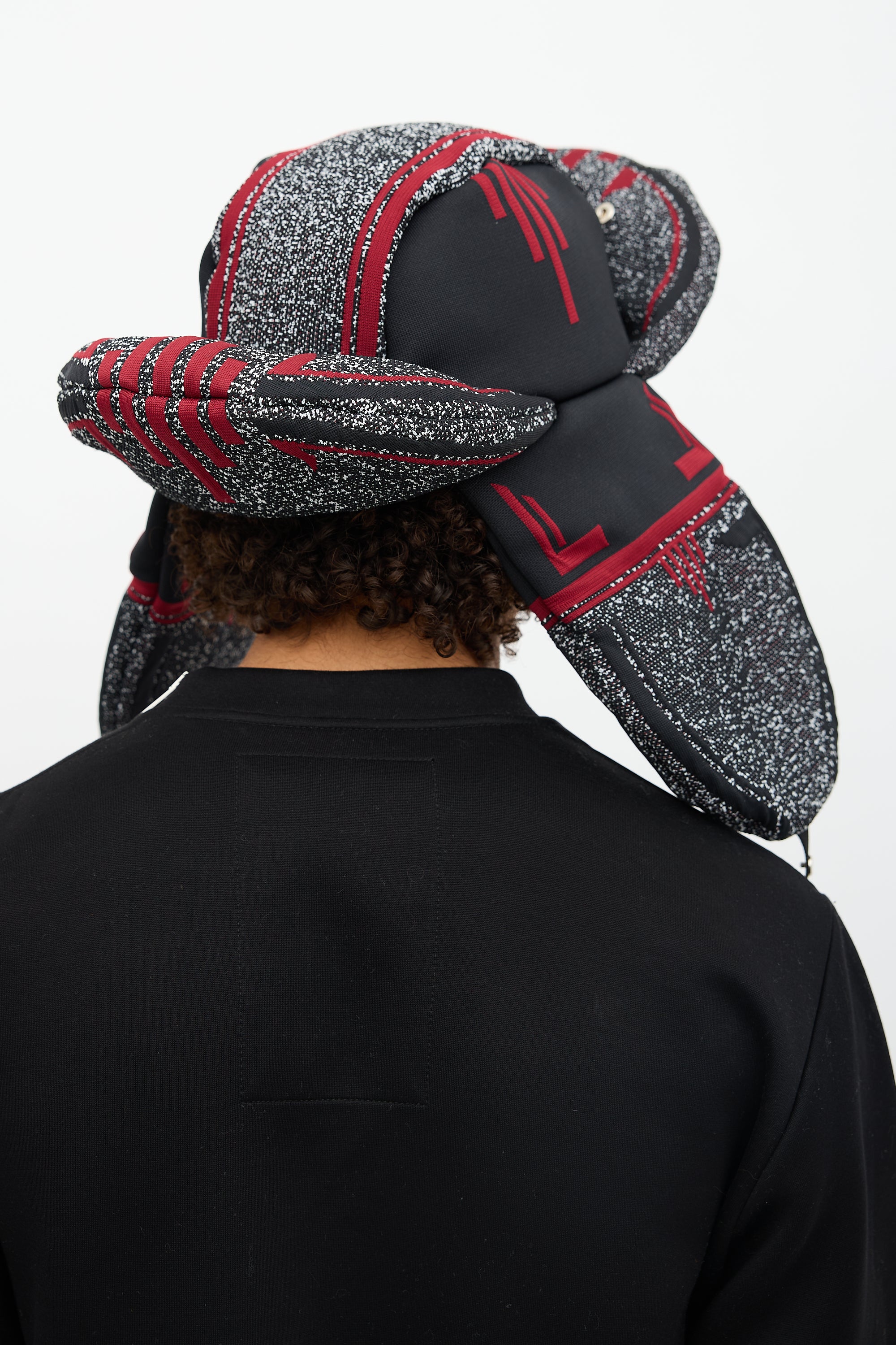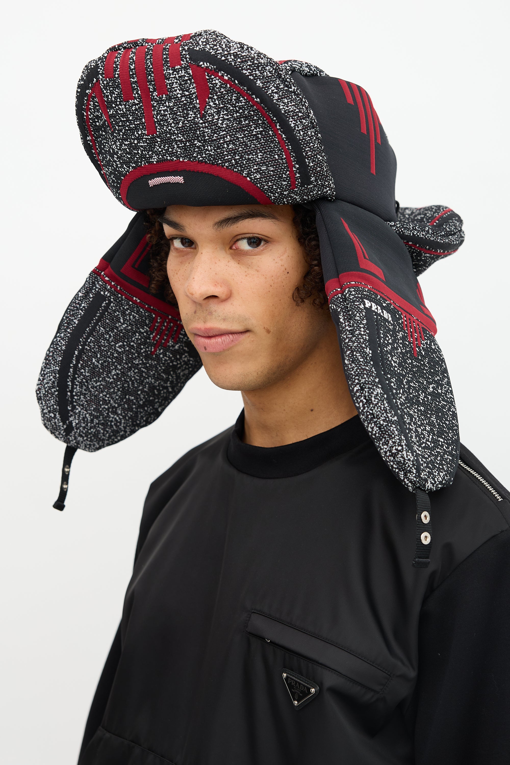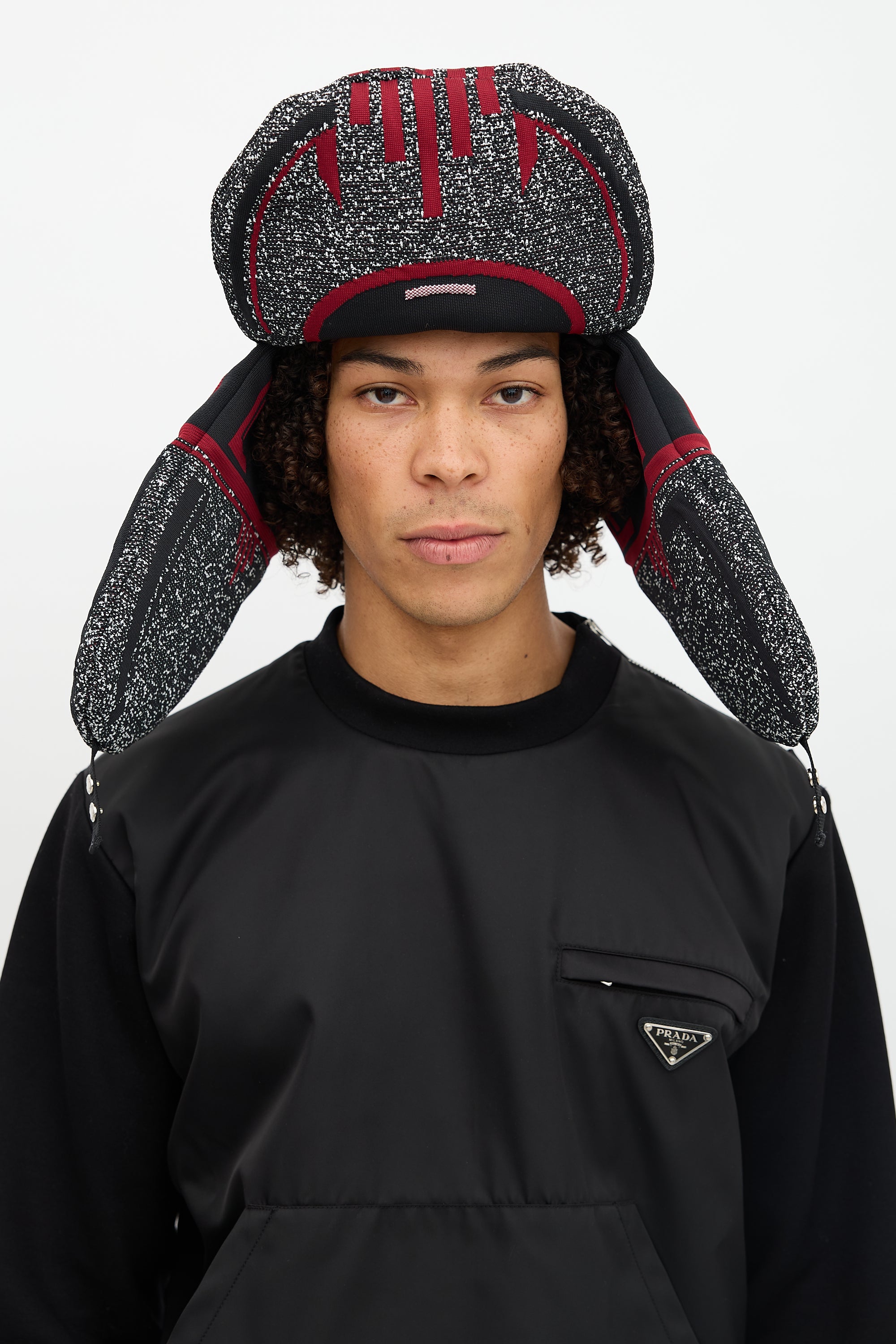 Pre-owned Prada 2019 black, white, and burgundy jacquard trapper hat featuring drawcord brim, four flaps, adjustable chin strap, and interior grosgrain brim lining. Lined.