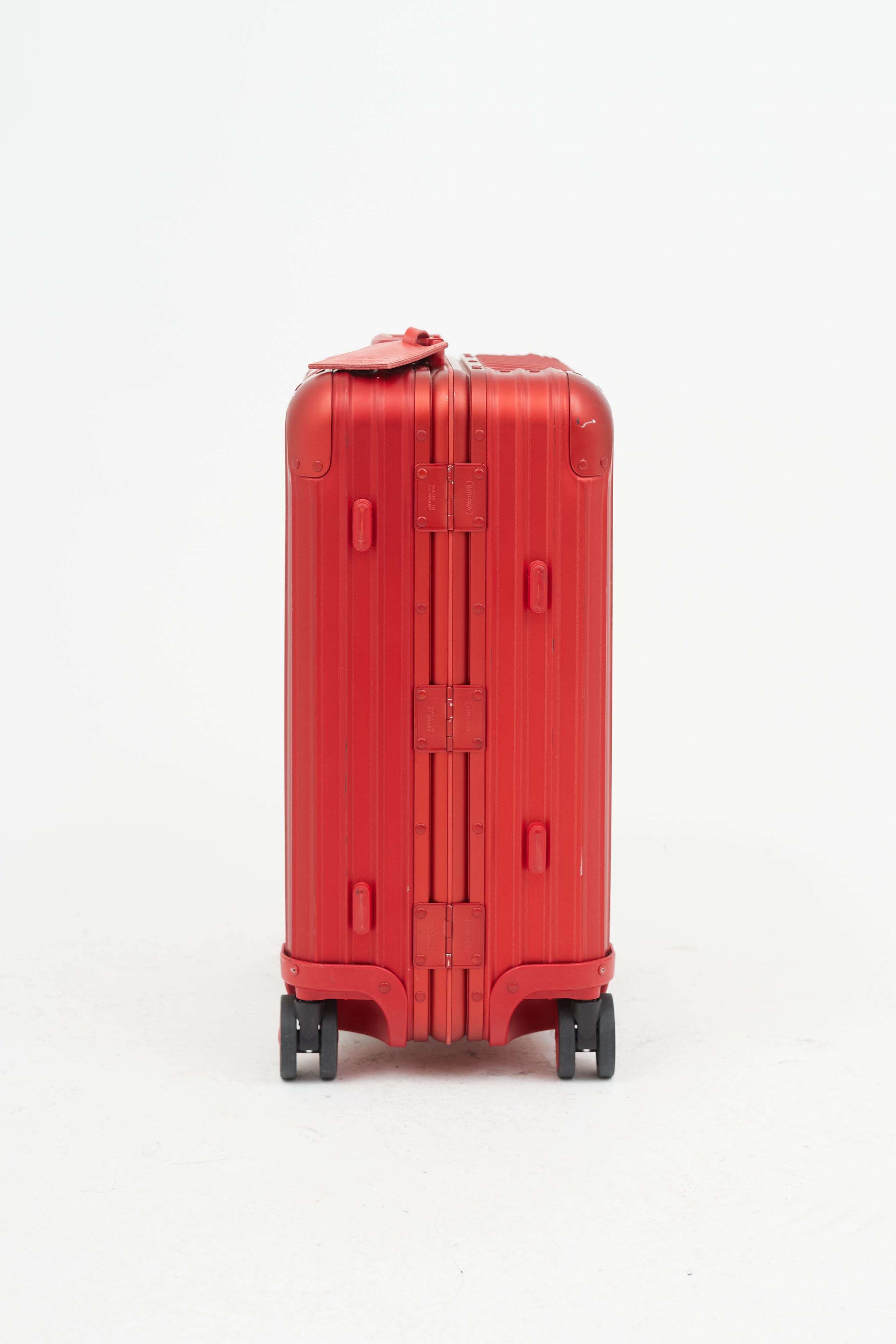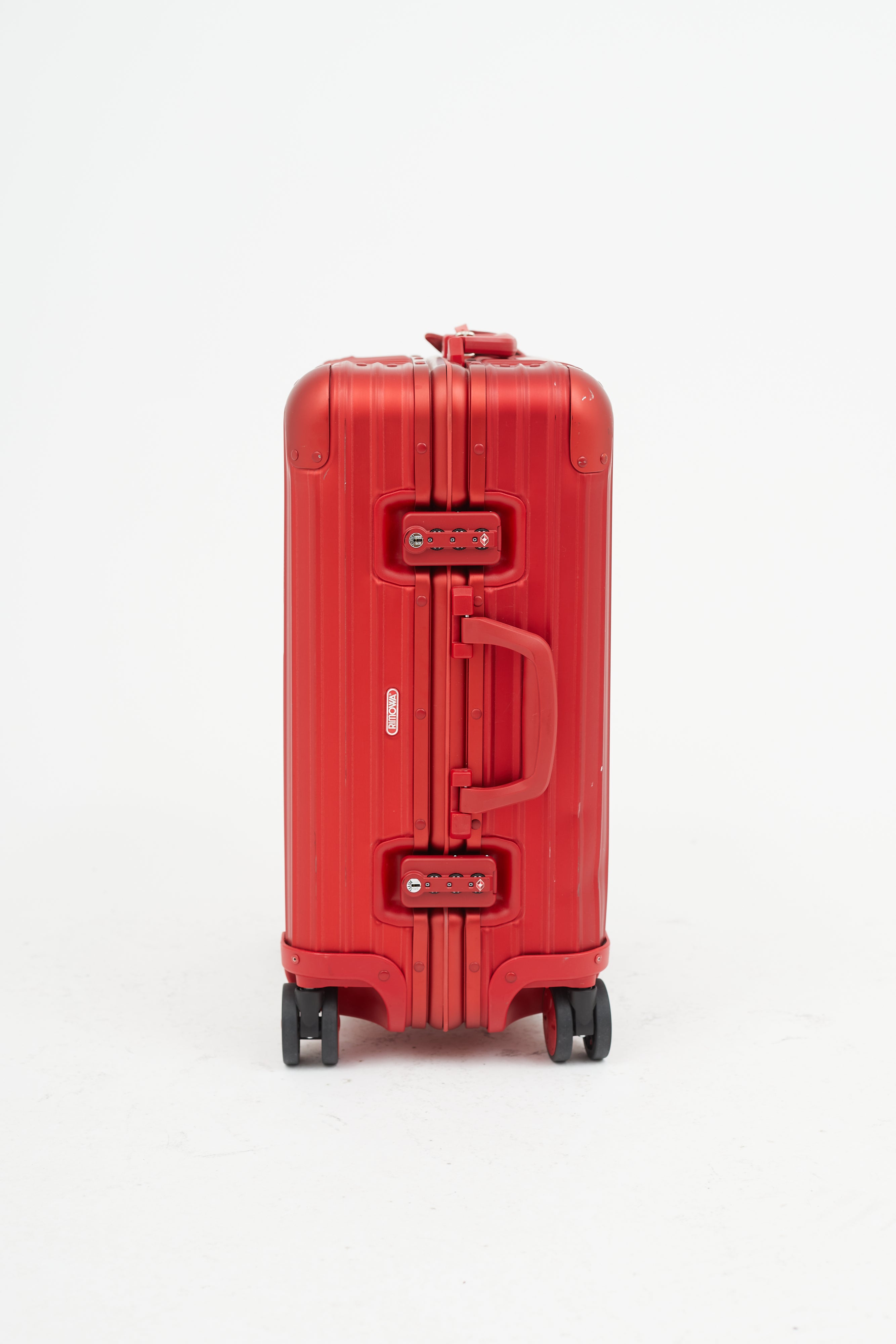 Pre-owned Rimowa x Supreme red hard case luggage featuring a white supreme logo at front, aluminum body, four Multiwheel rolling wheels at bottom, two TSA combination locks at side, push-top plastic handle bar, one plastic tonal top handle with removable identification keychain, two removable internal Flex-Divider storage system's with two zip pockets, and tonal Supreme logo print interior. Comes with one tonal Supreme logo print dust bag.
