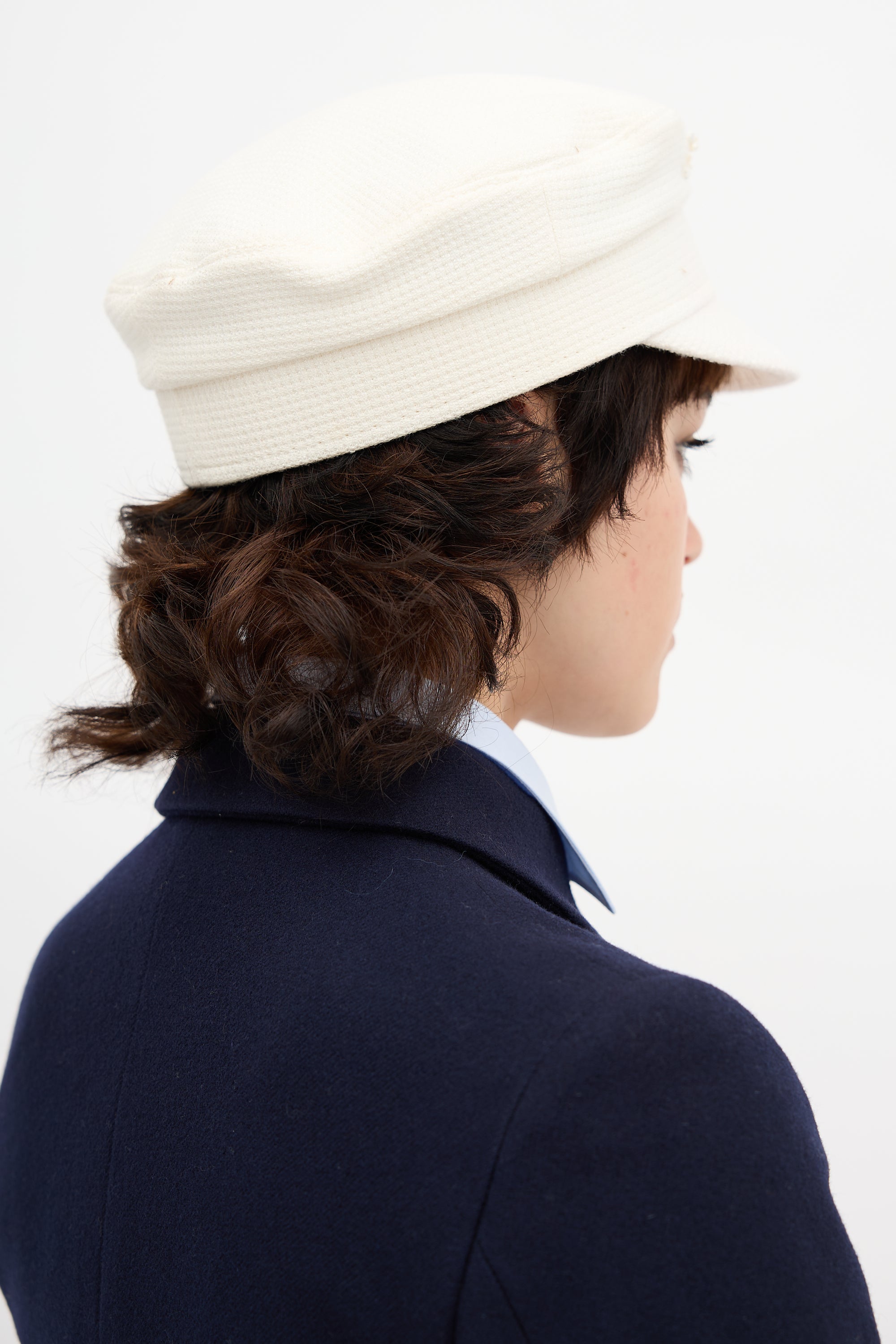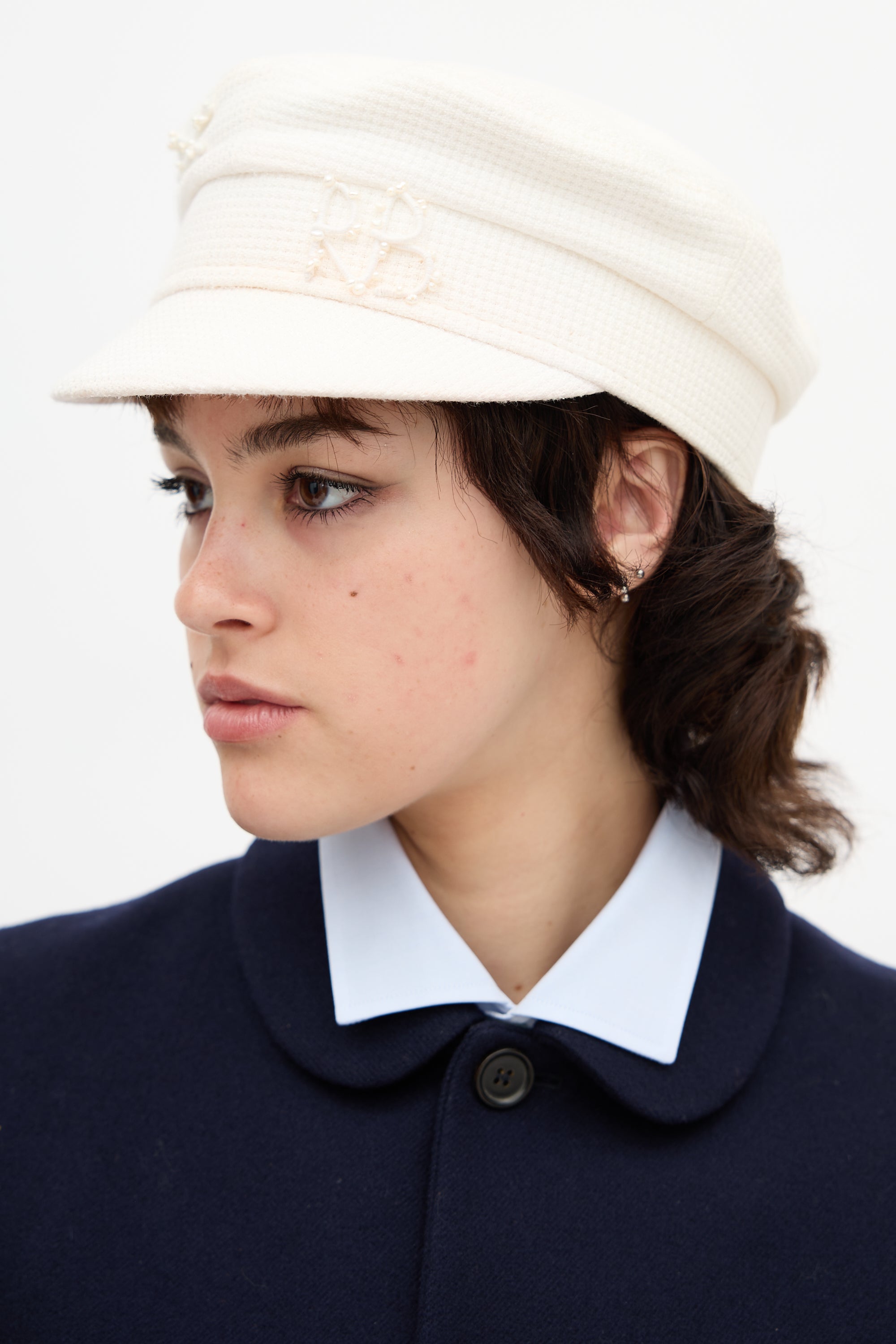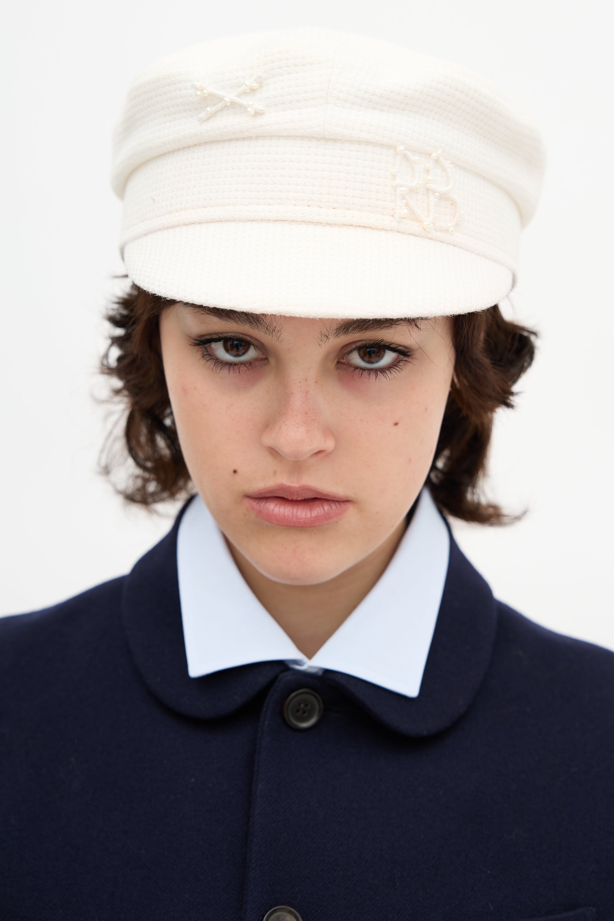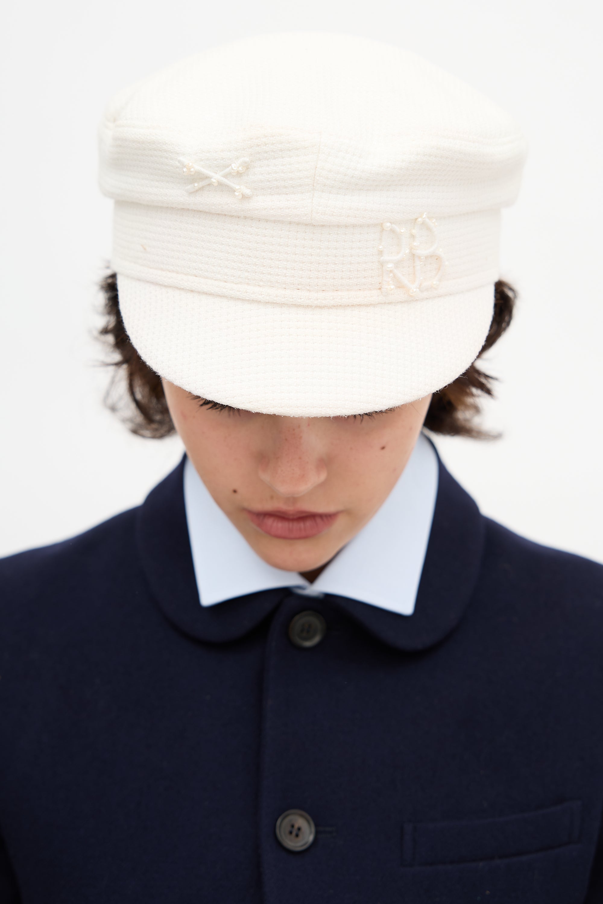 Pre-owned Ruslan Baginskiy cream textured Baker Boy hat featuring rounded brim, tonal pearl embroidered "X" motif and initials at front, and structured band. Lined.