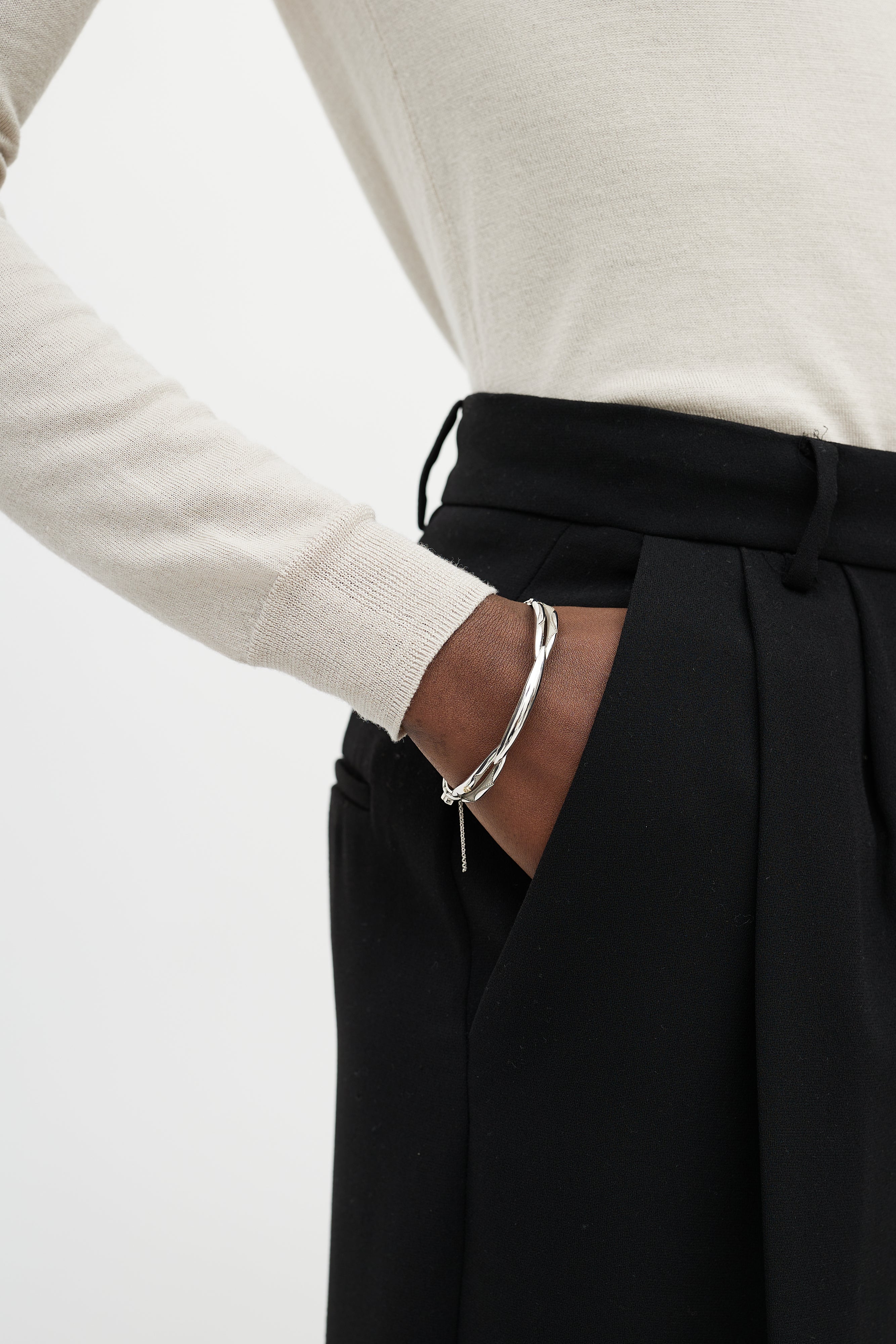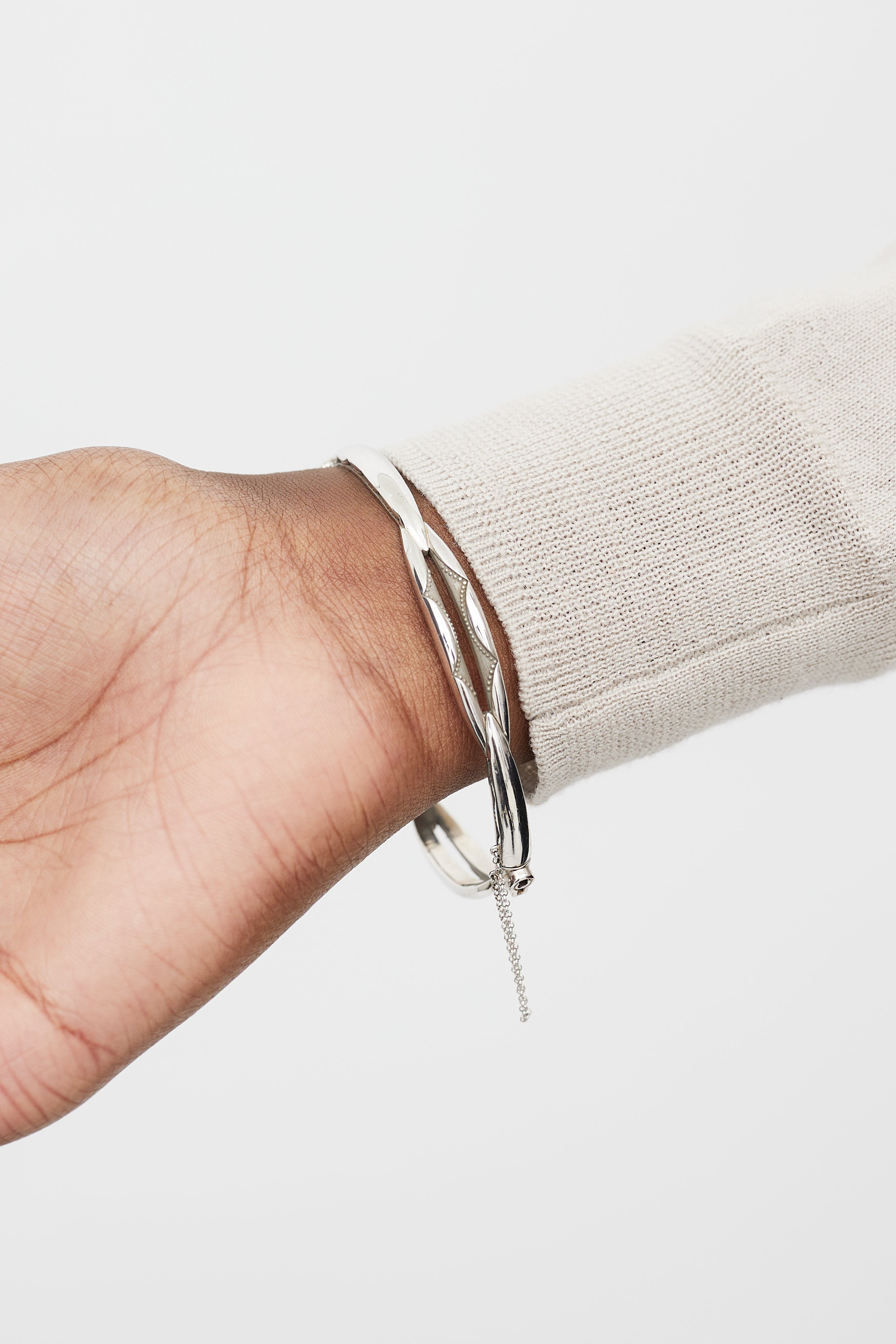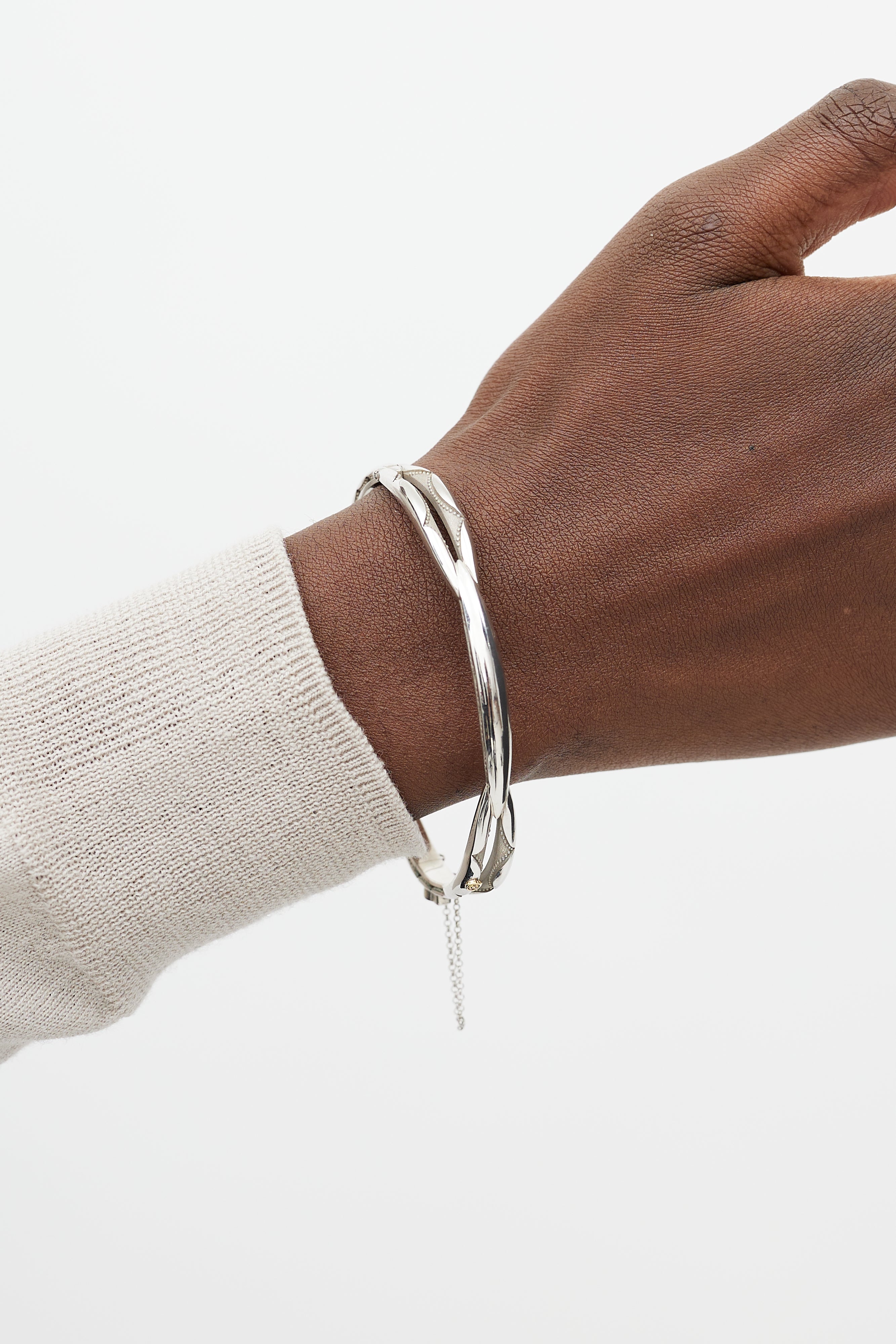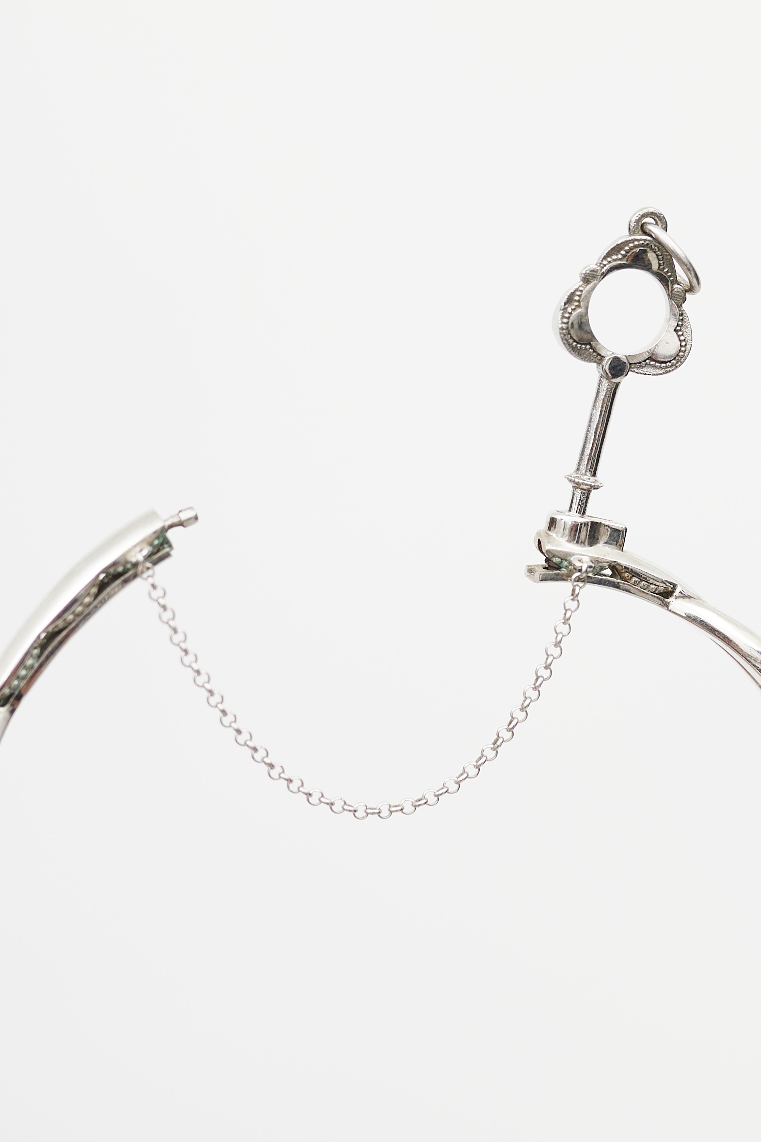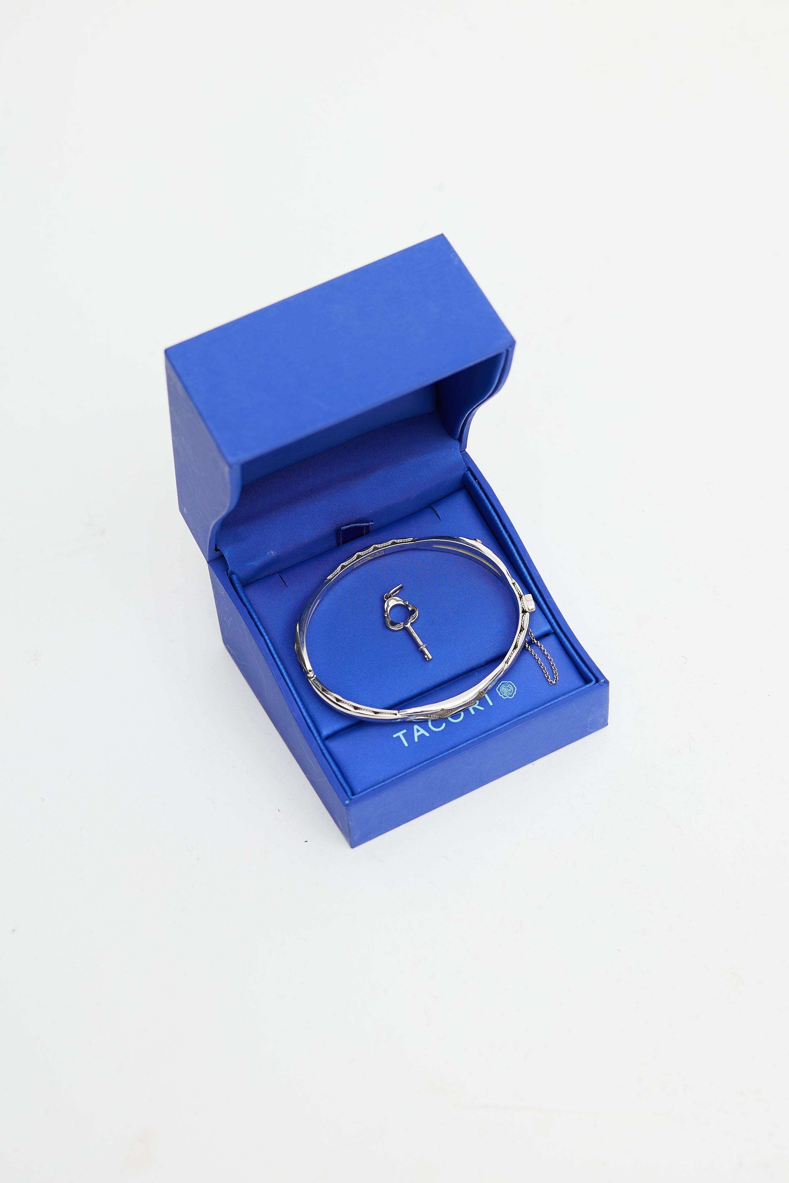 Pre-owned Tacori silver Promise bracelet featuring 18K gold accent, geometric motif, and hinge closure with key. Comes with original dust bag and box.