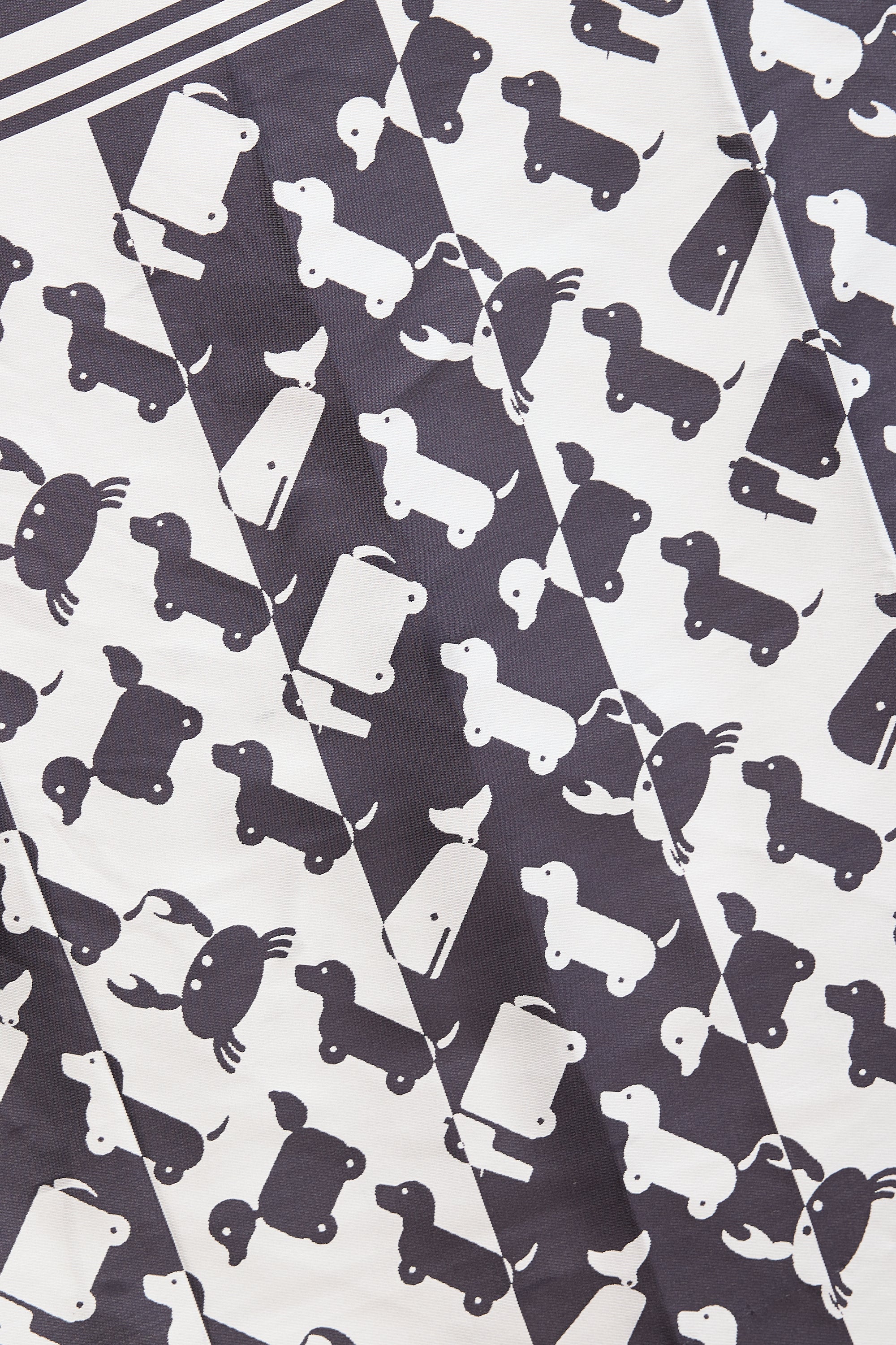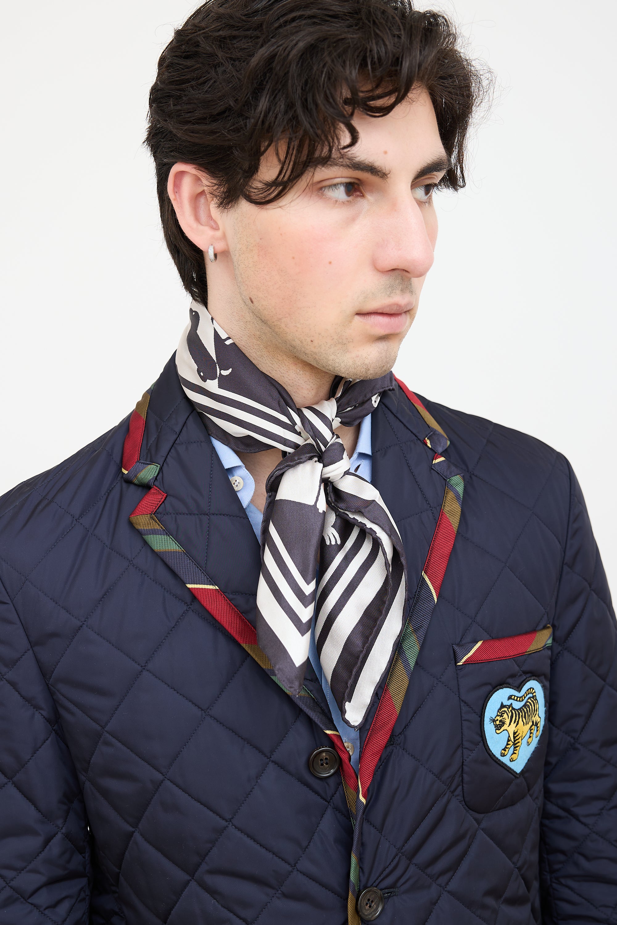 Pre-owned Thom Browne blue and silver silk scarf featuring jacquard Hector, whale, crab and animal motifs throughout, hand rolled edges and striped border.