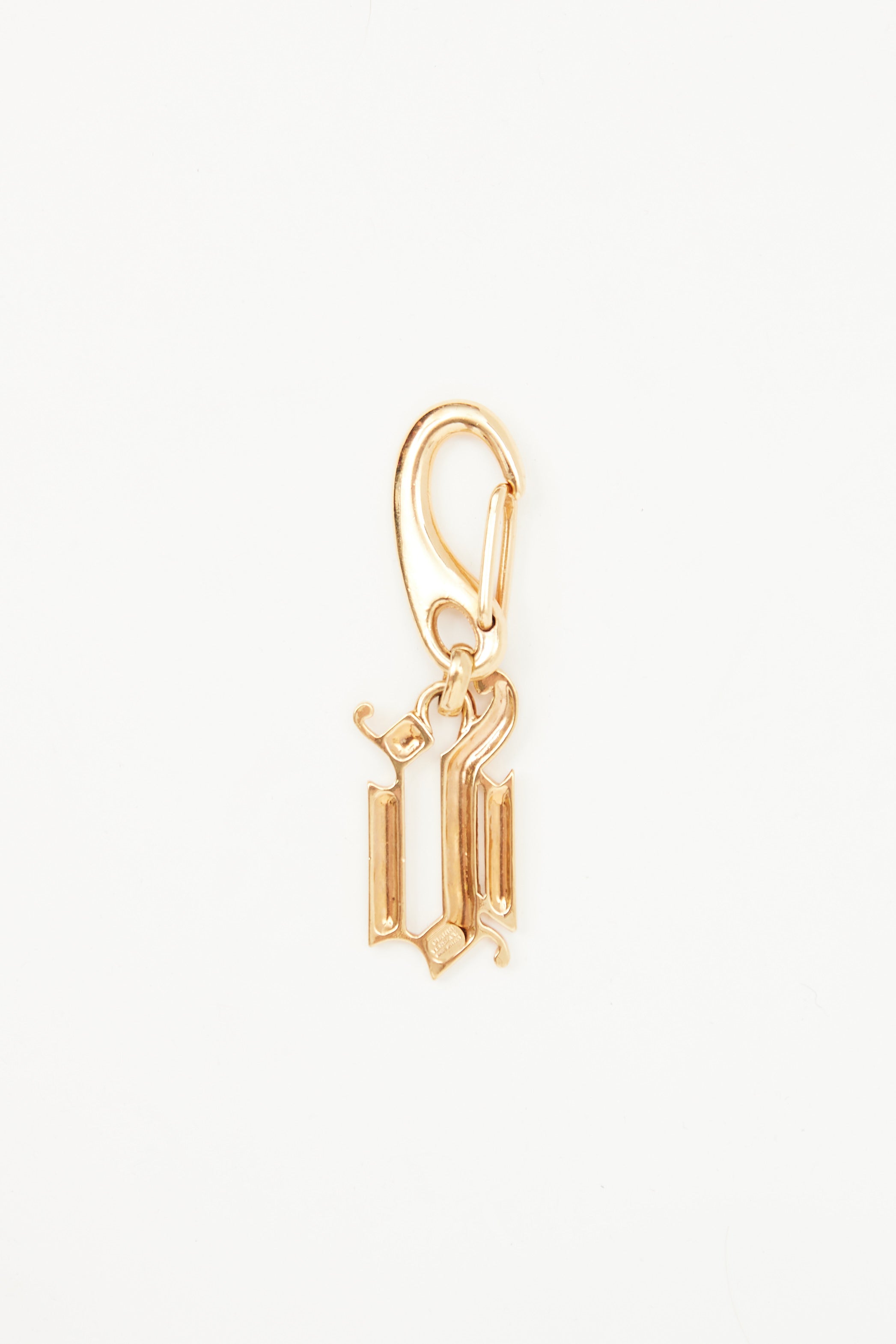 Pre-owned Versace gold tone 2003 gothic V keychain featuring V drop pendant and clasp key ring.