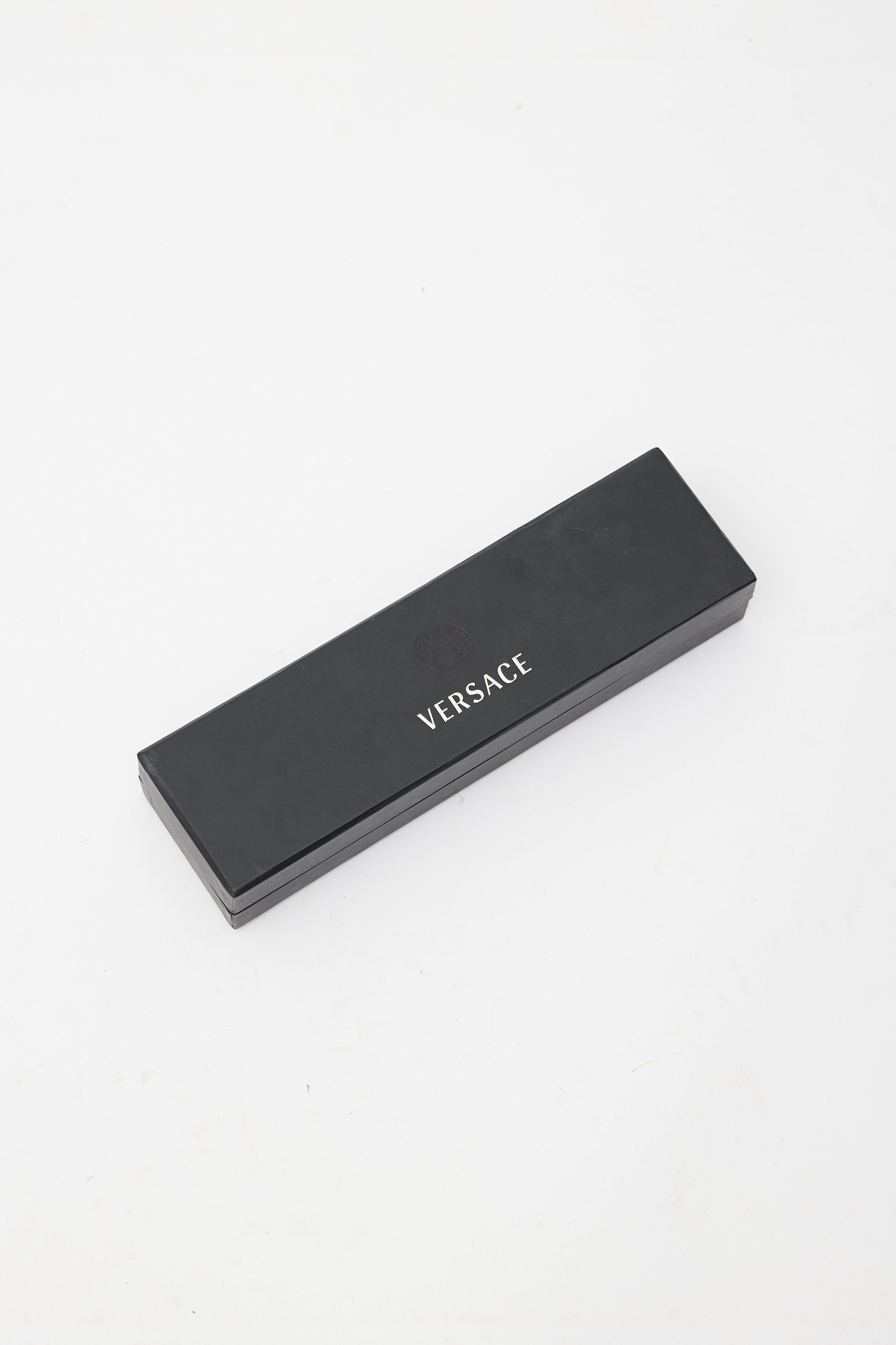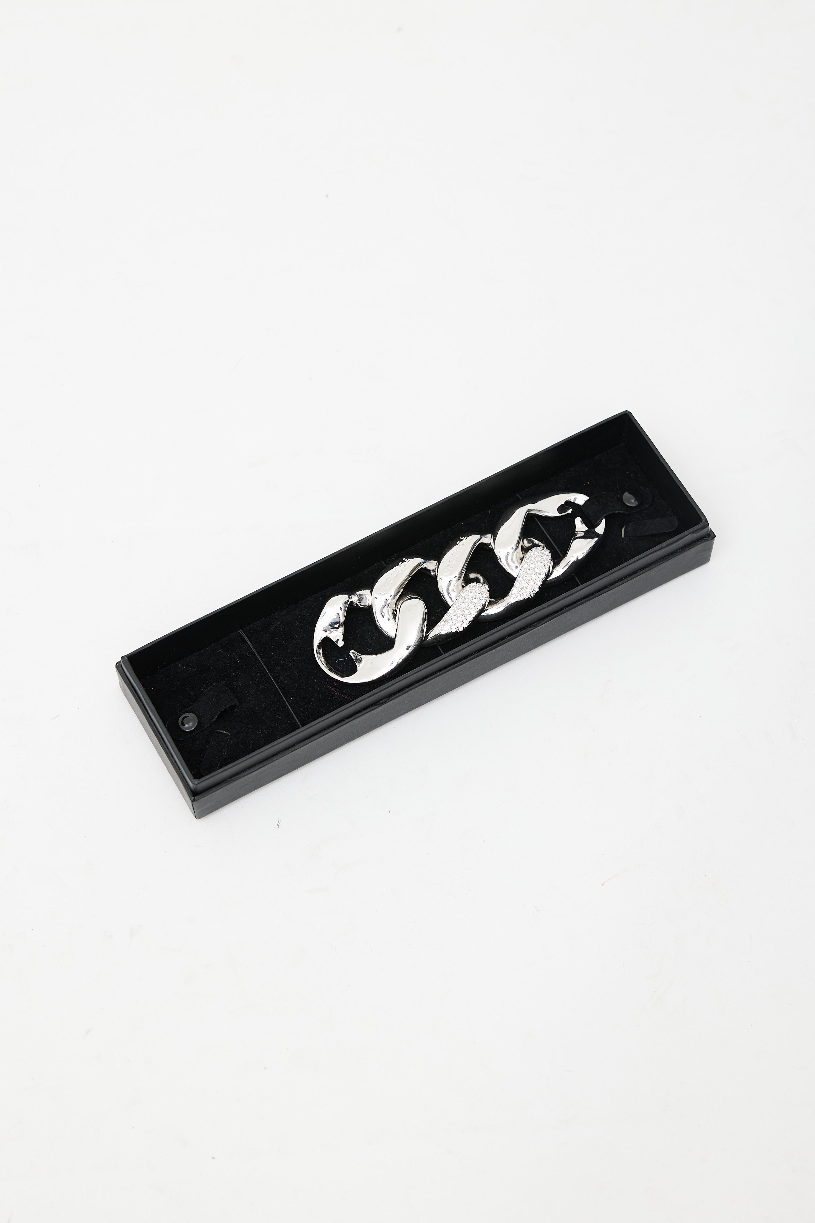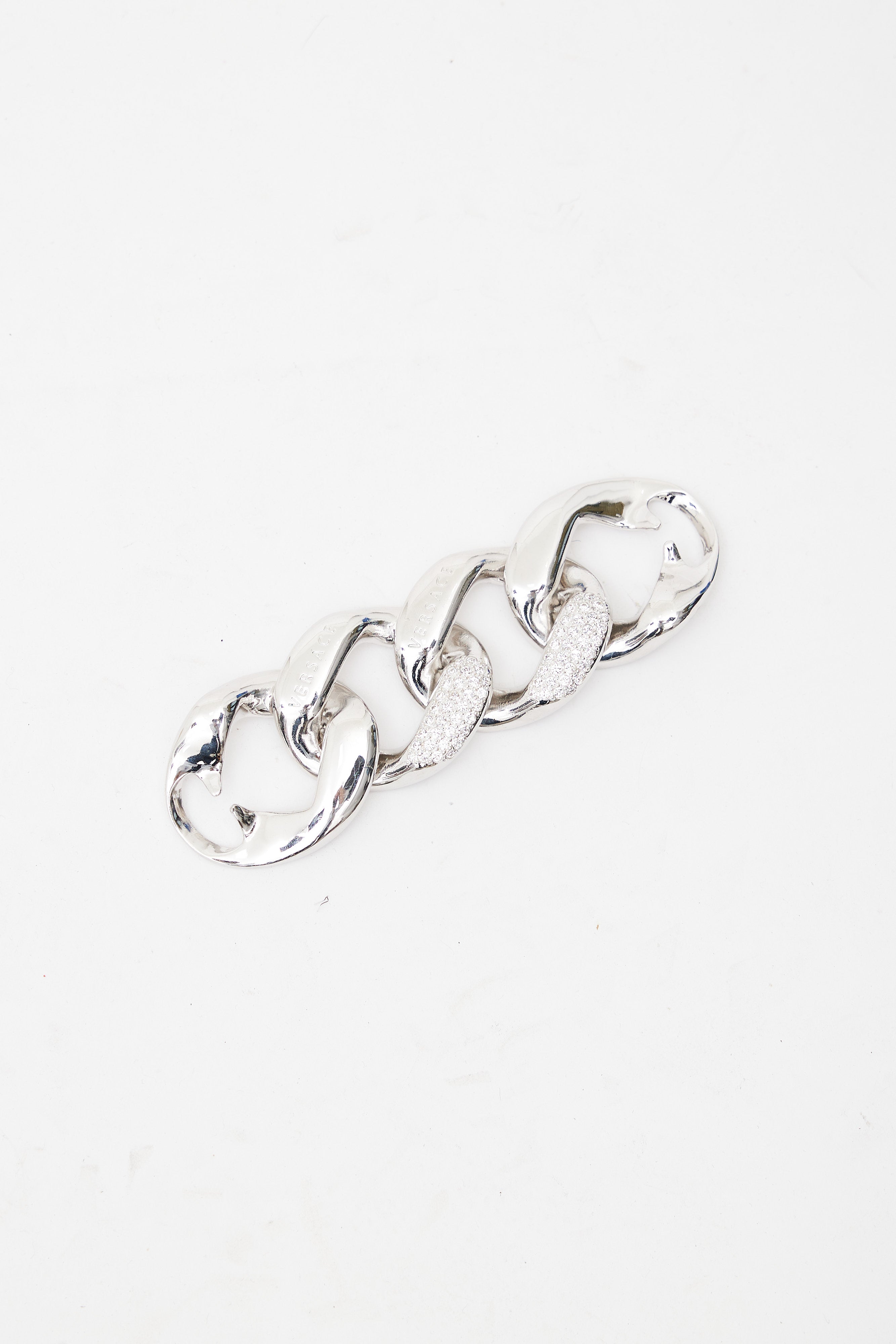 Pre-owned Versace silver chain featuring oversized cuban link design, embossed logo, and crystal embellishment. Original box included.