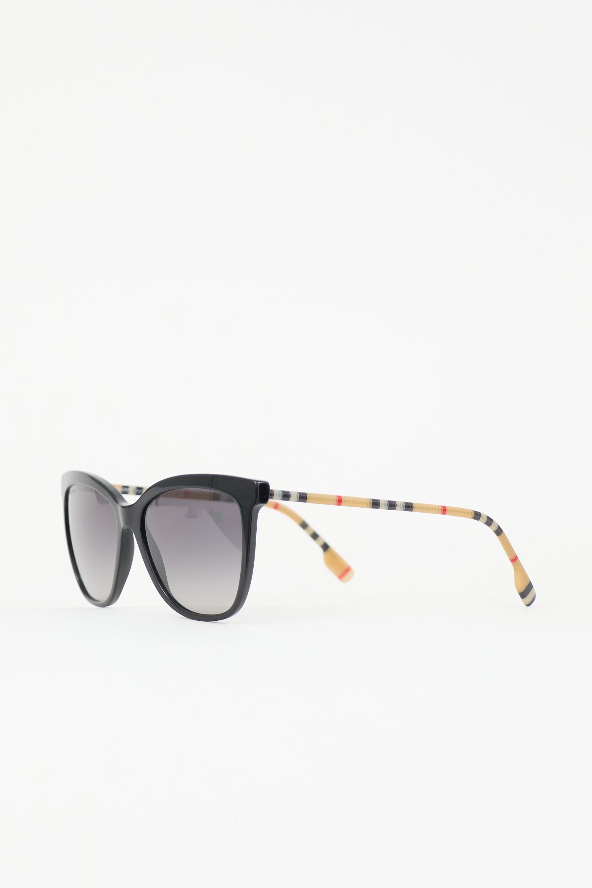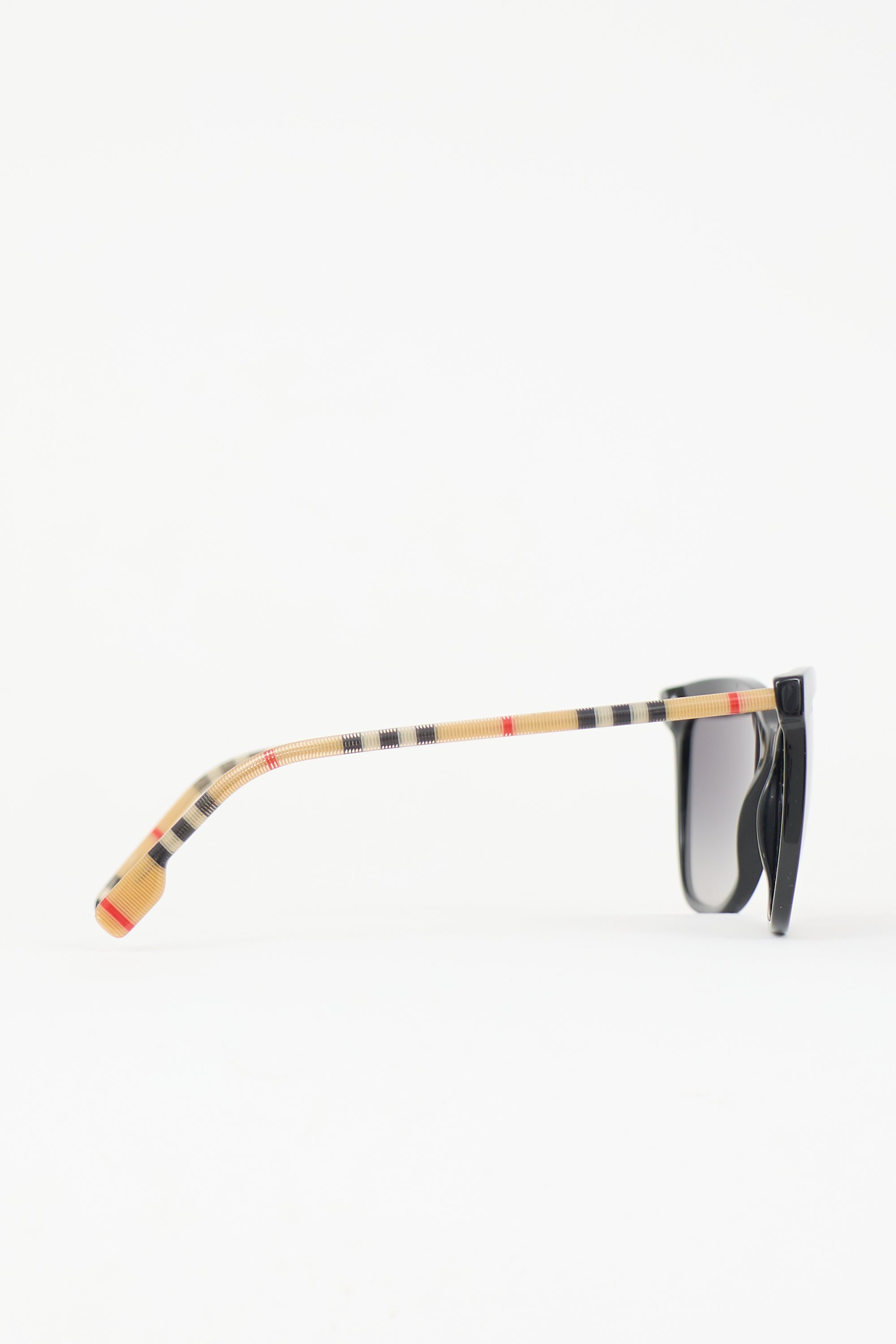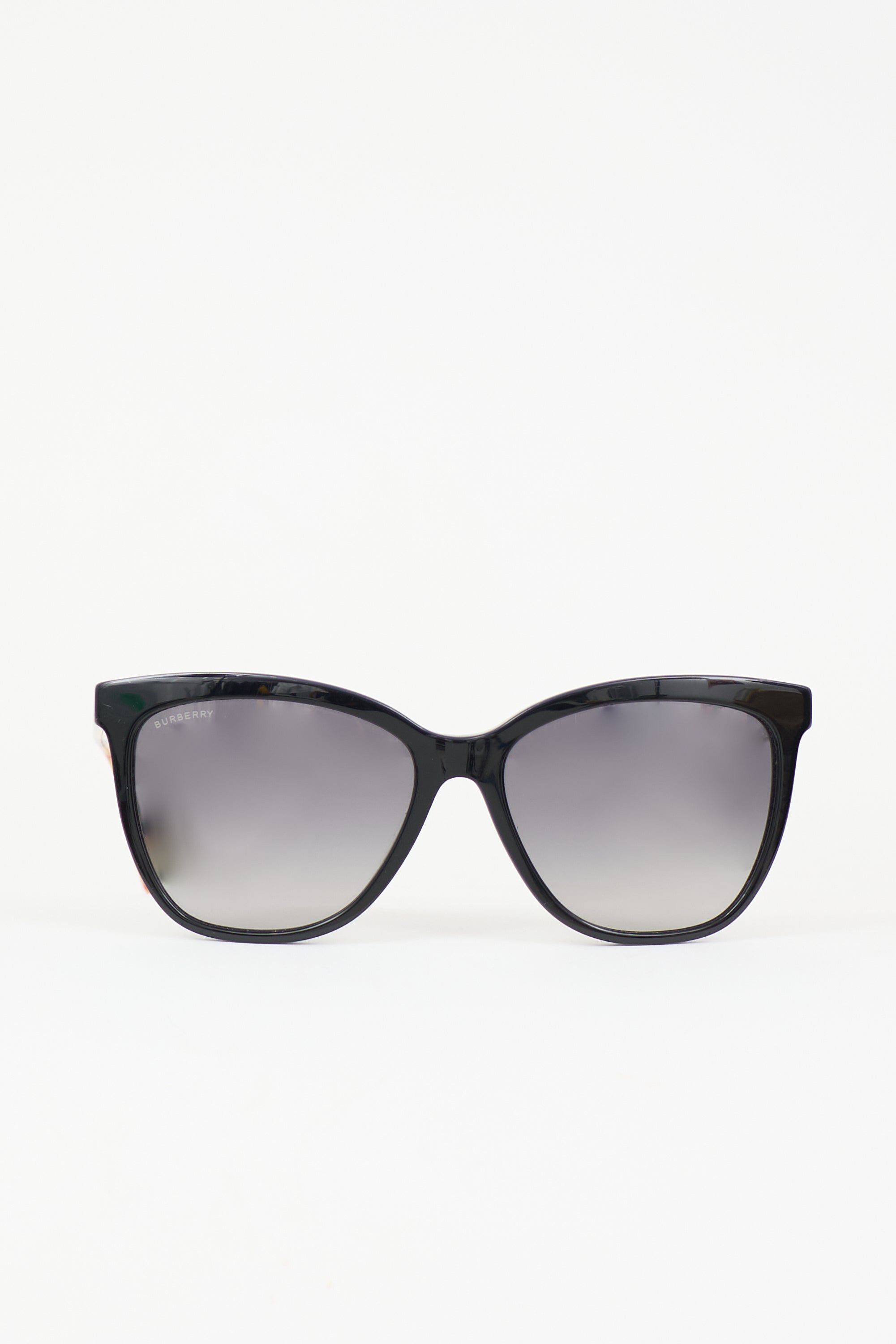 Pre-owned Burberry black BE4308 Clear Sunglasses featuring square frame, gradient lens, and Nova Check printed arms. Includes original case and box.