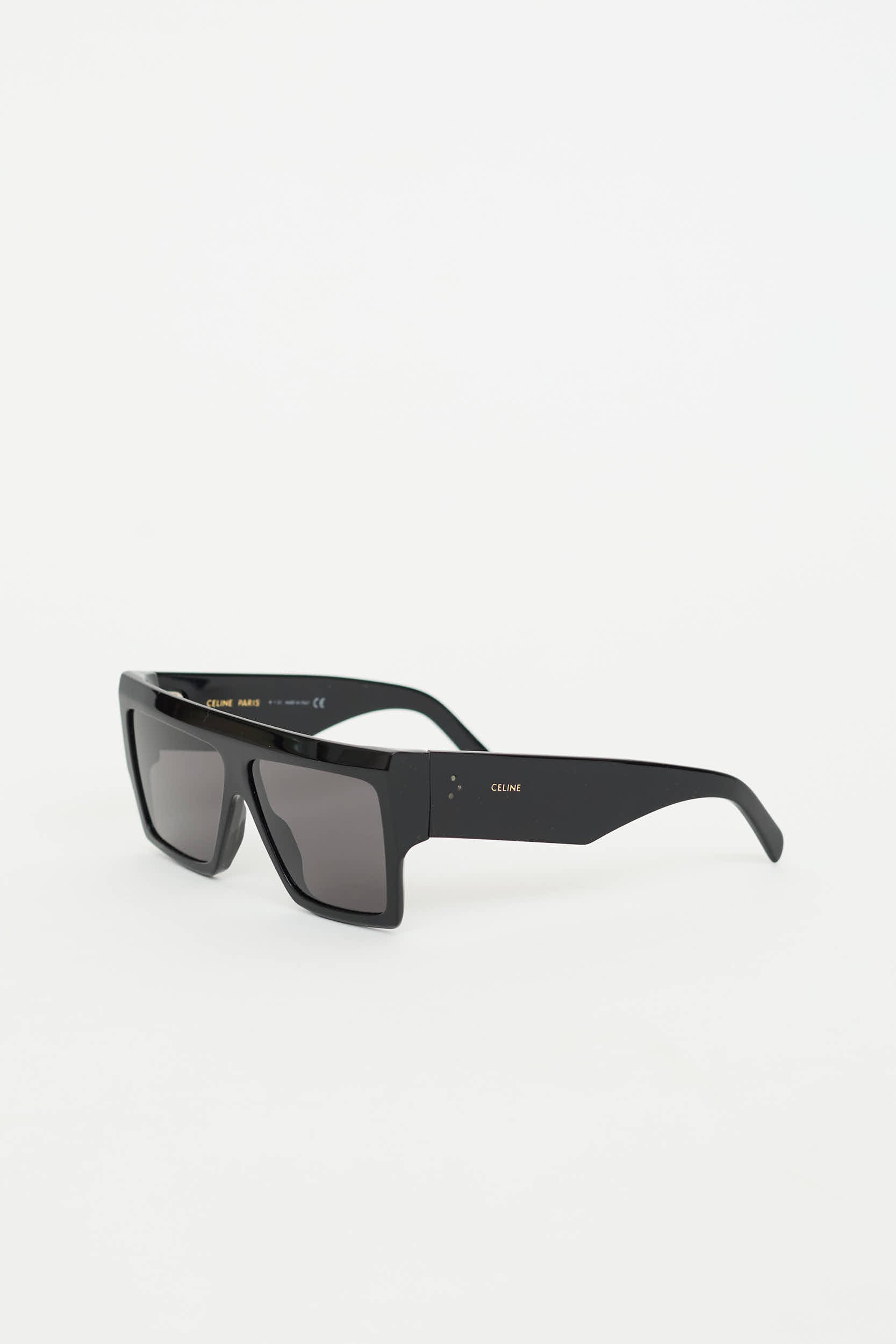 Pre-owned Celine black CL400921 sunglasses featuring straight brow, tonal lens, thick arms, and gold toned logo text at temple.